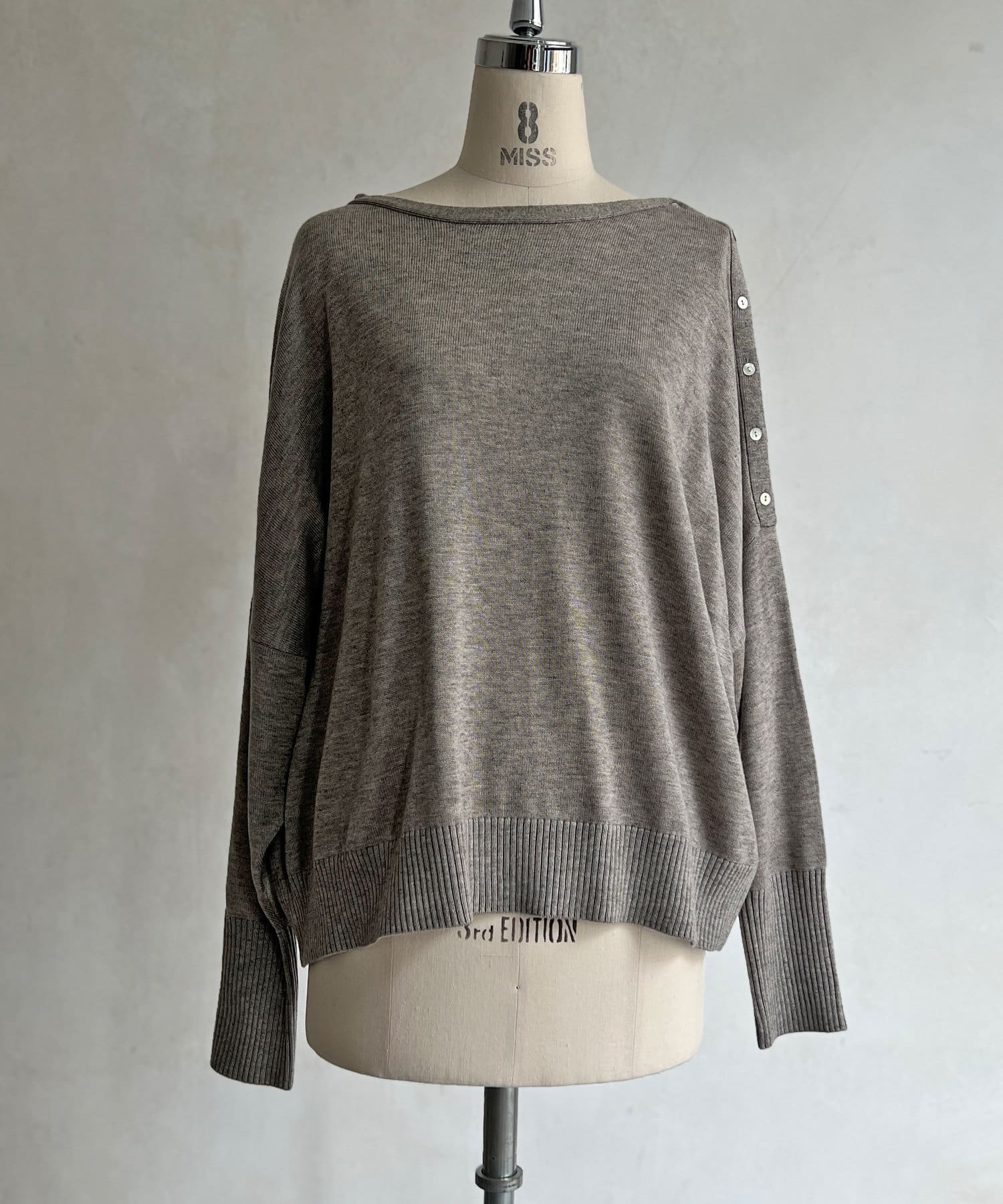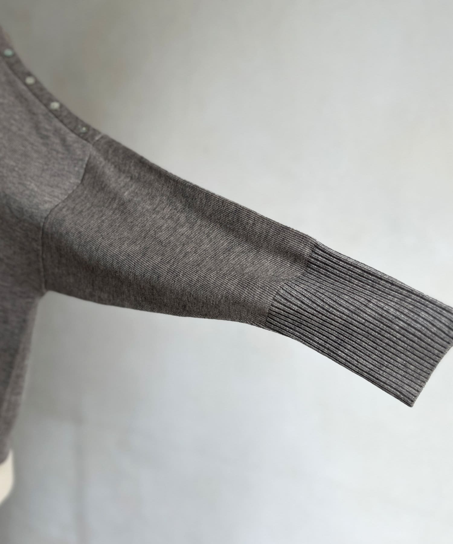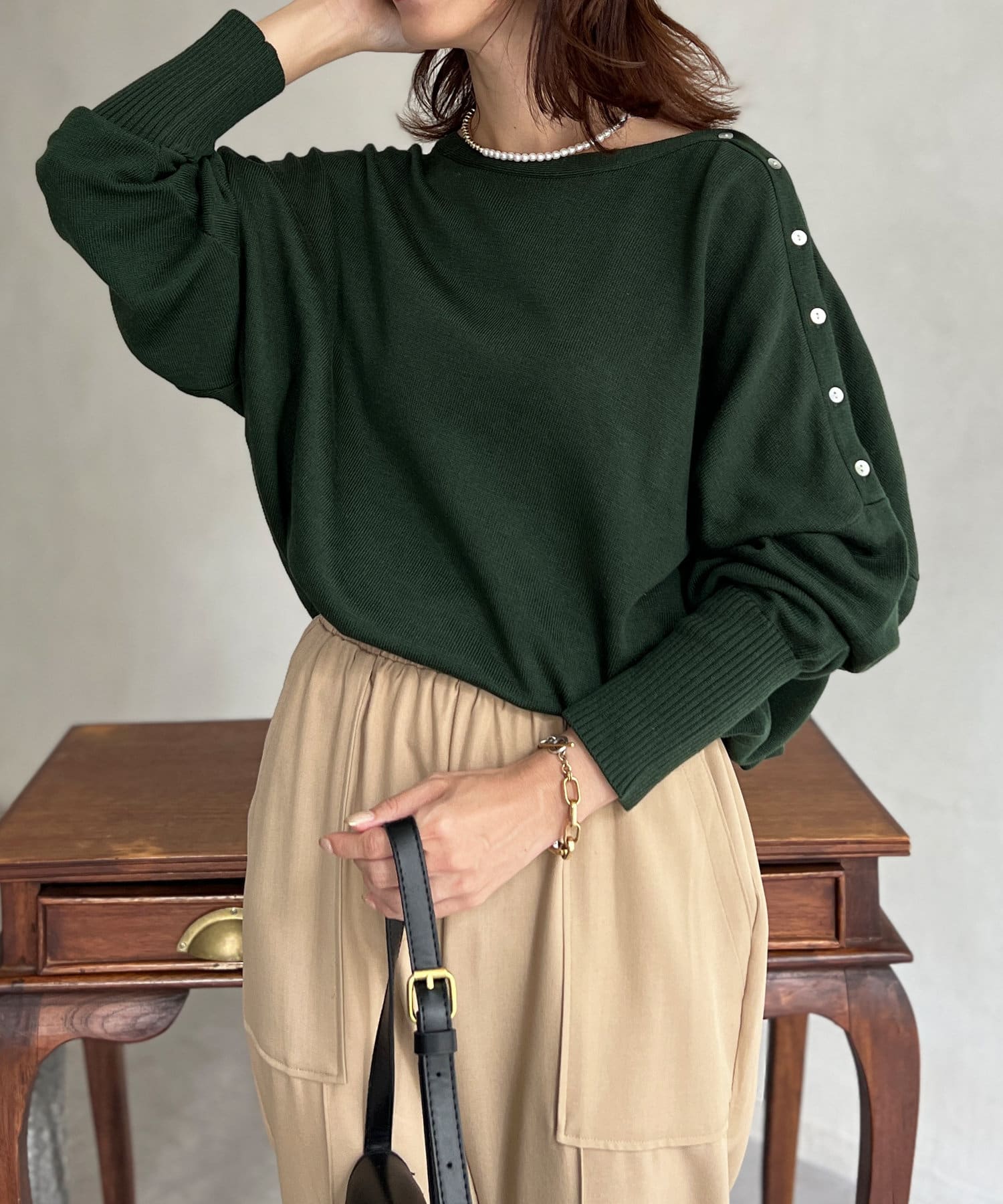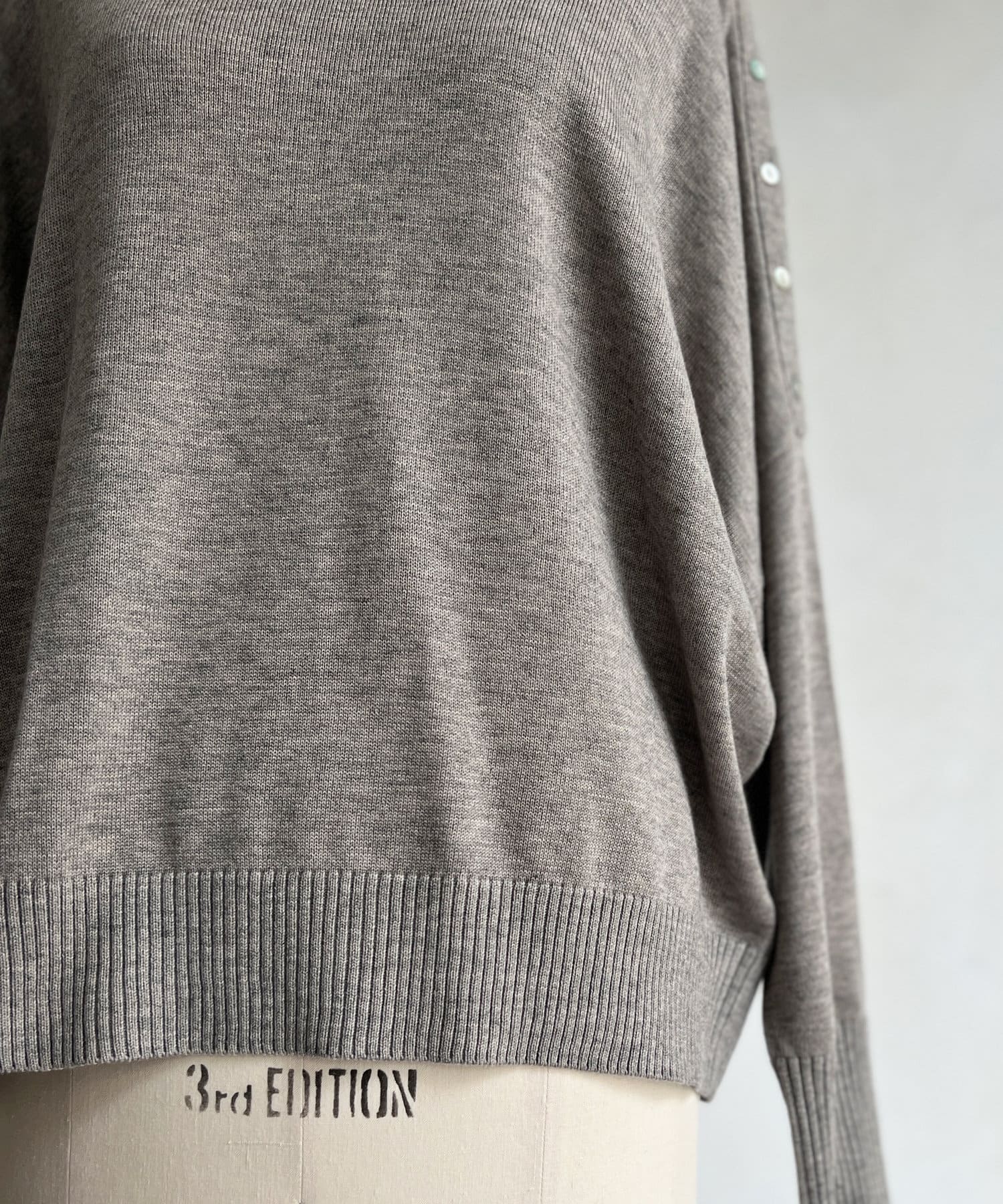 左肩にさり気なく並んだシェルボタンがポイント。上品な印象で合わせていただけます。