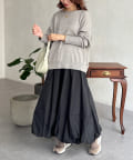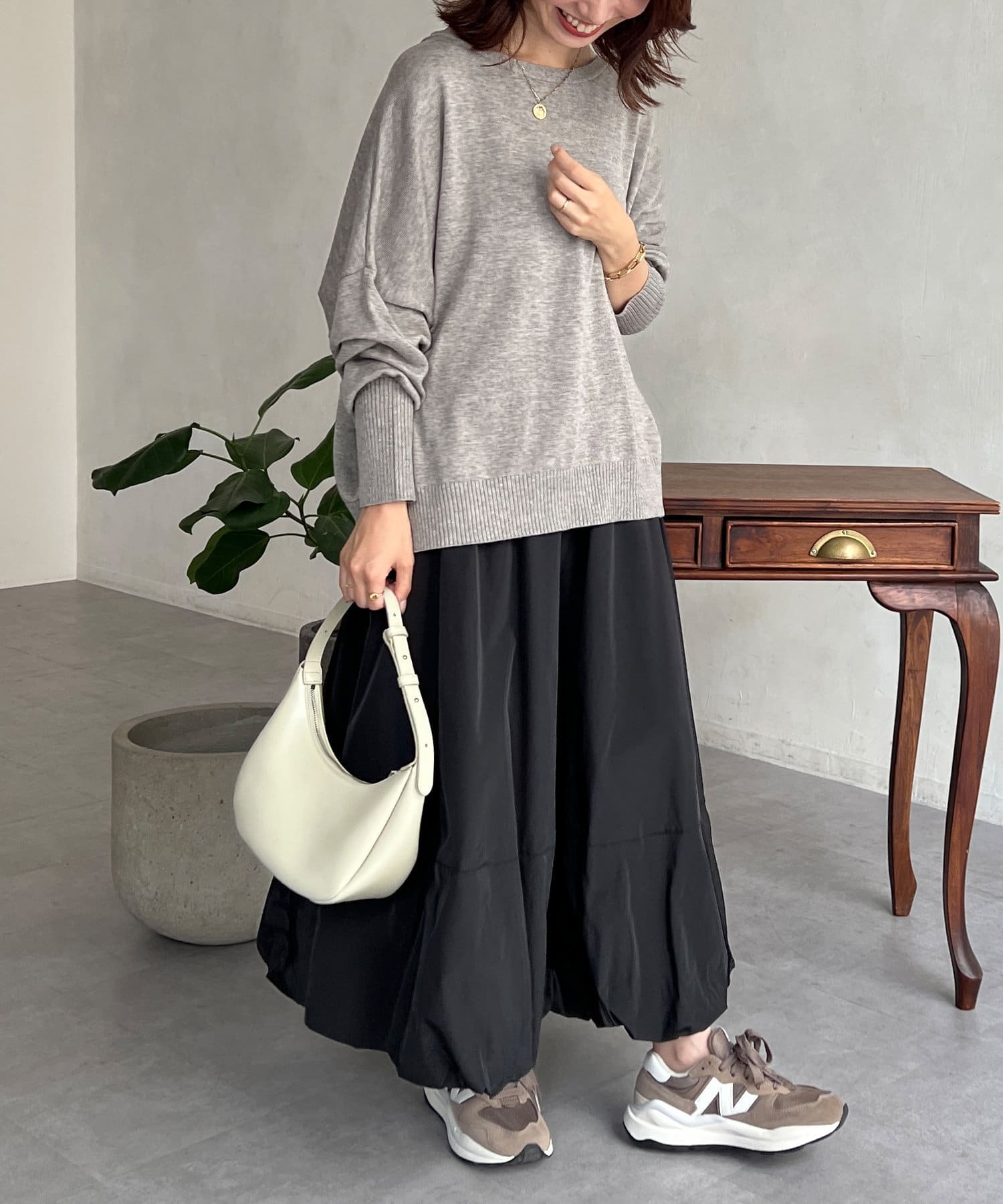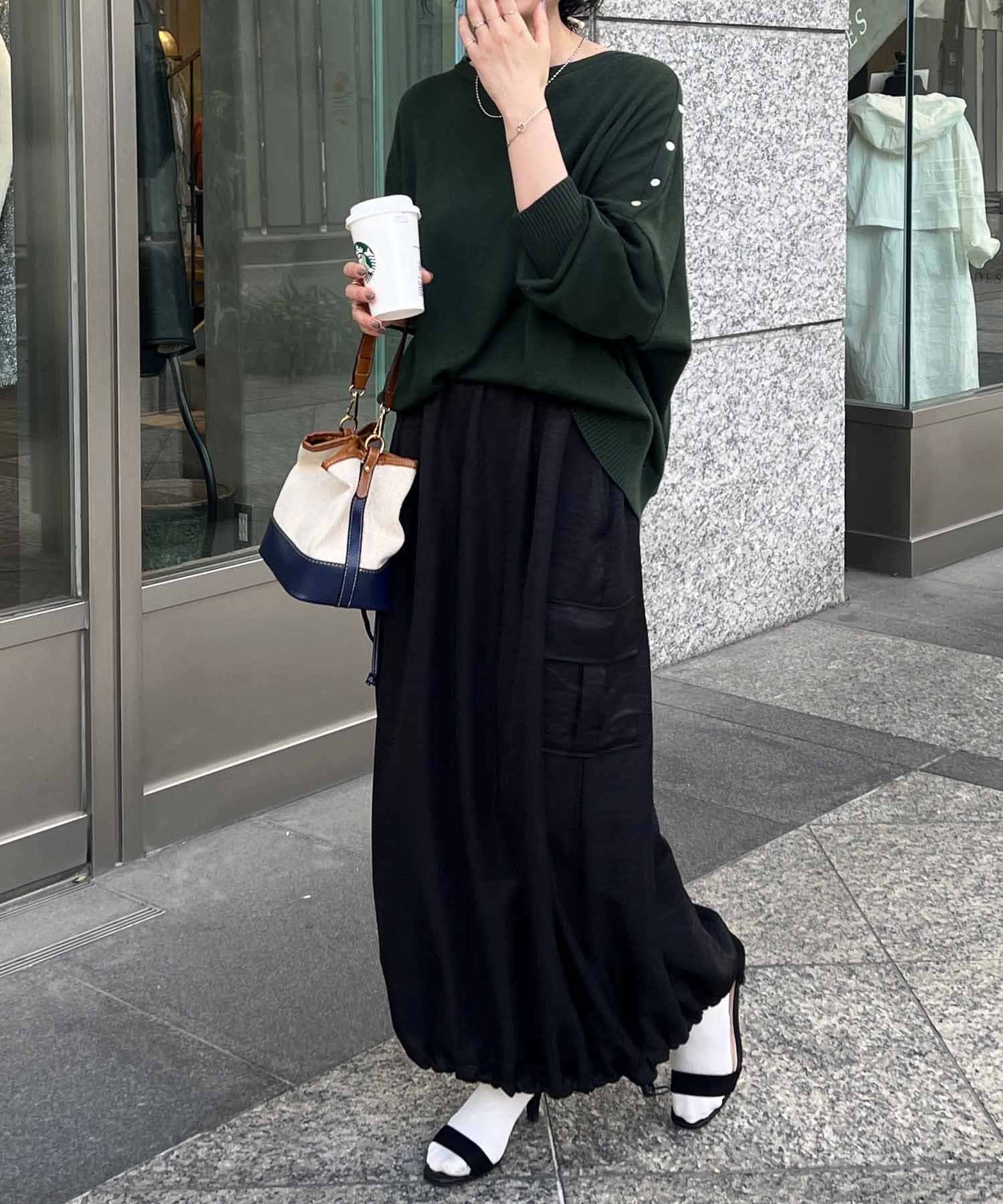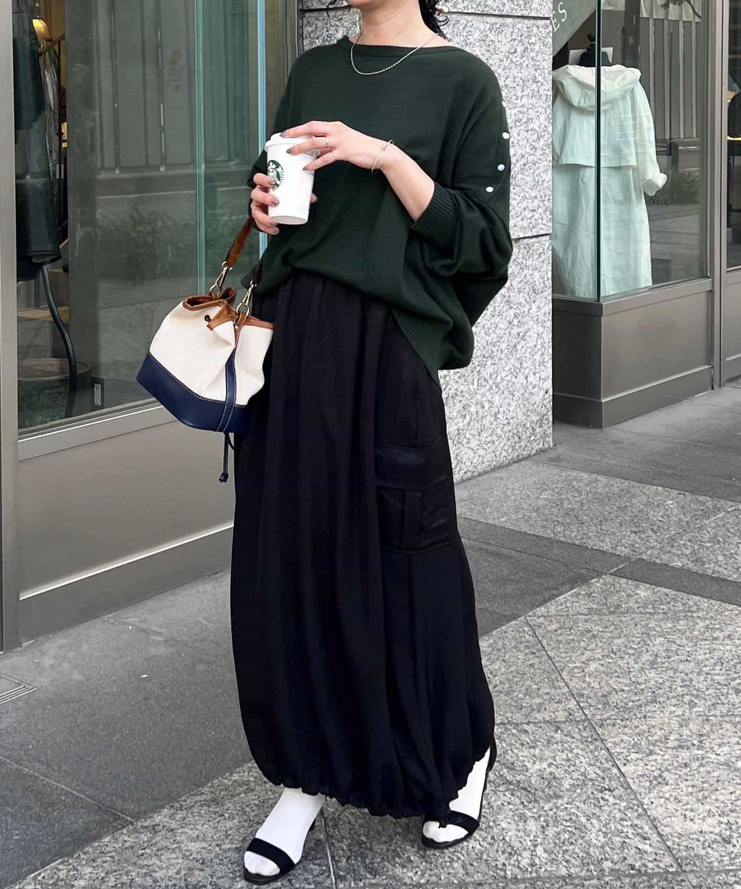 ロングスカートの時は前だけインしてすっきりと合わせるのがおすすめ。