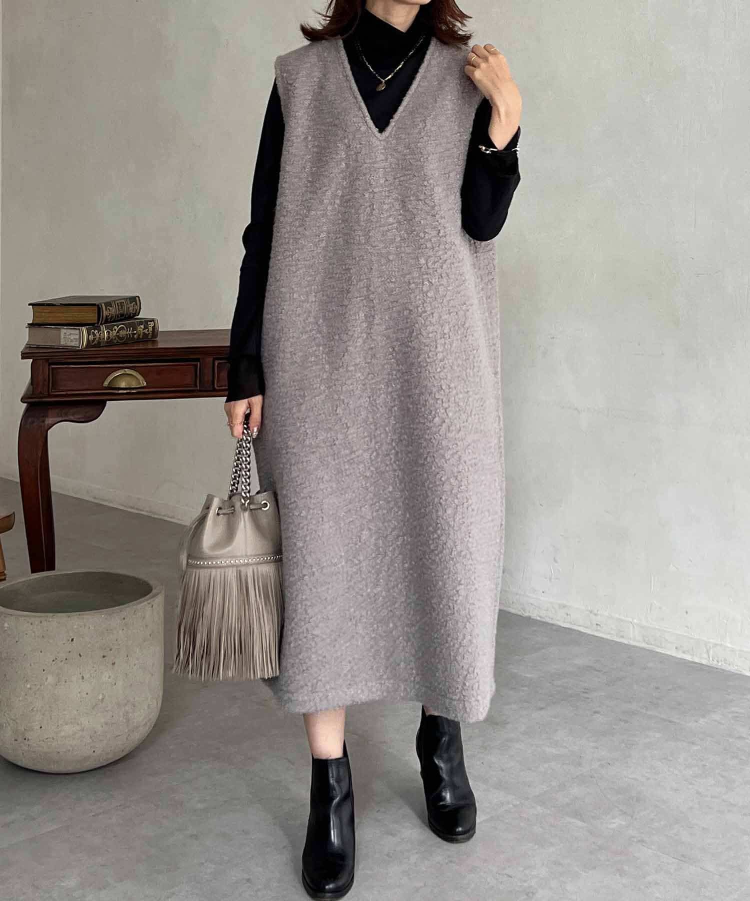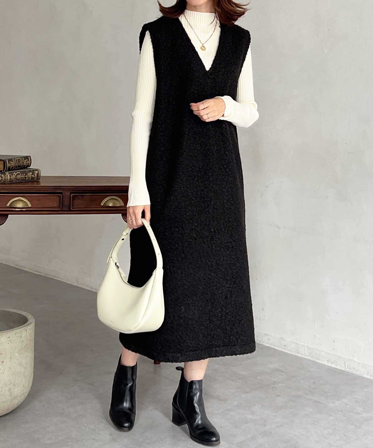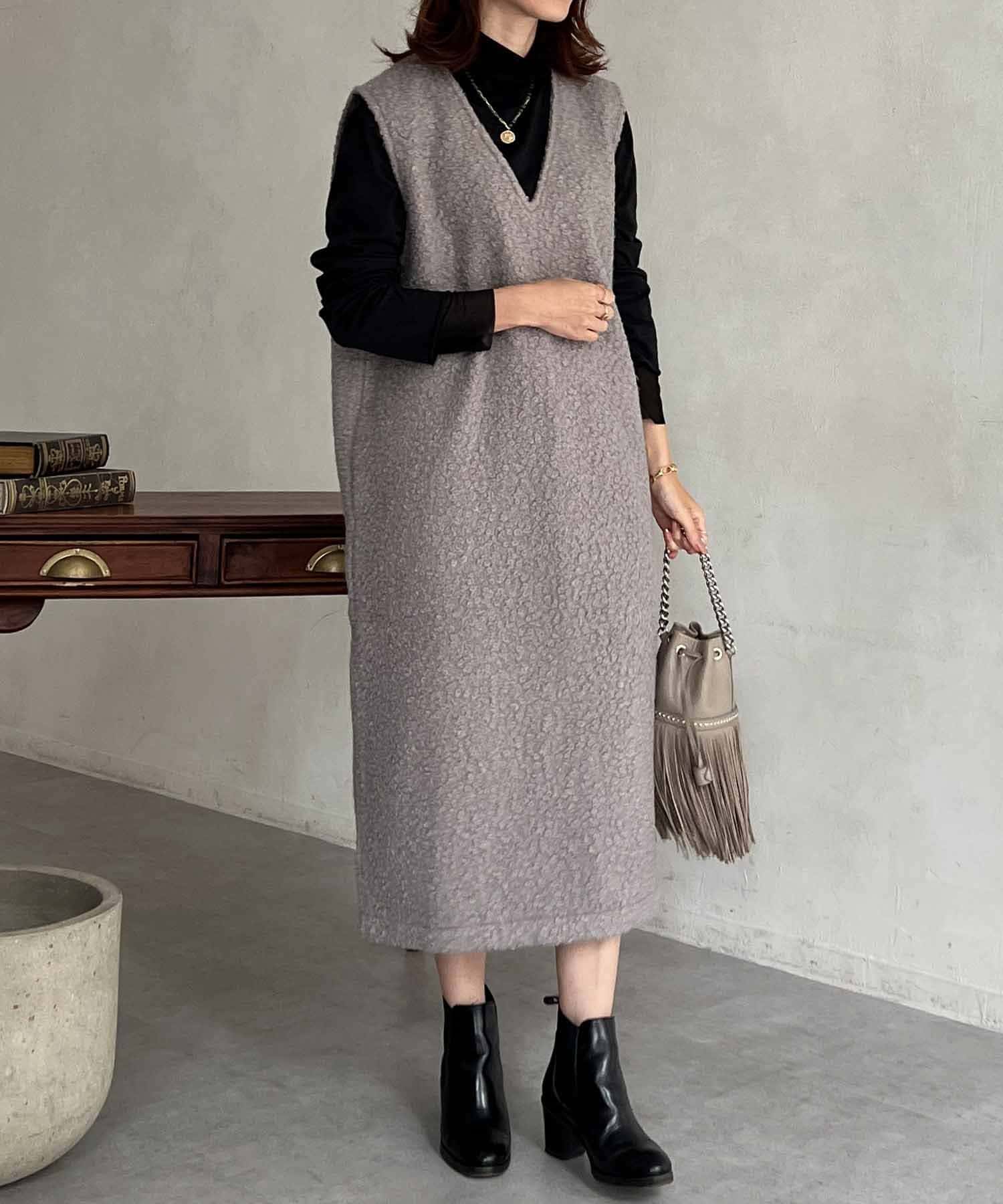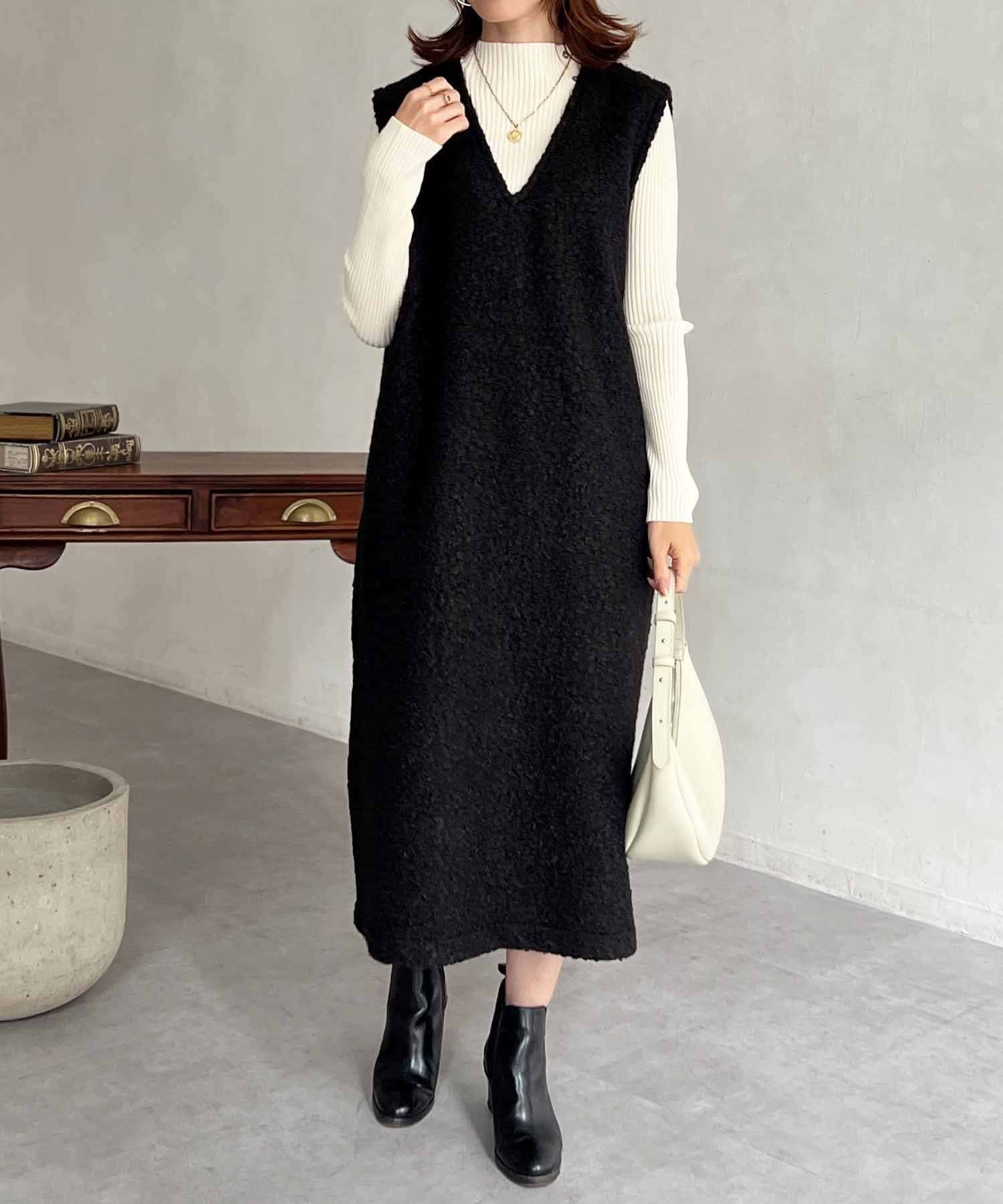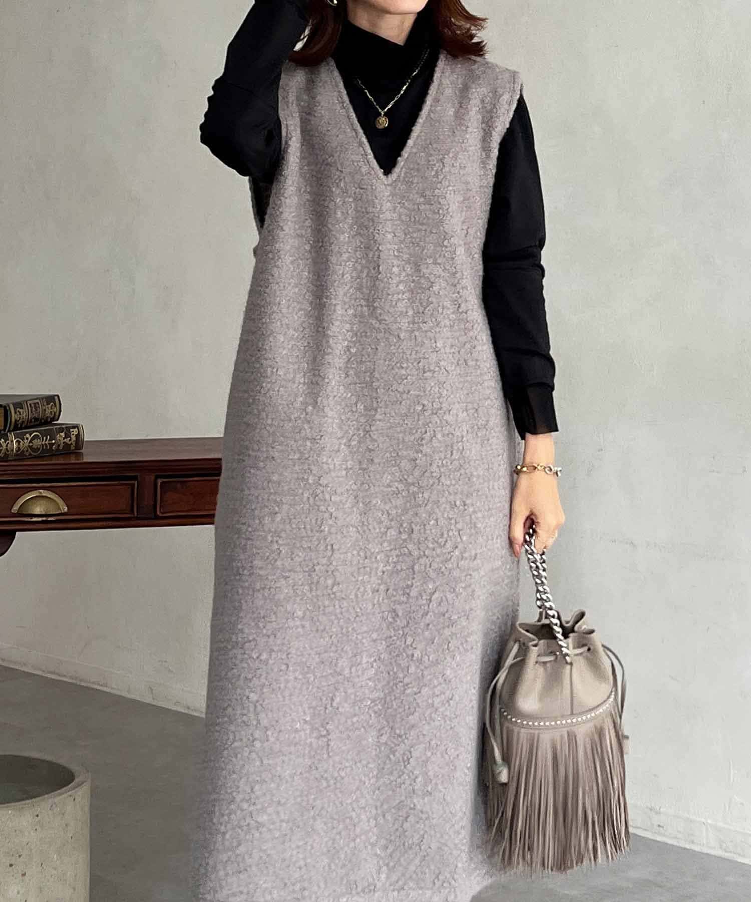 特徴的なもこもこのブークレ素材ポイントのジャンスカワンピース。