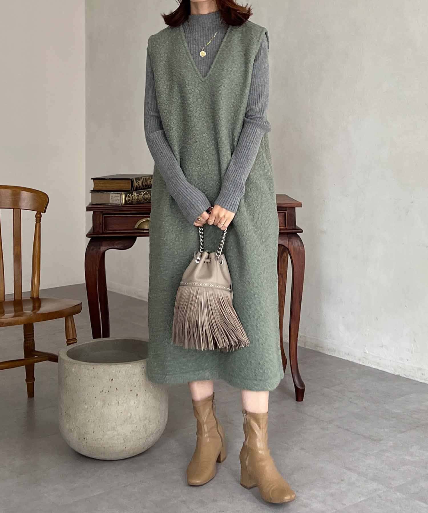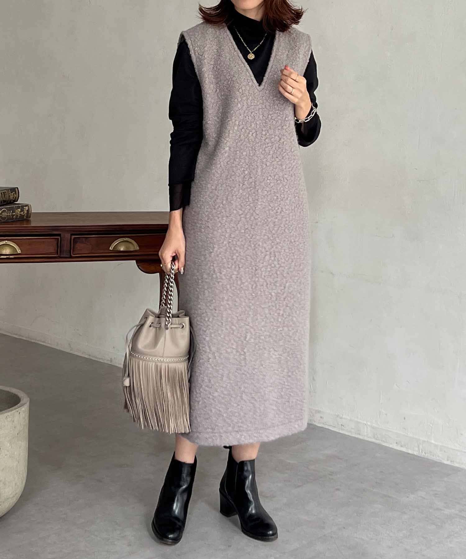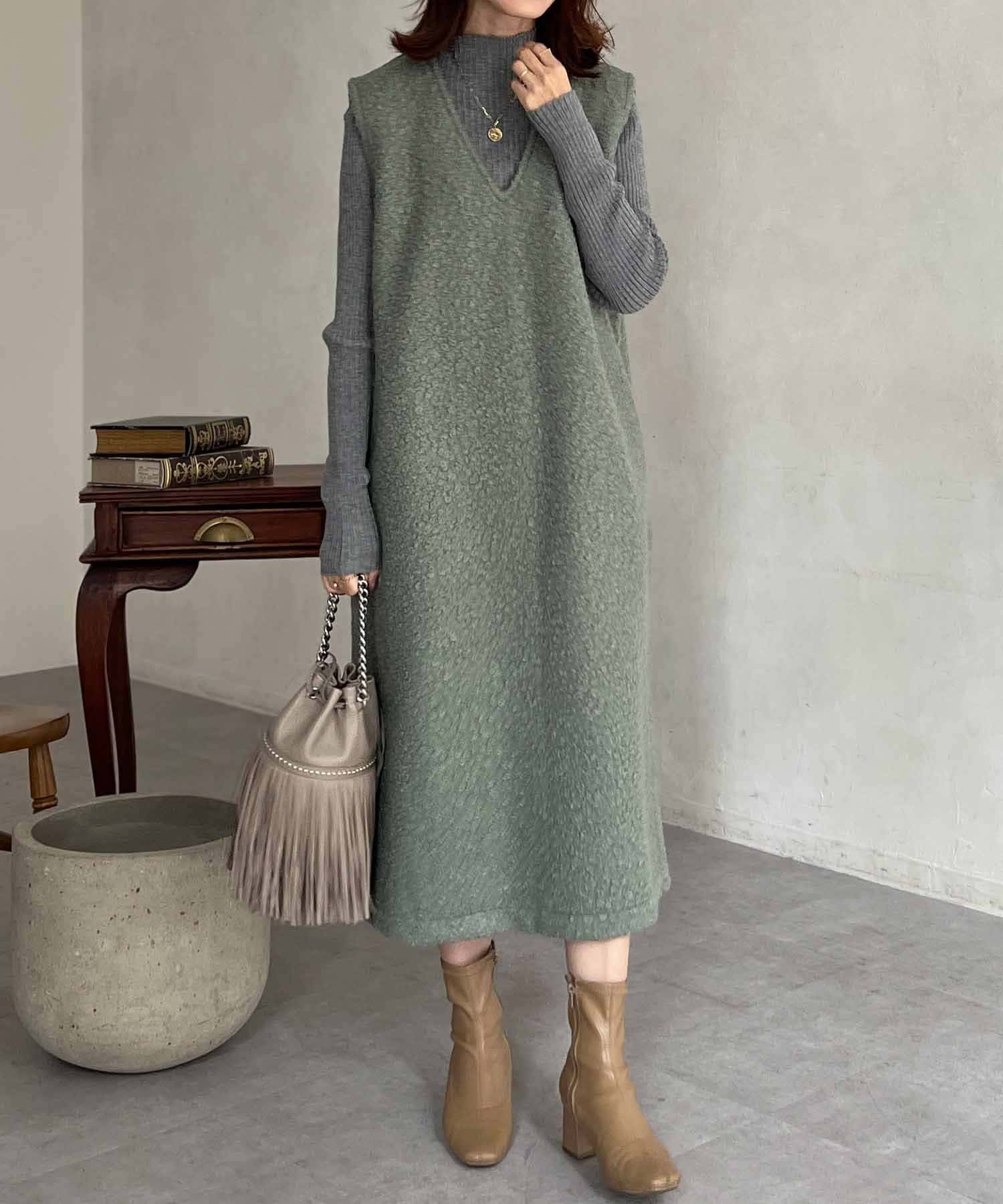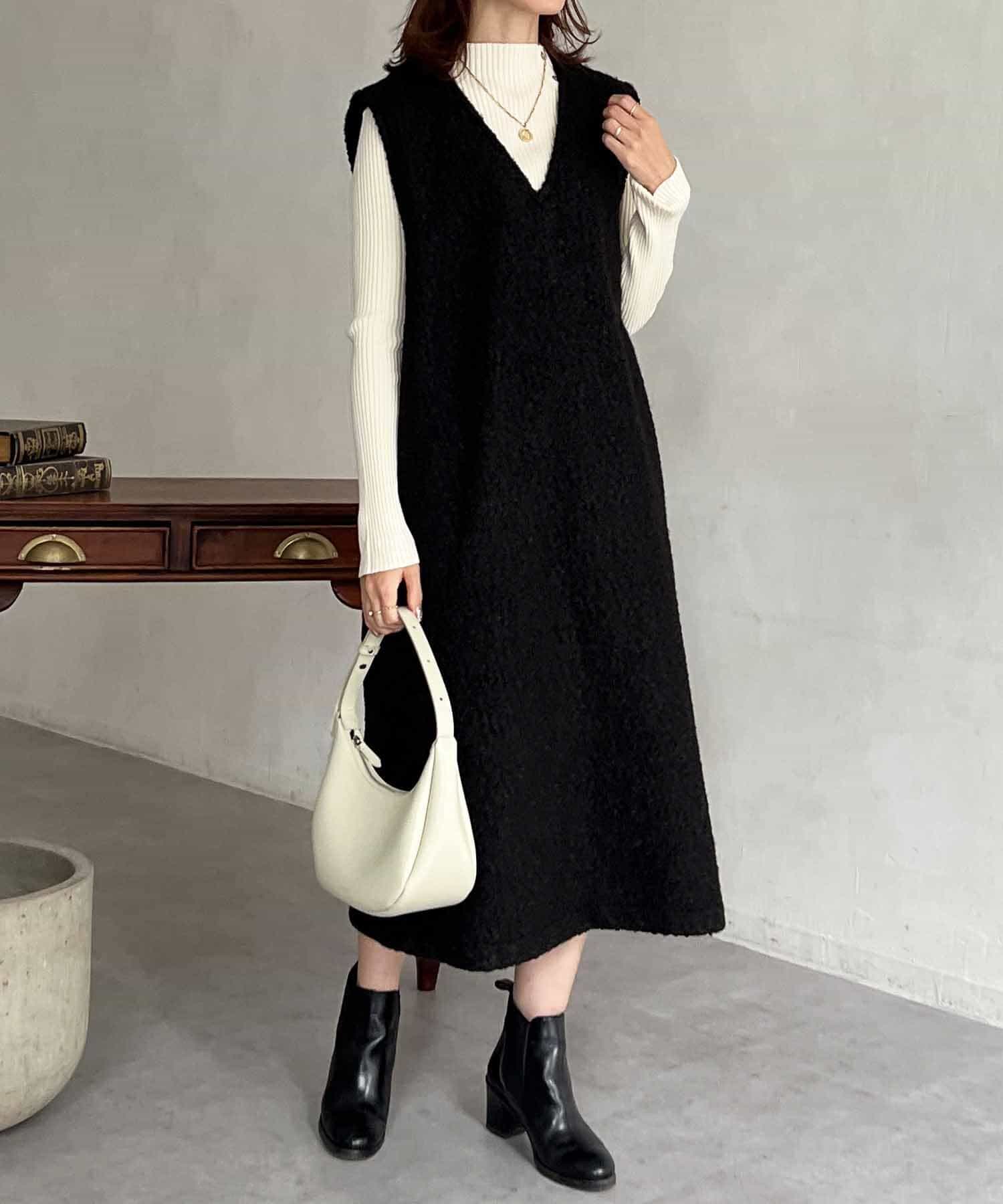 特徴的なもこもこのブークレ素材ポイントのジャンスカワンピース。