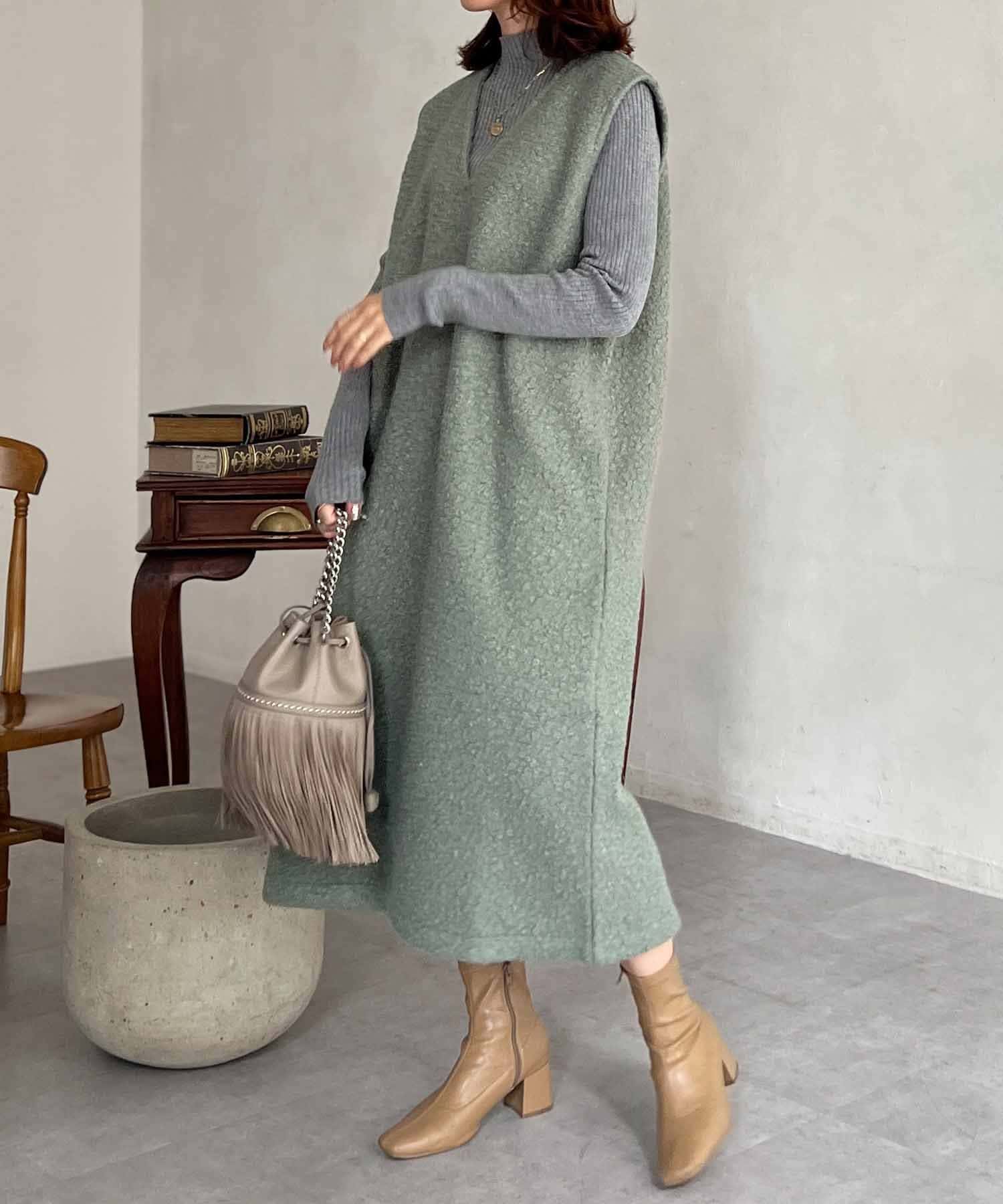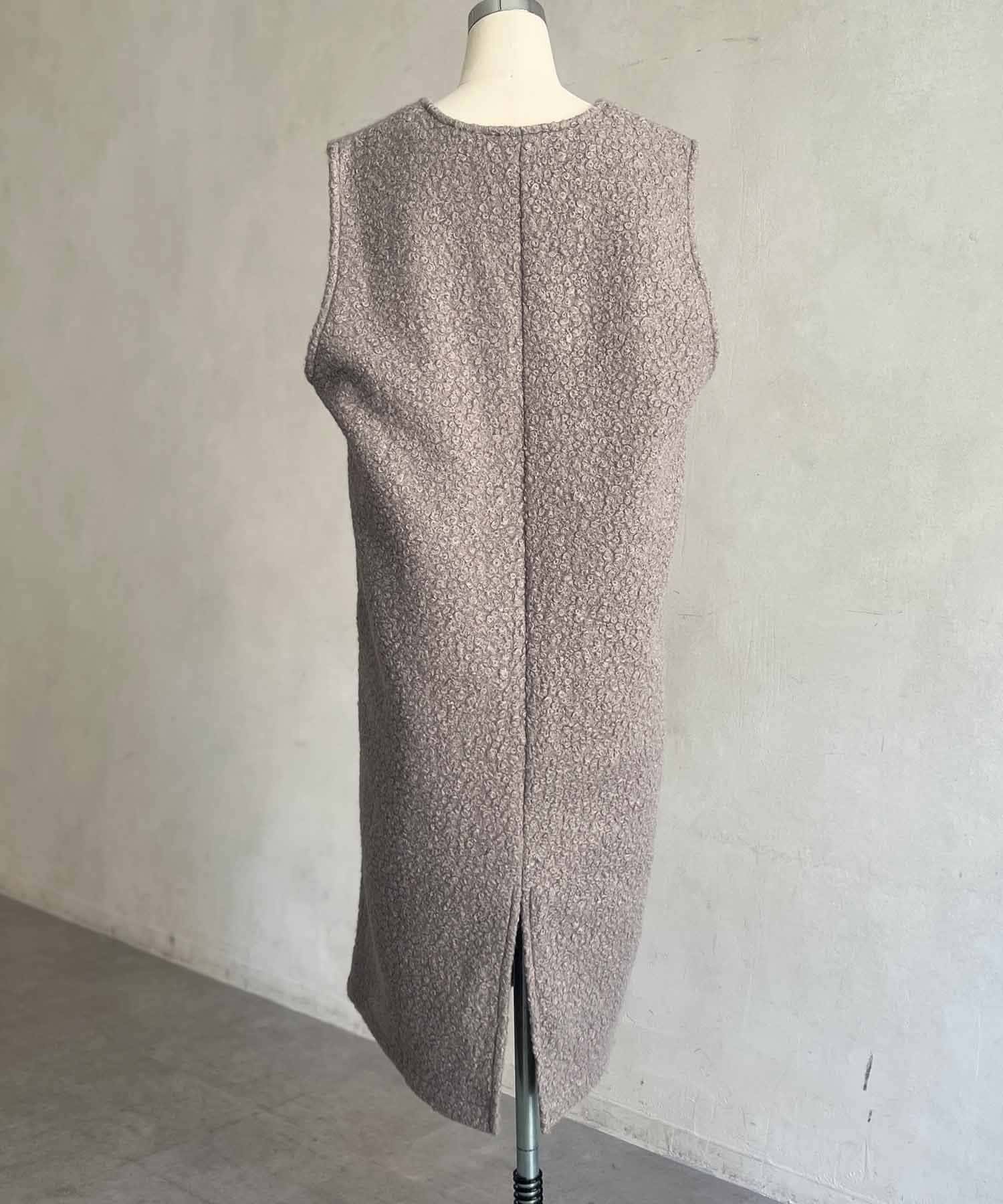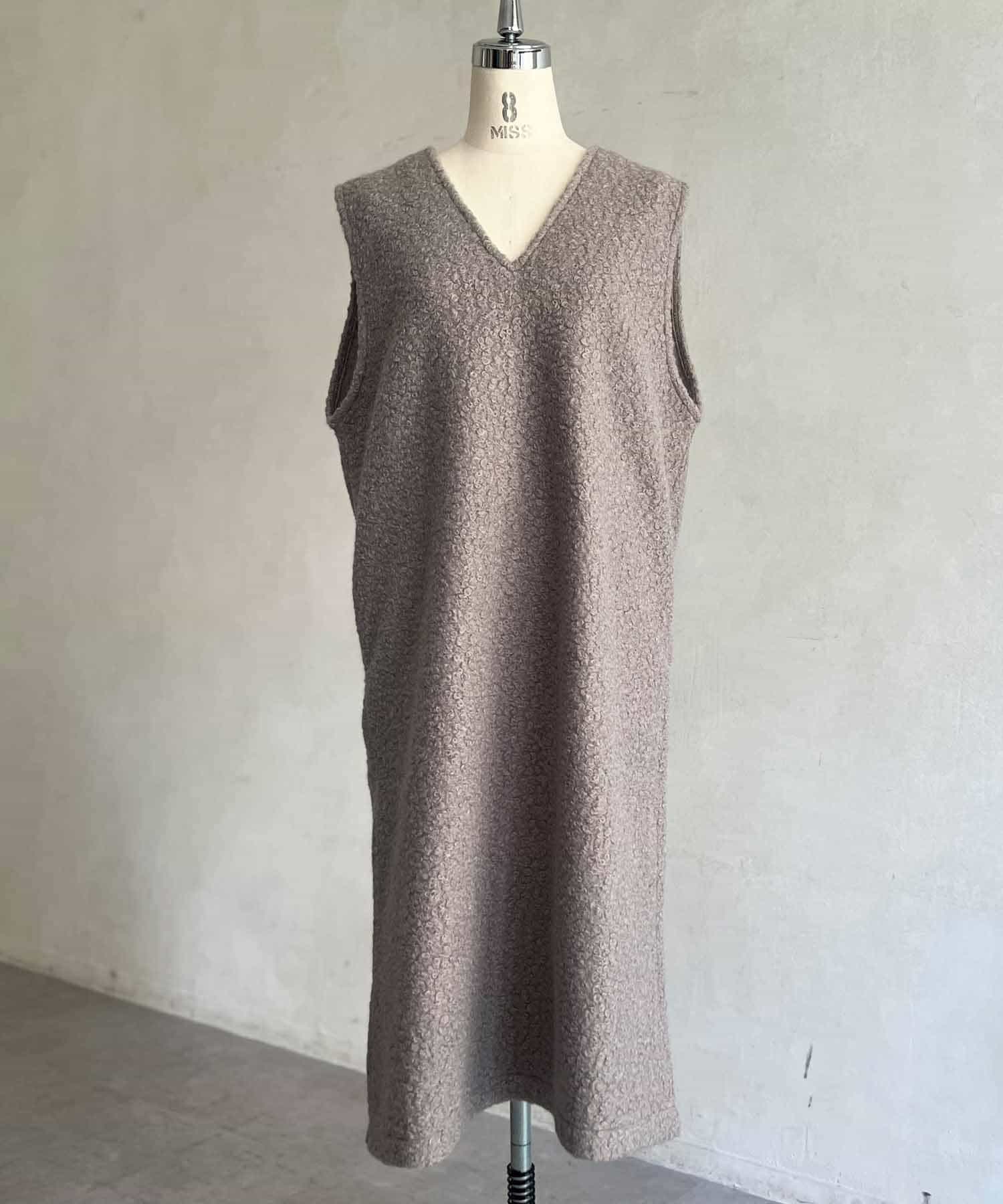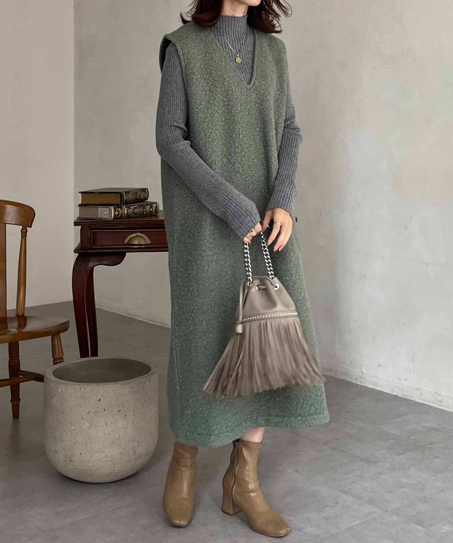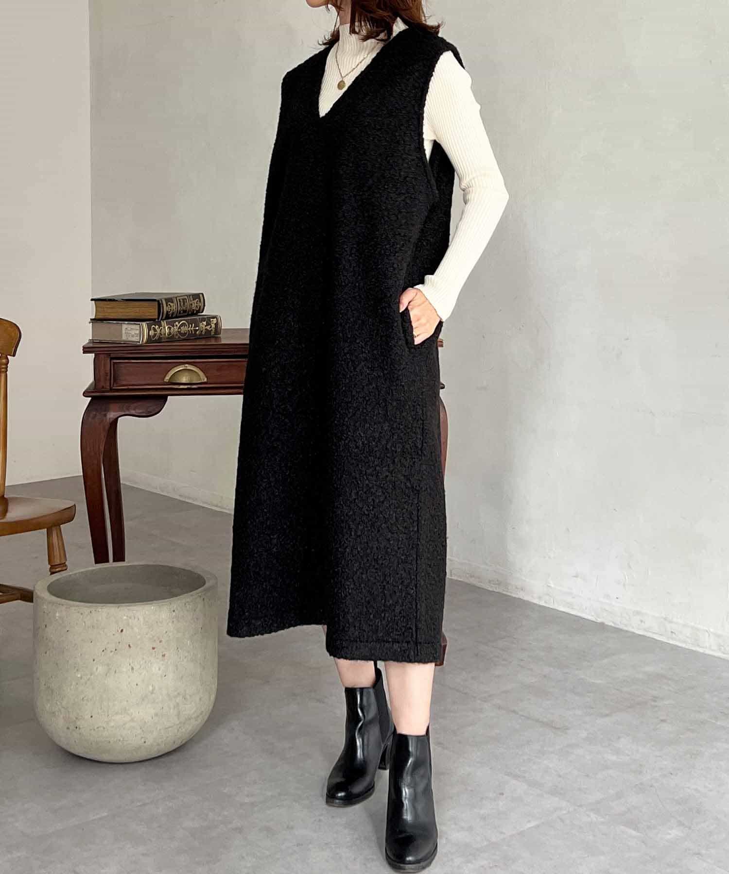 特徴的なもこもこのブークレ素材ポイントのジャンスカワンピース。