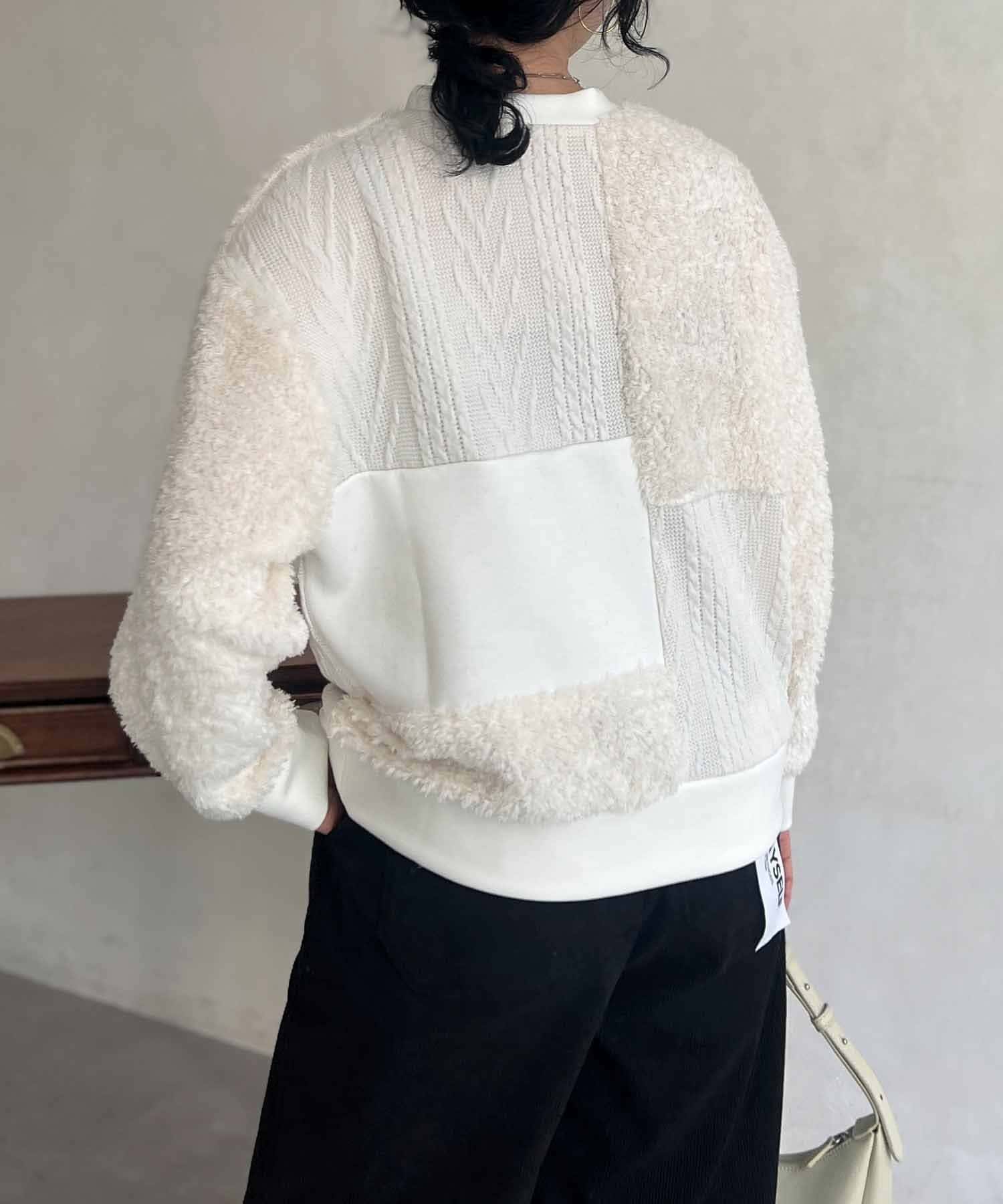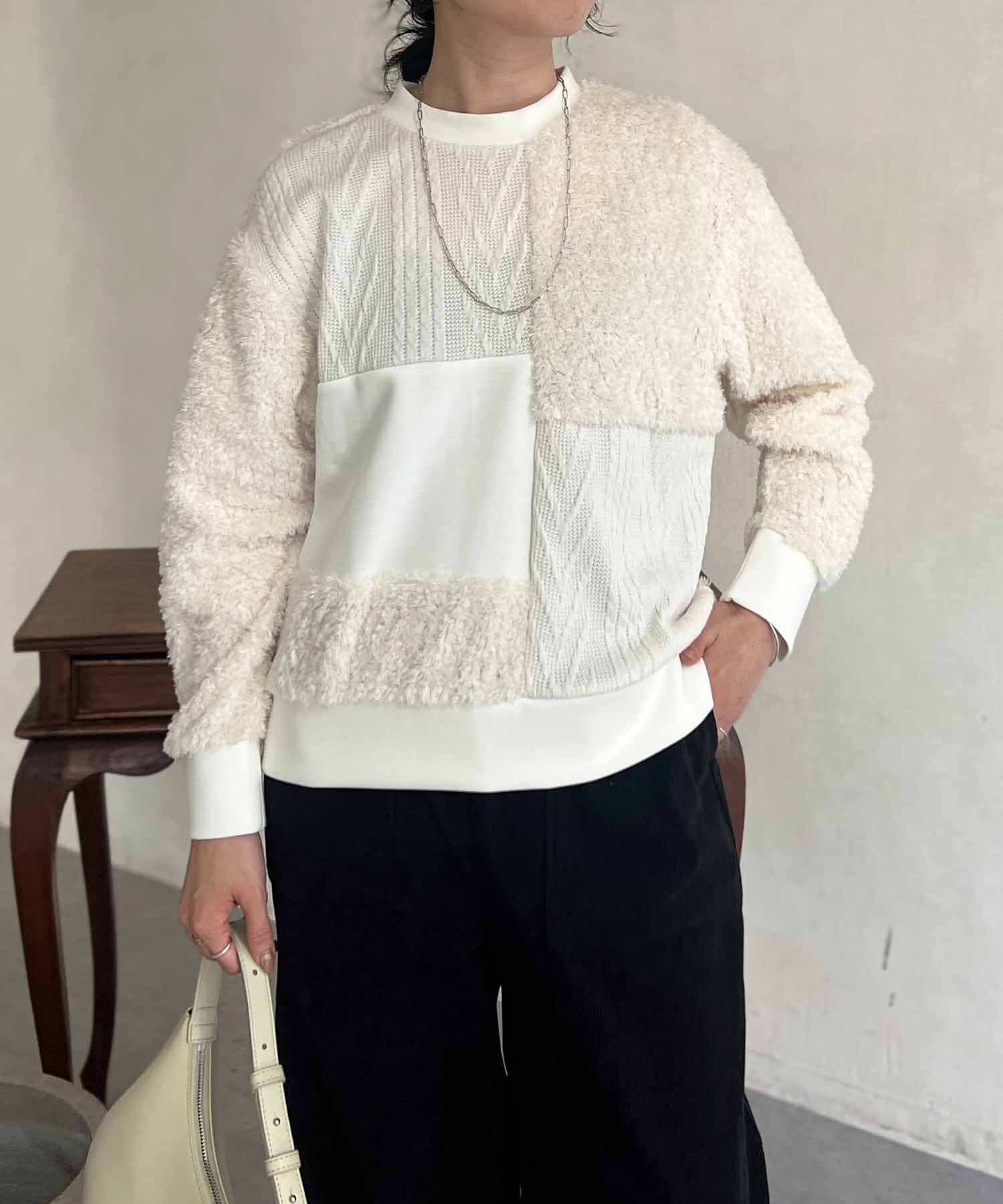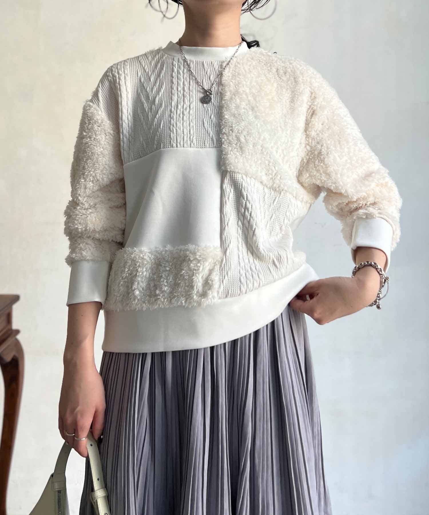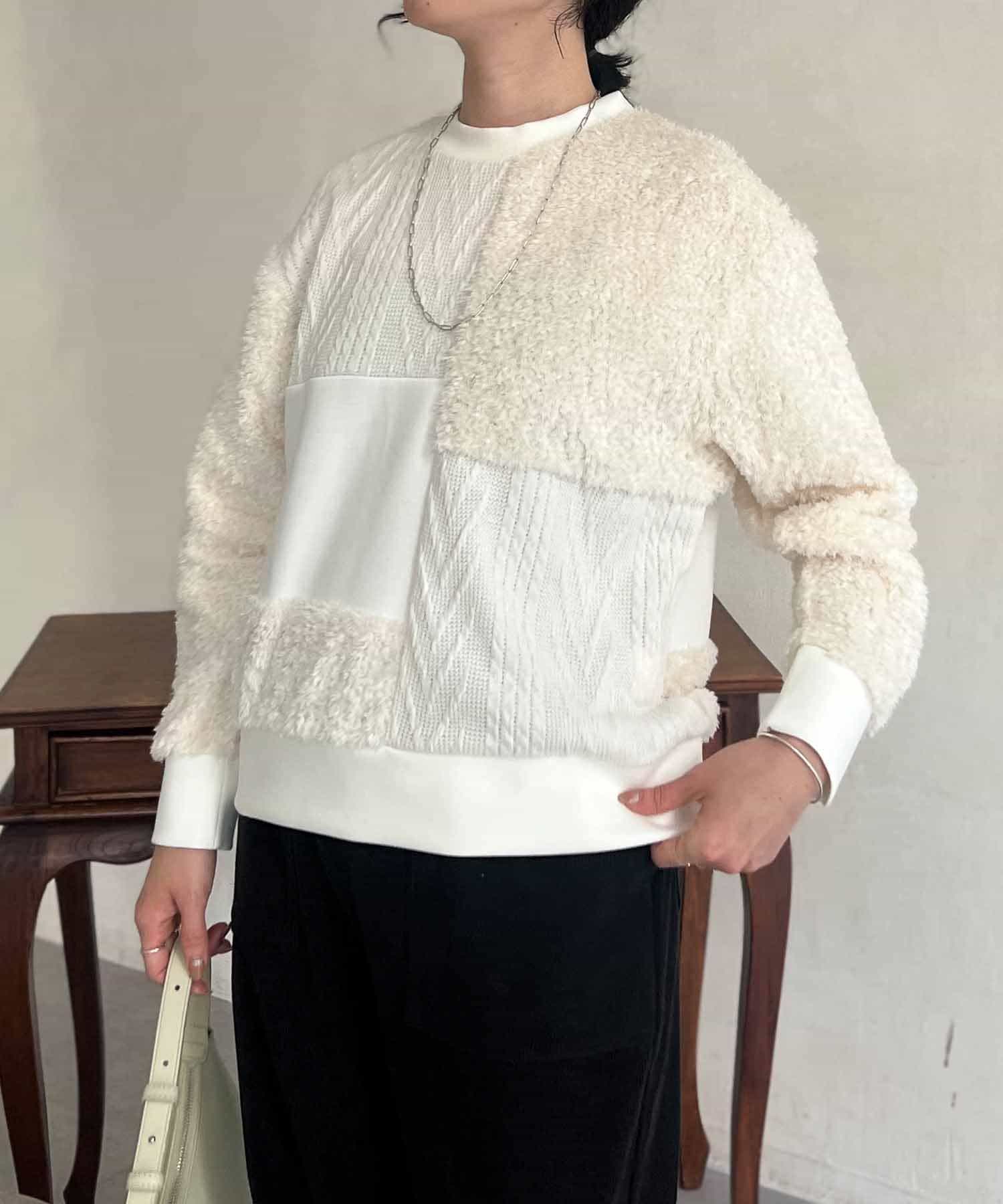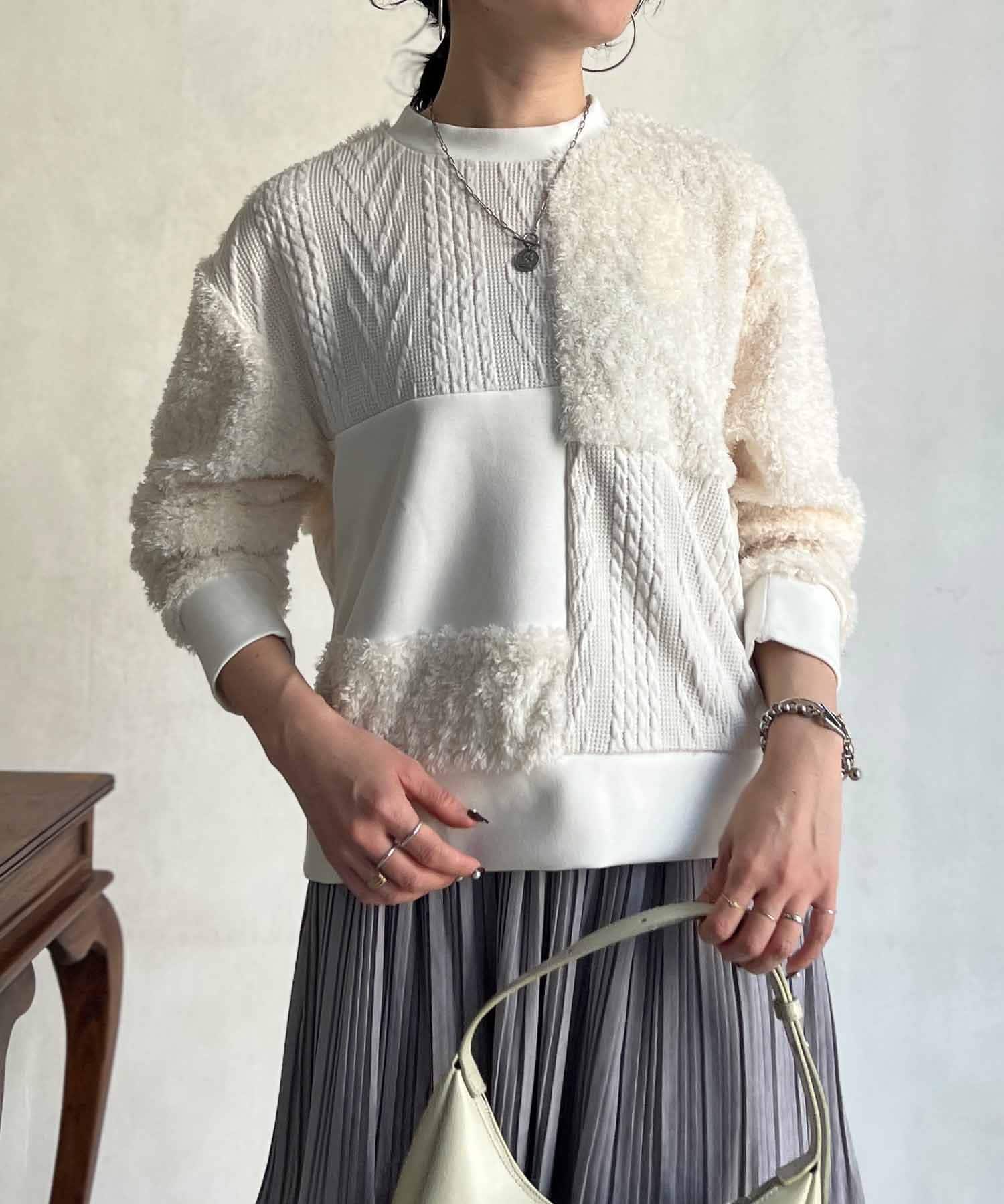 ケーブル編み、ボア、ダンボールニットと3素材を使用したプルオーバー。