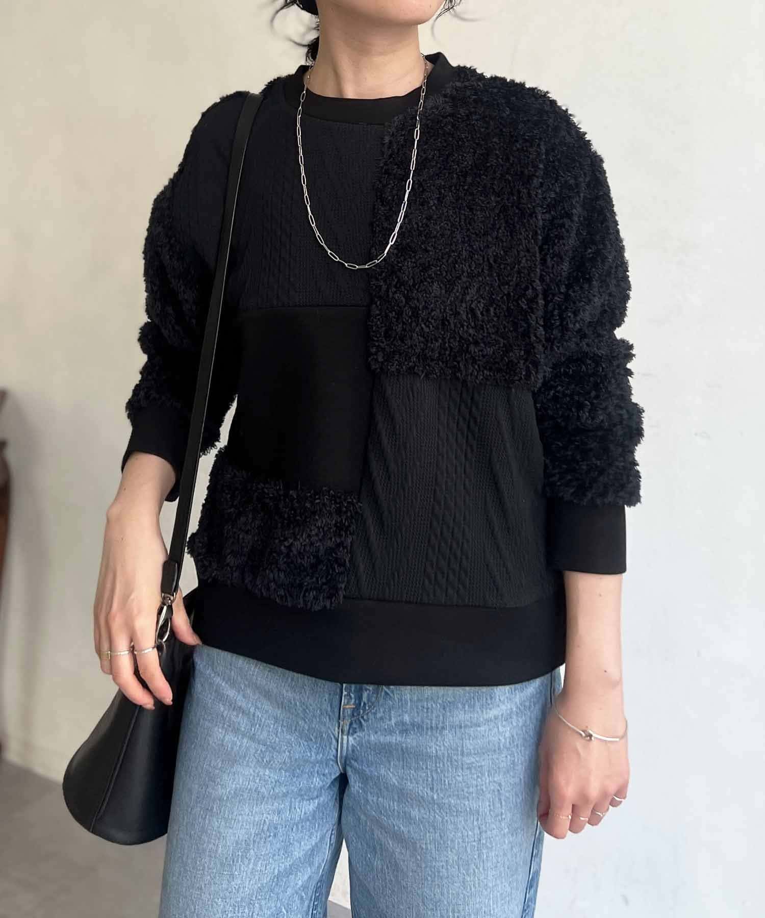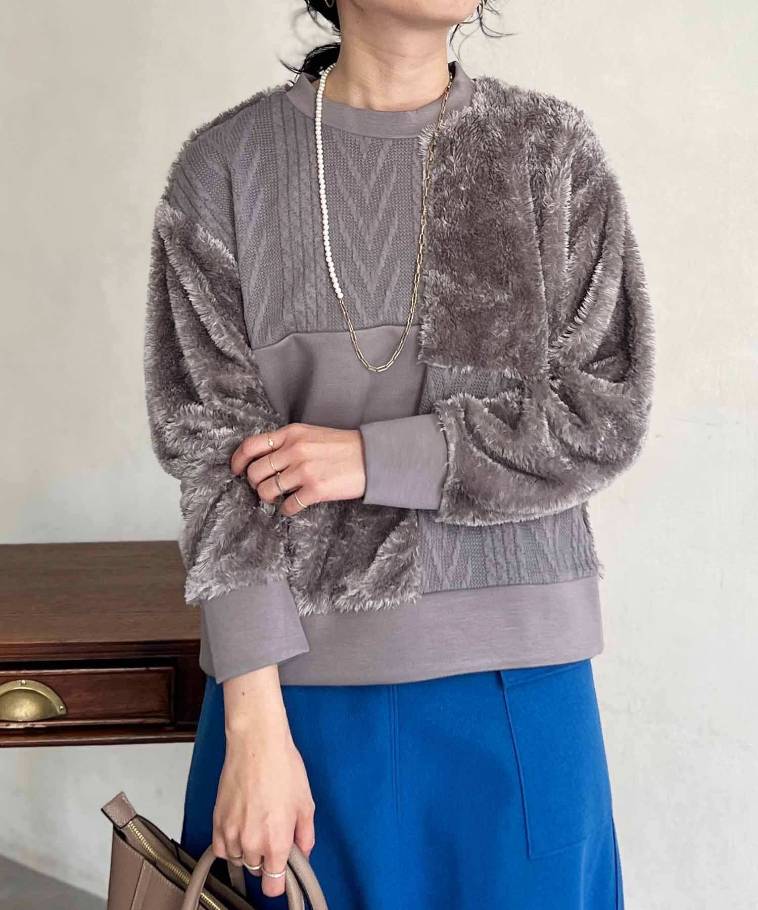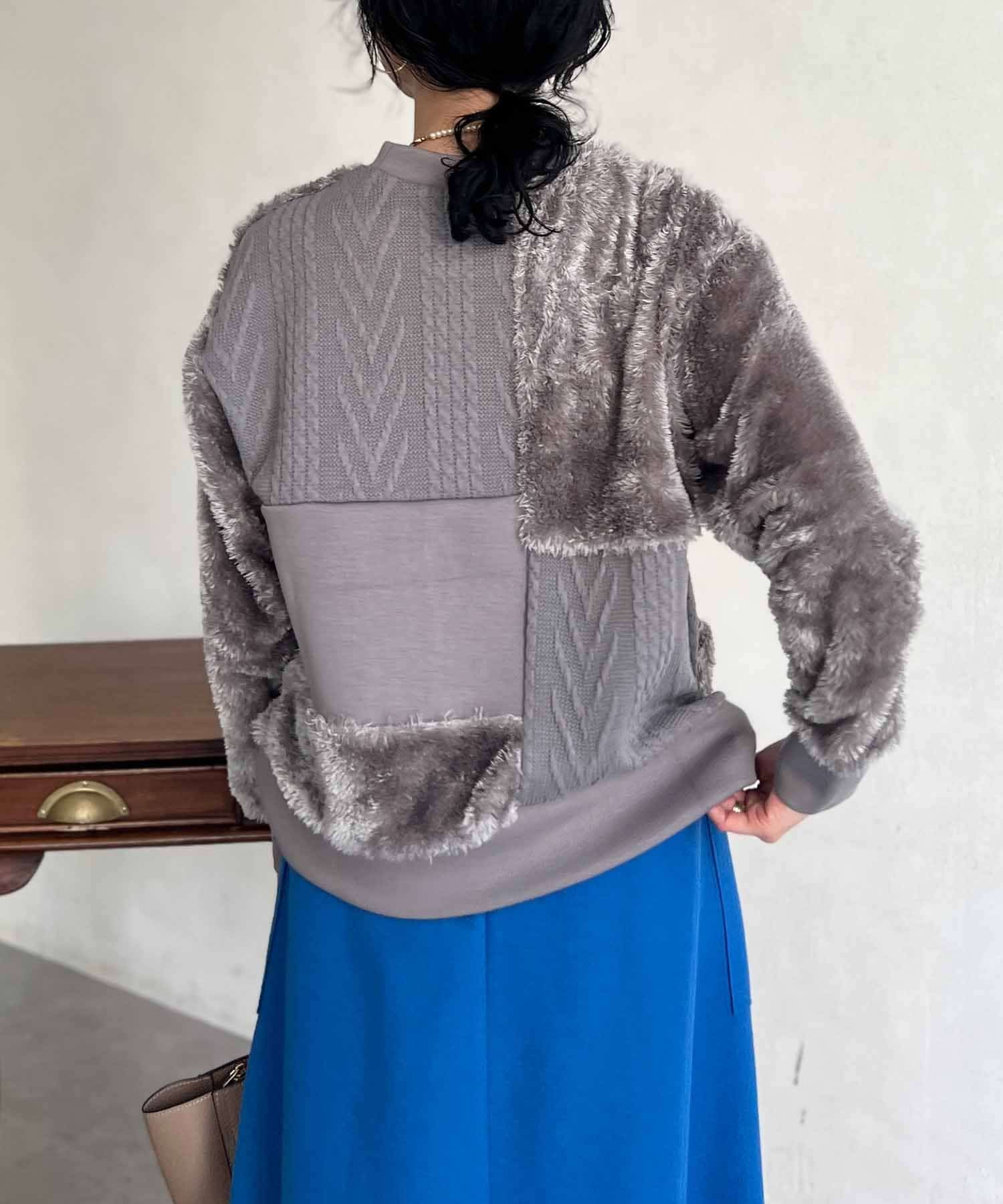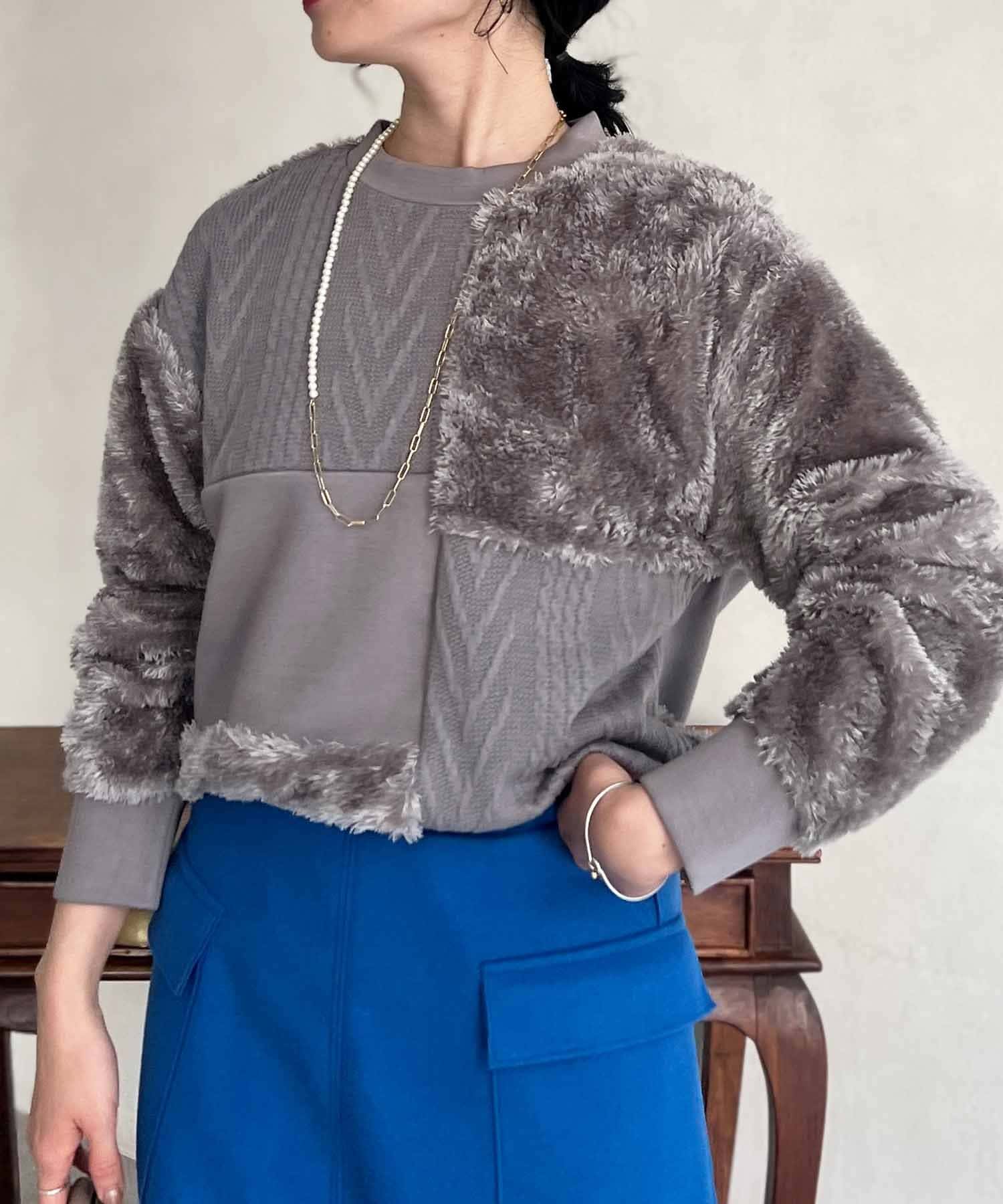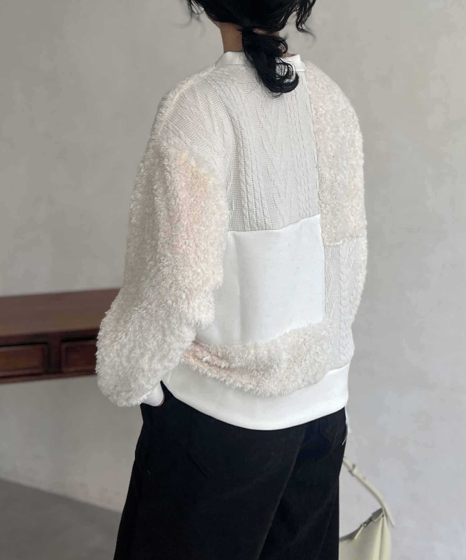 ケーブル編み、ボア、ダンボールニットと3素材を使用したプルオーバー。