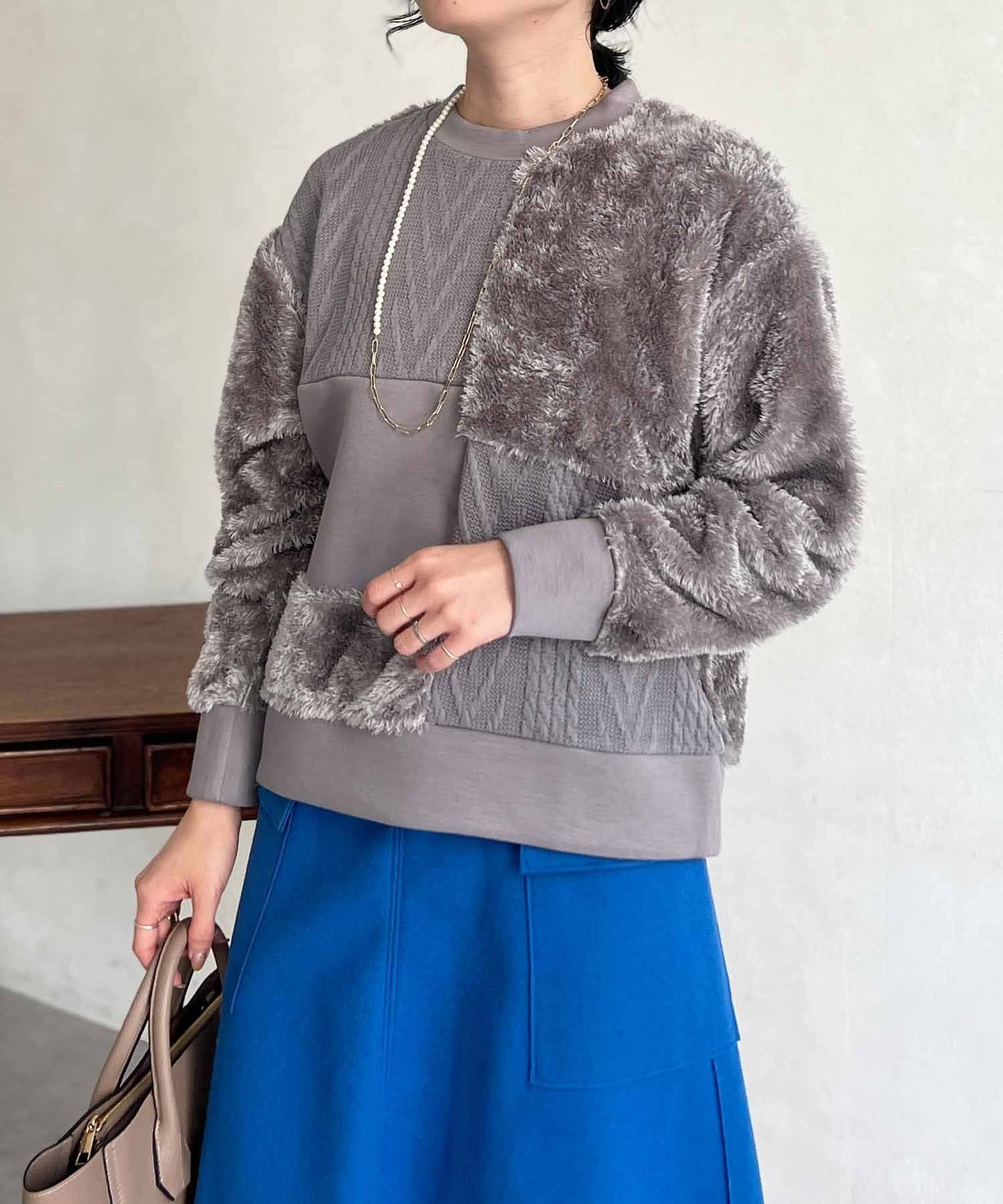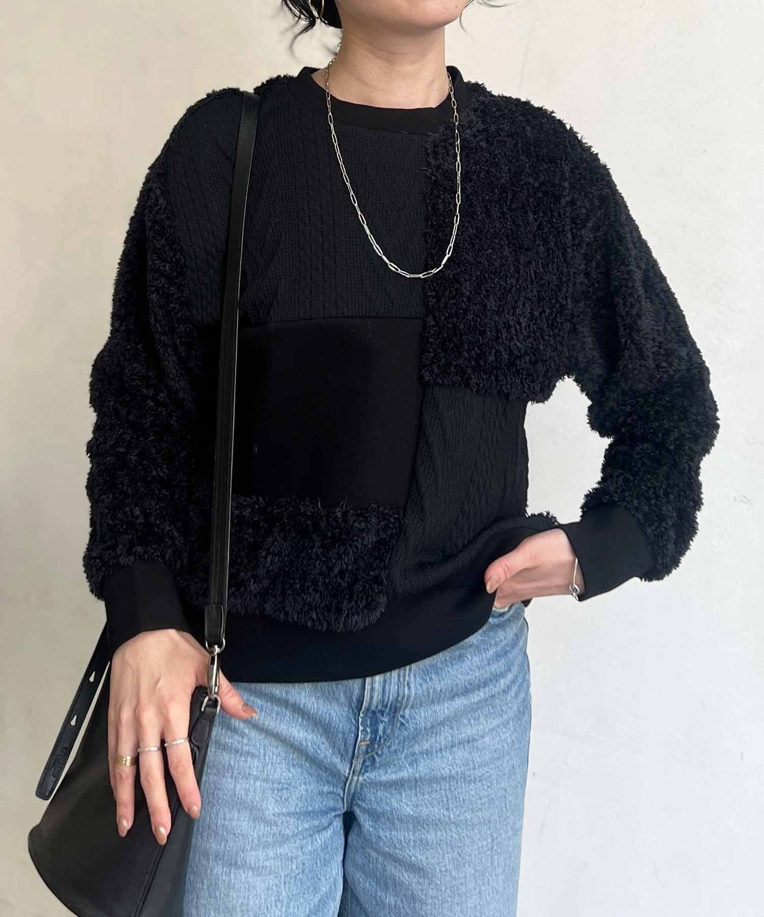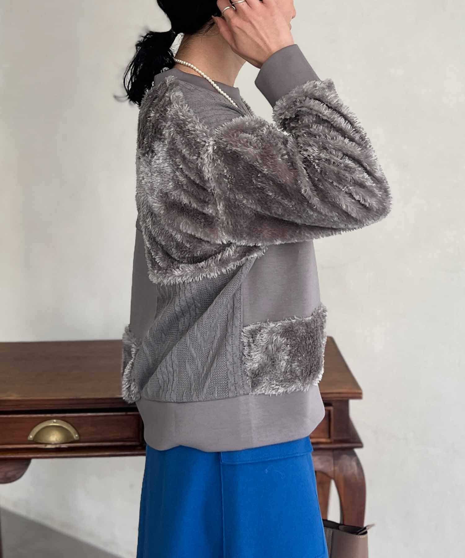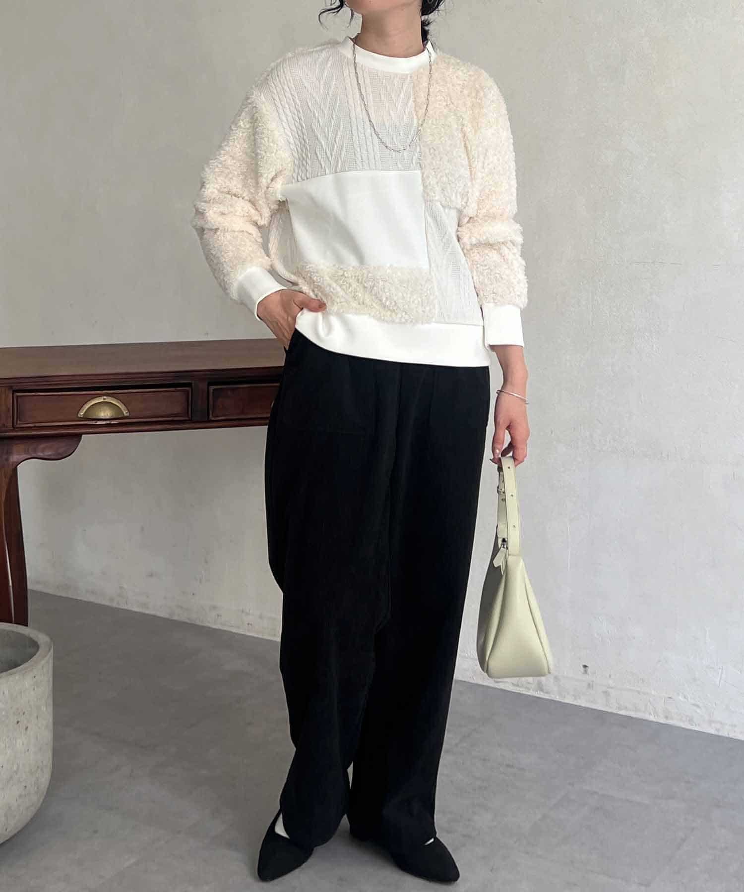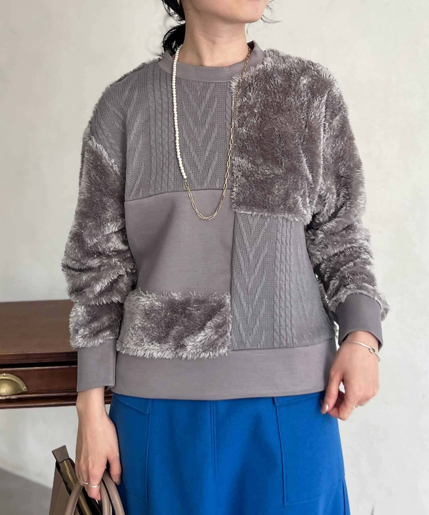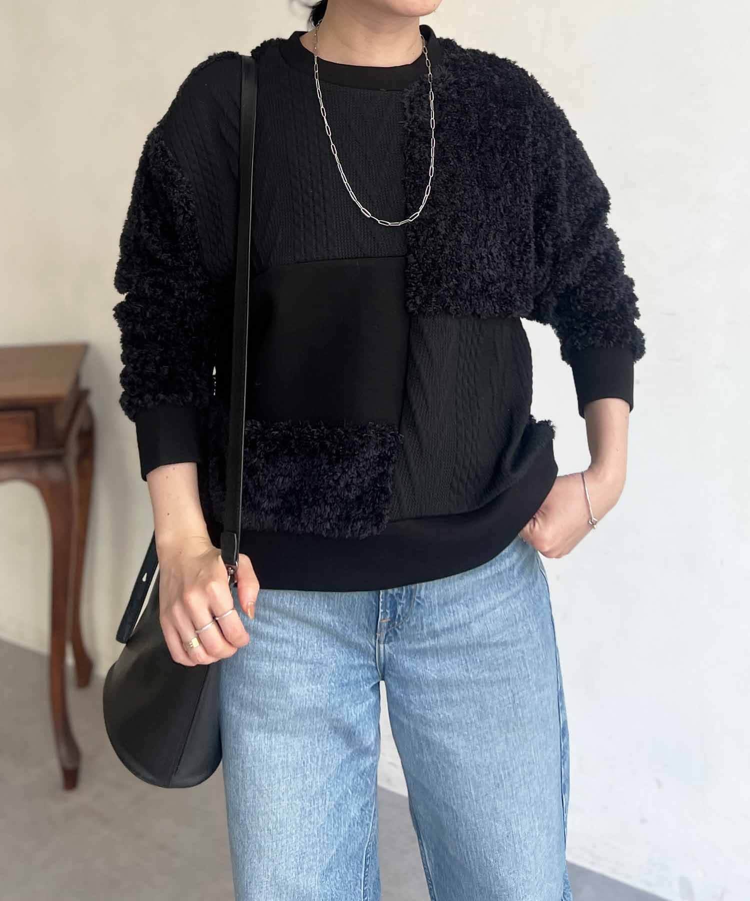 ケーブル編み、ボア、ダンボールニットと3素材を使用したプルオーバー。