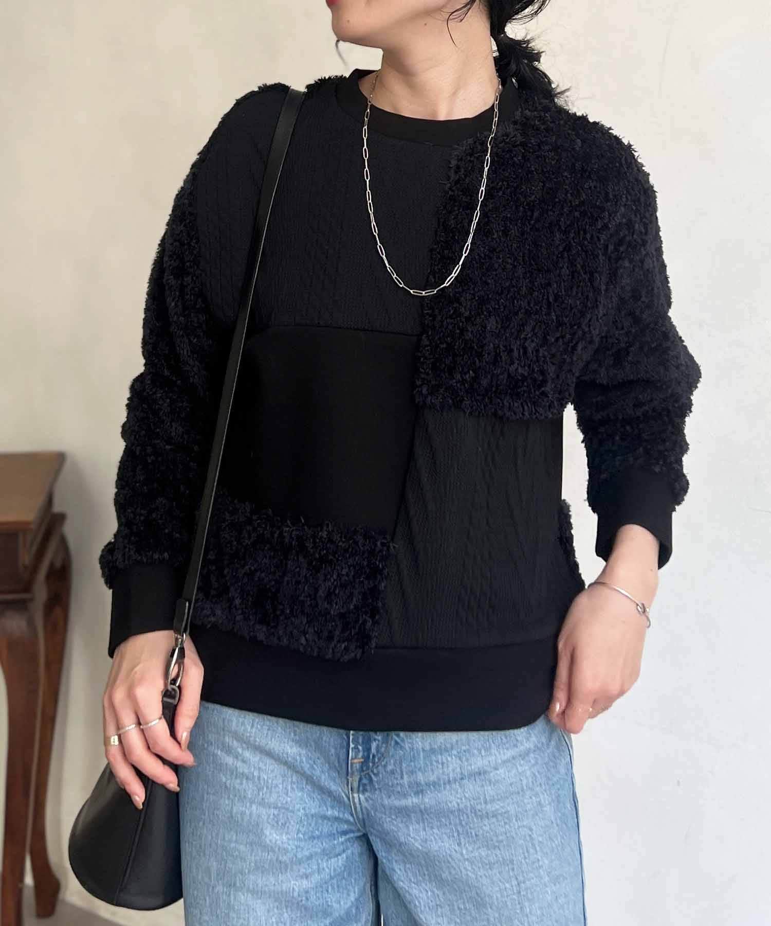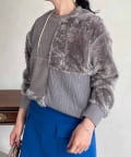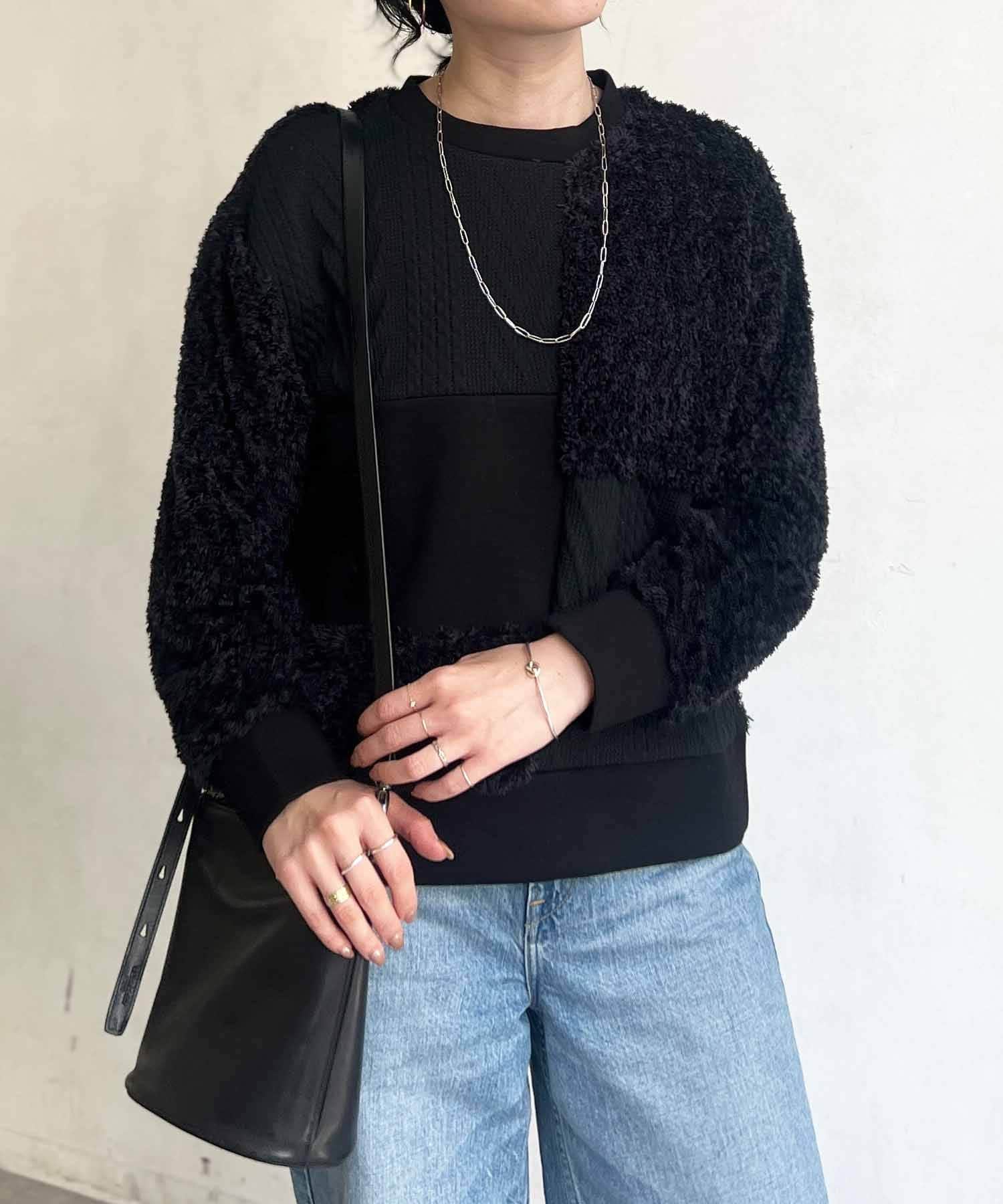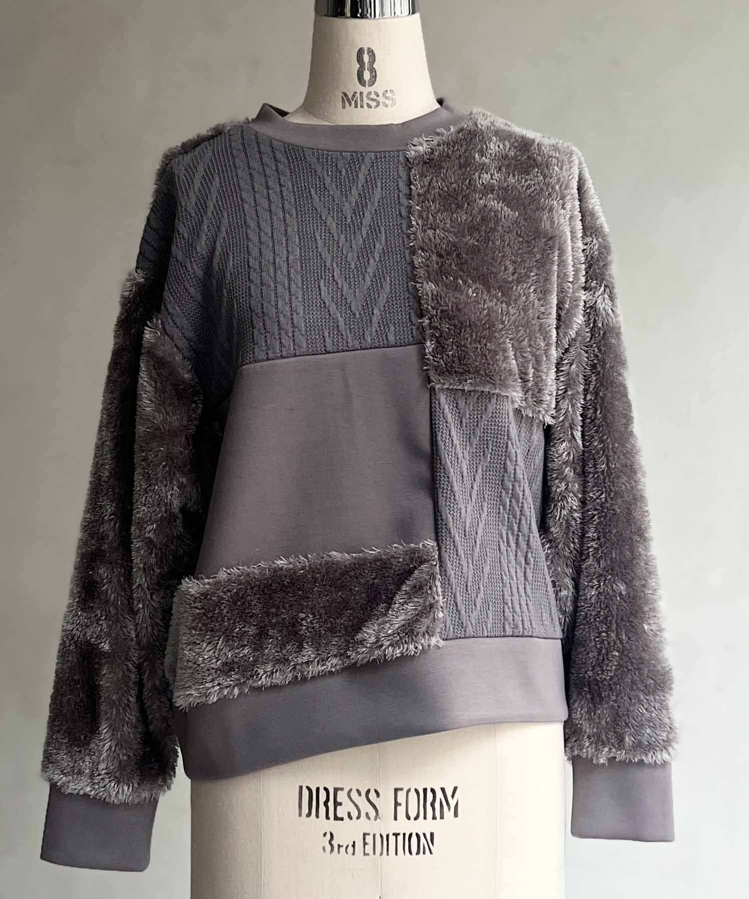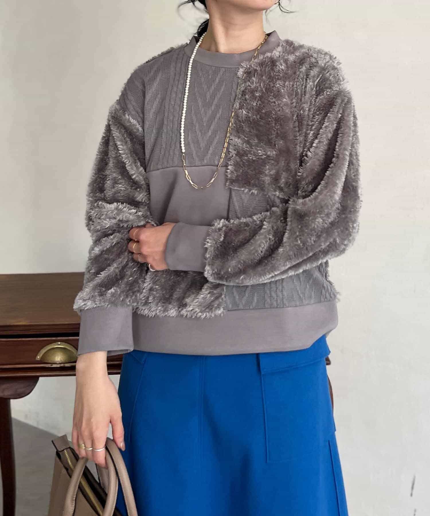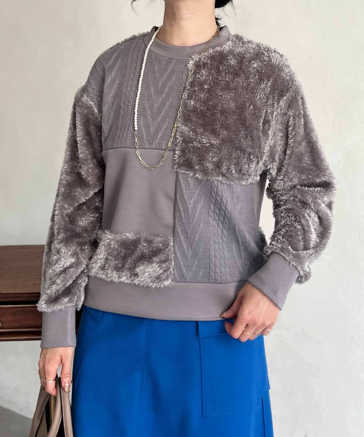 ケーブル編み、ボア、ダンボールニットと3素材を使用したプルオーバー。