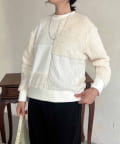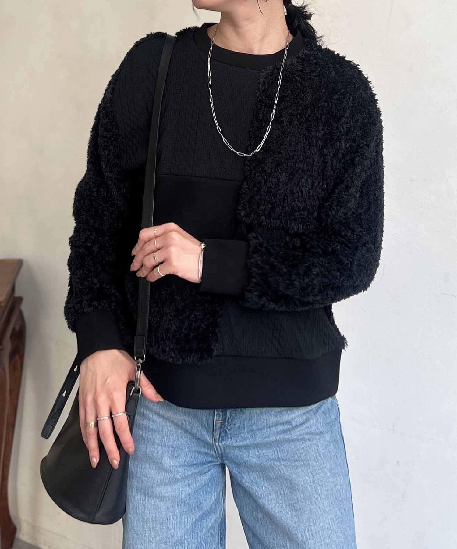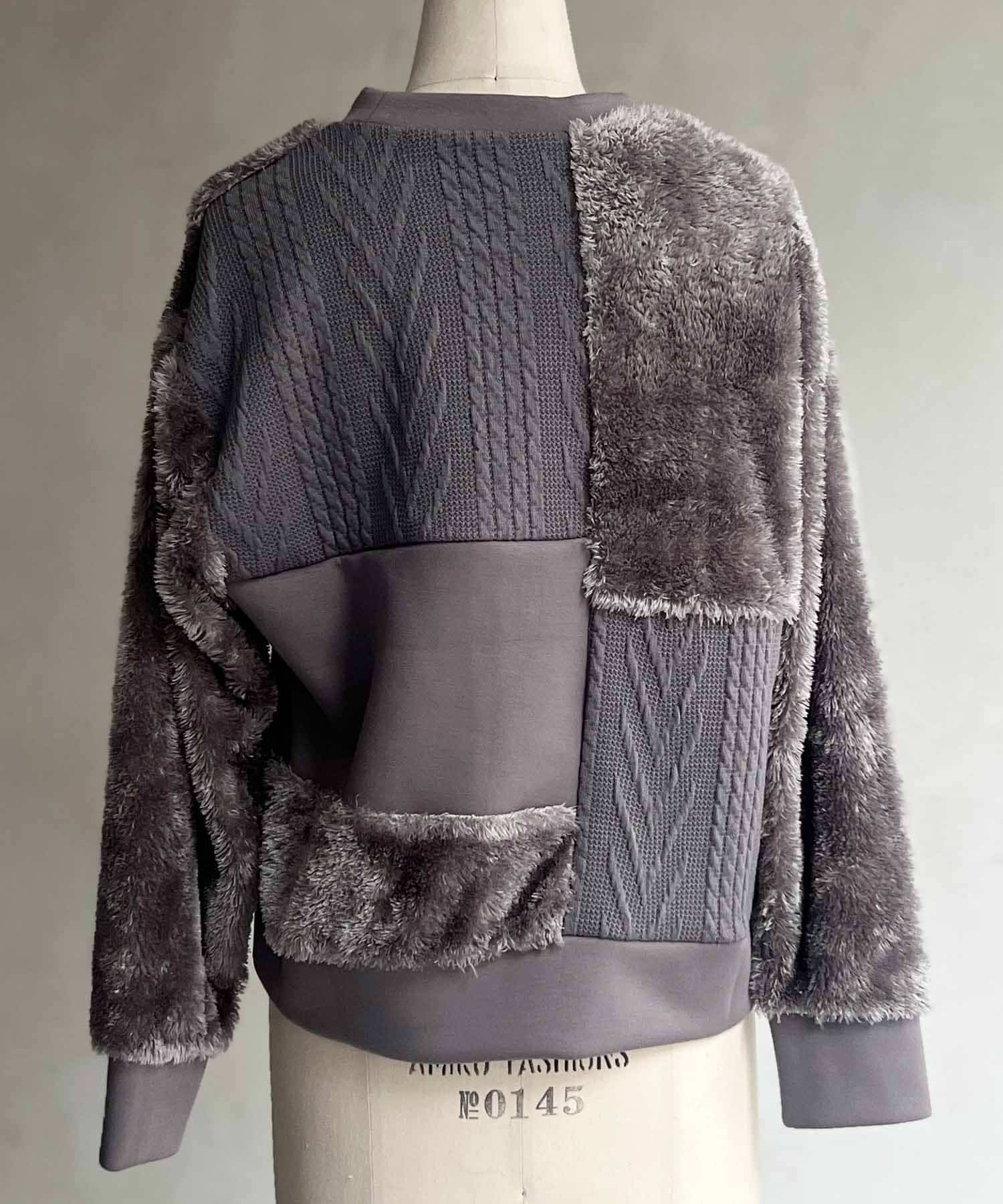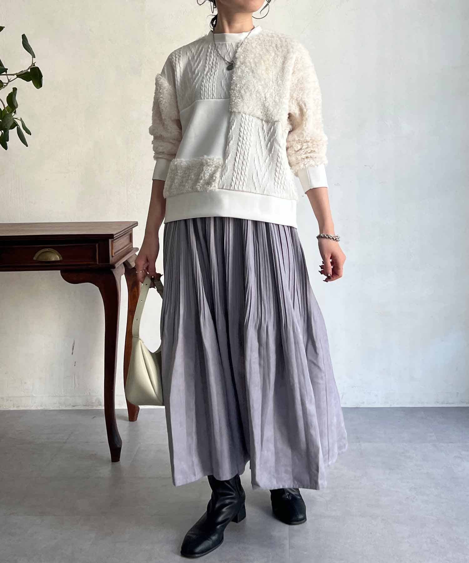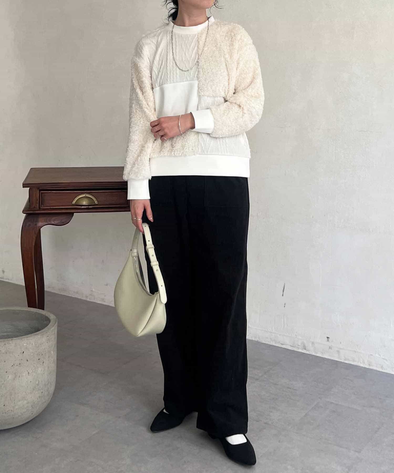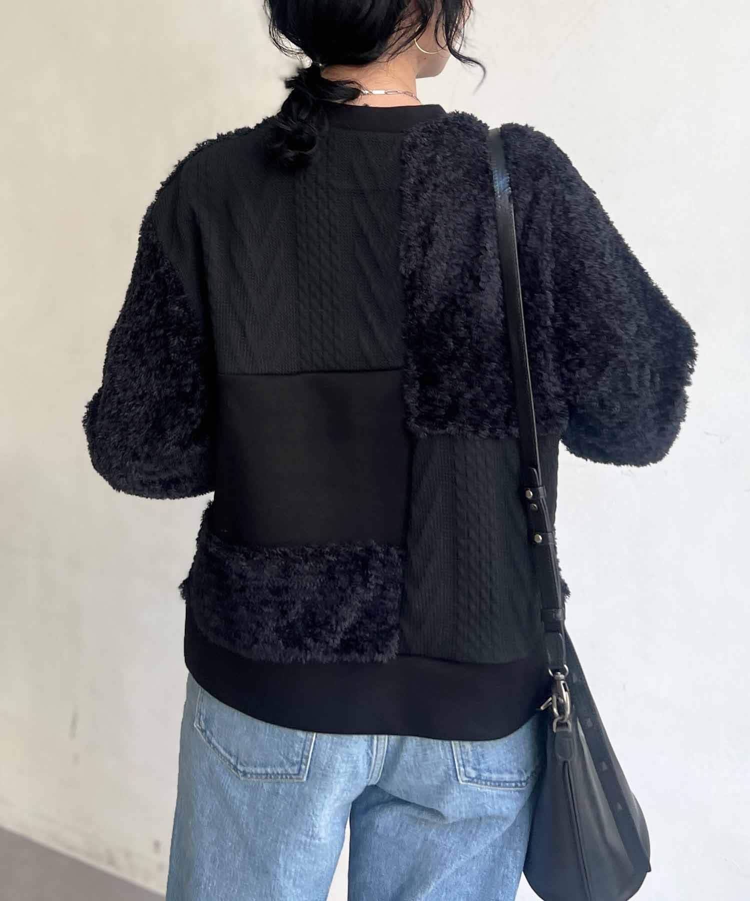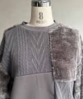 ケーブル編み、ボア、ダンボールニットと3素材を使用したプルオーバー。
