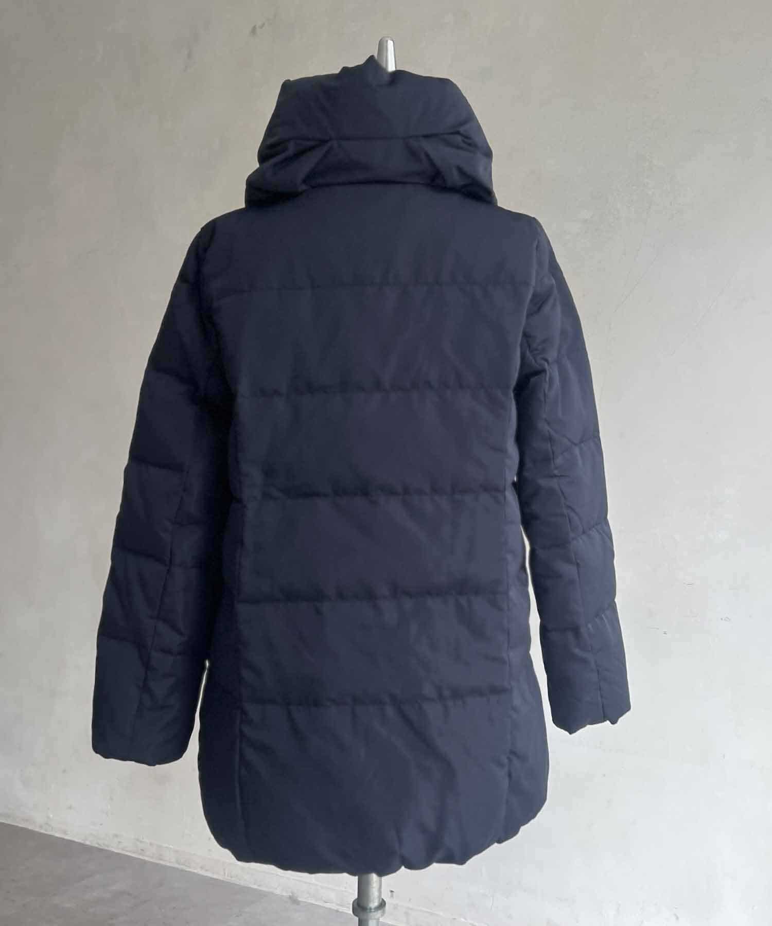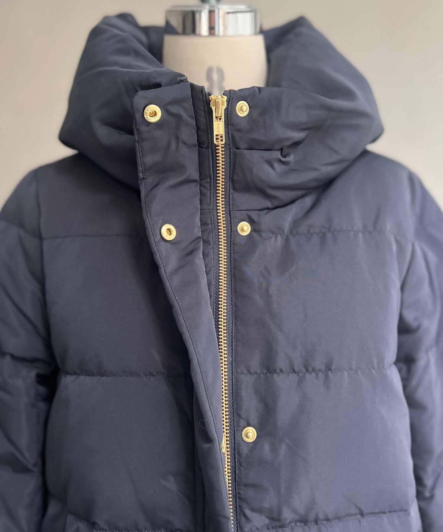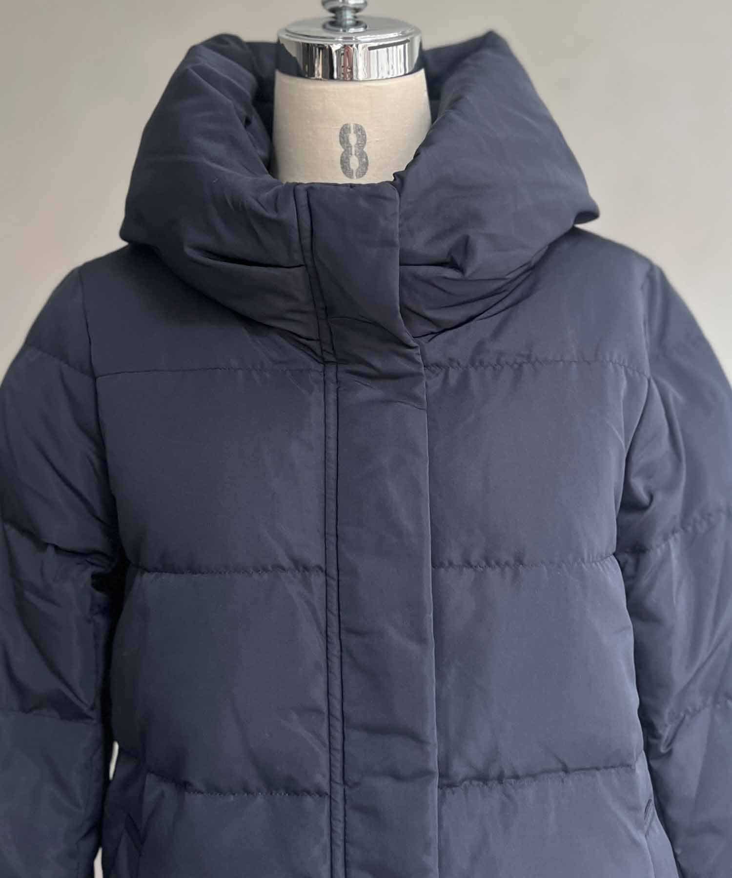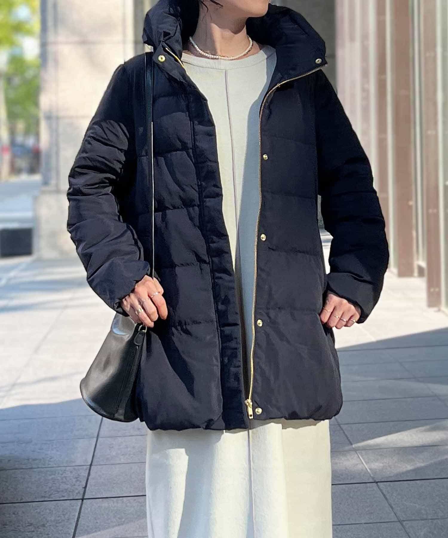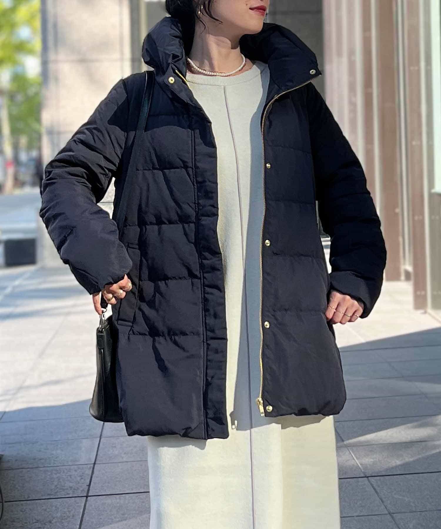 ダウンのボリュームが程良いのでスタイル良く見えると思います。首元がふっくらして風が冷たい日でも暖かいです。ネイビーの生地とゴールドのスナップが上品に見えます。