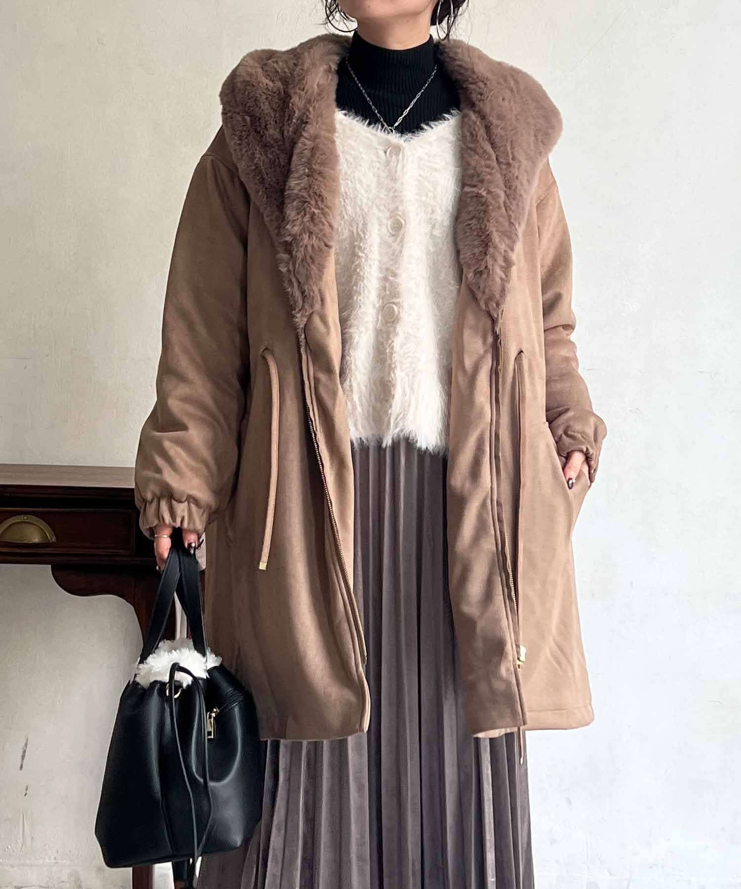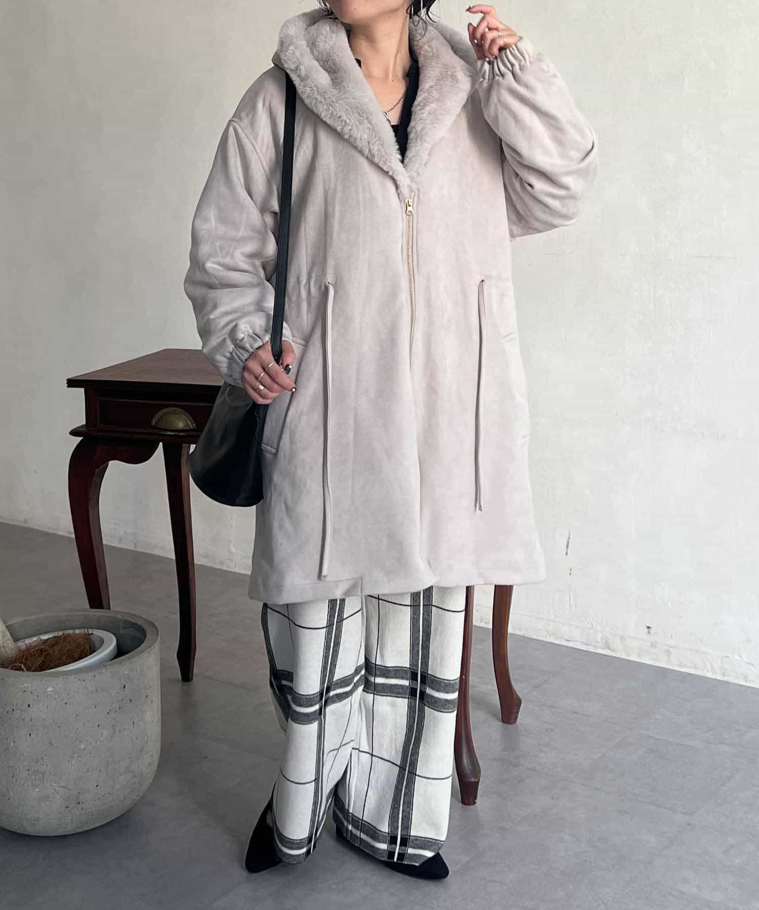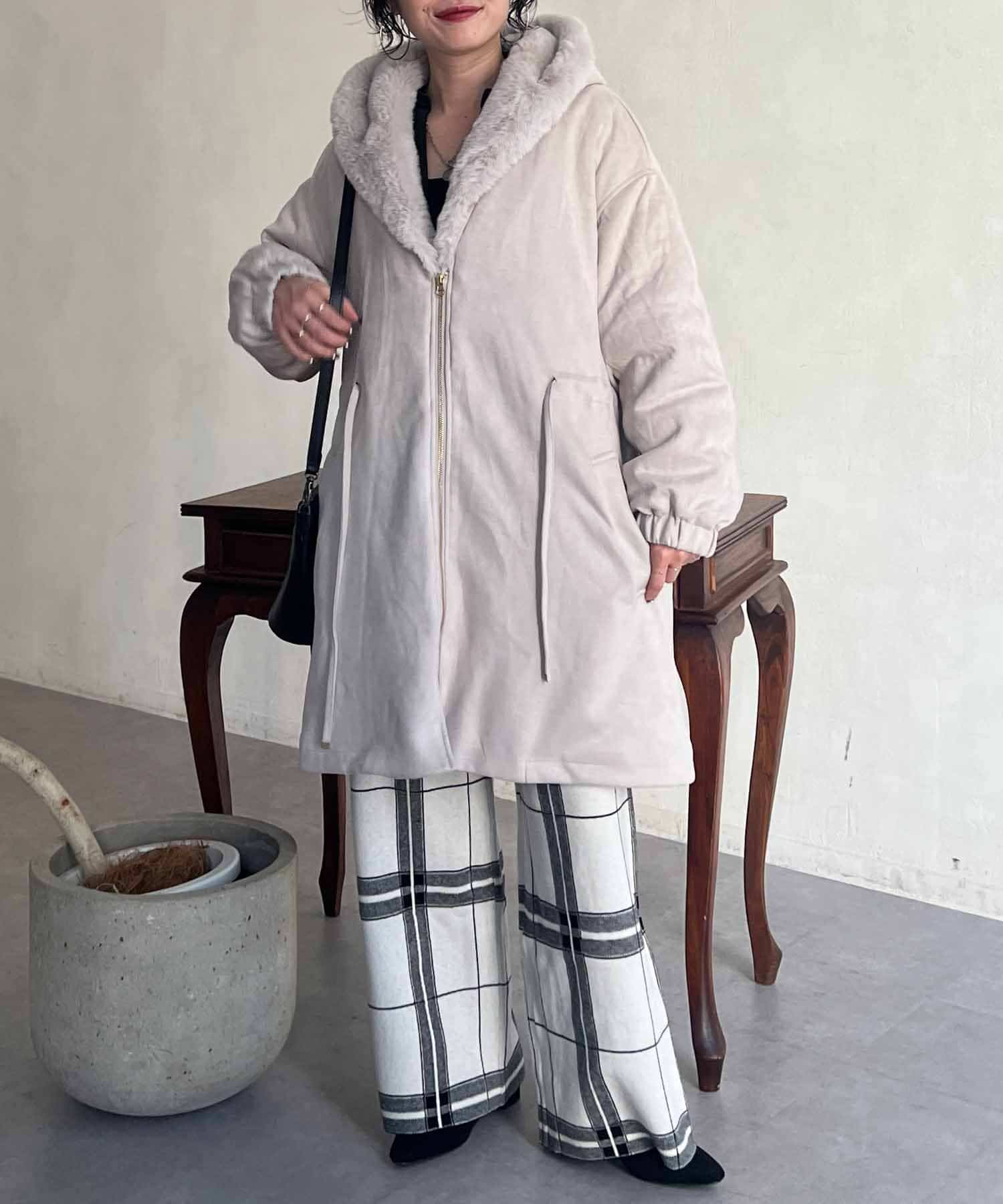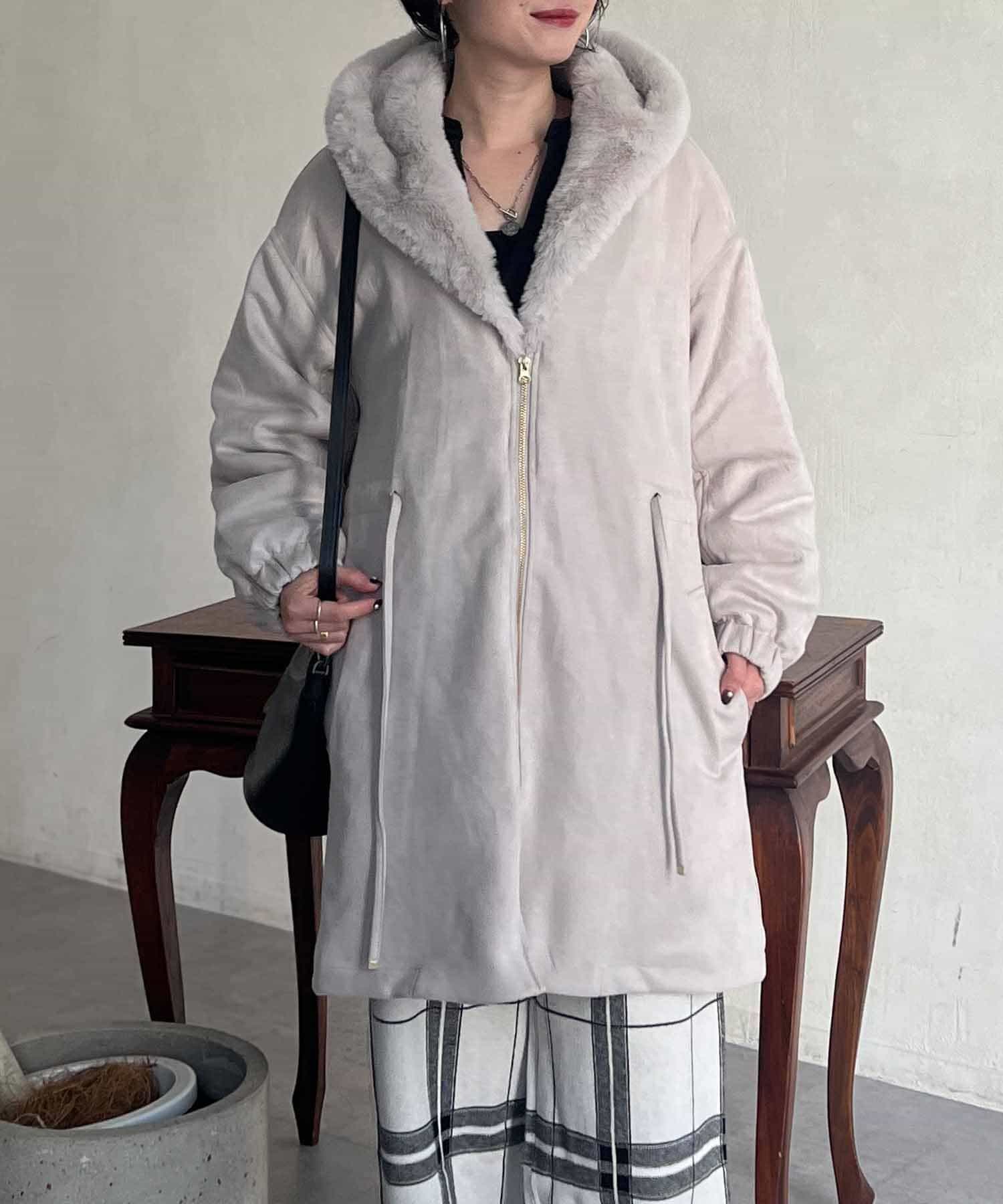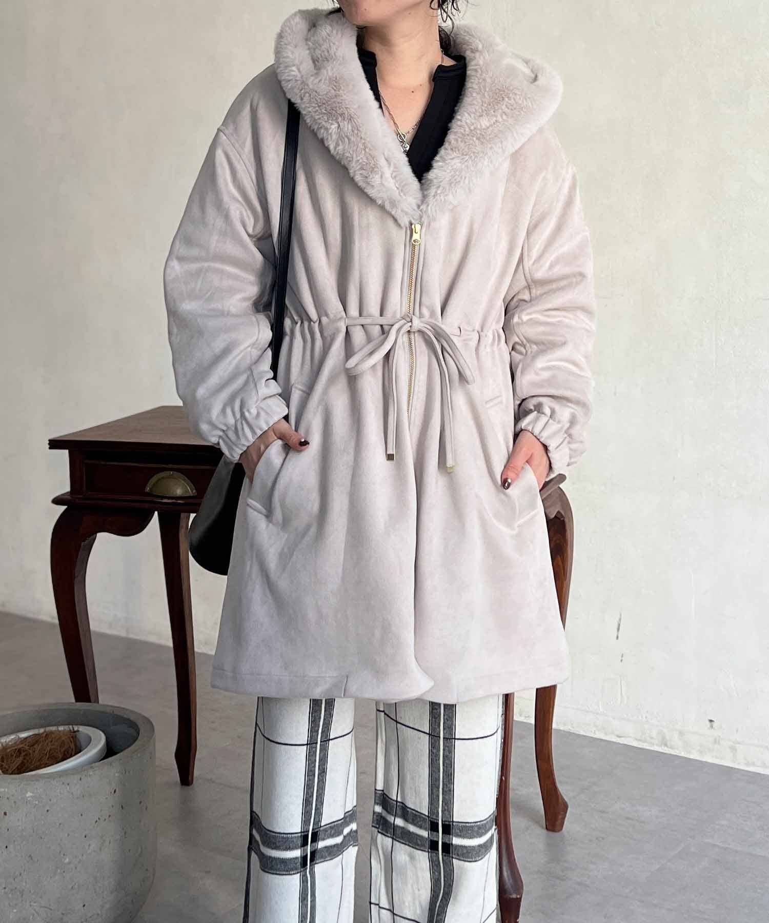 フード裏にはふわふわのファーを施し、華やかな印象をプラスしました。