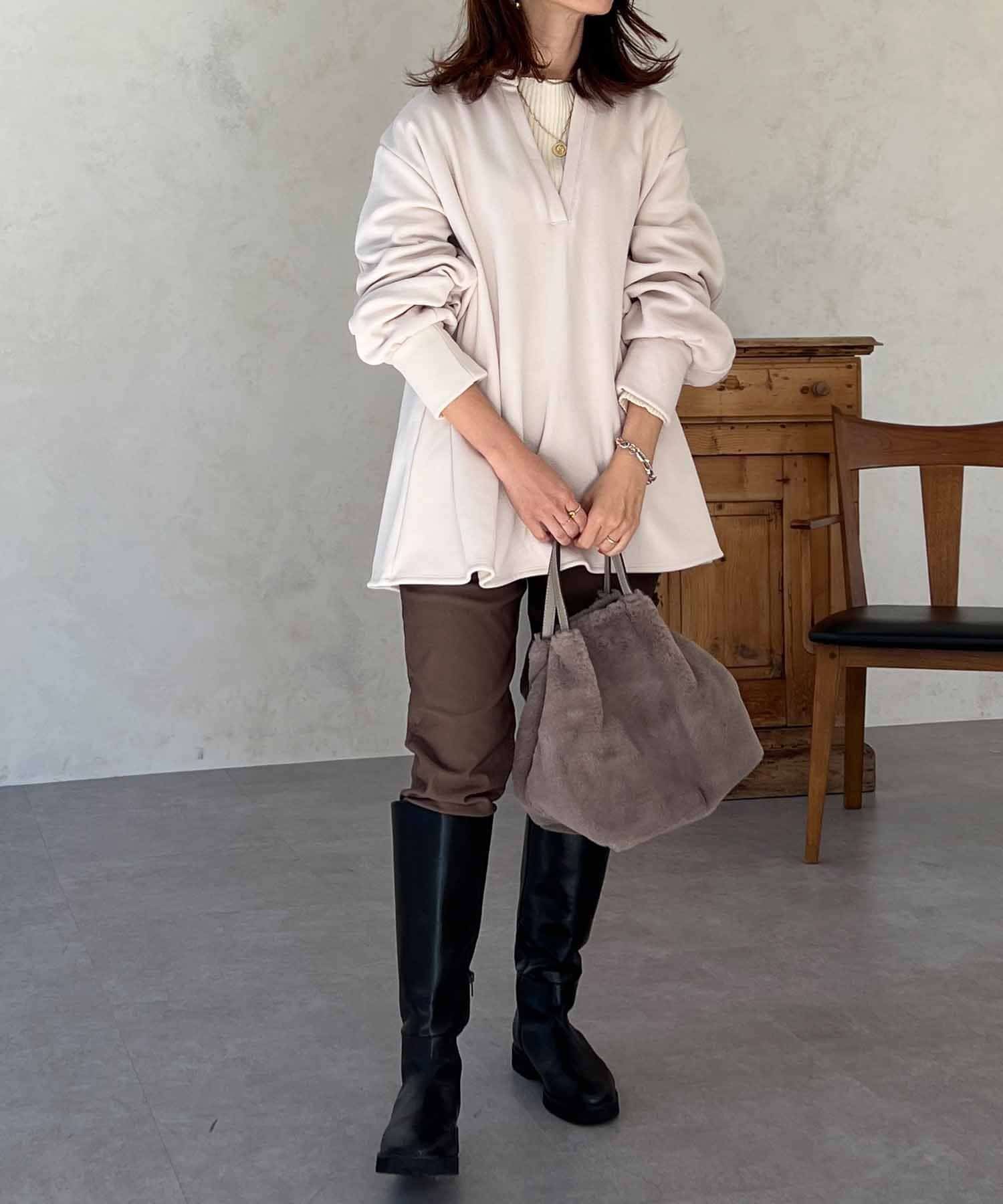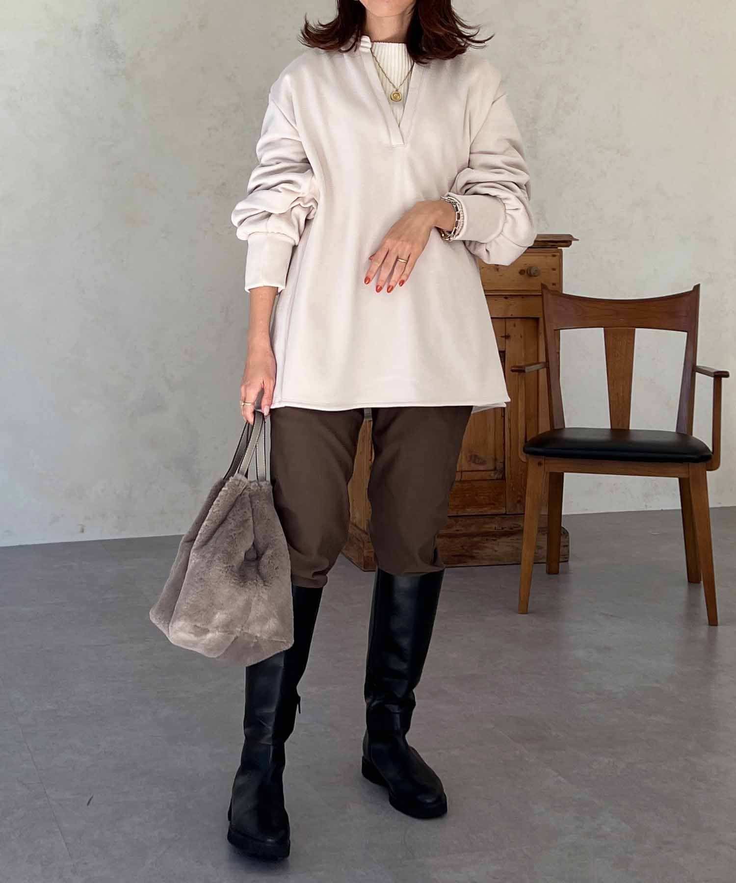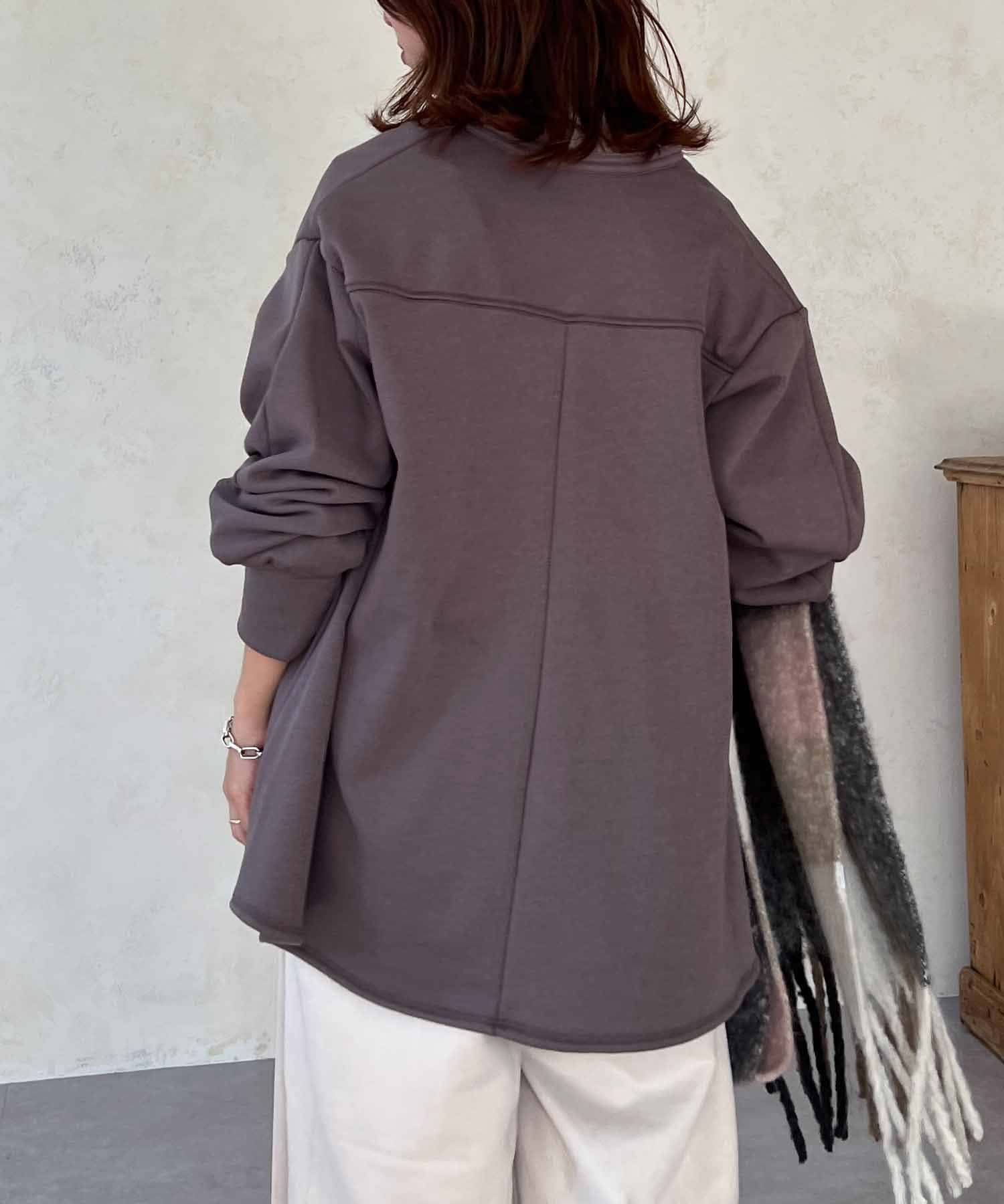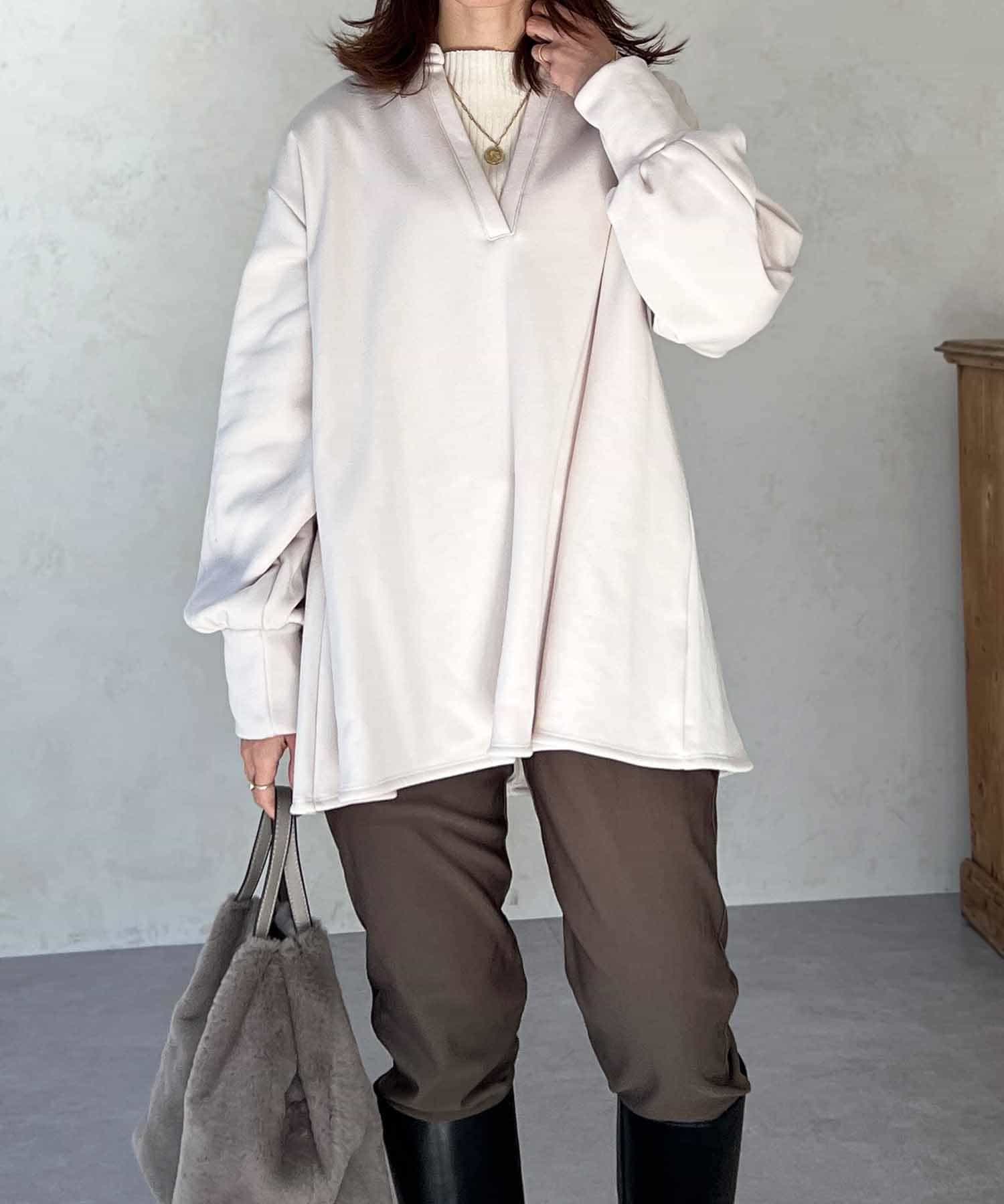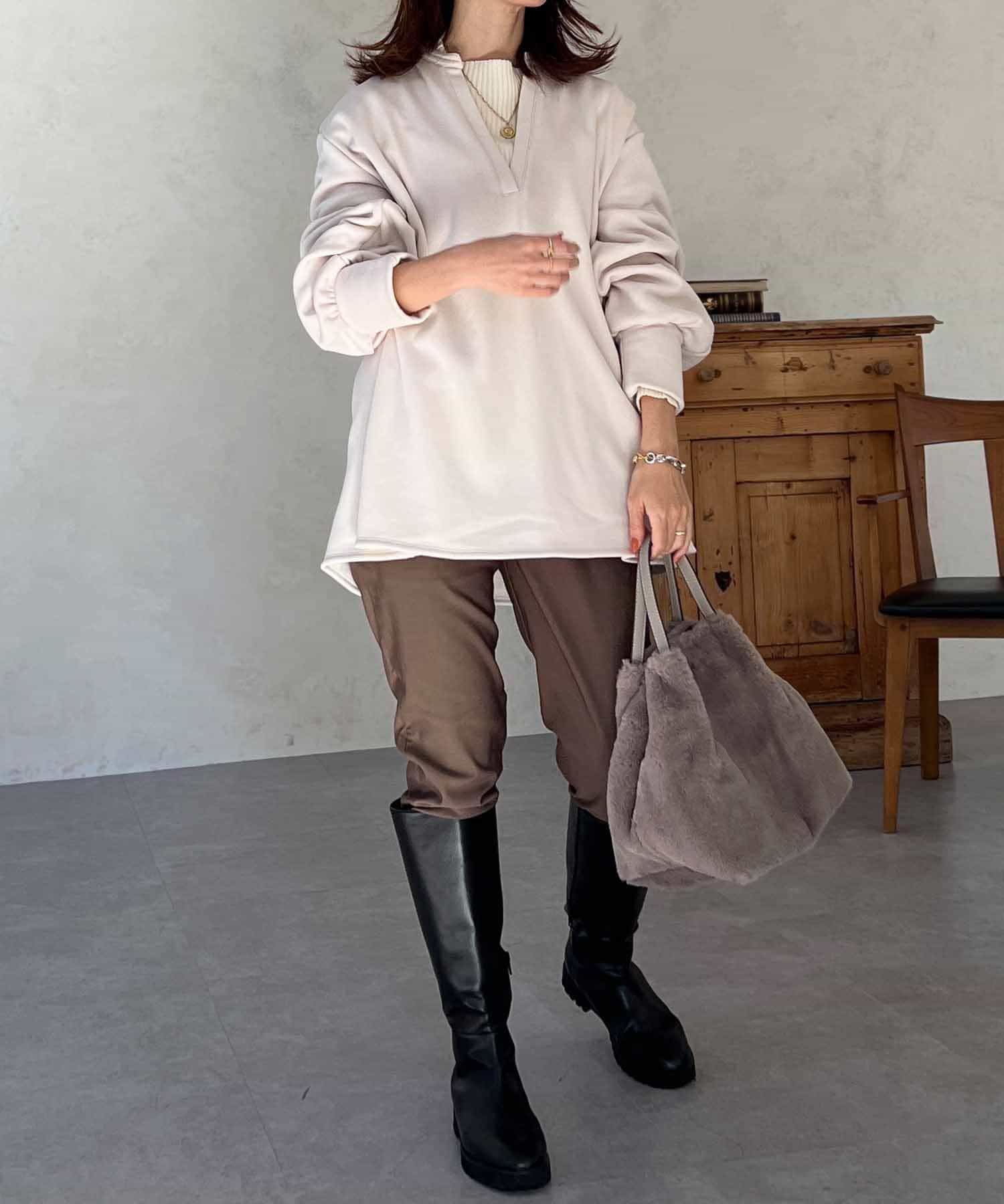 表側は毛羽立ちの少ないキレイめな印象のカットソー素材を使用しているので、スキニーパンツで合わせたすっきりコーデにもぴったり!