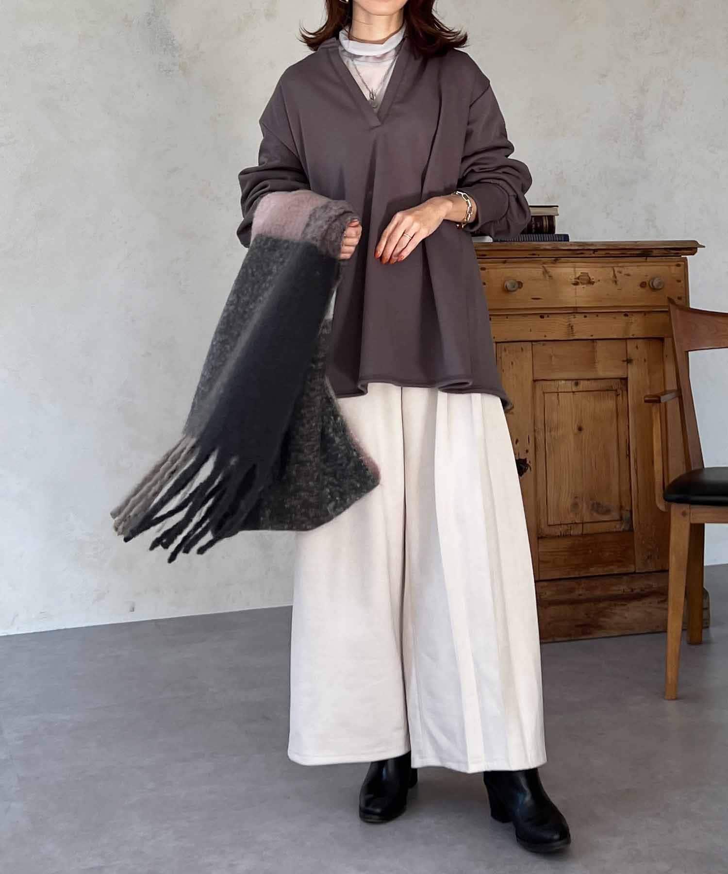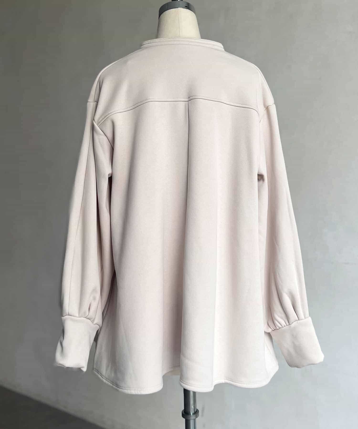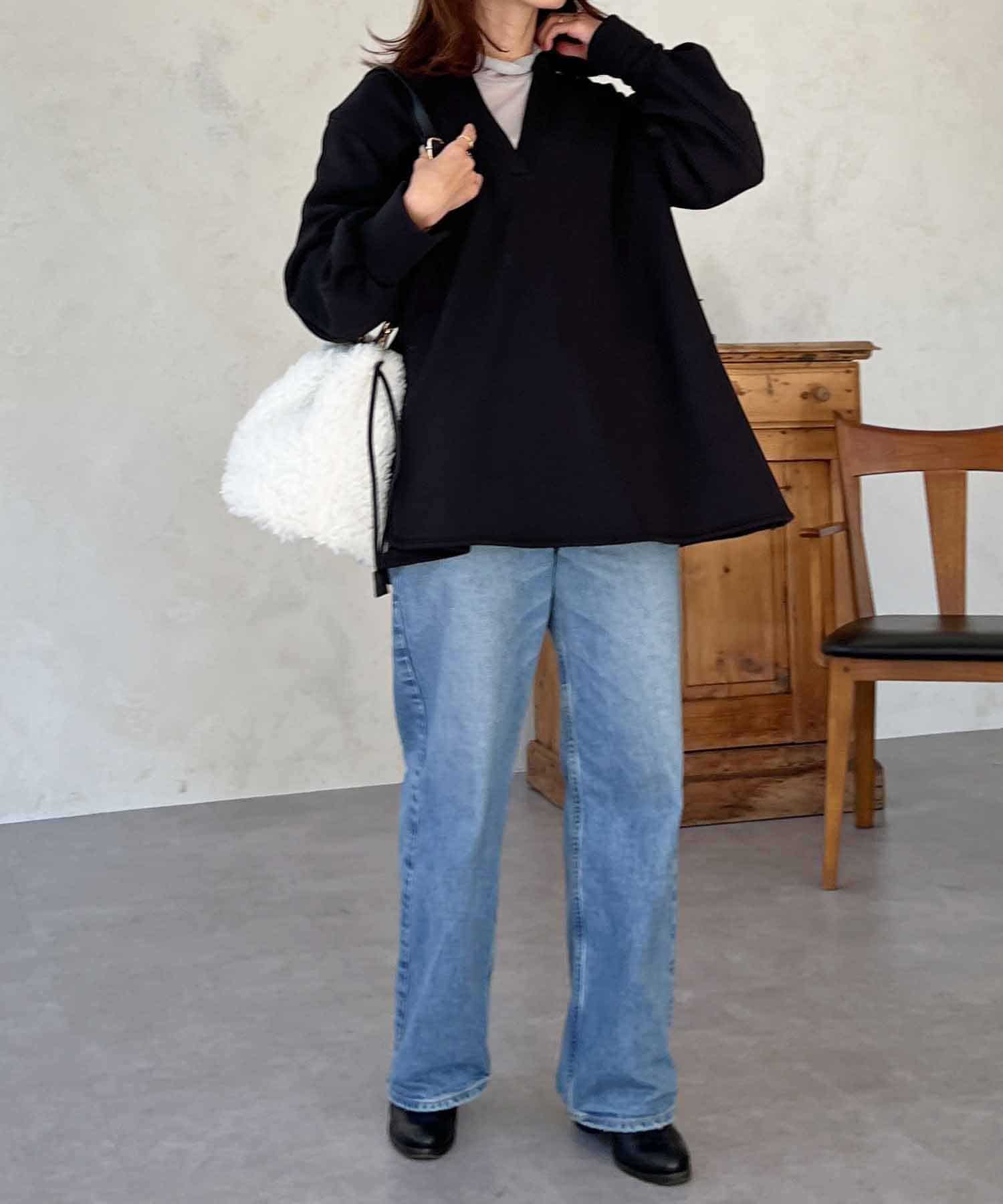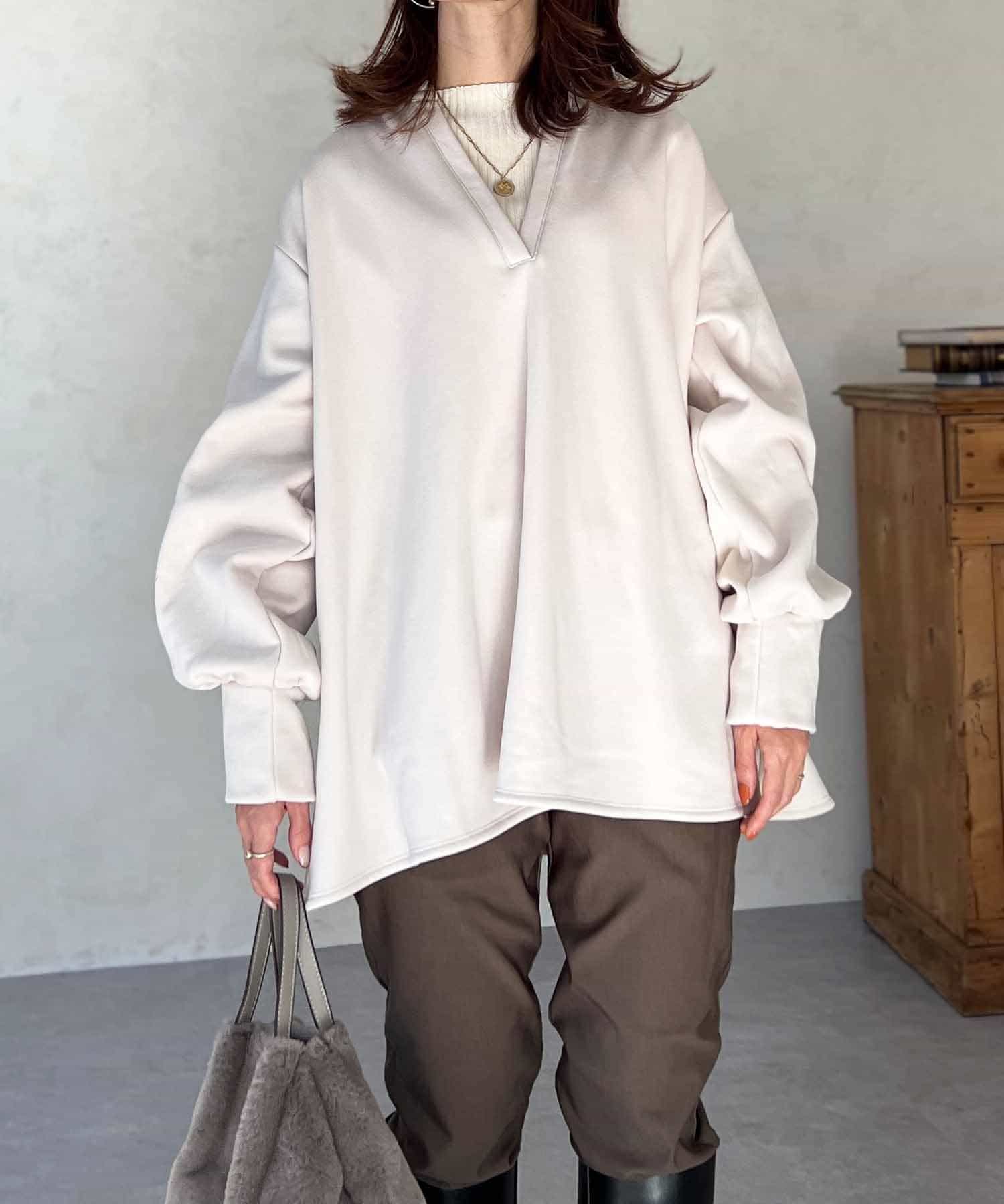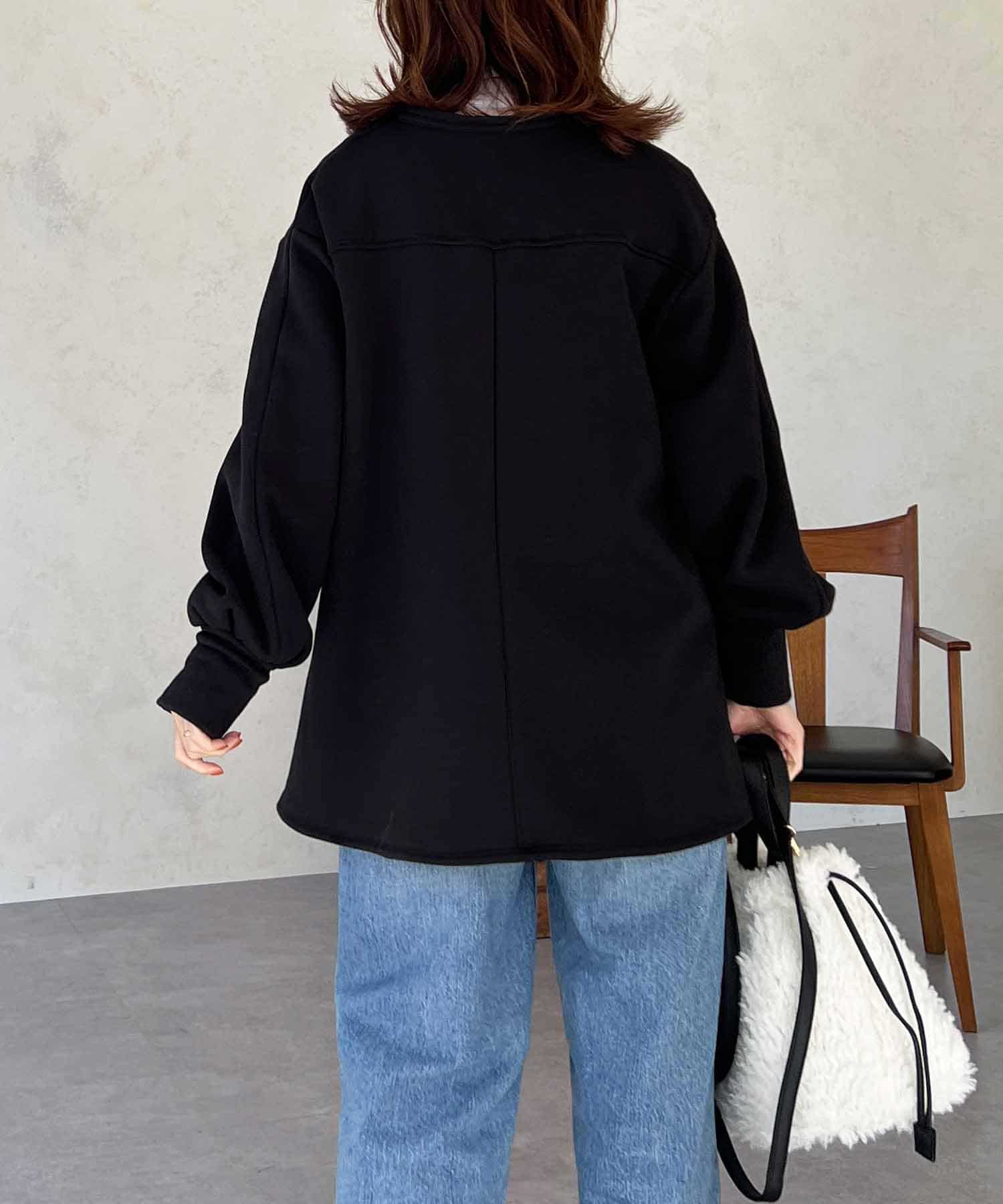 表側は毛羽立ちの少ないキレイめな印象のカットソー素材を使用しているので、スキニーパンツで合わせたすっきりコーデにもぴったり!