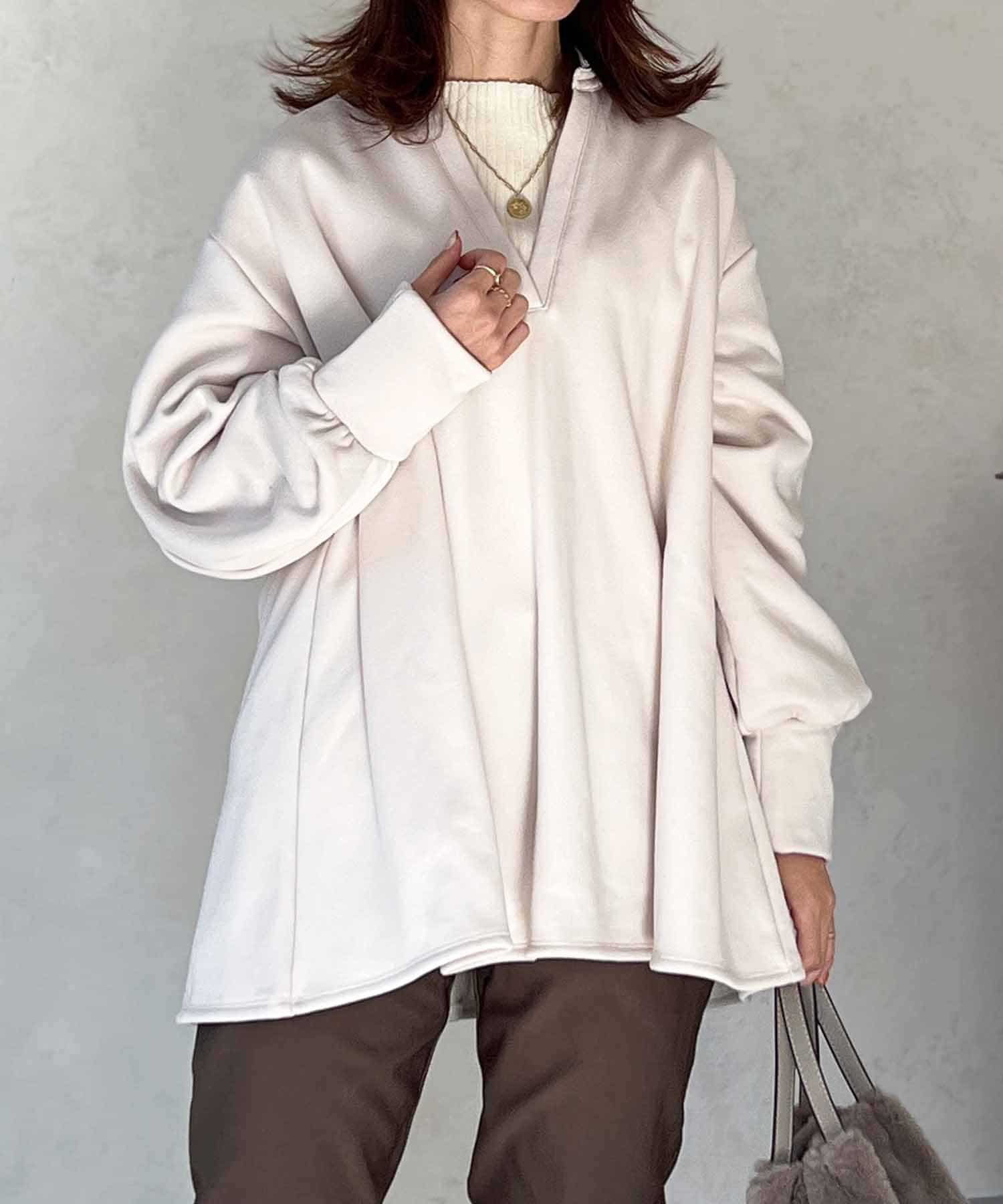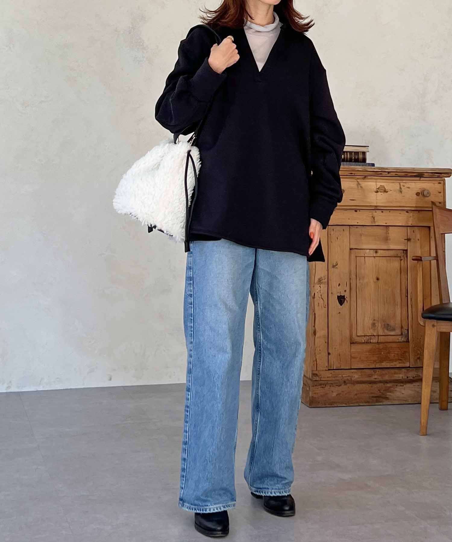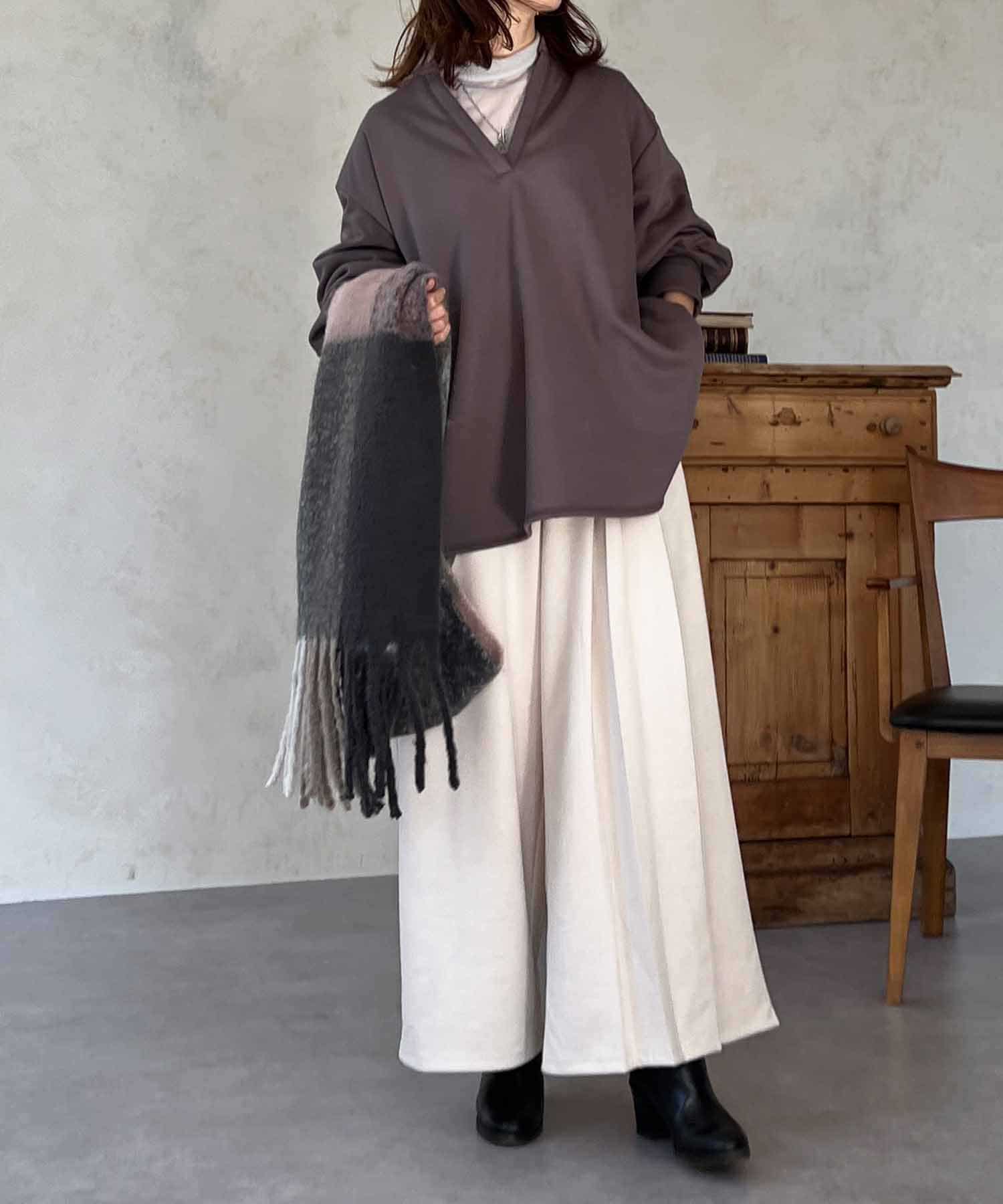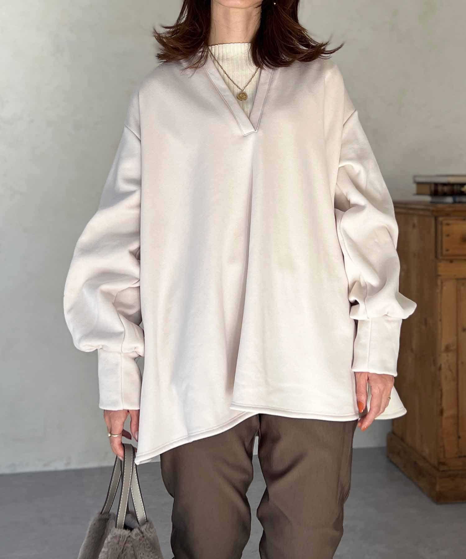 表側は毛羽立ちの少ないキレイめな印象のカットソー素材を使用しているので、スキニーパンツで合わせたすっきりコーデにもぴったり!