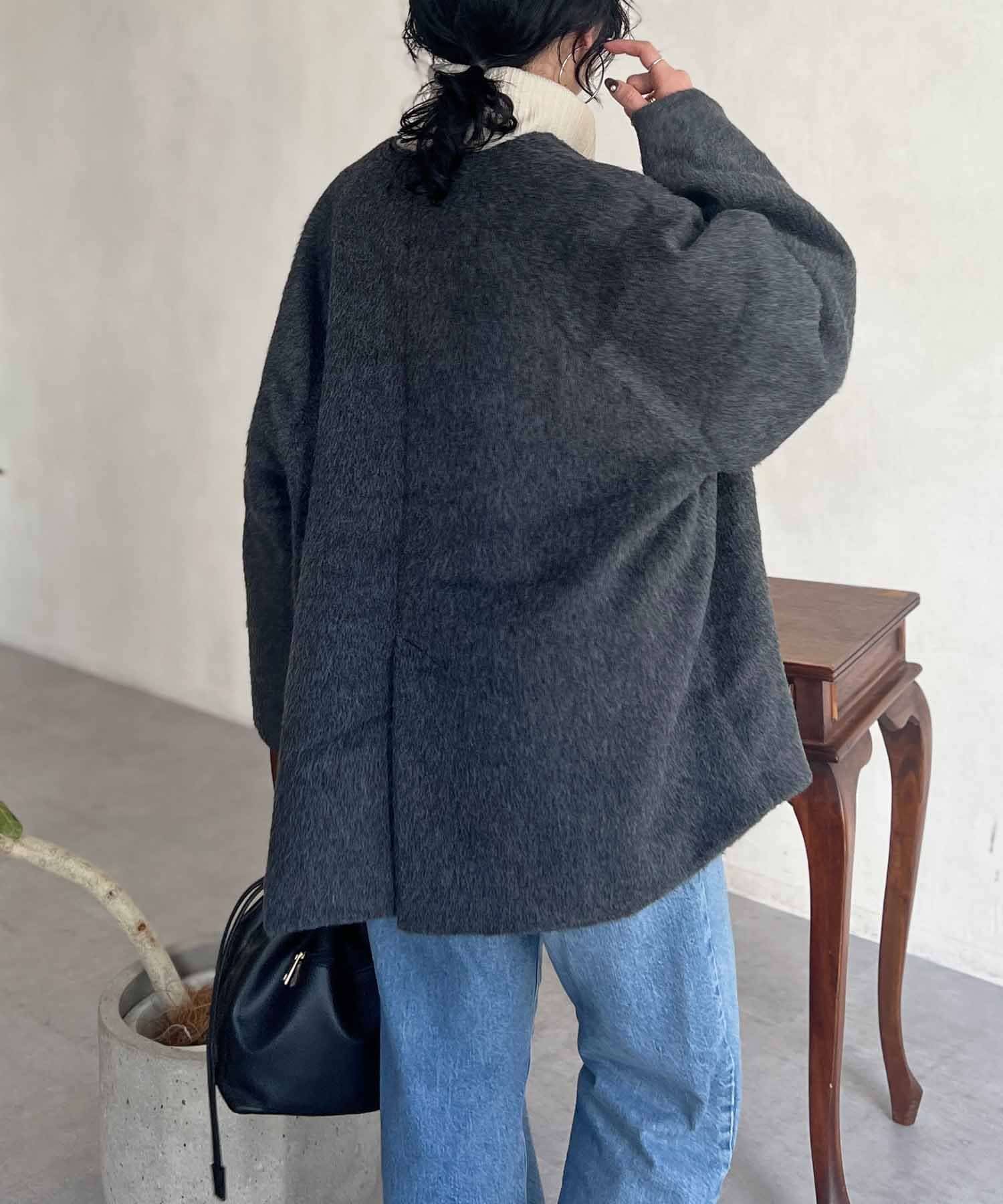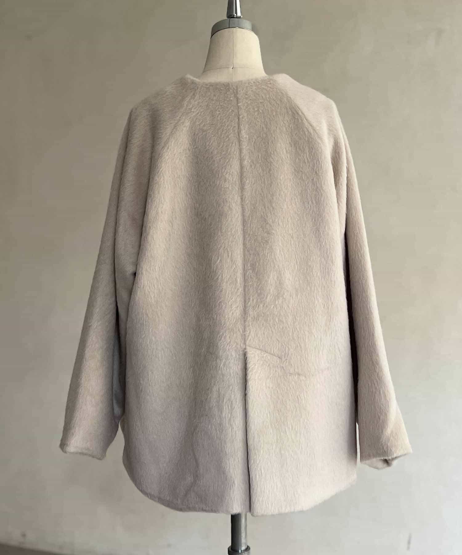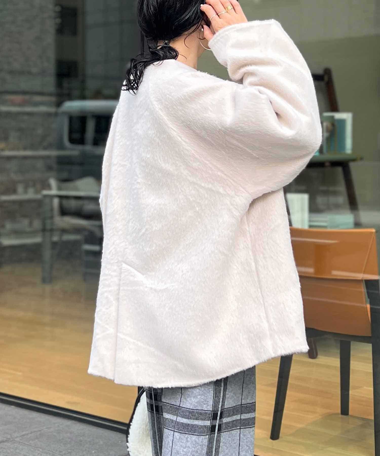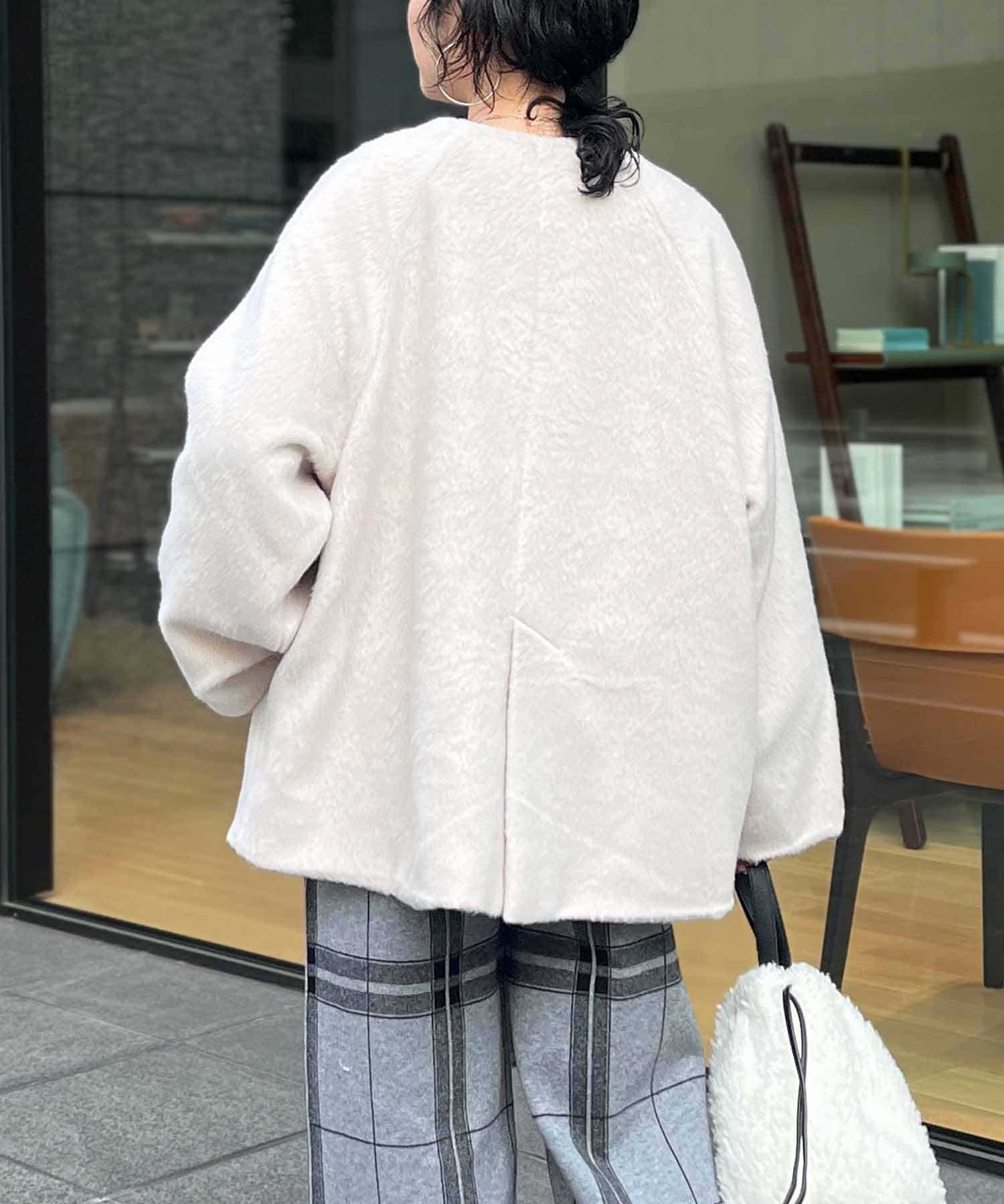 柔らかいシャギー生地を使用したノーカラージャケット。