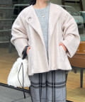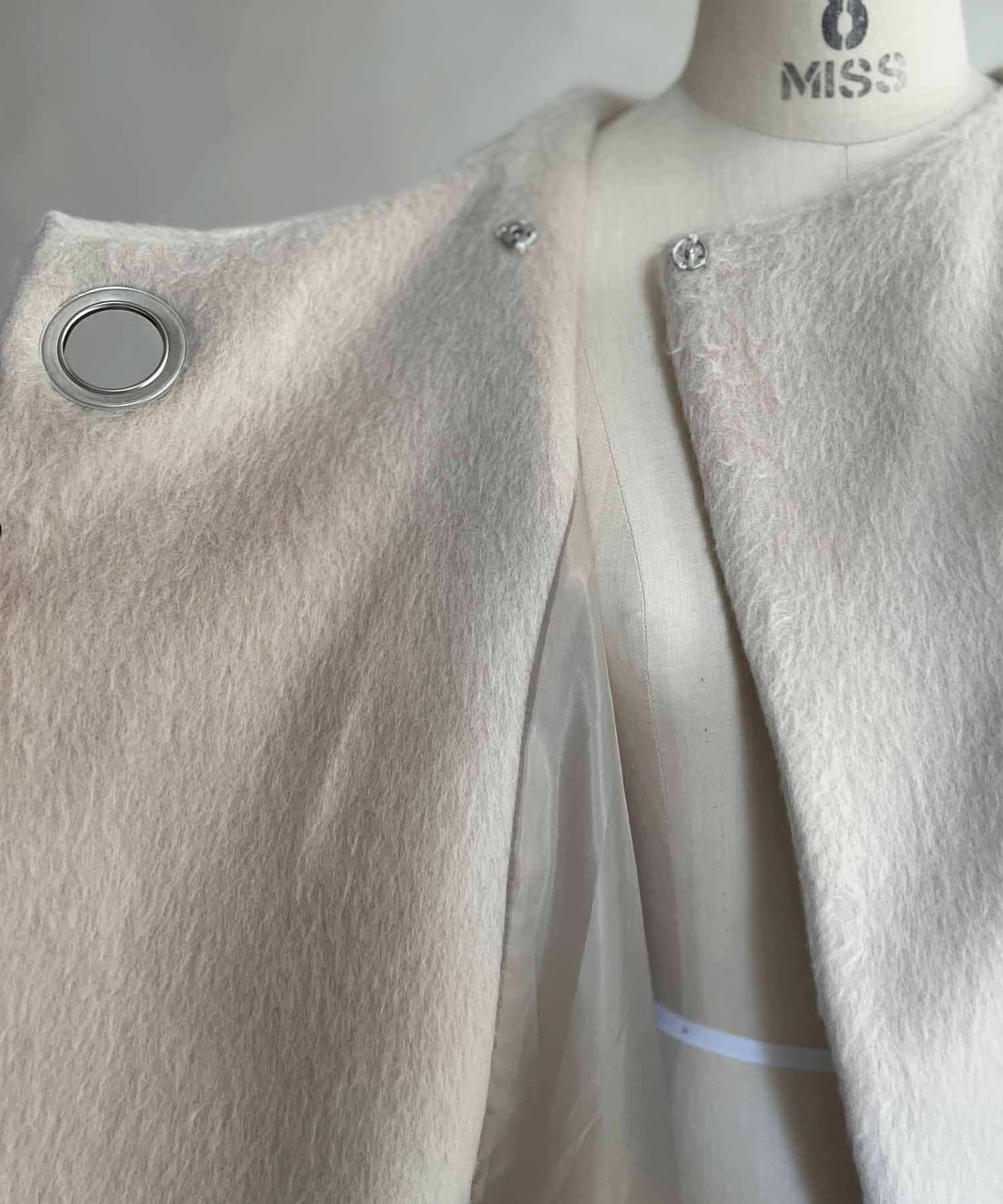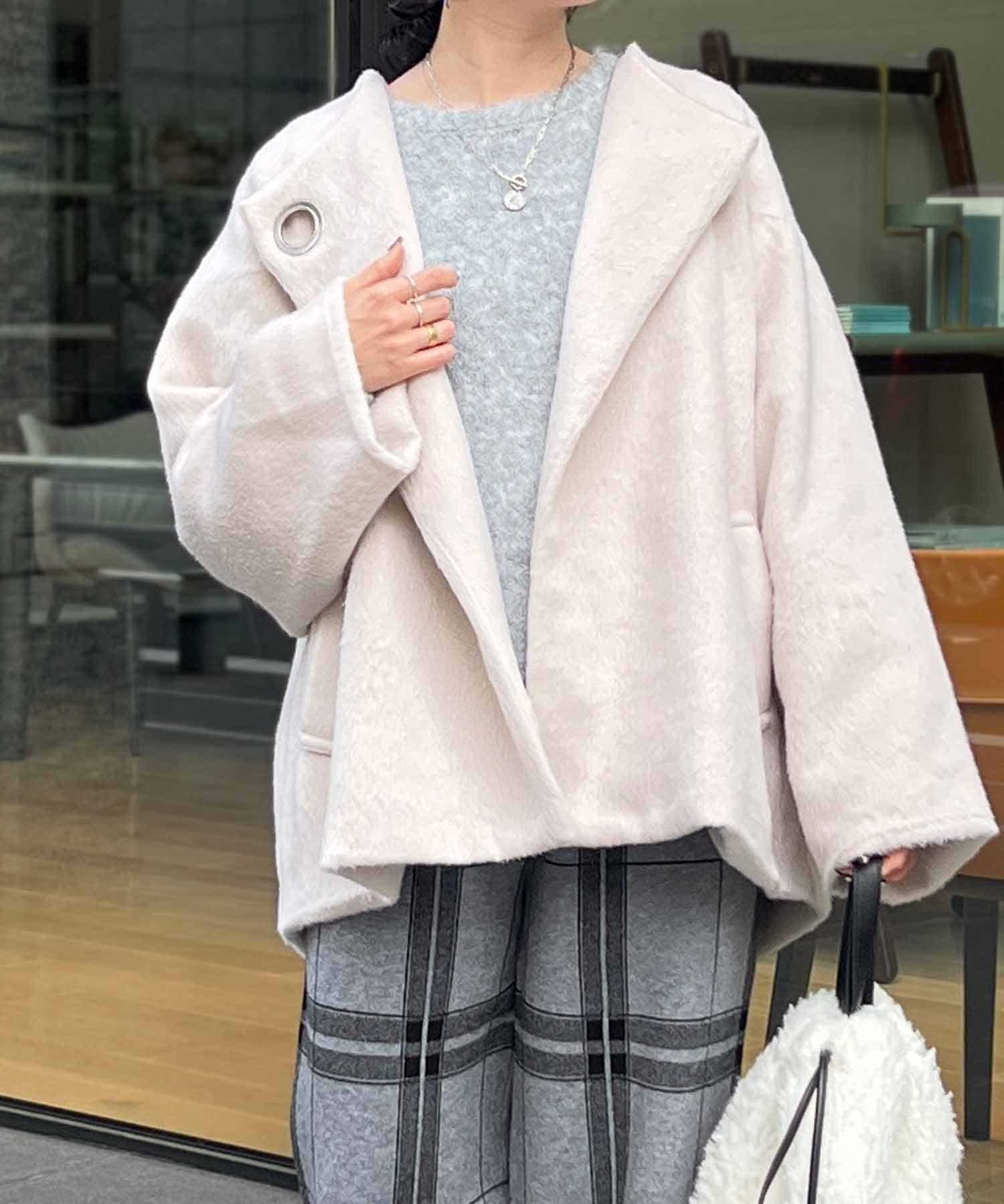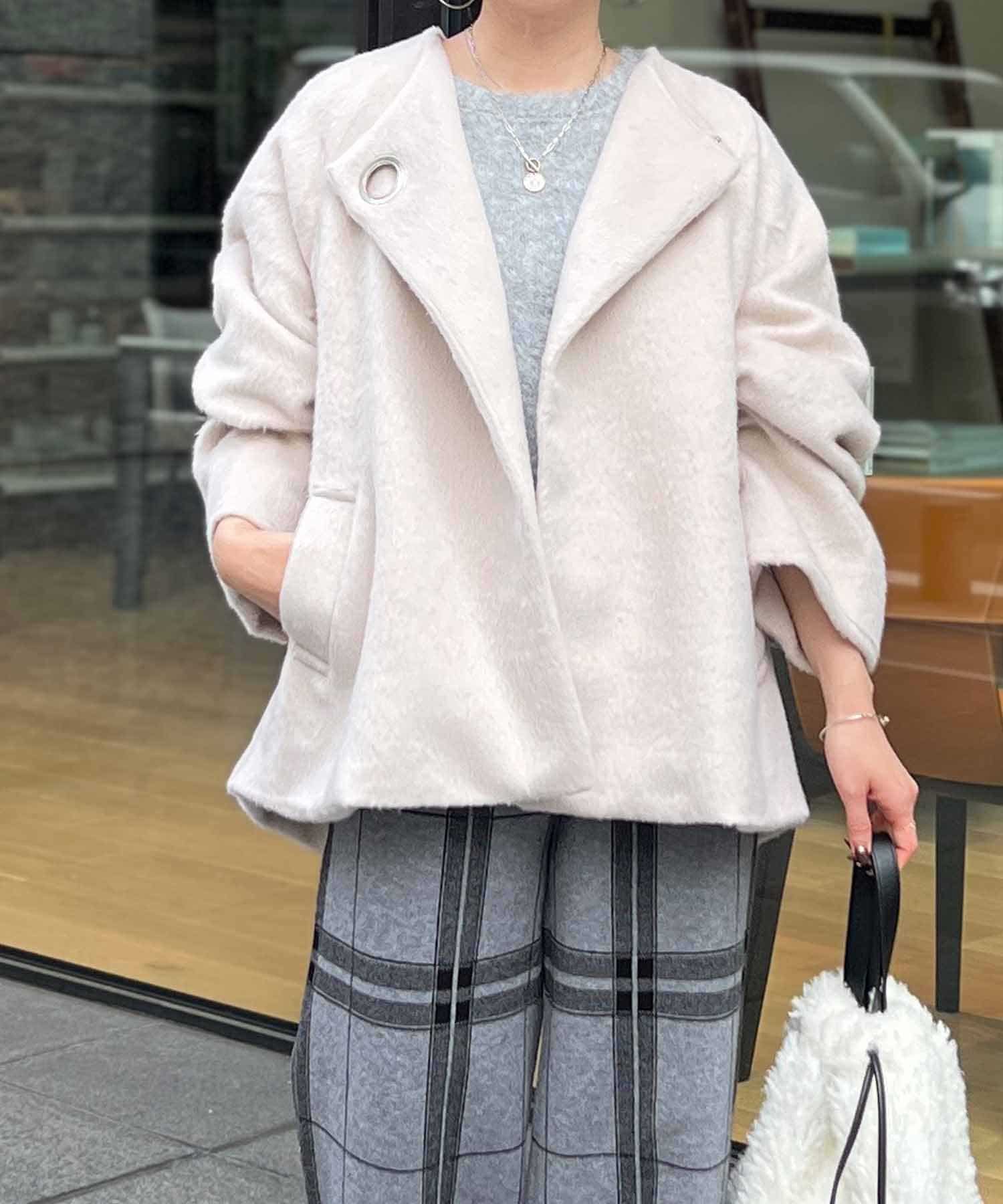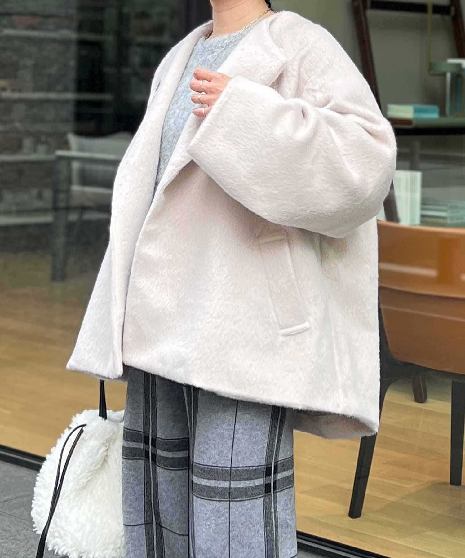 柔らかいシャギー生地を使用したノーカラージャケット。