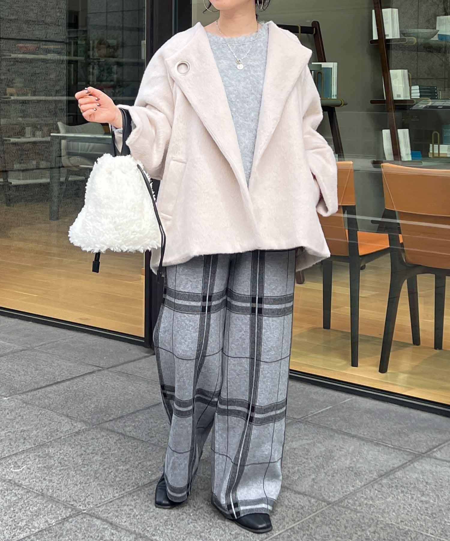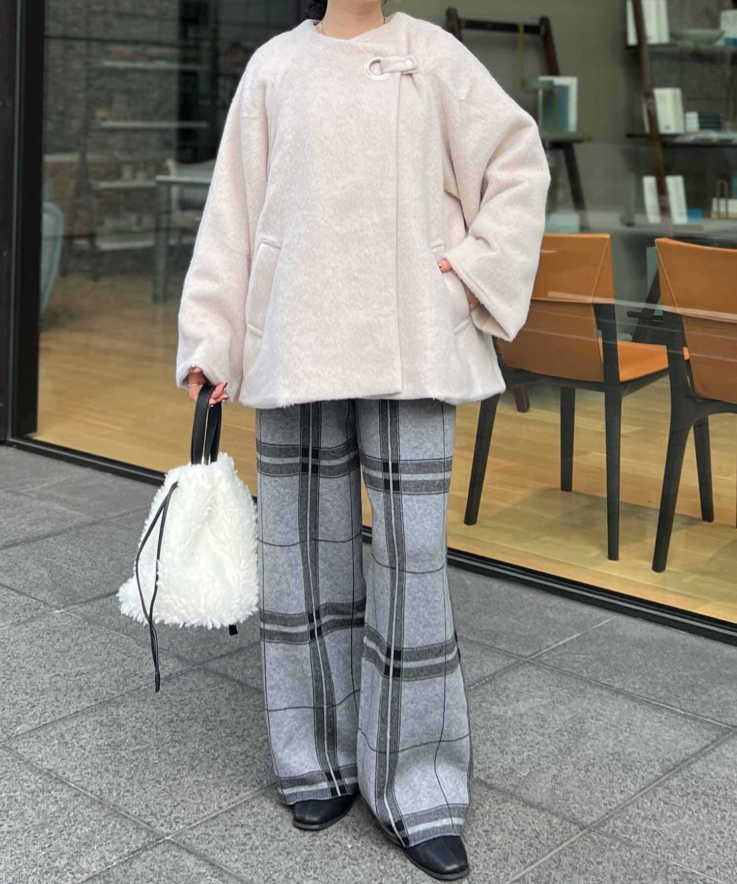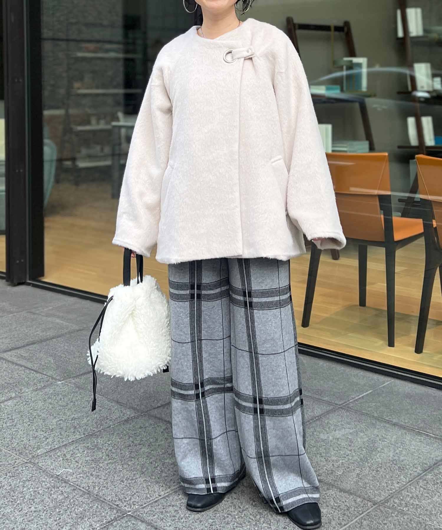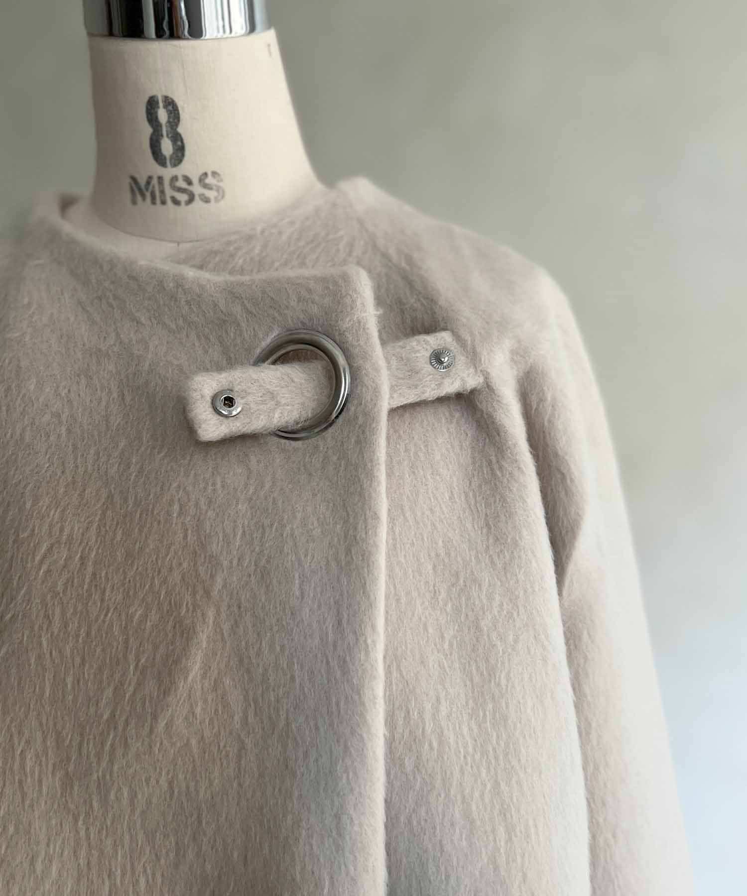 柔らかいシャギー生地を使用したノーカラージャケット。
