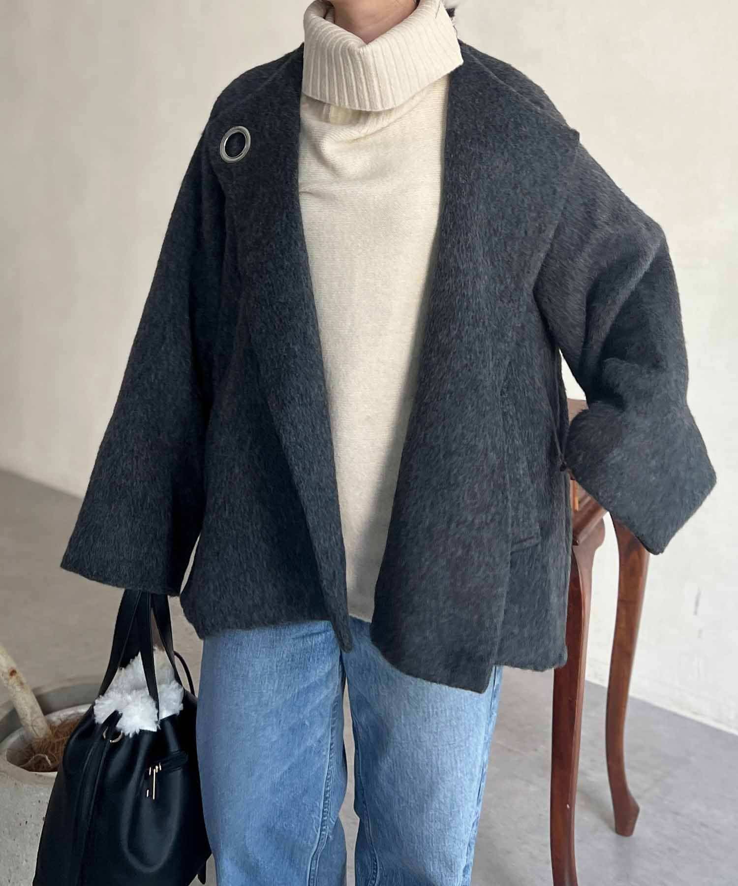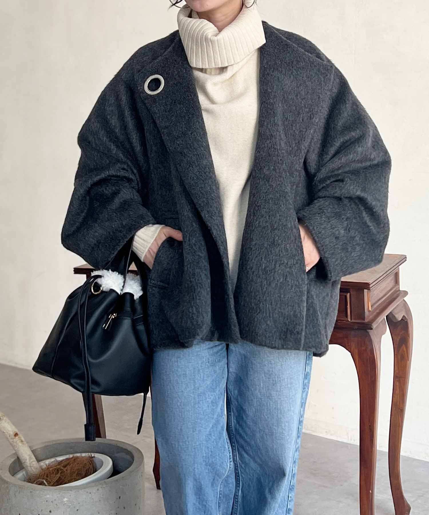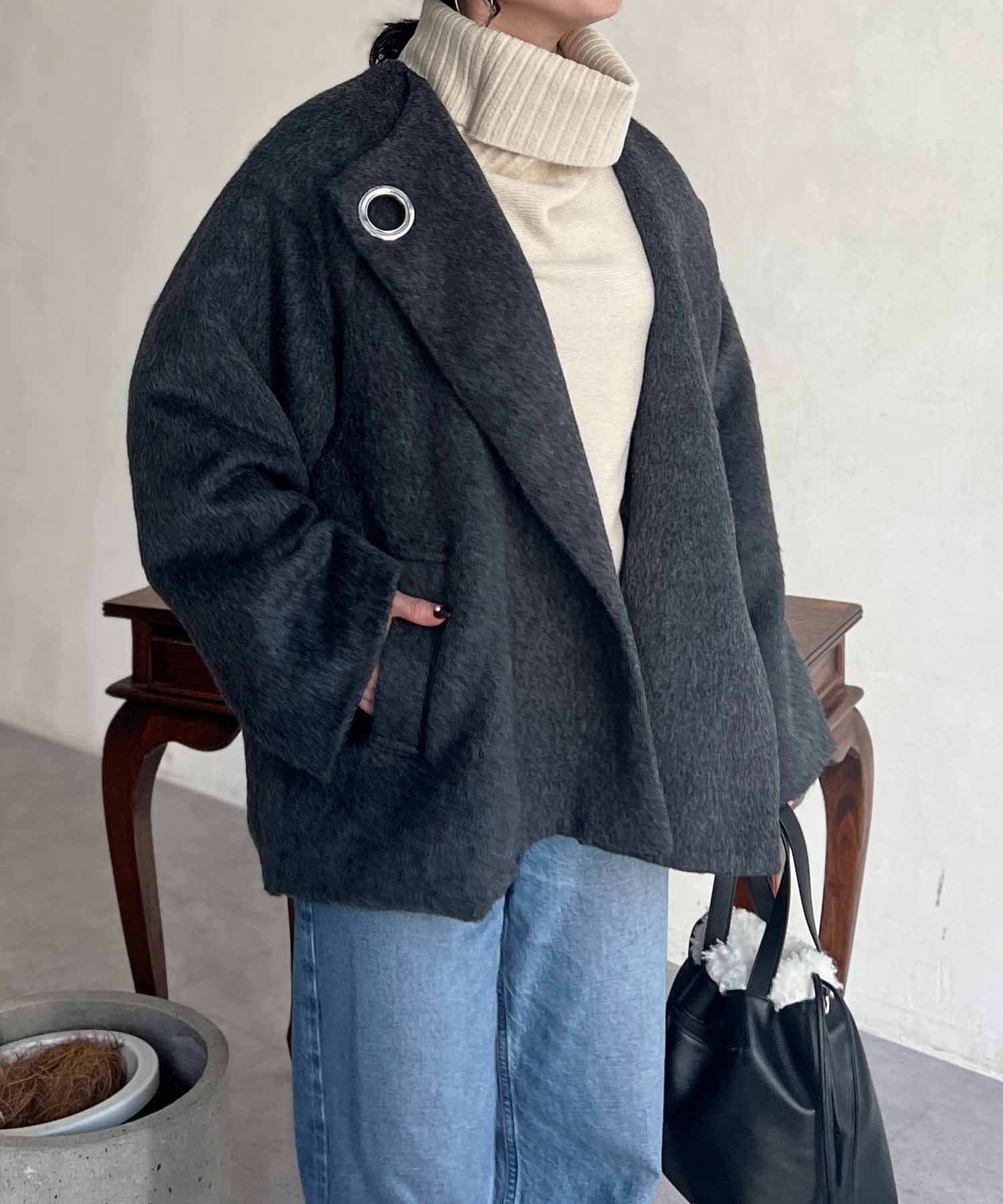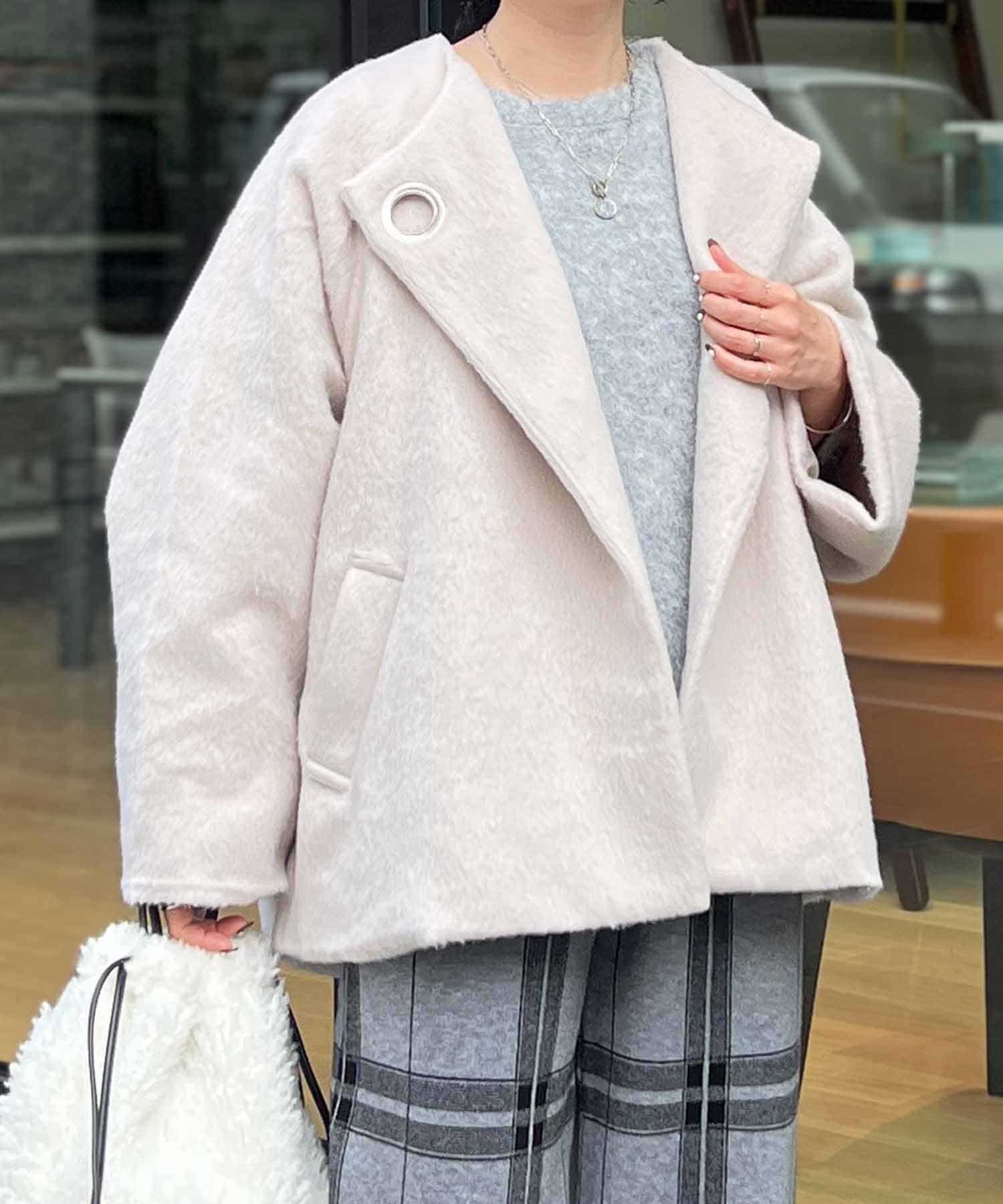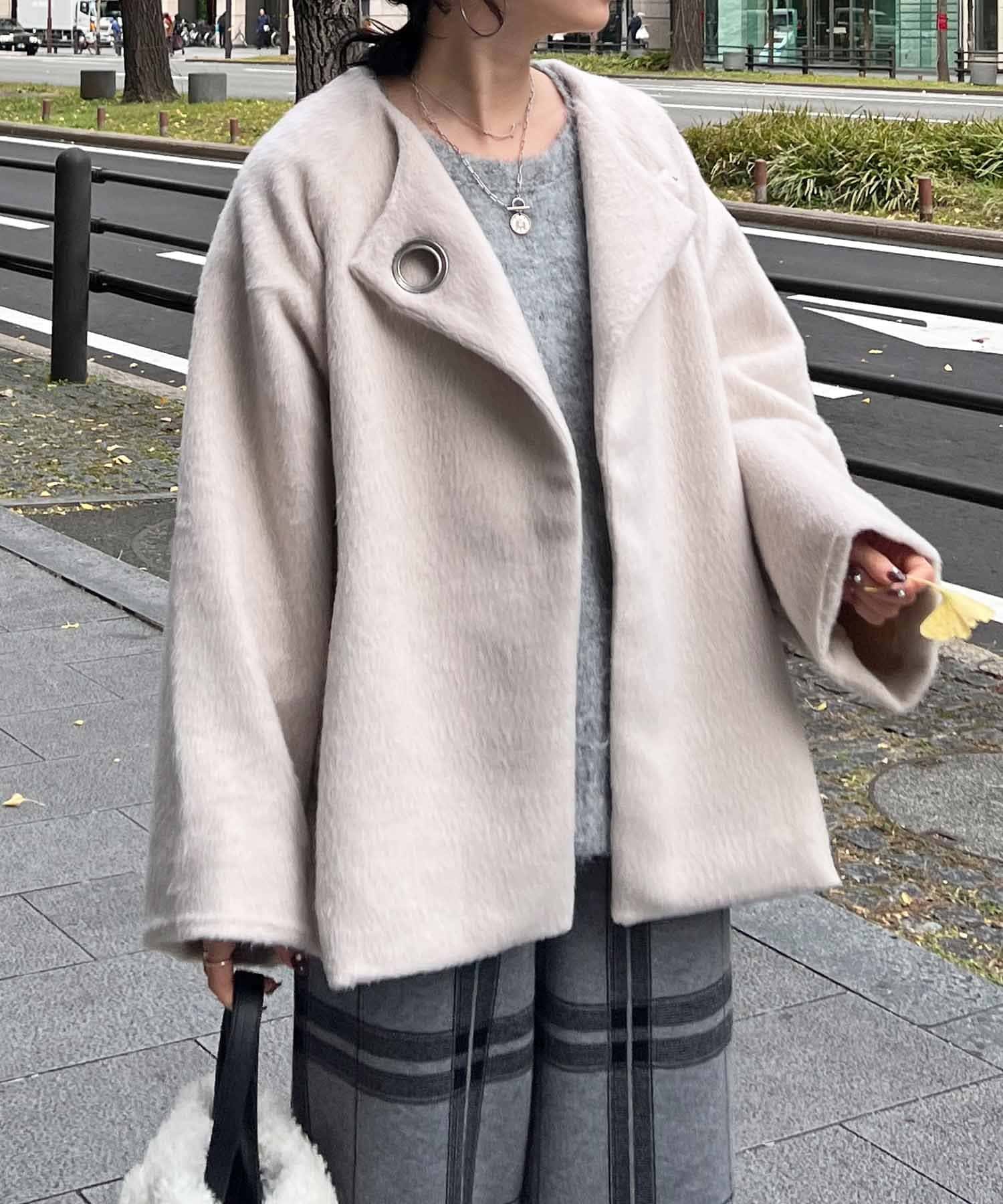 ワンポイントデザインが目を惹くシャギーノーカラージャケット