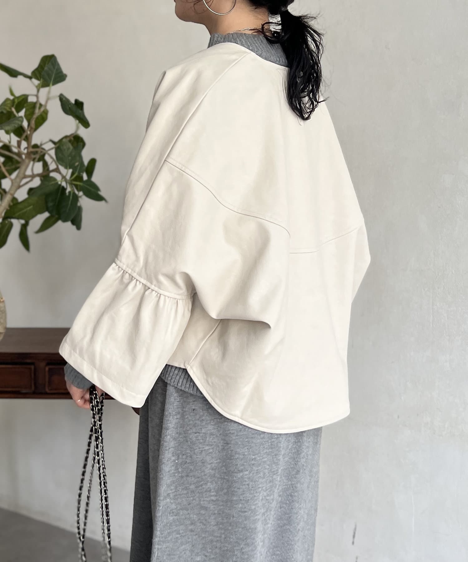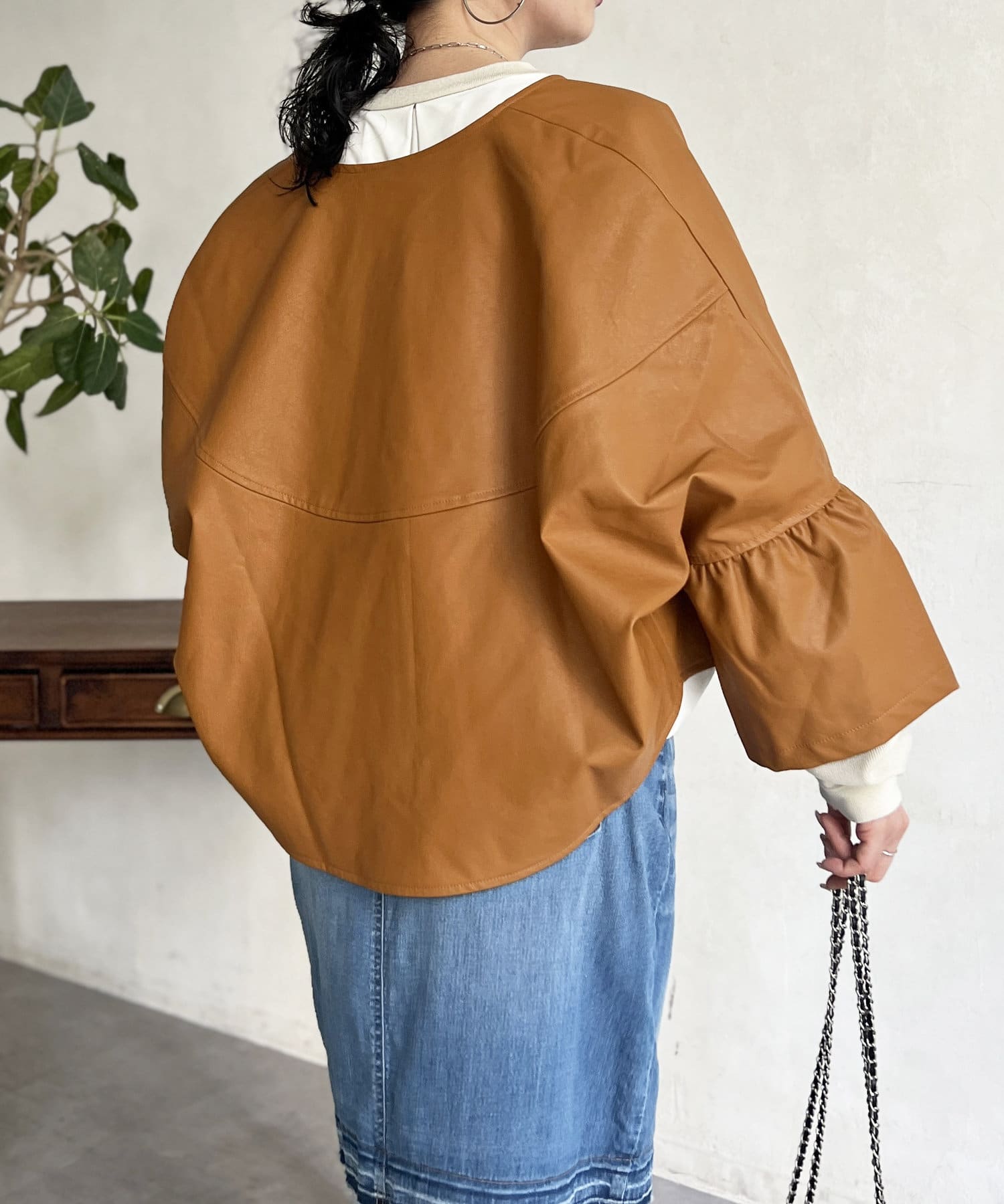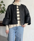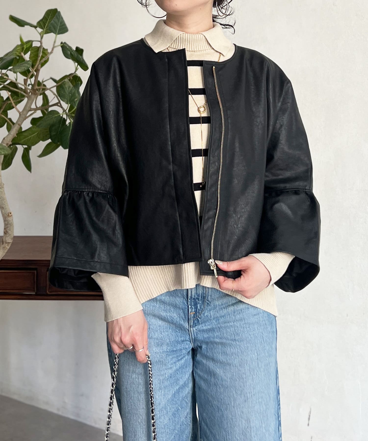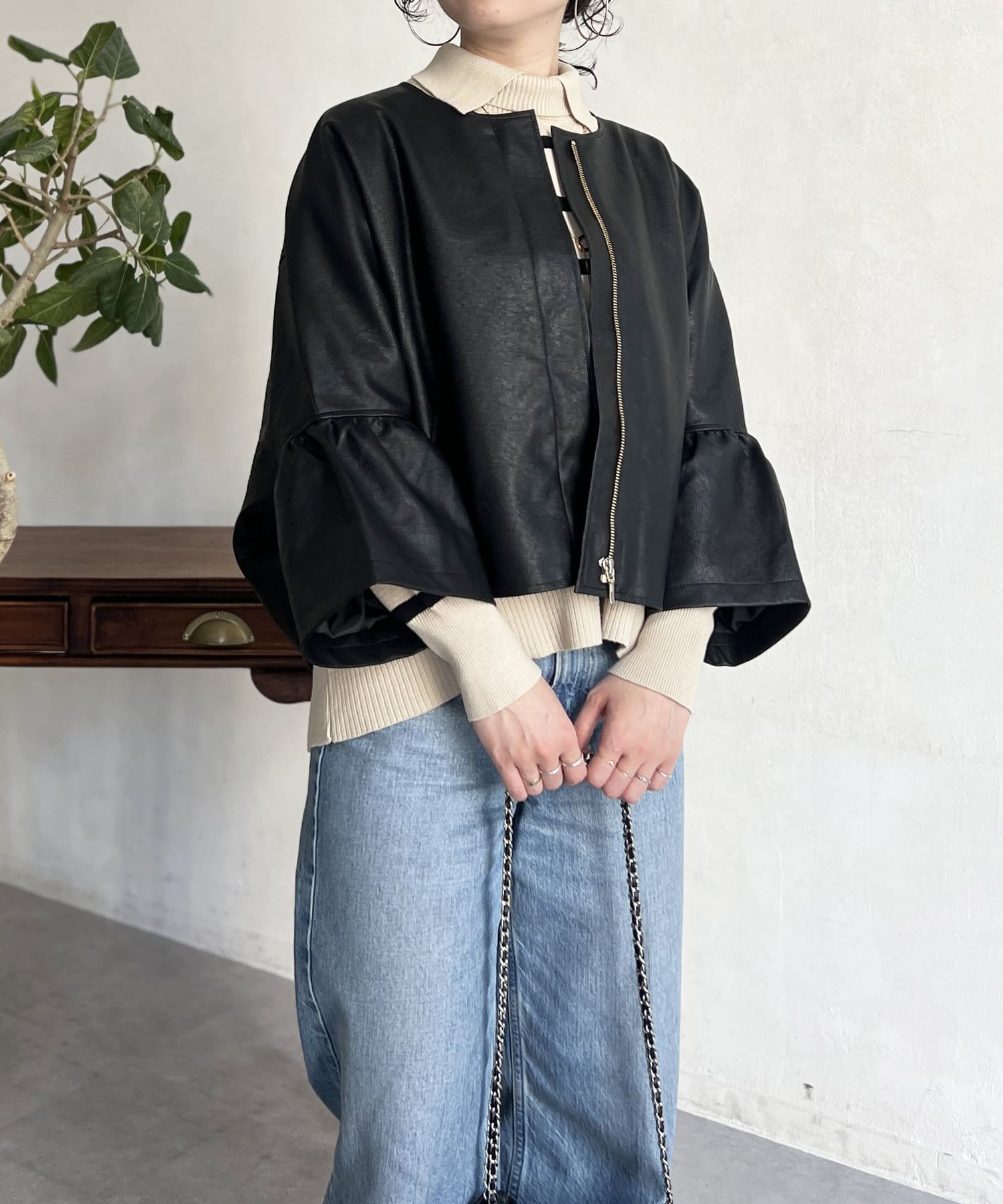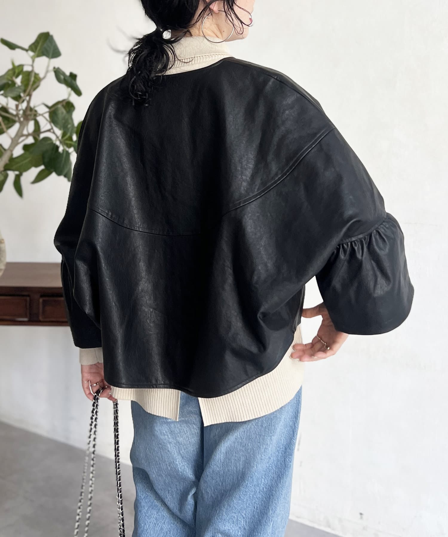 フリルスリーブでの甘めなデザインがレザーの強い印象を和らげてくれます。