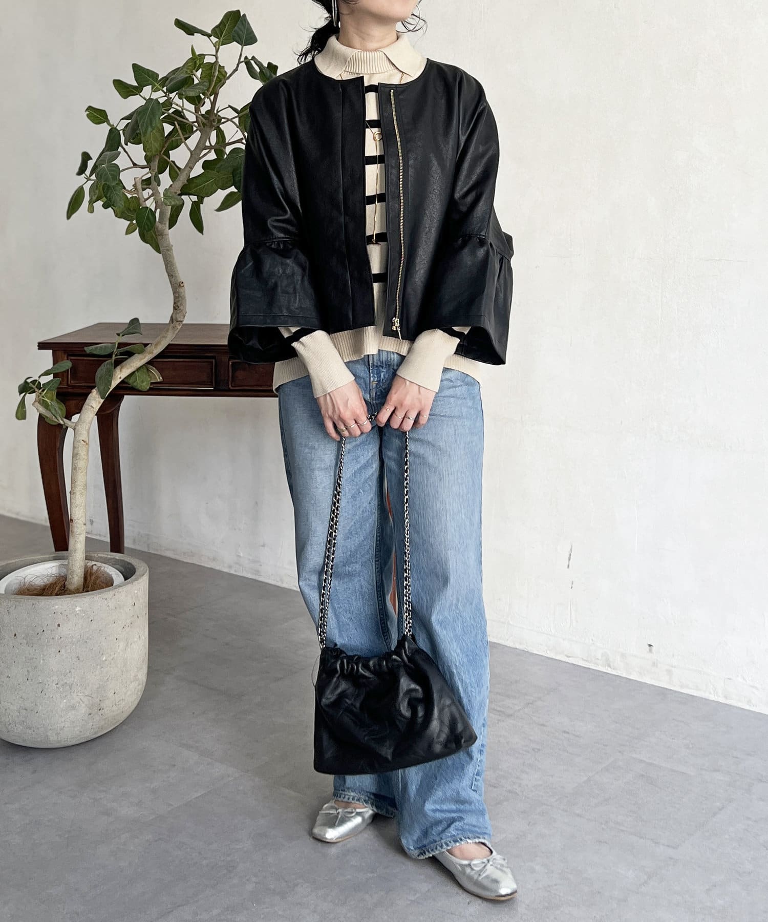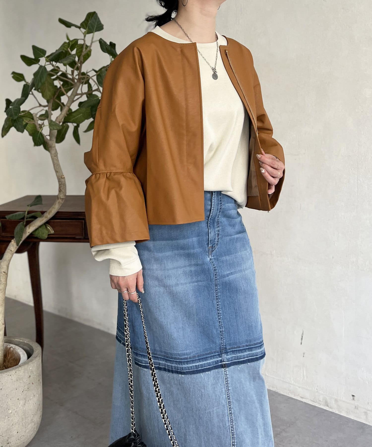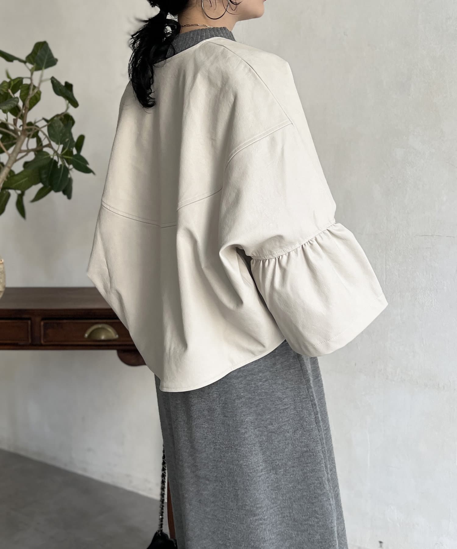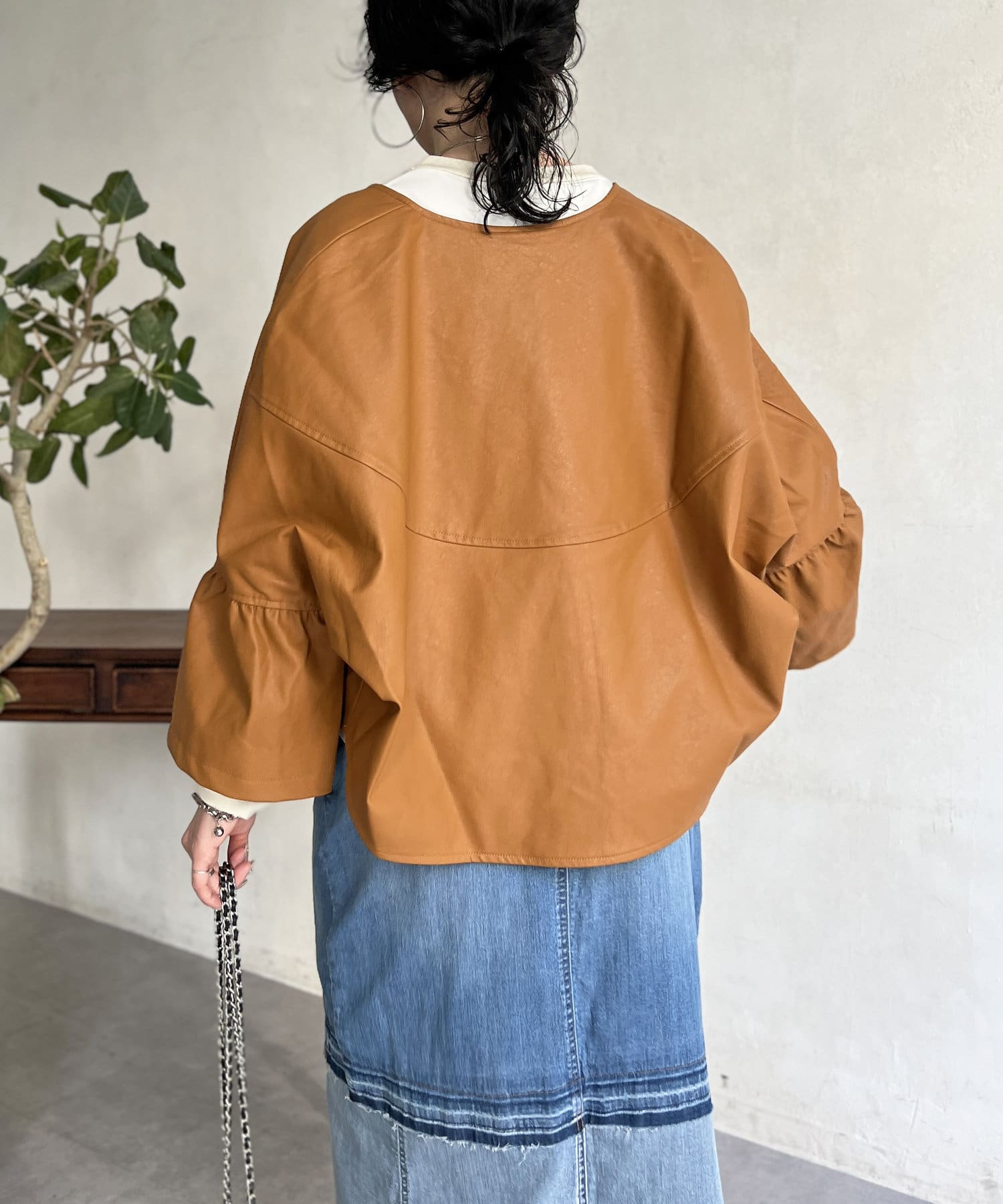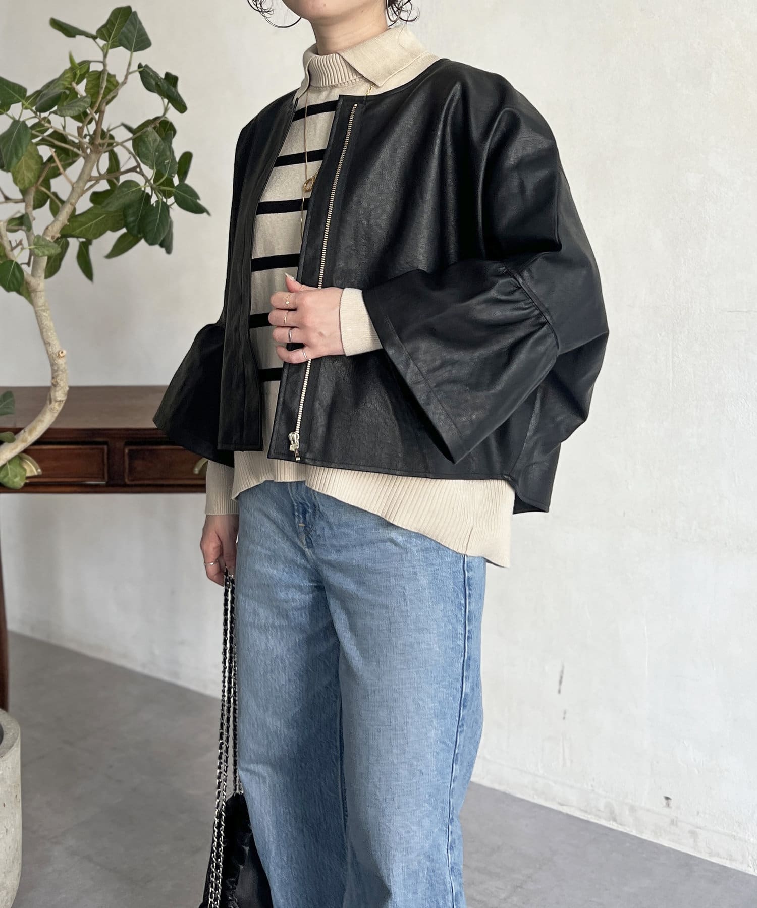 フリルスリーブでの甘めなデザインがレザーの強い印象を和らげてくれます。
