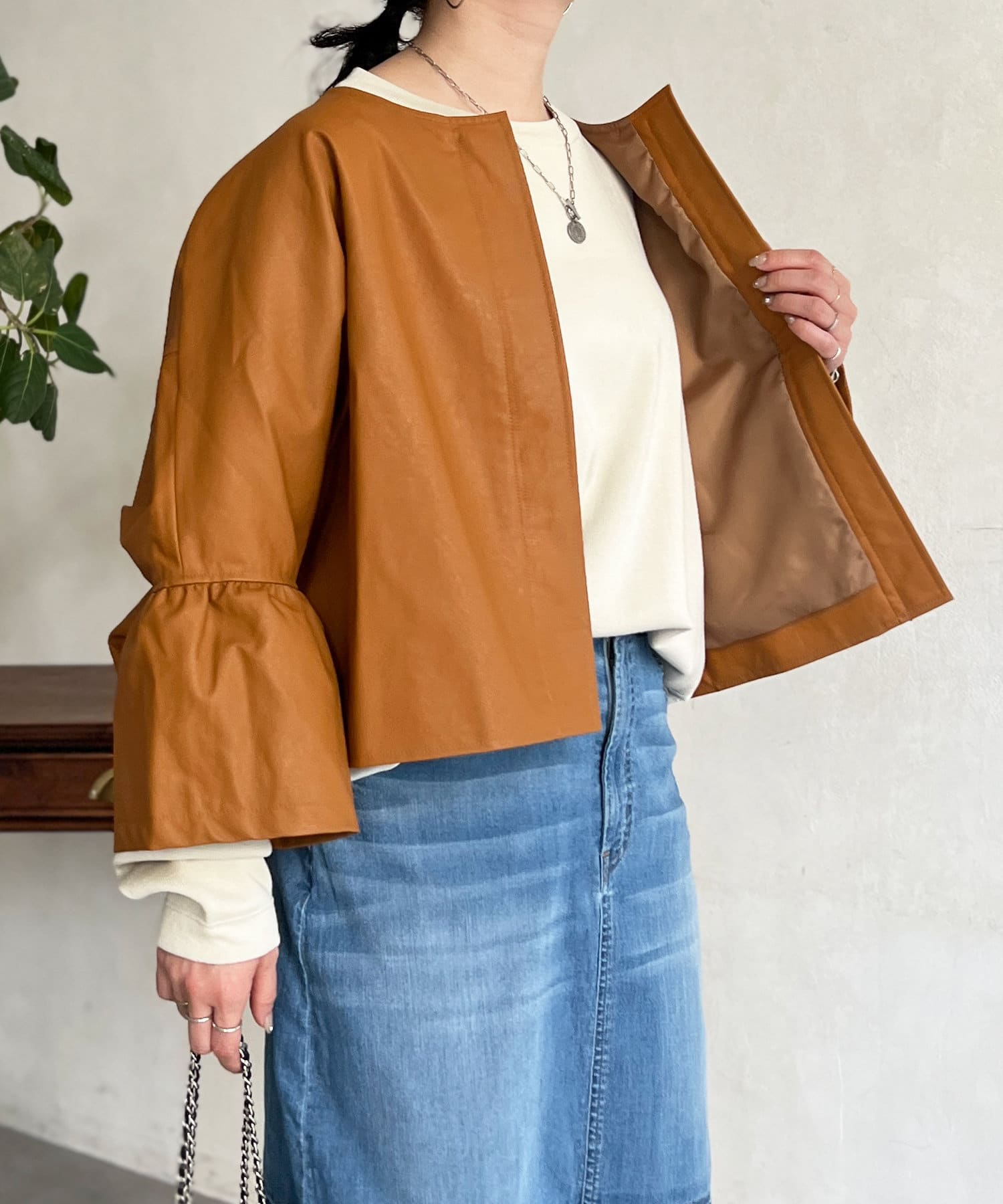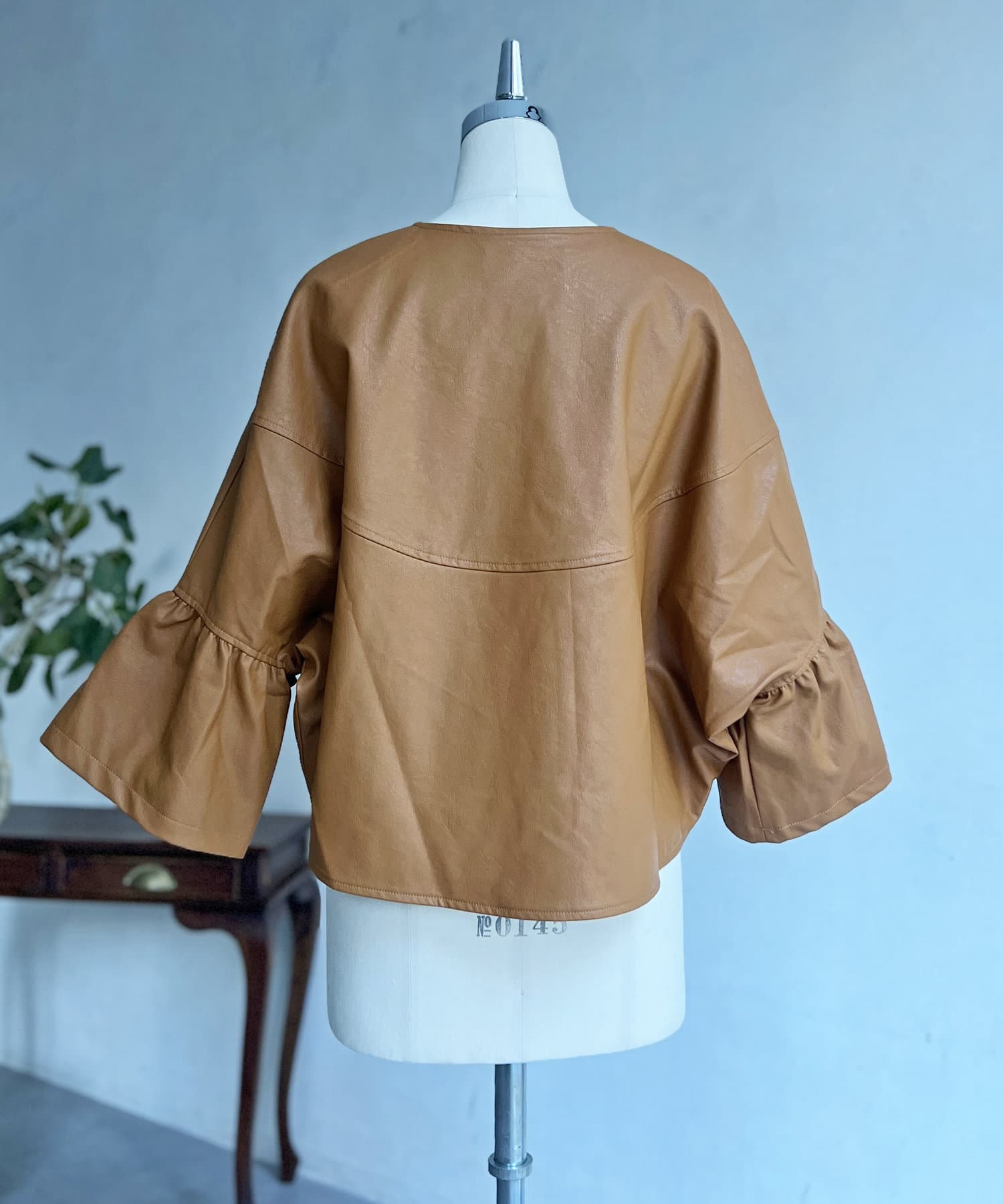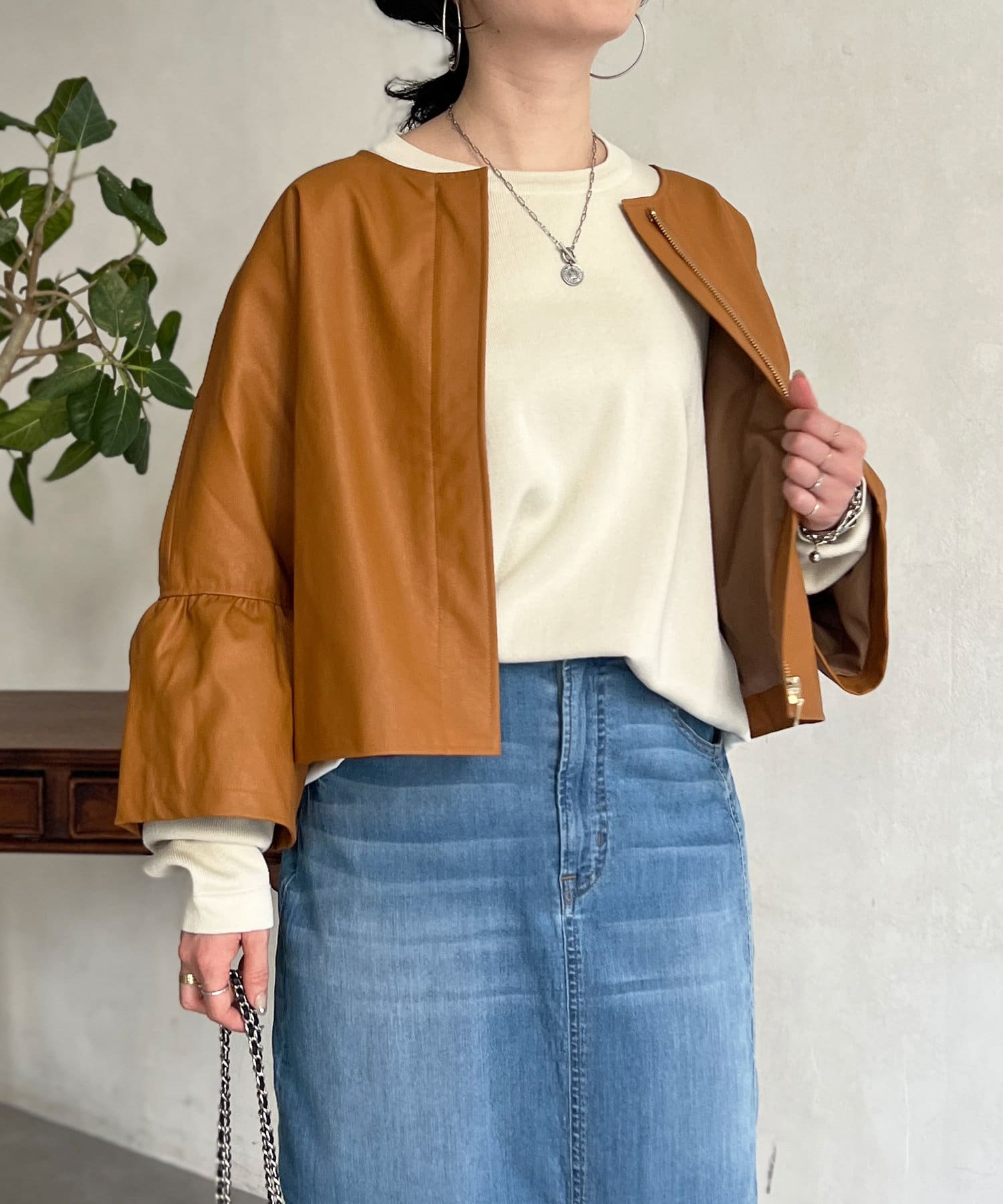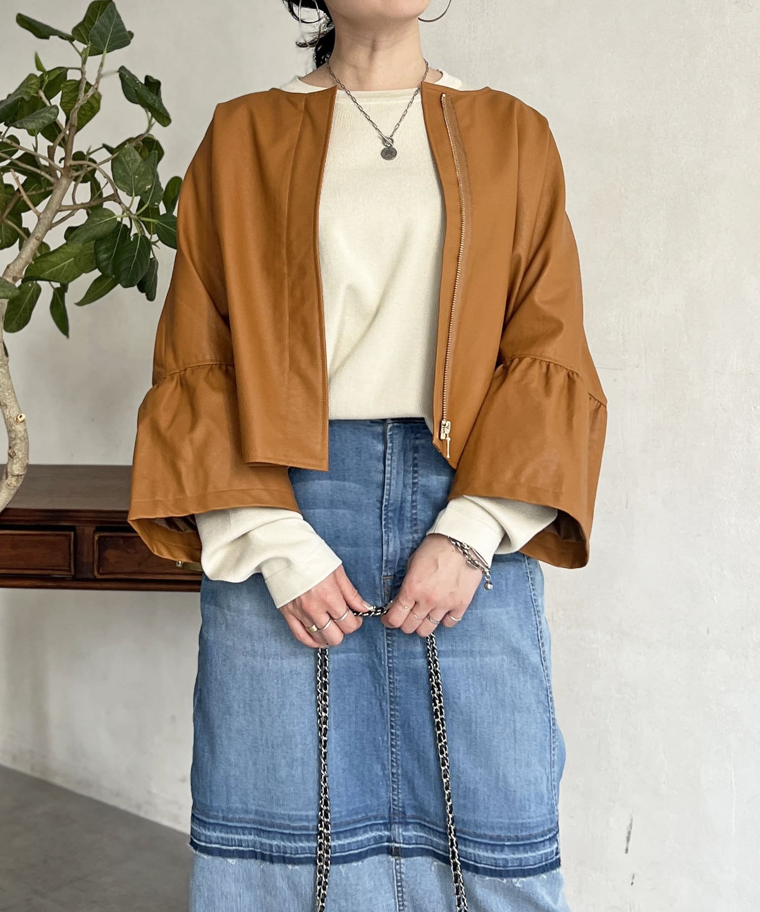 フリルスリーブでの甘めなデザインがレザーの強い印象を和らげてくれます。