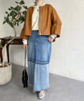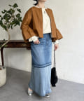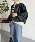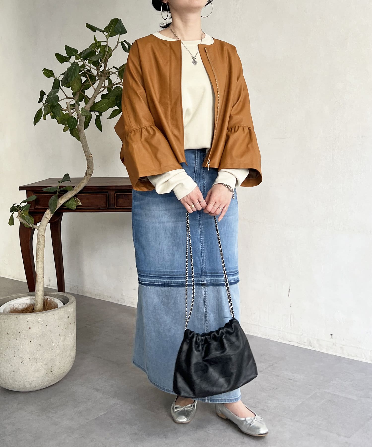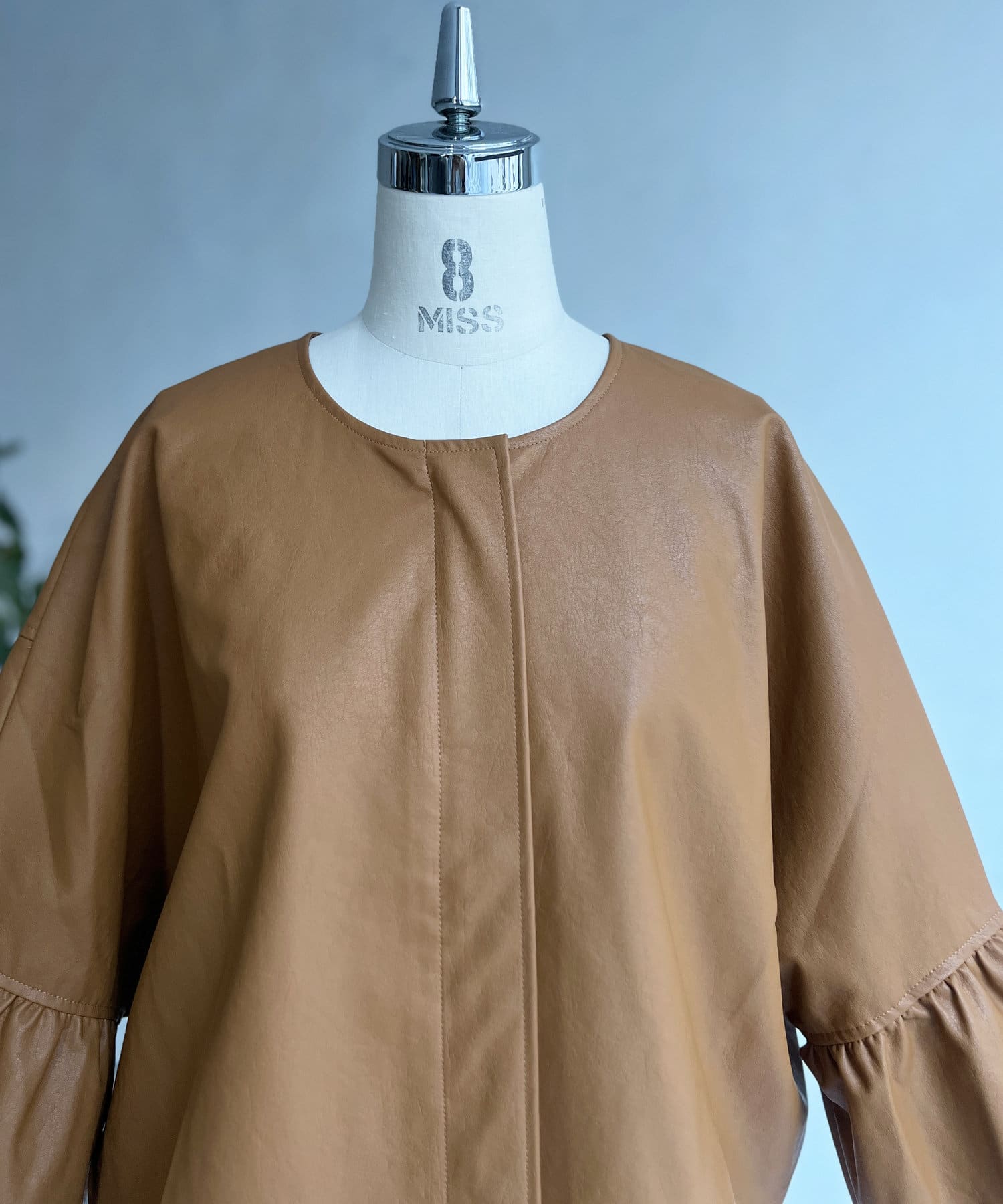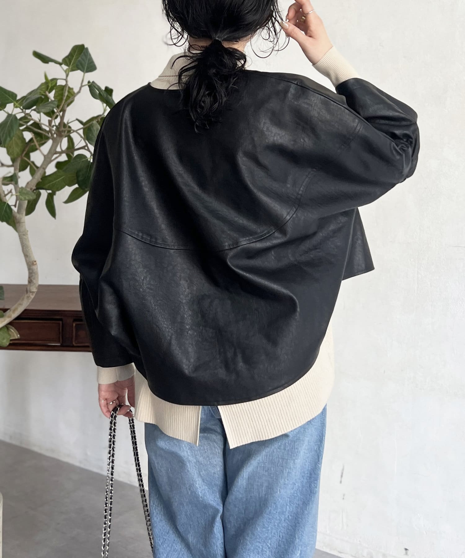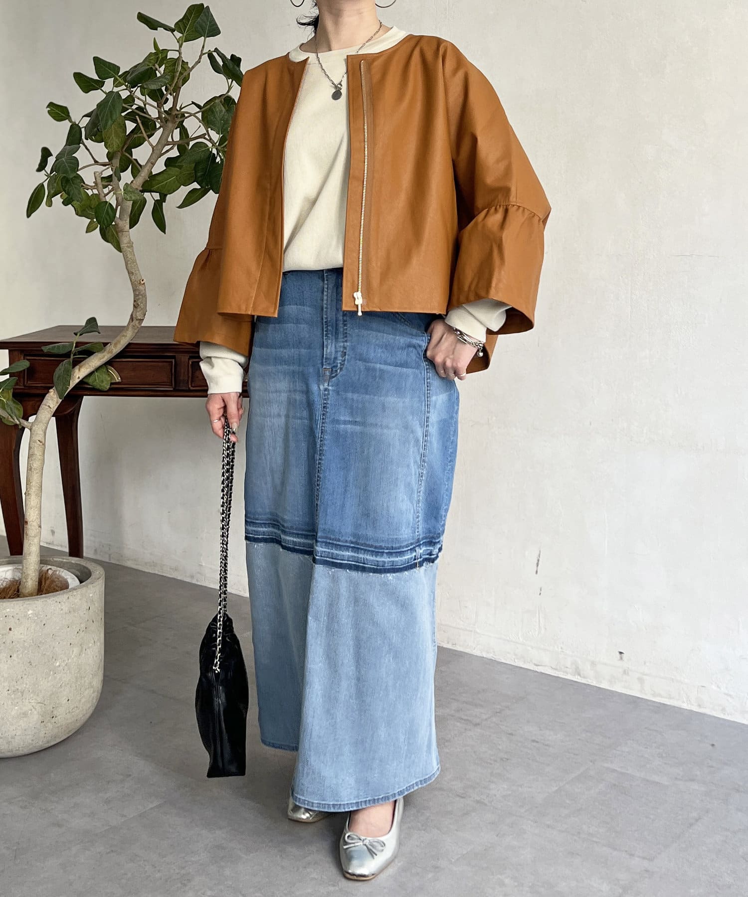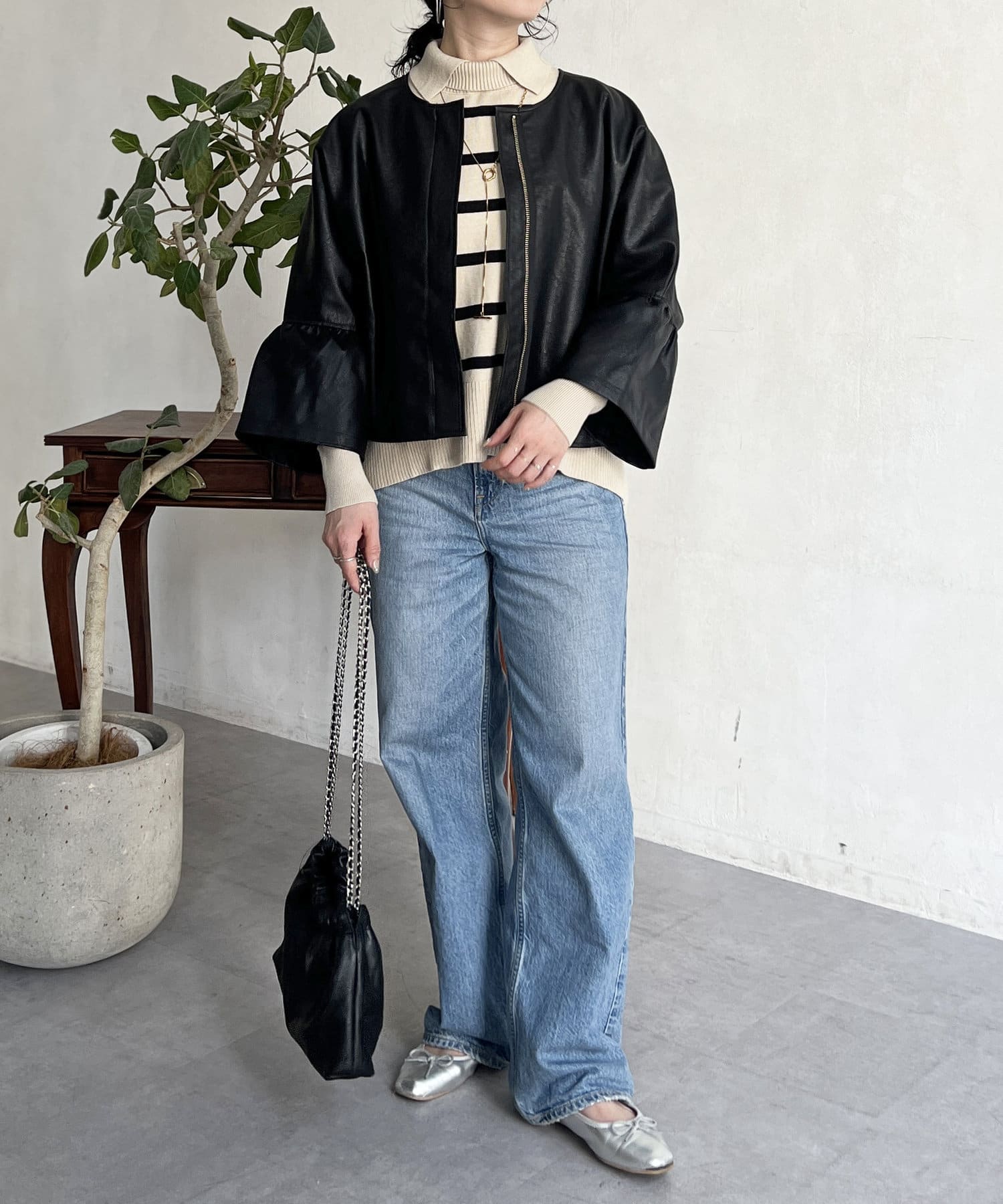 フリルスリーブでの甘めなデザインがレザーの強い印象を和らげてくれます。