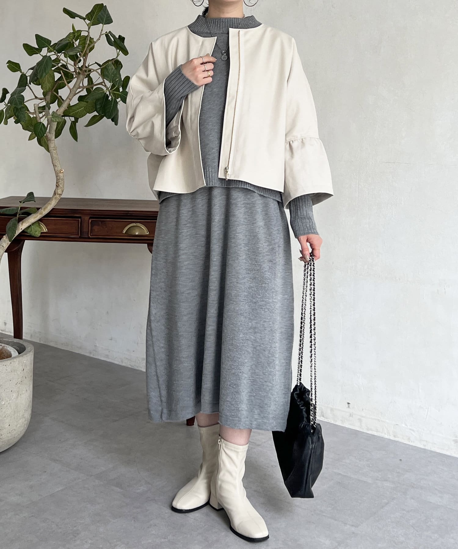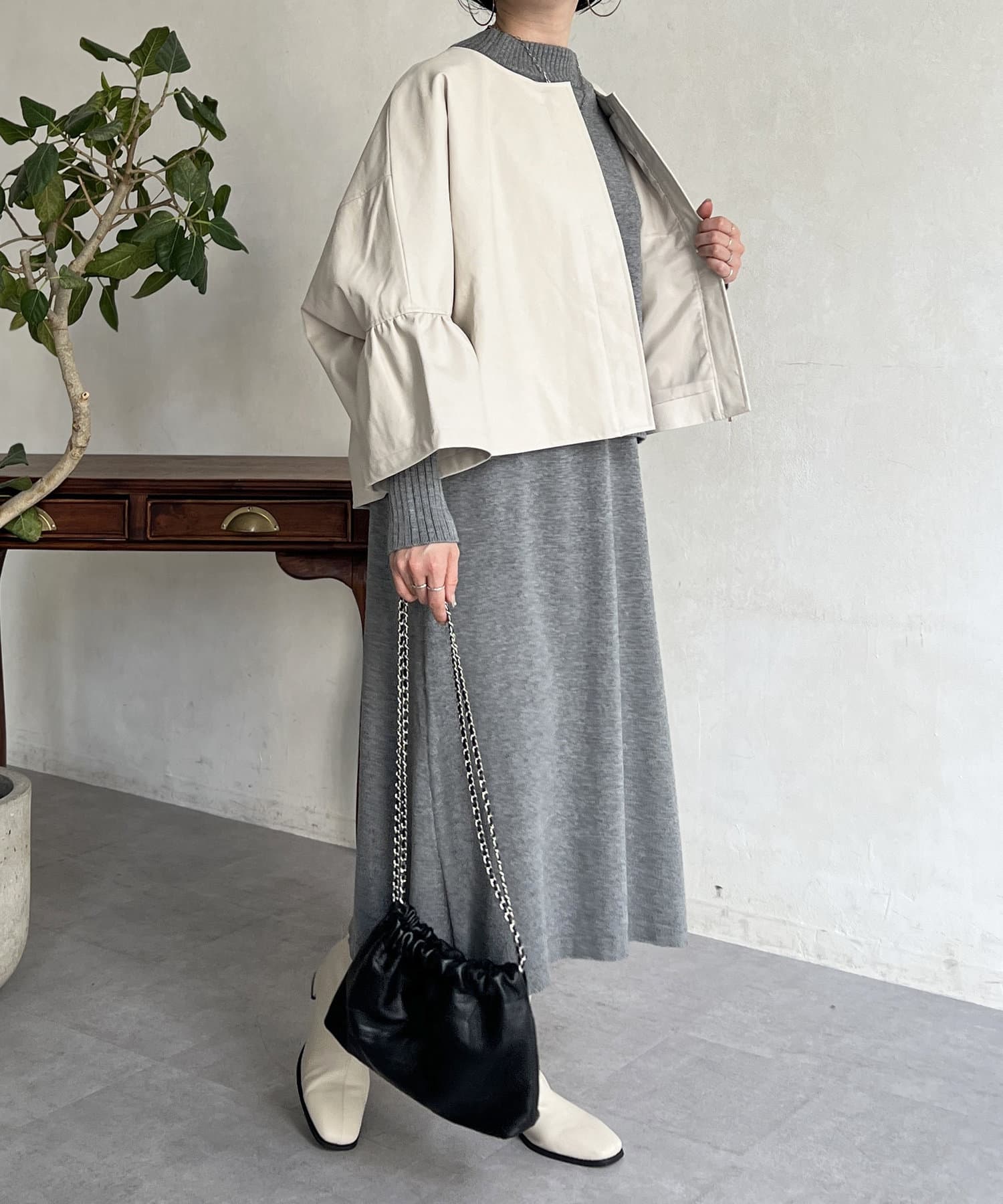 全体的に丸みのある柔らかなデザイン。ノーカラーで上品さも後押ししてくれます。