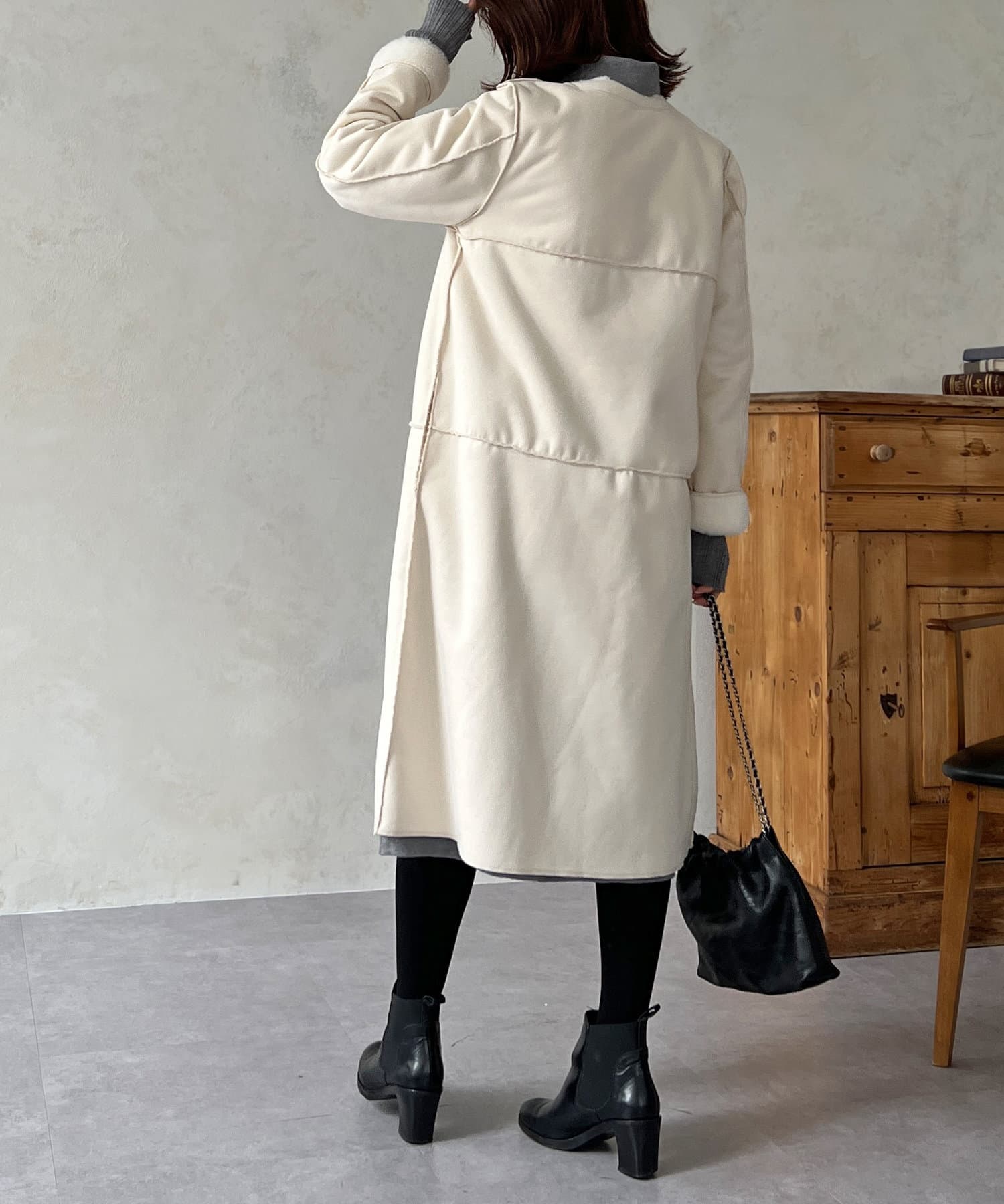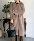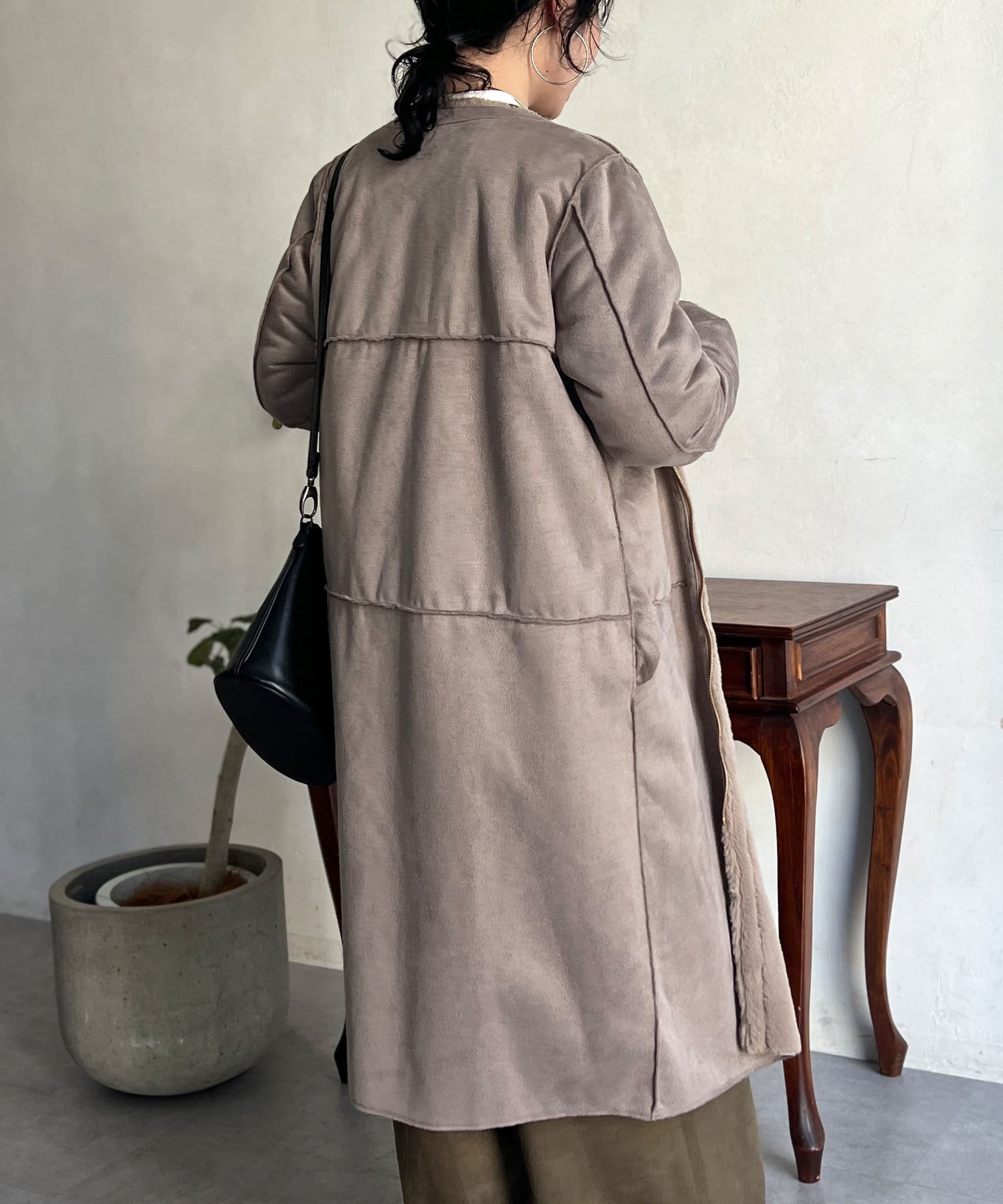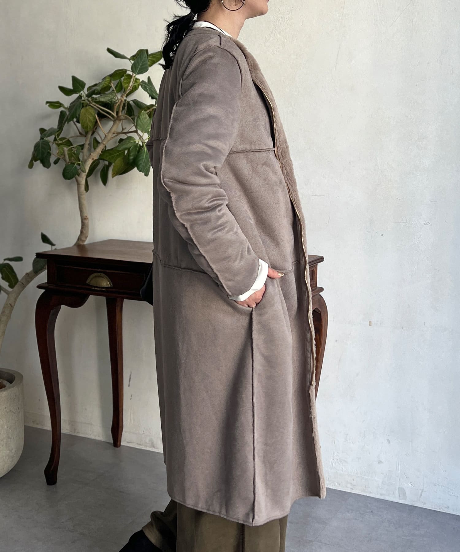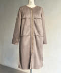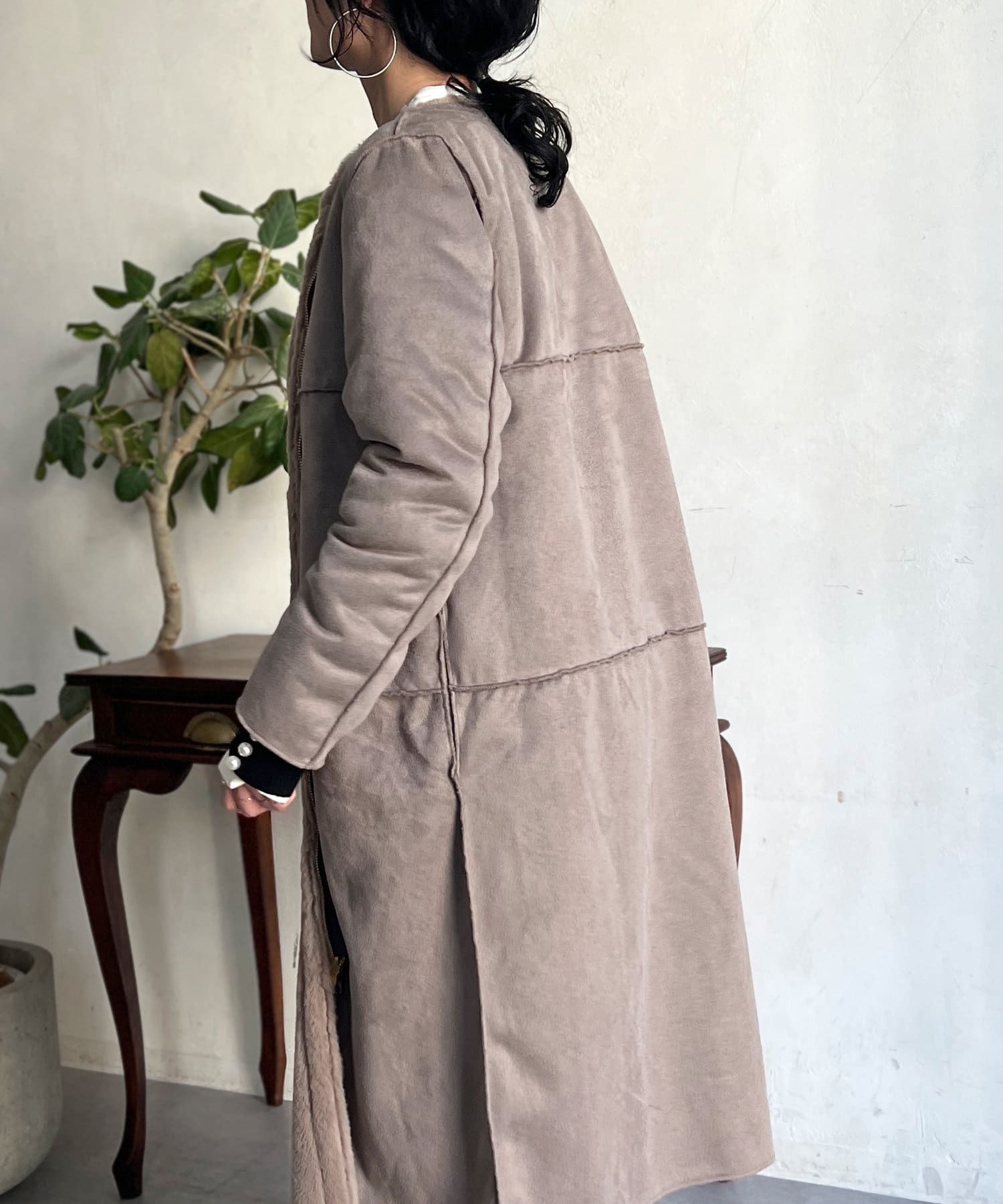 ノーカラーのスエードコート。裏返してファーコートとしても着ていただけます。