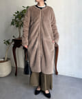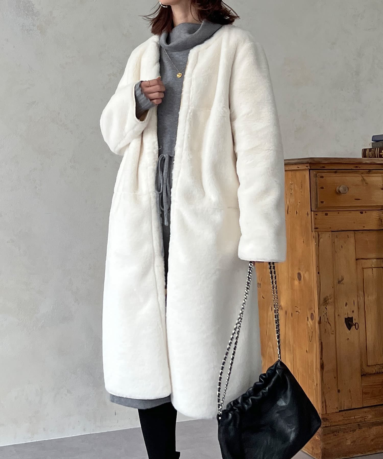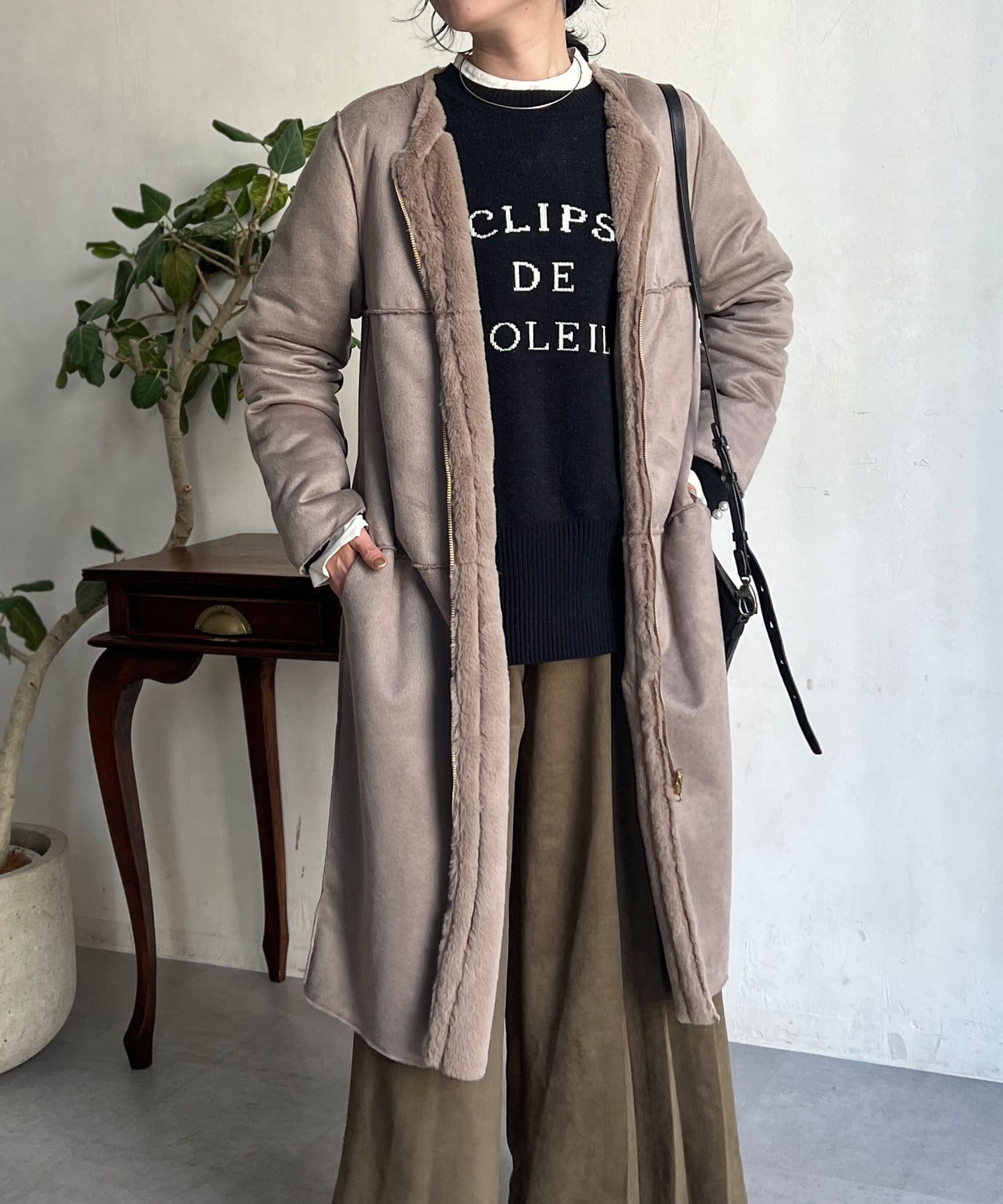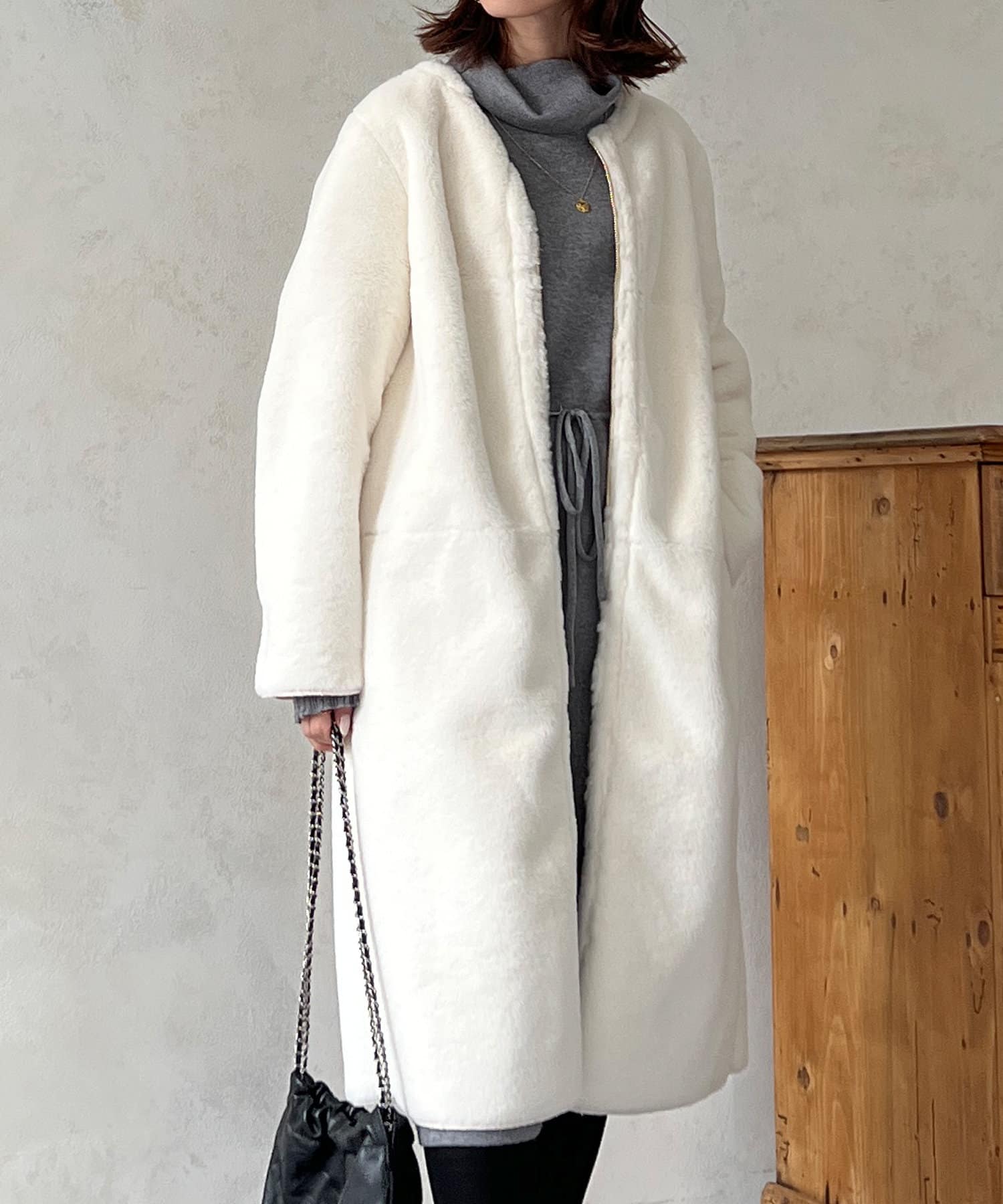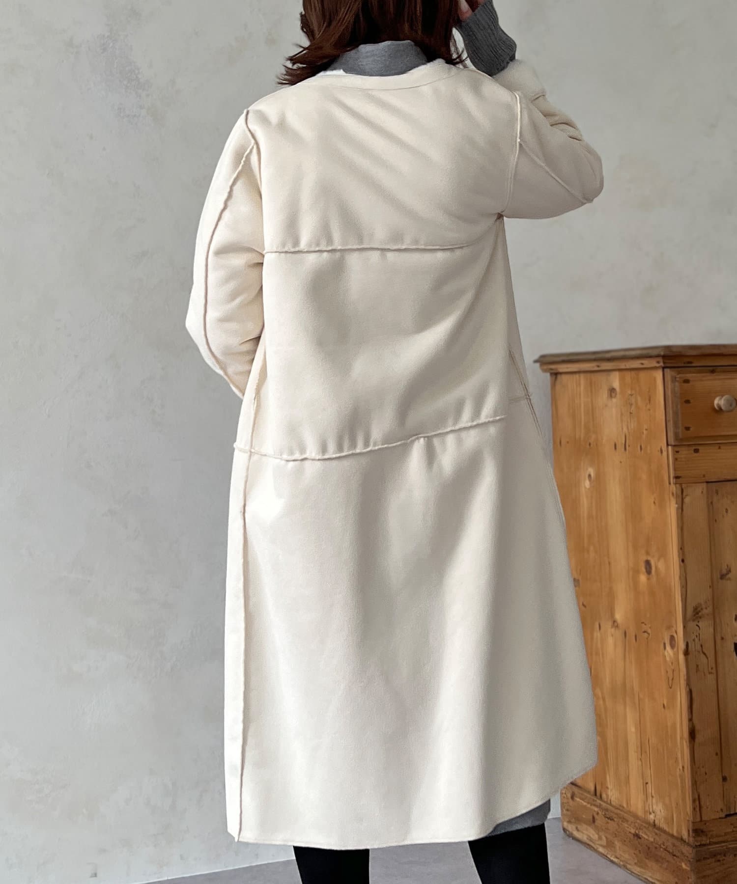 ノーカラーのスエードコート。裏返してファーコートとしても着ていただけます。