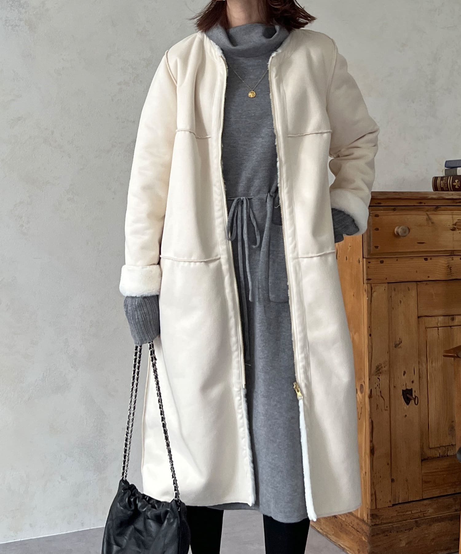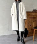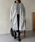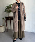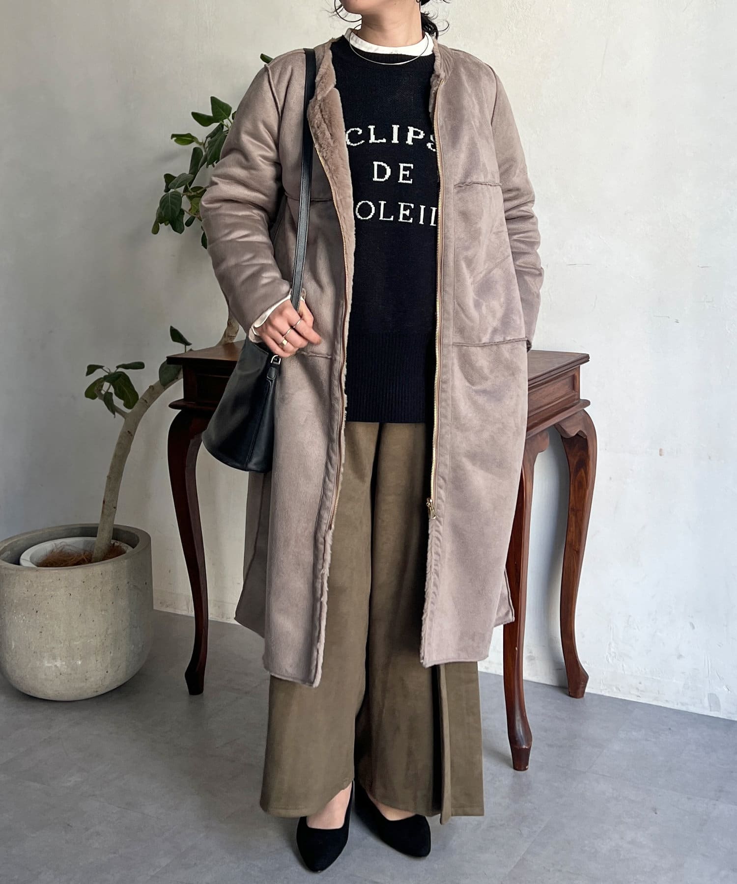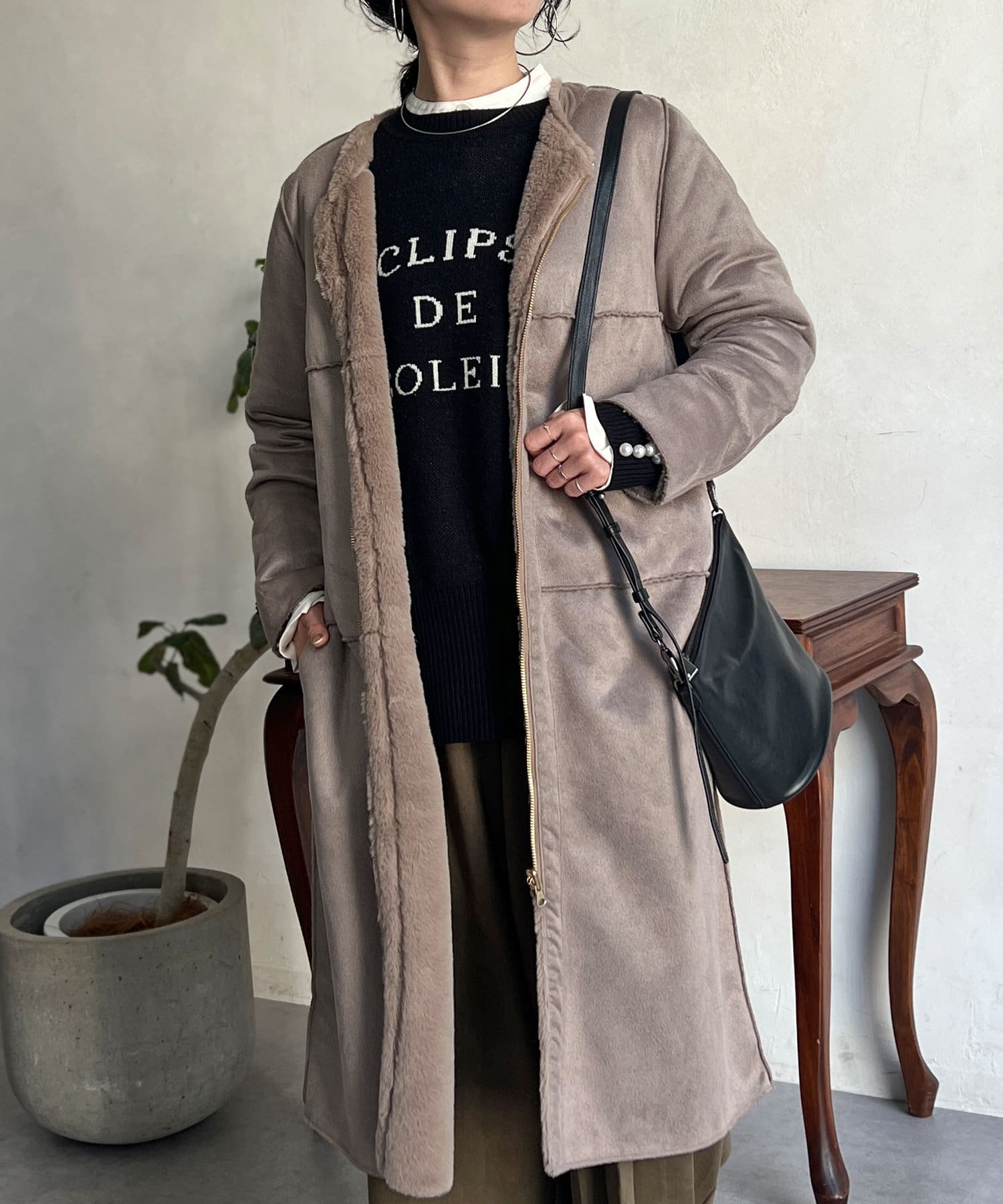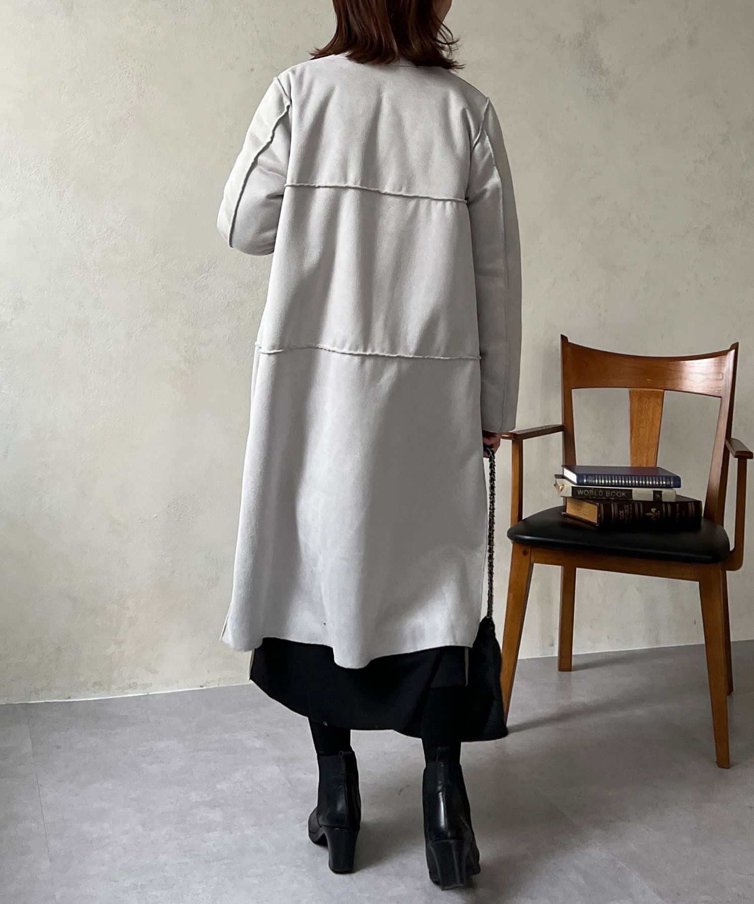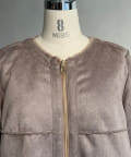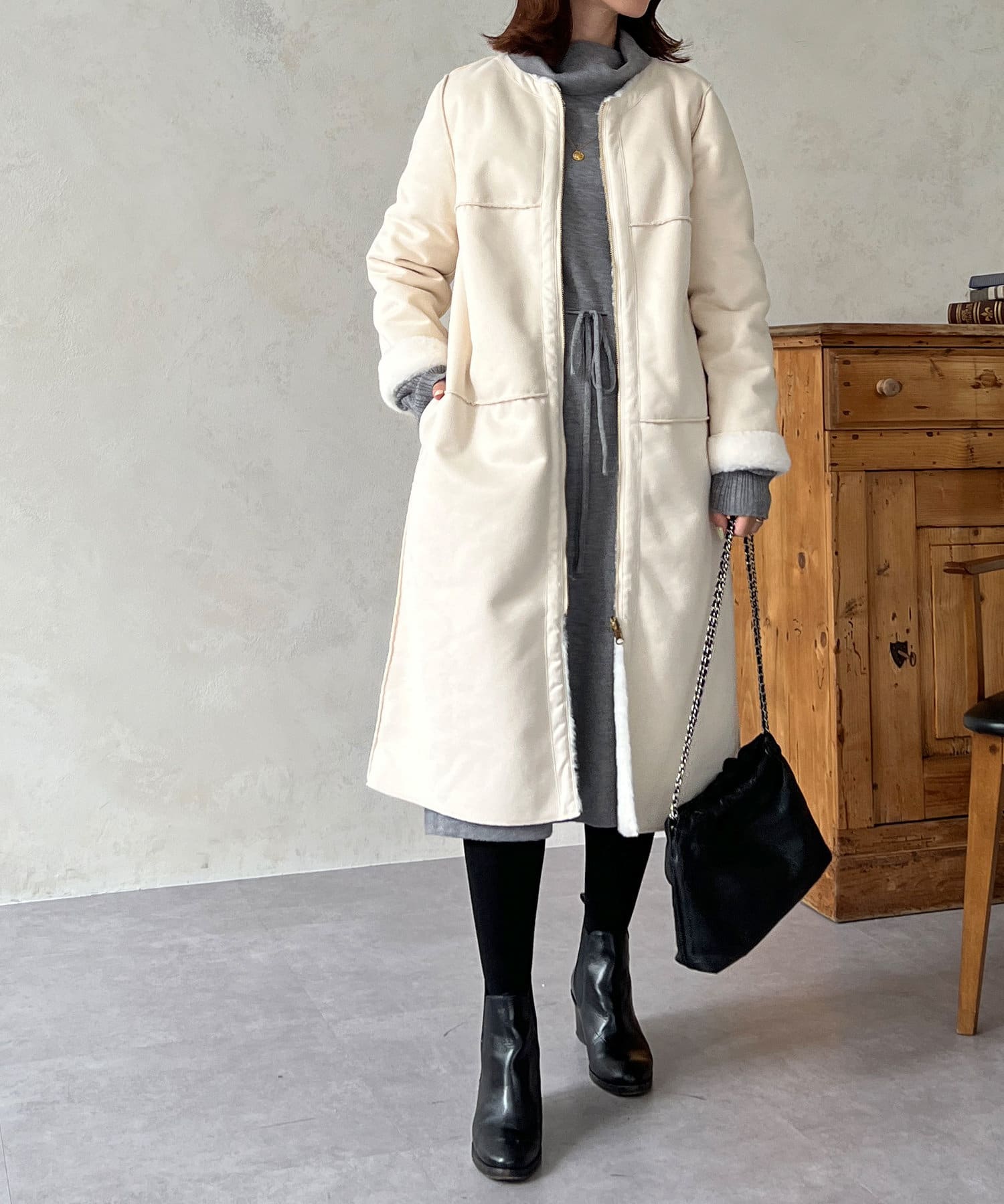 ノーカラーのスエードコート。裏返してファーコートとしても着ていただけます。