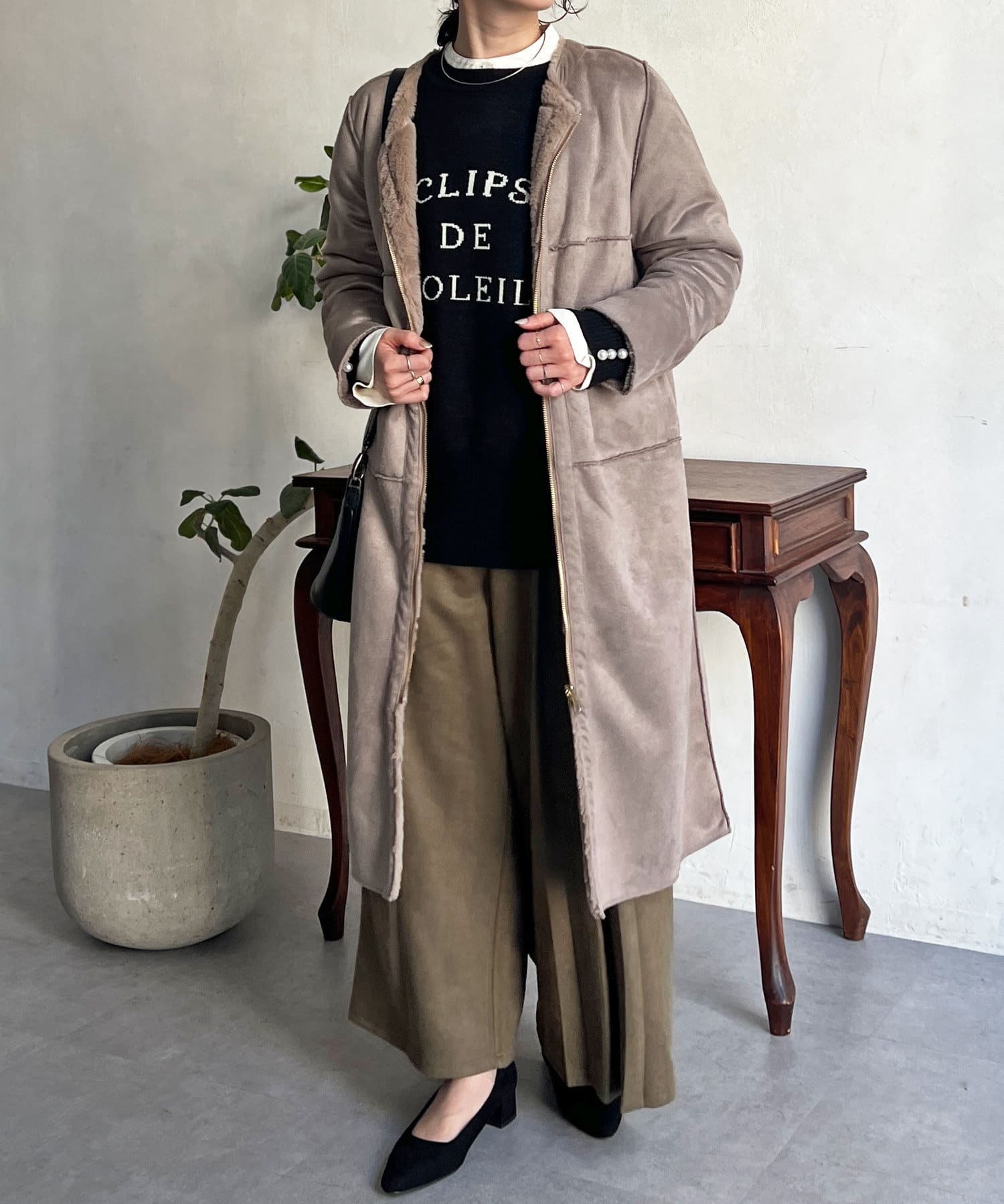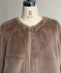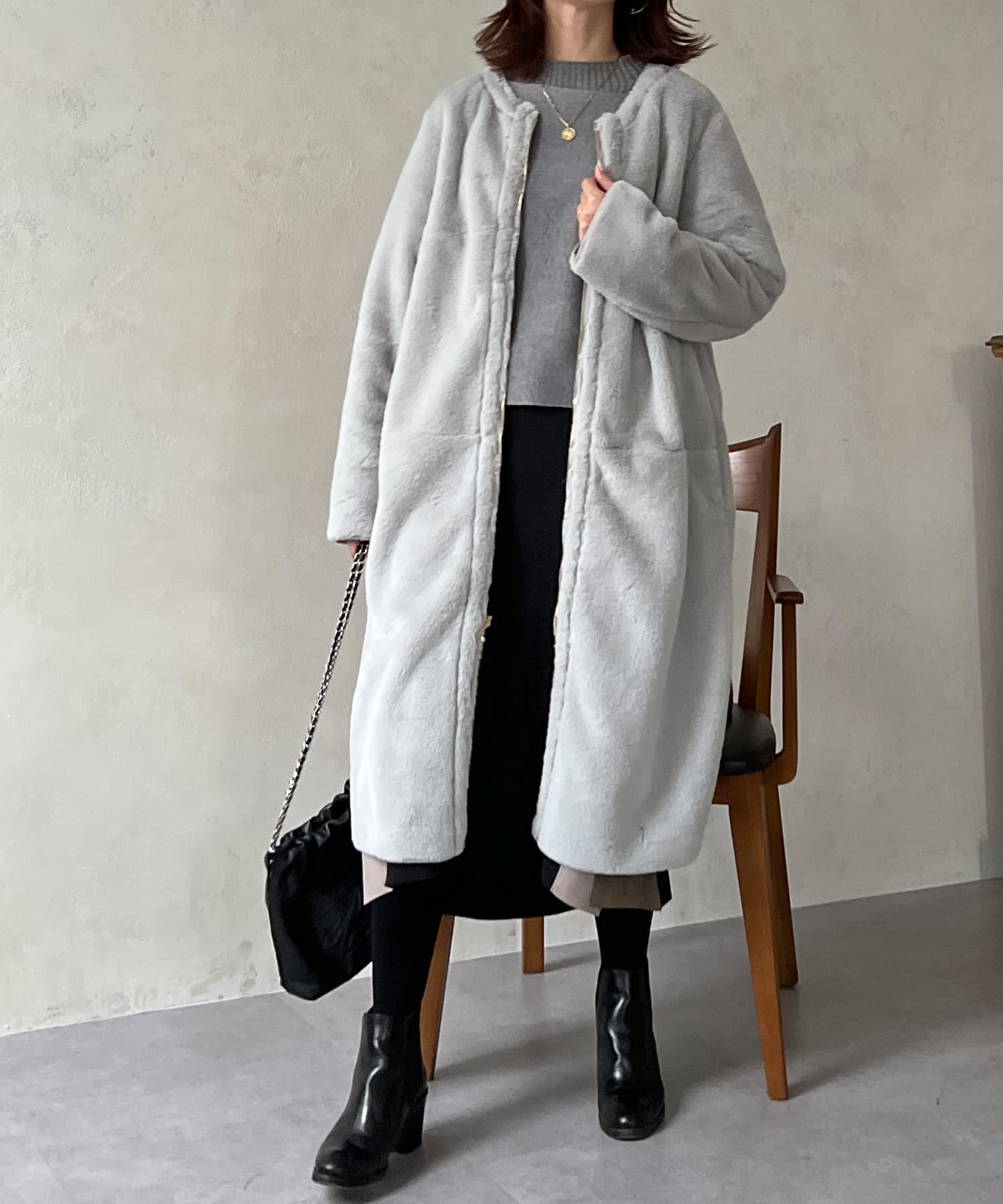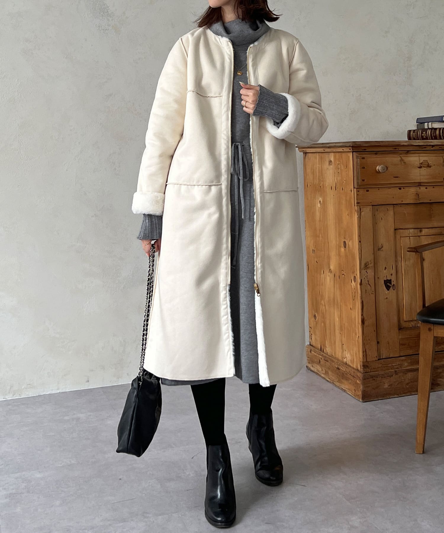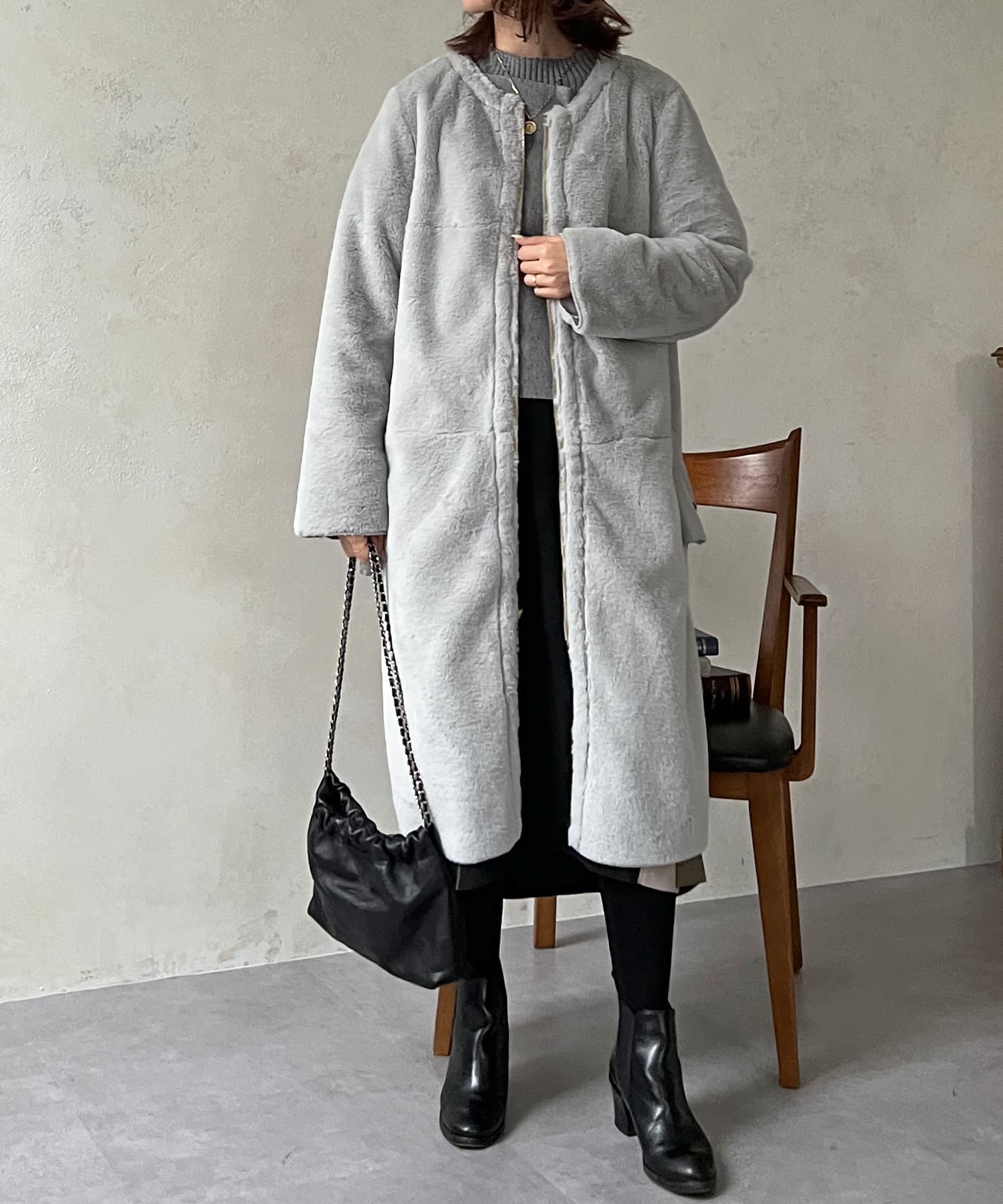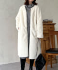ノーカラーのスエードコート。裏返してファーコートとしても着ていただけます。
