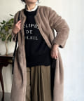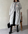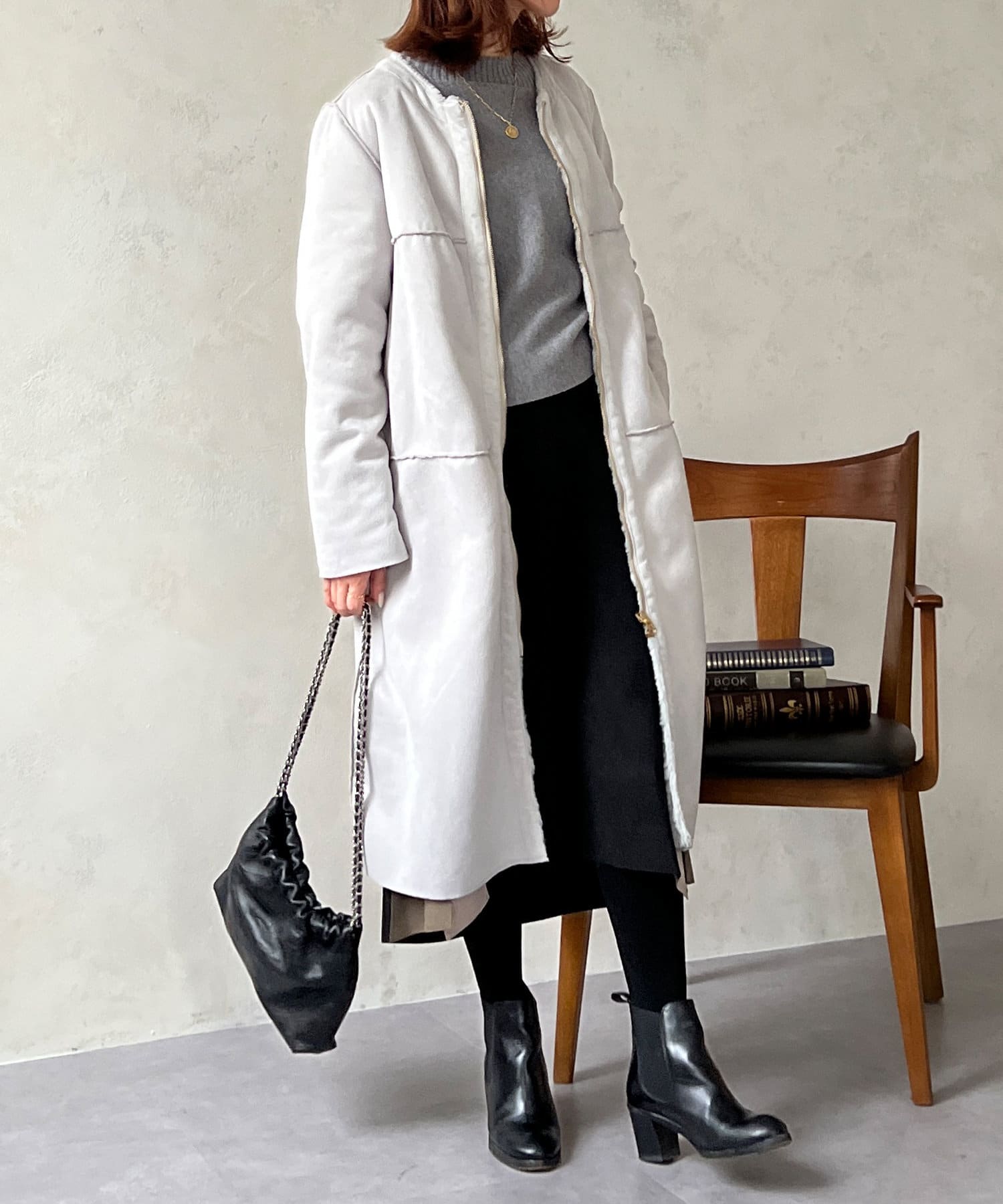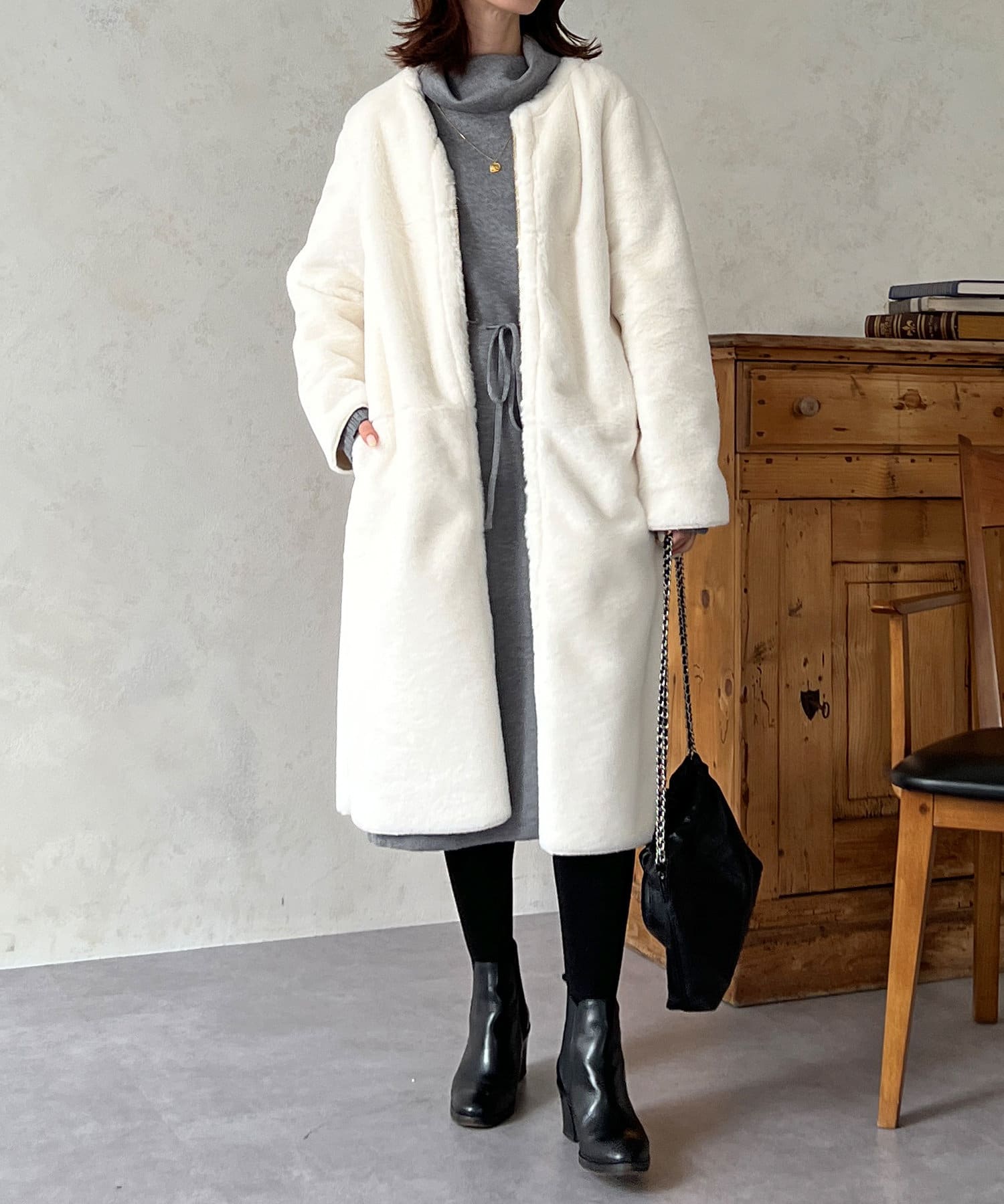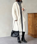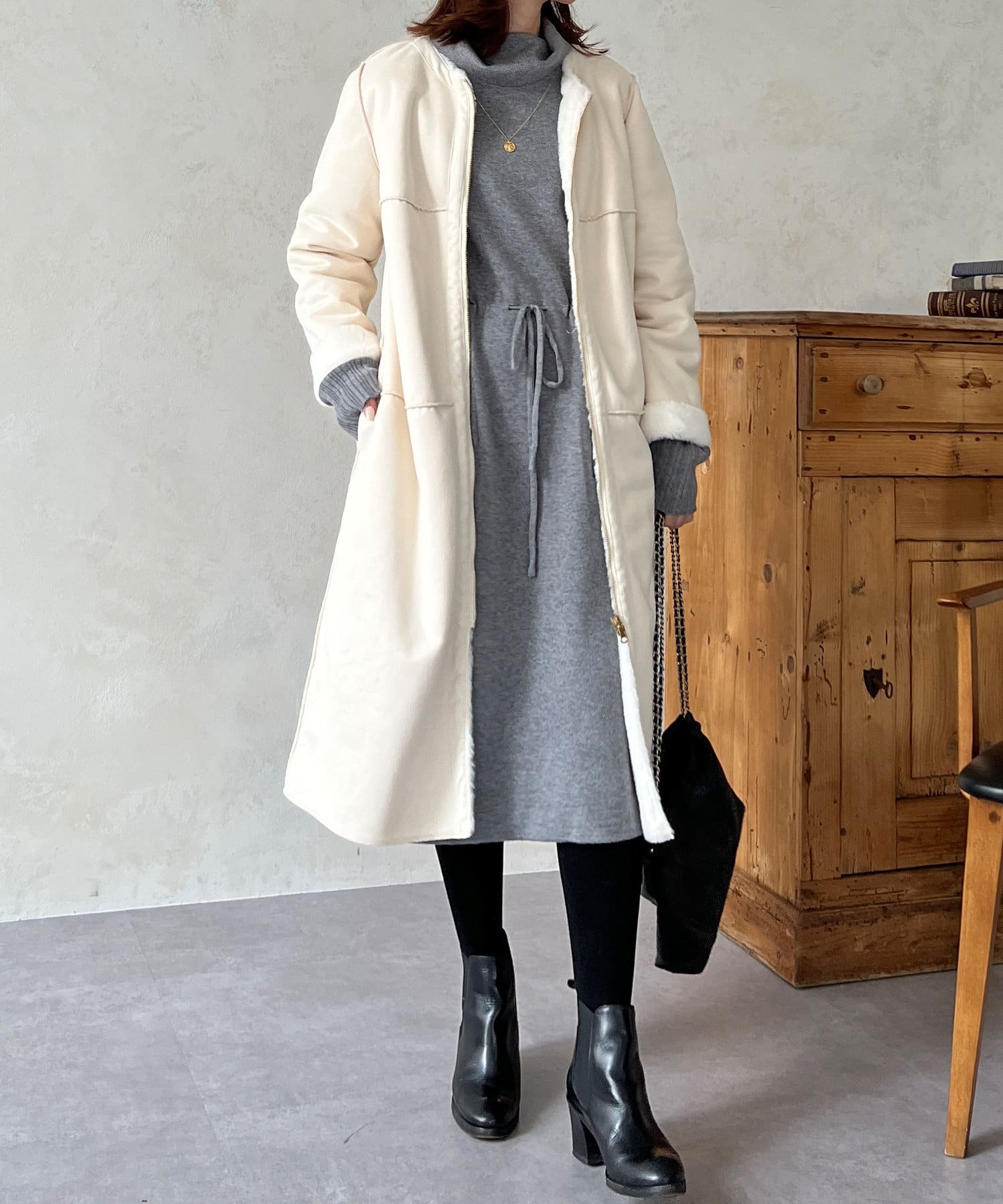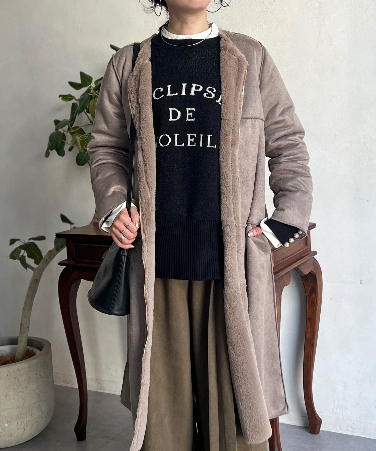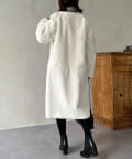 ノーカラーのスエードコート。裏返してファーコートとしても着ていただけます。