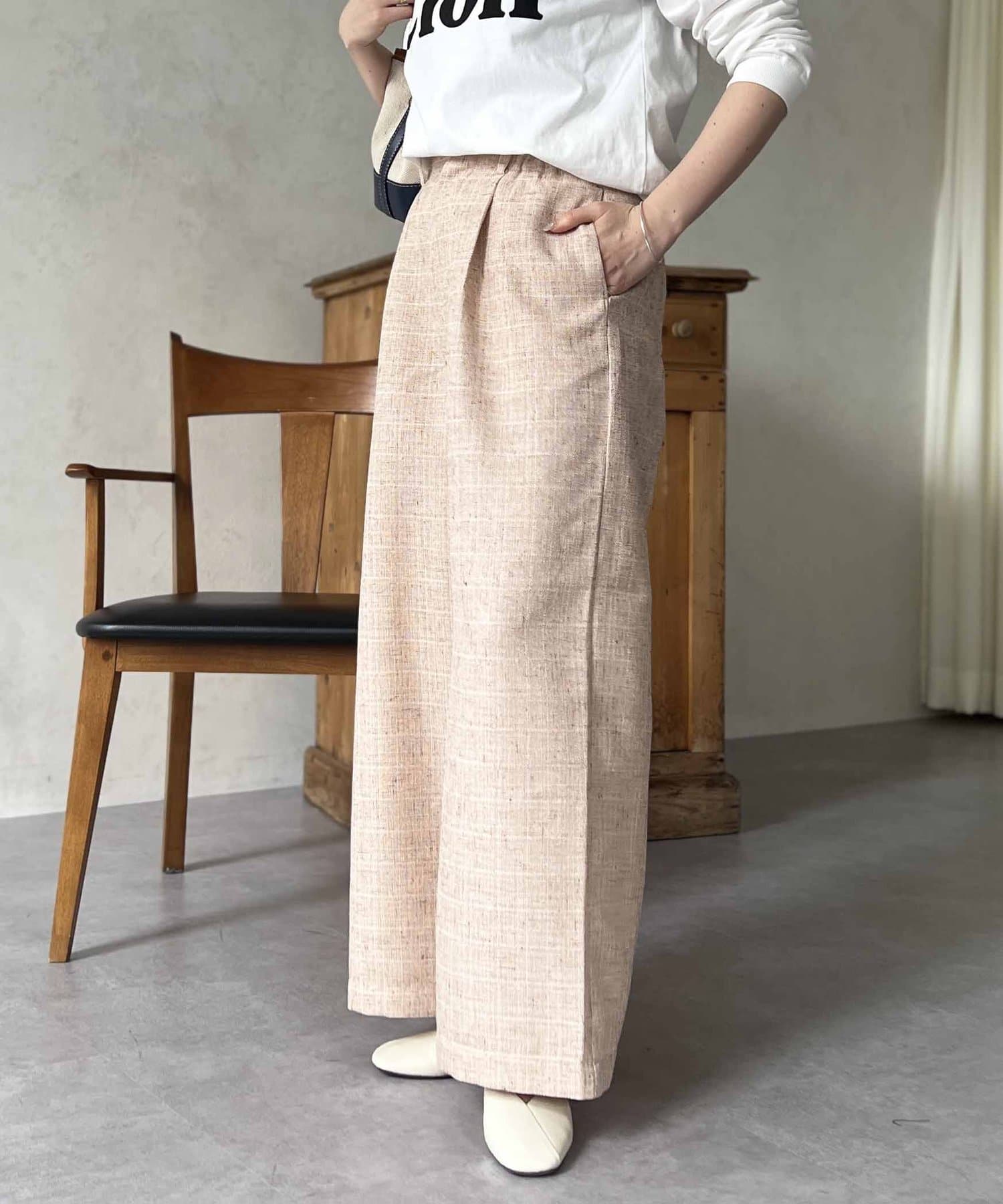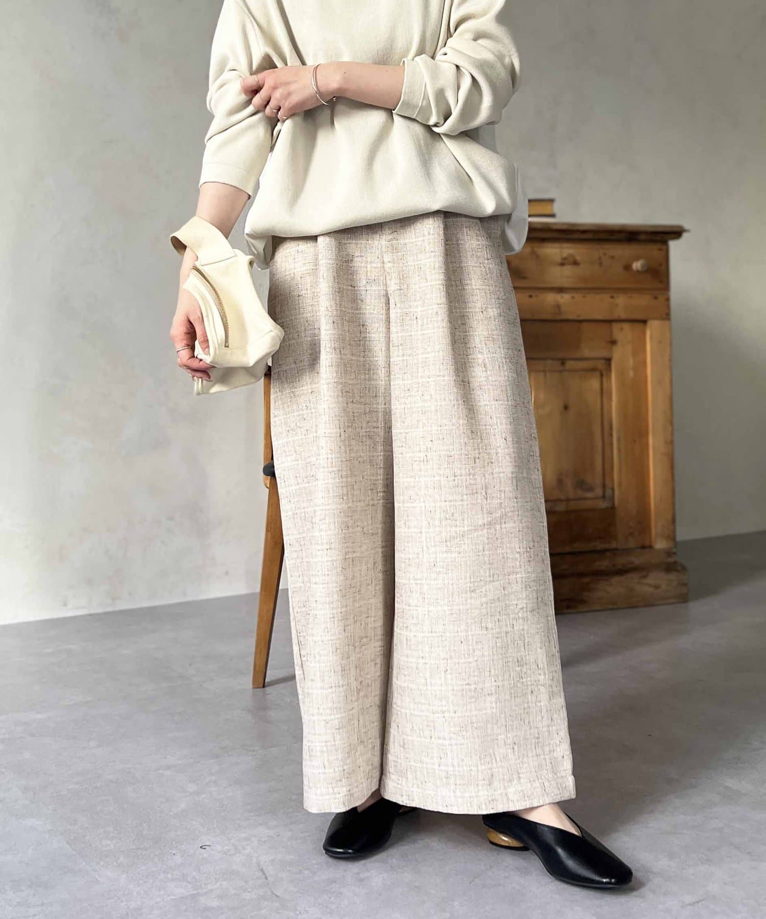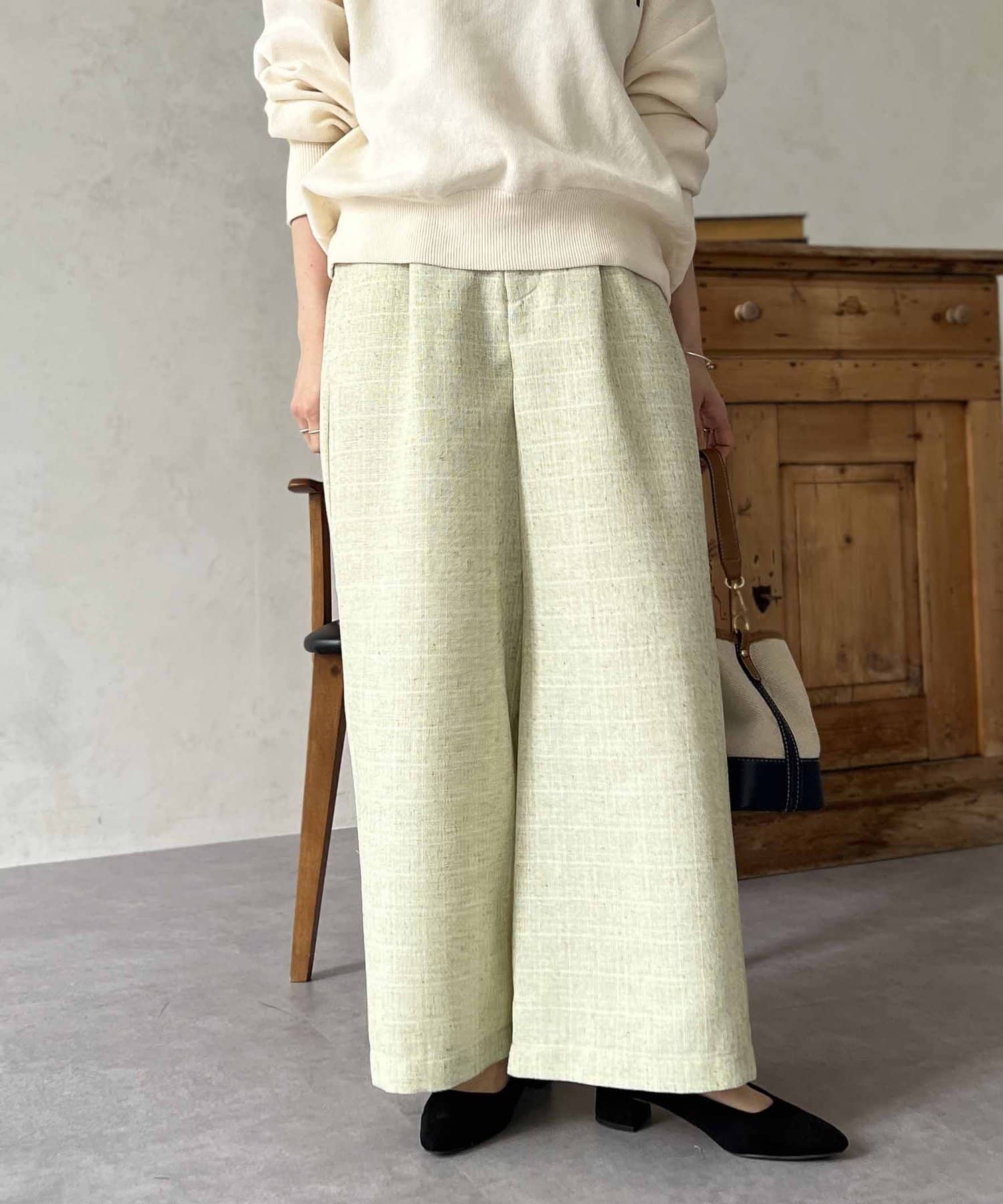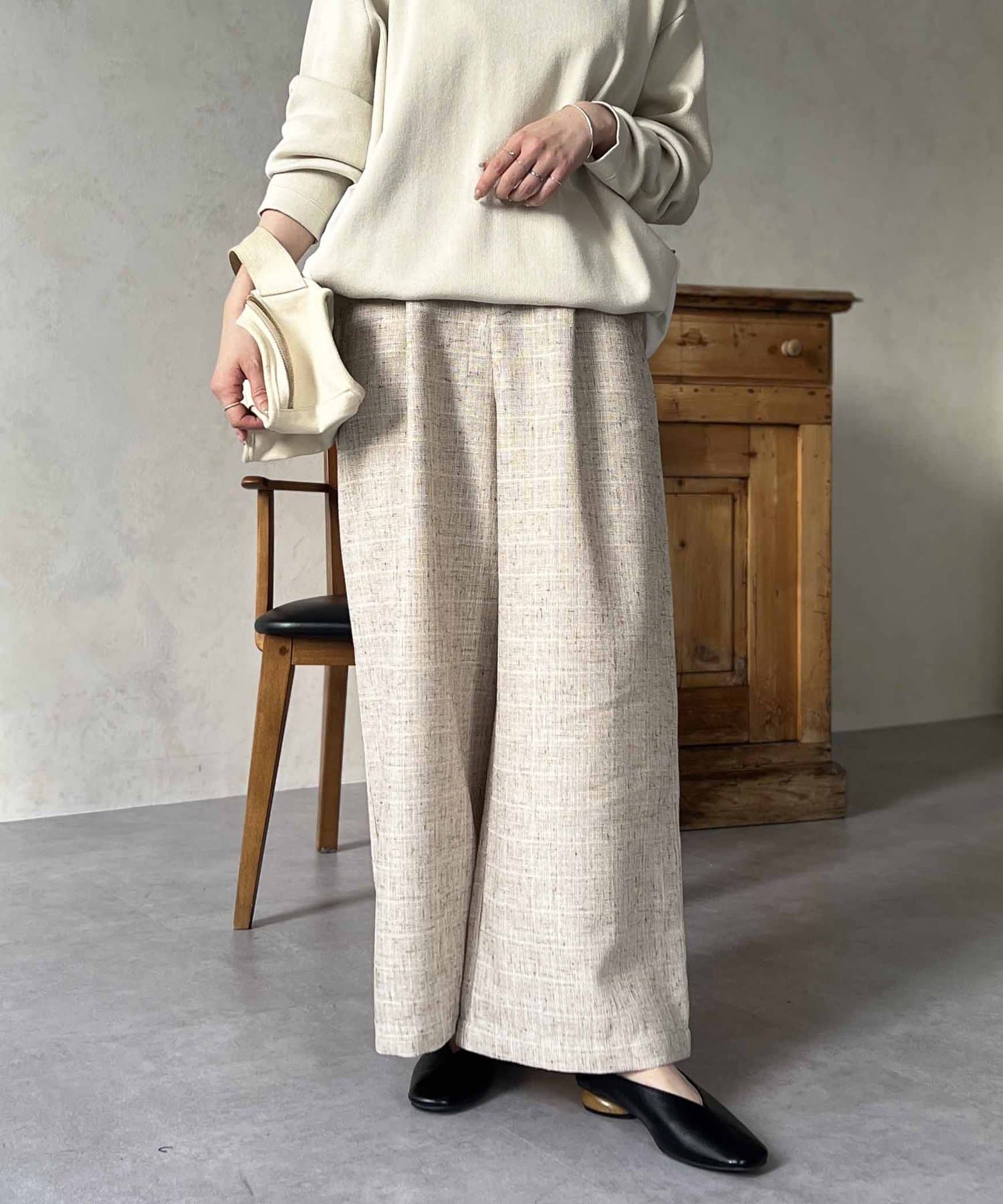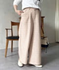 ウエストゴム仕様で楽な履き心地と、程よいワイドシルエットできちんと感もプラス。