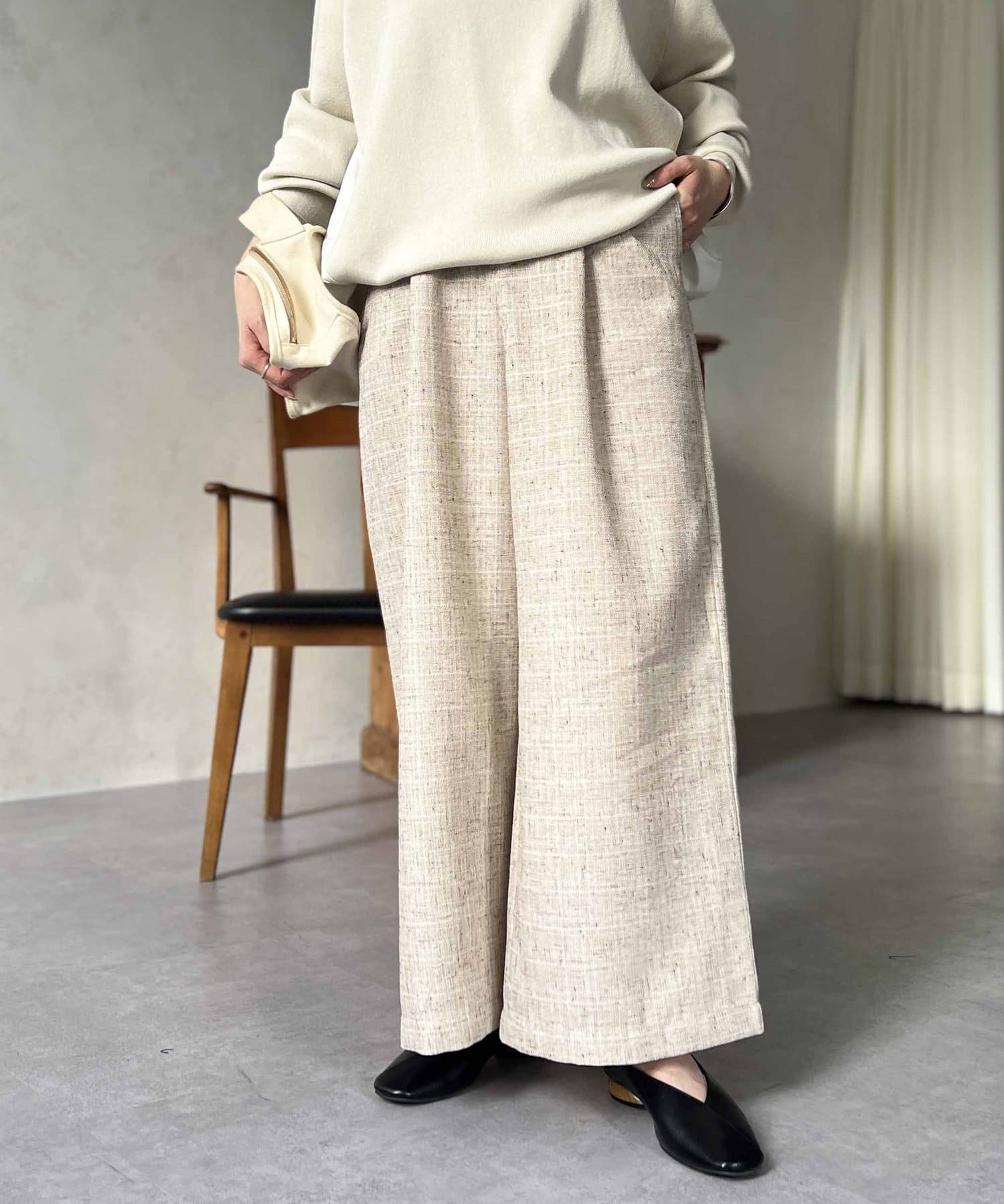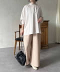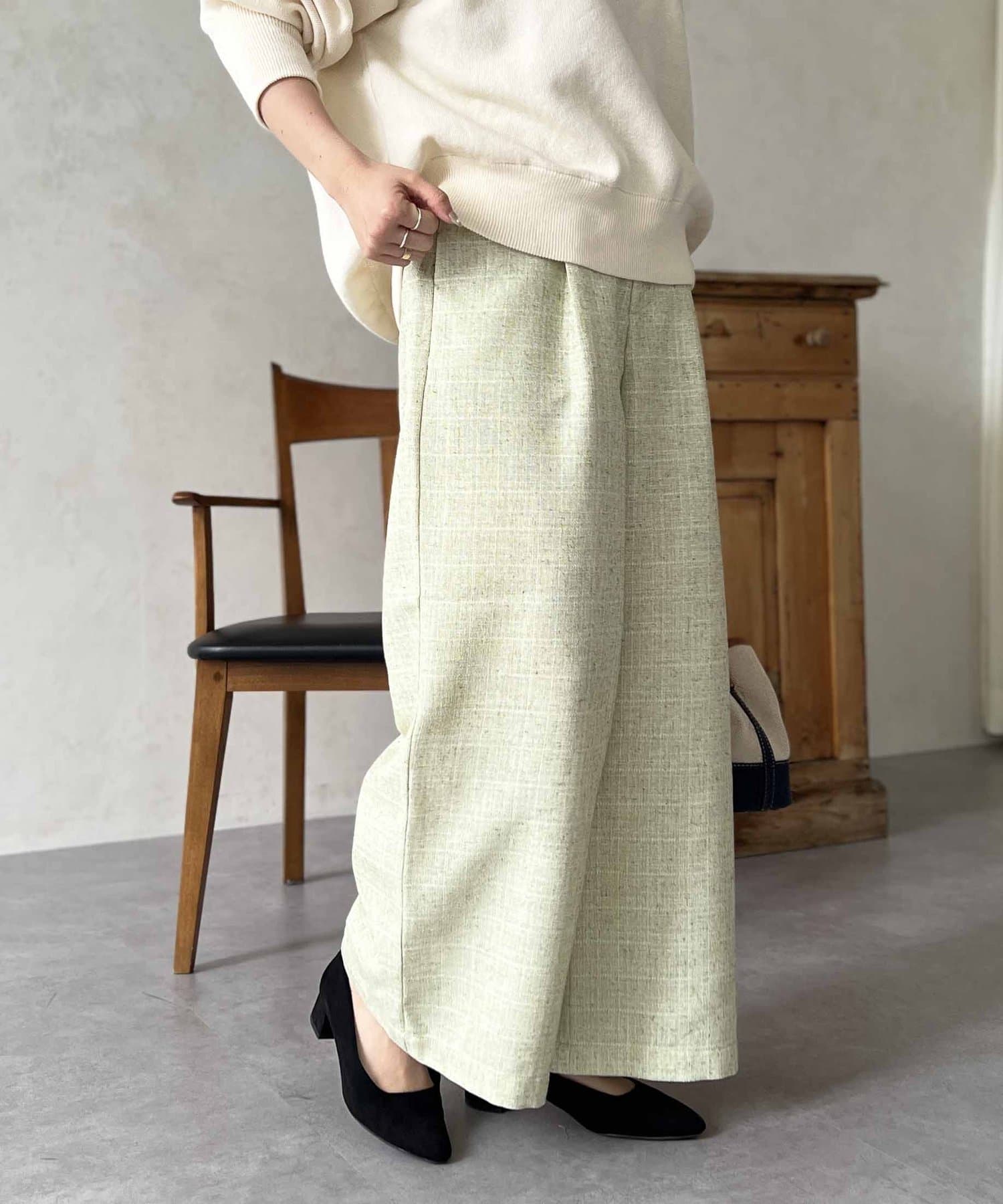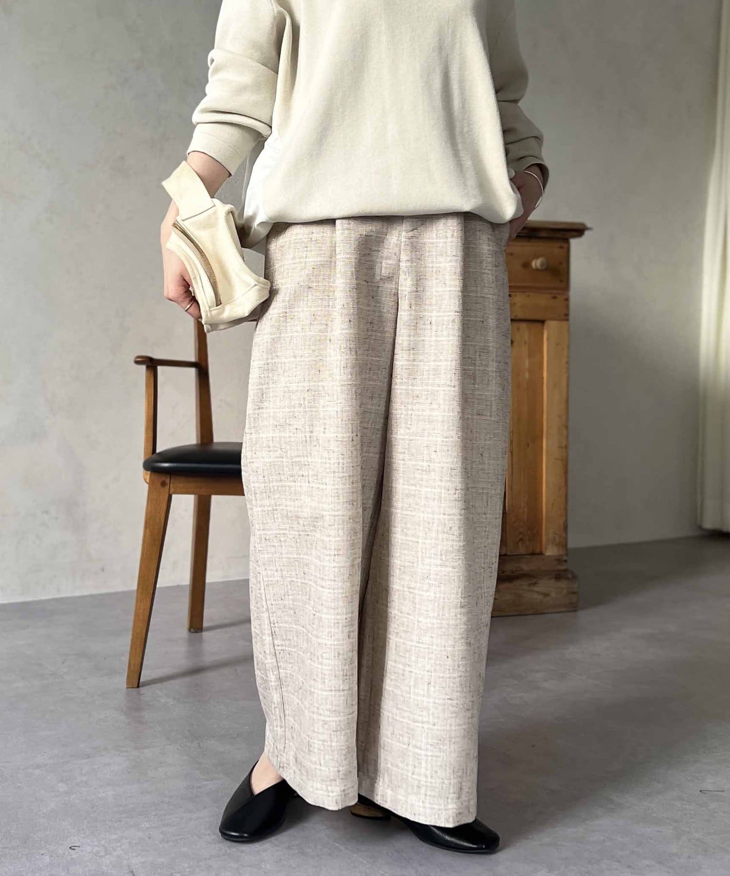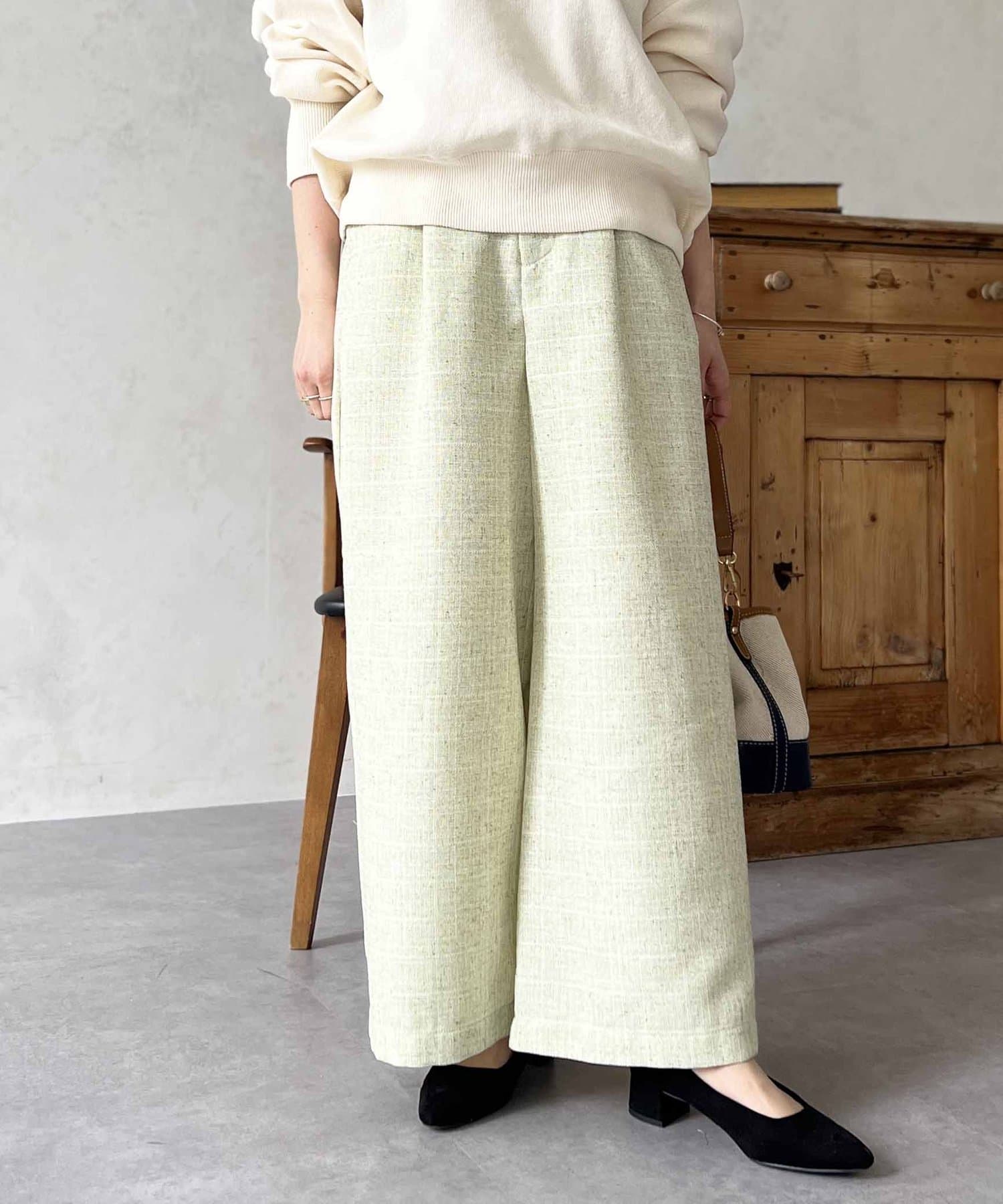 ウエストゴム仕様で楽な履き心地と、程よいワイドシルエットできちんと感もプラス。