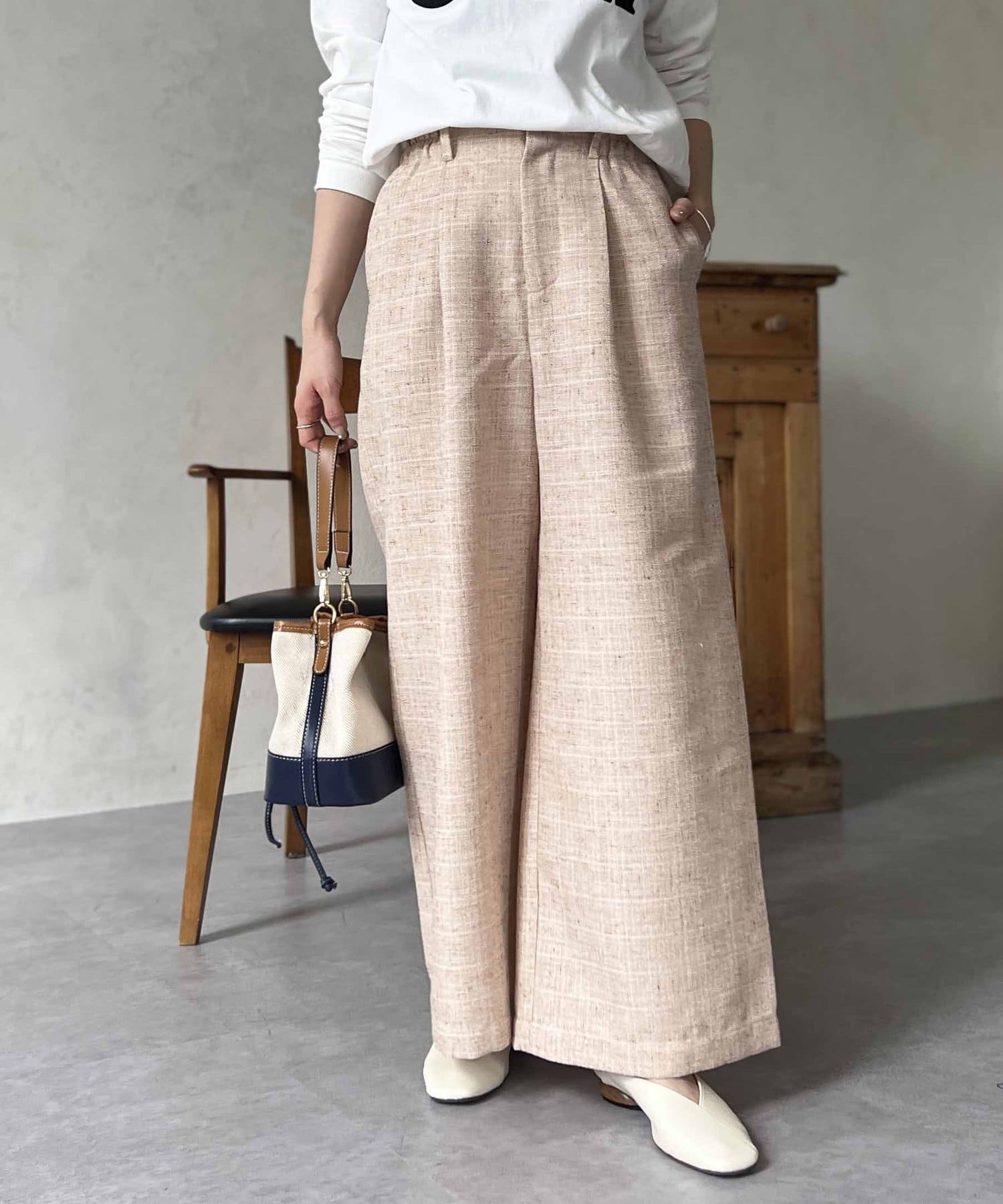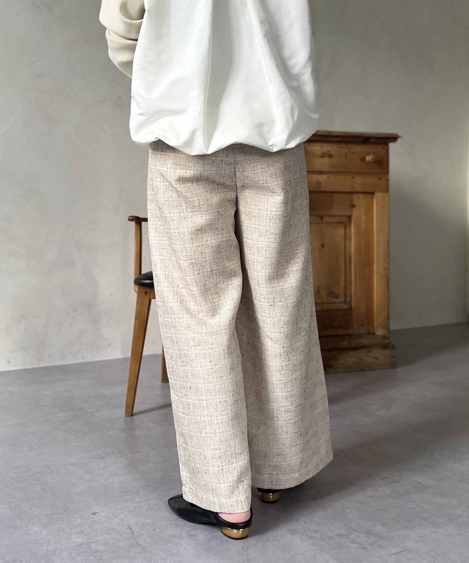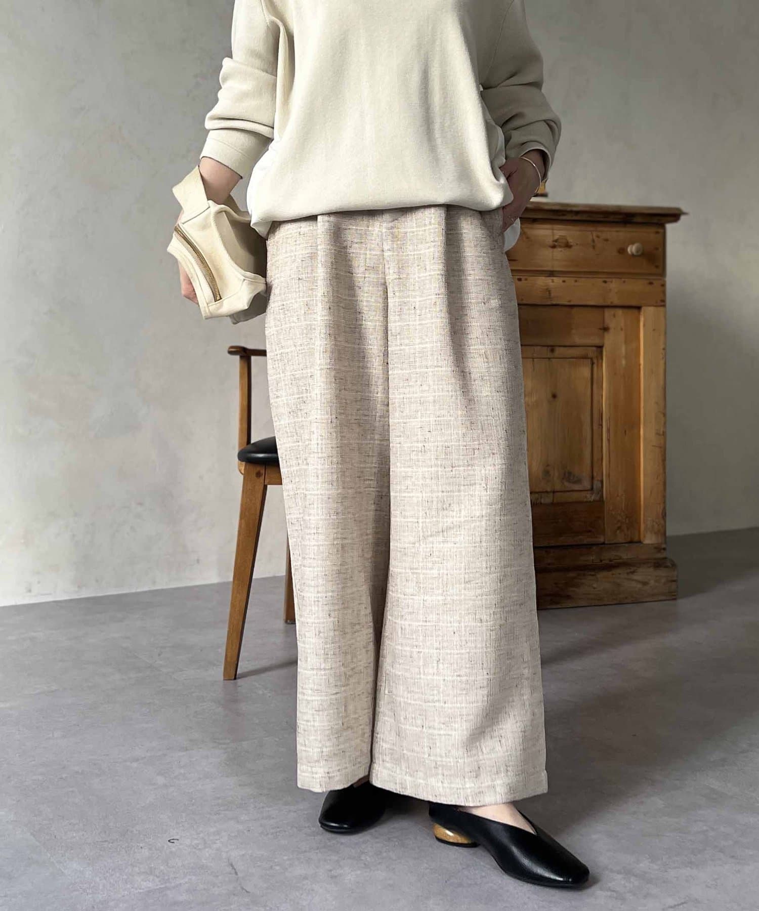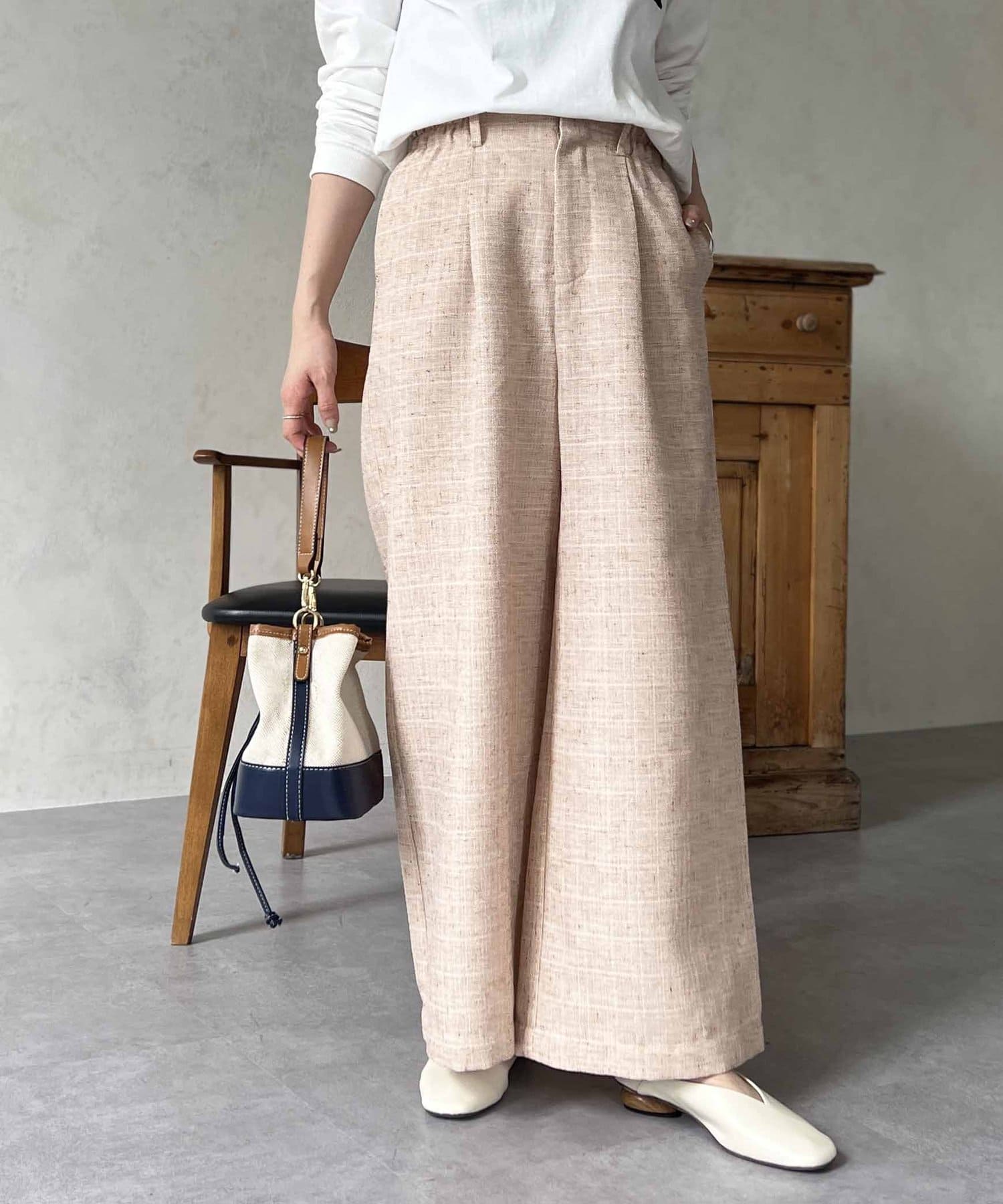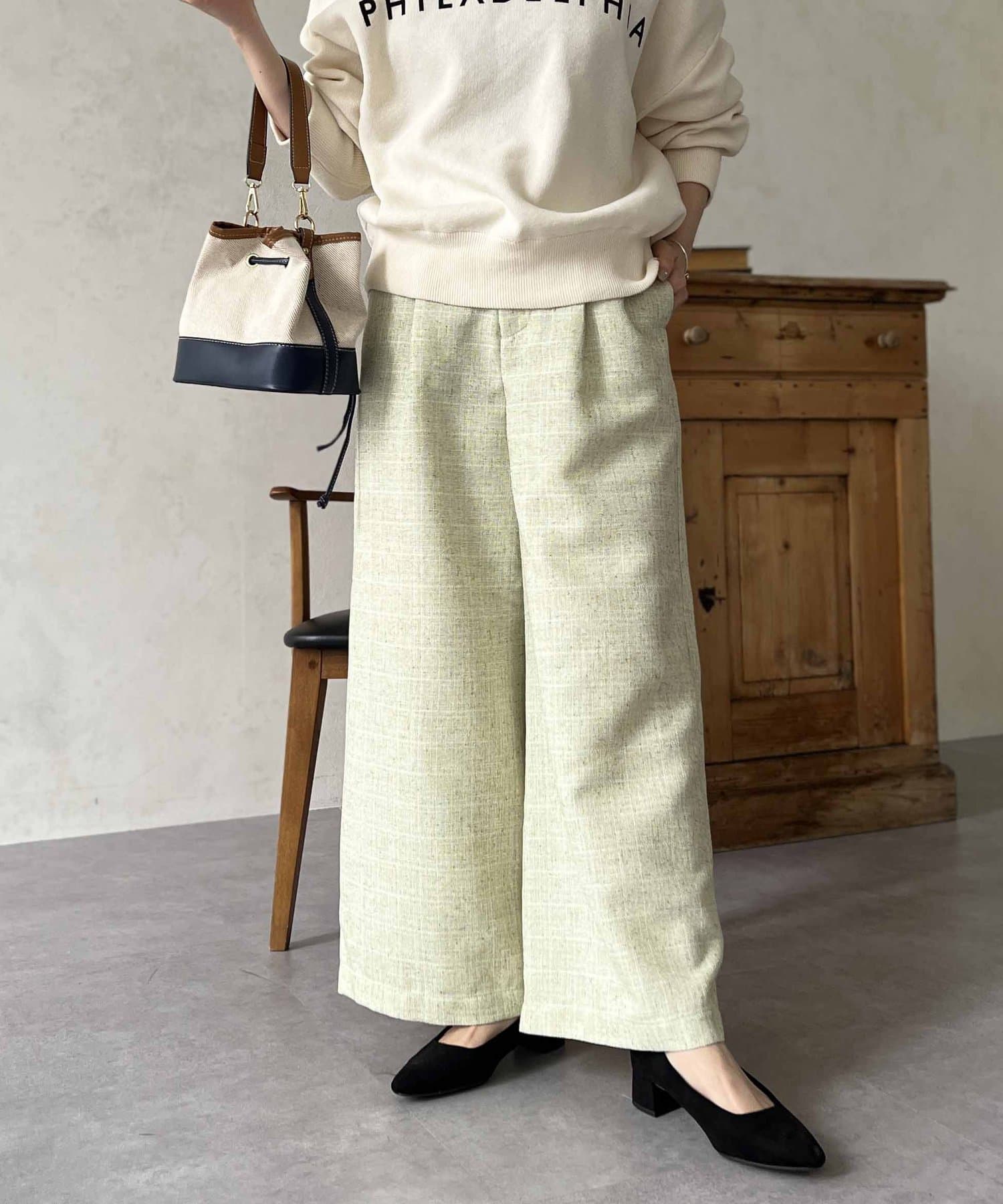ウエストゴム仕様で楽な履き心地と、程よいワイドシルエットできちんと感もプラス。