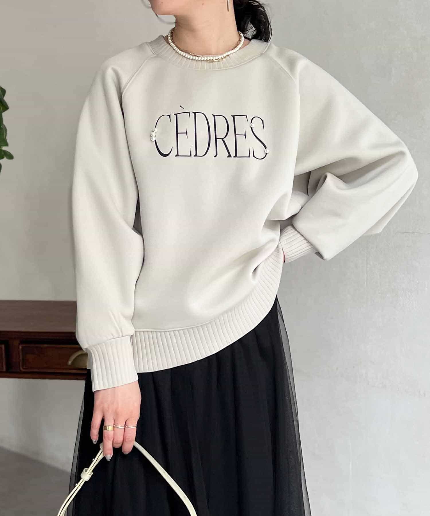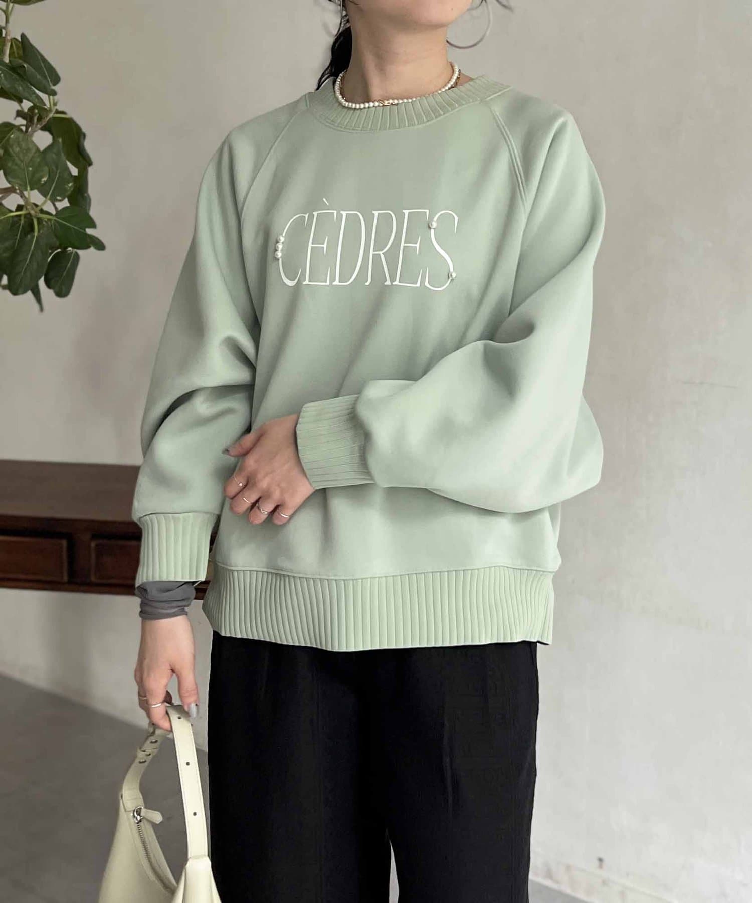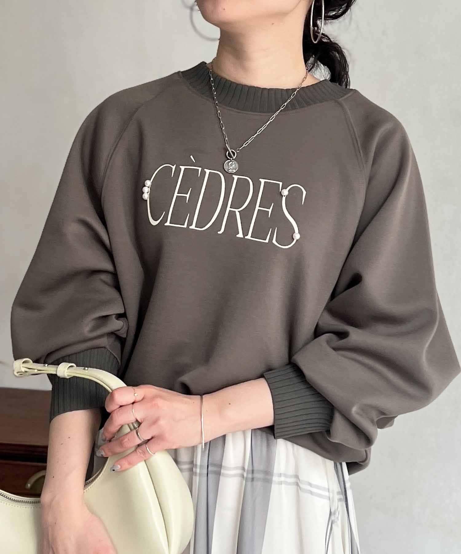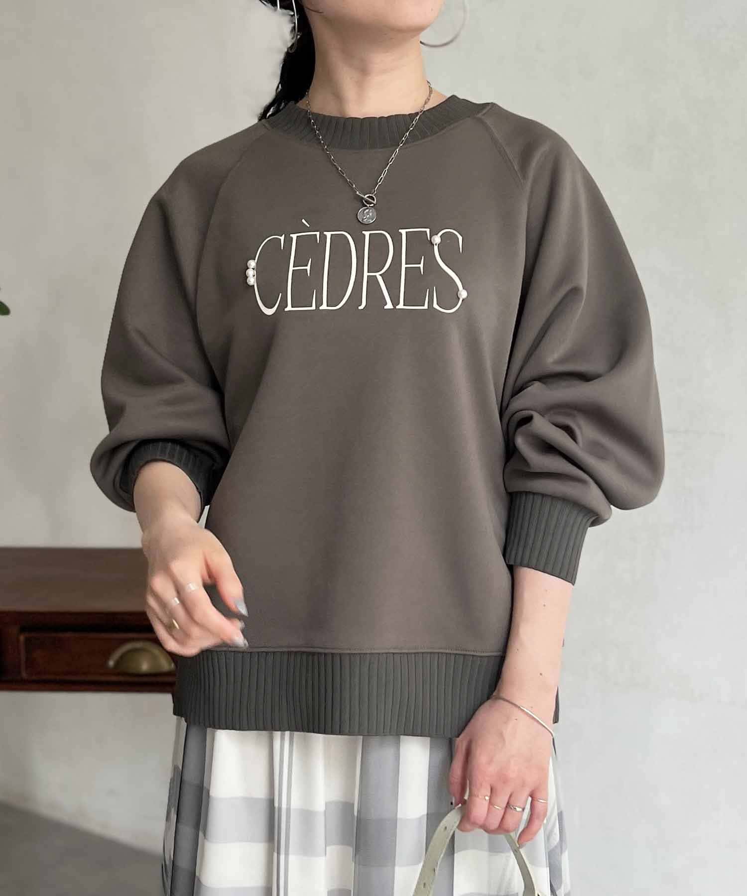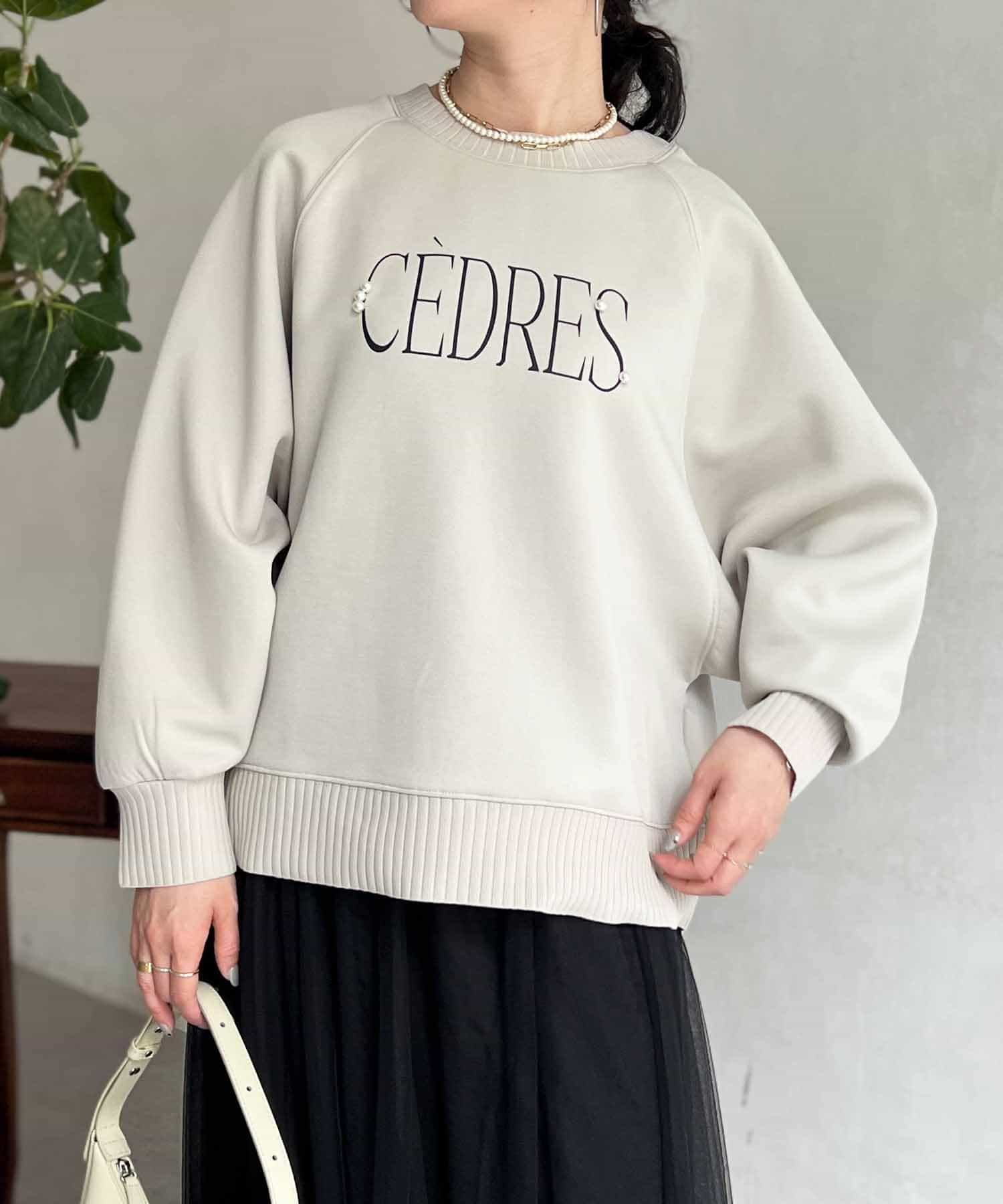 きれいめ見えする細ロゴとアクセントになるパール付きがポイントのスウェット。