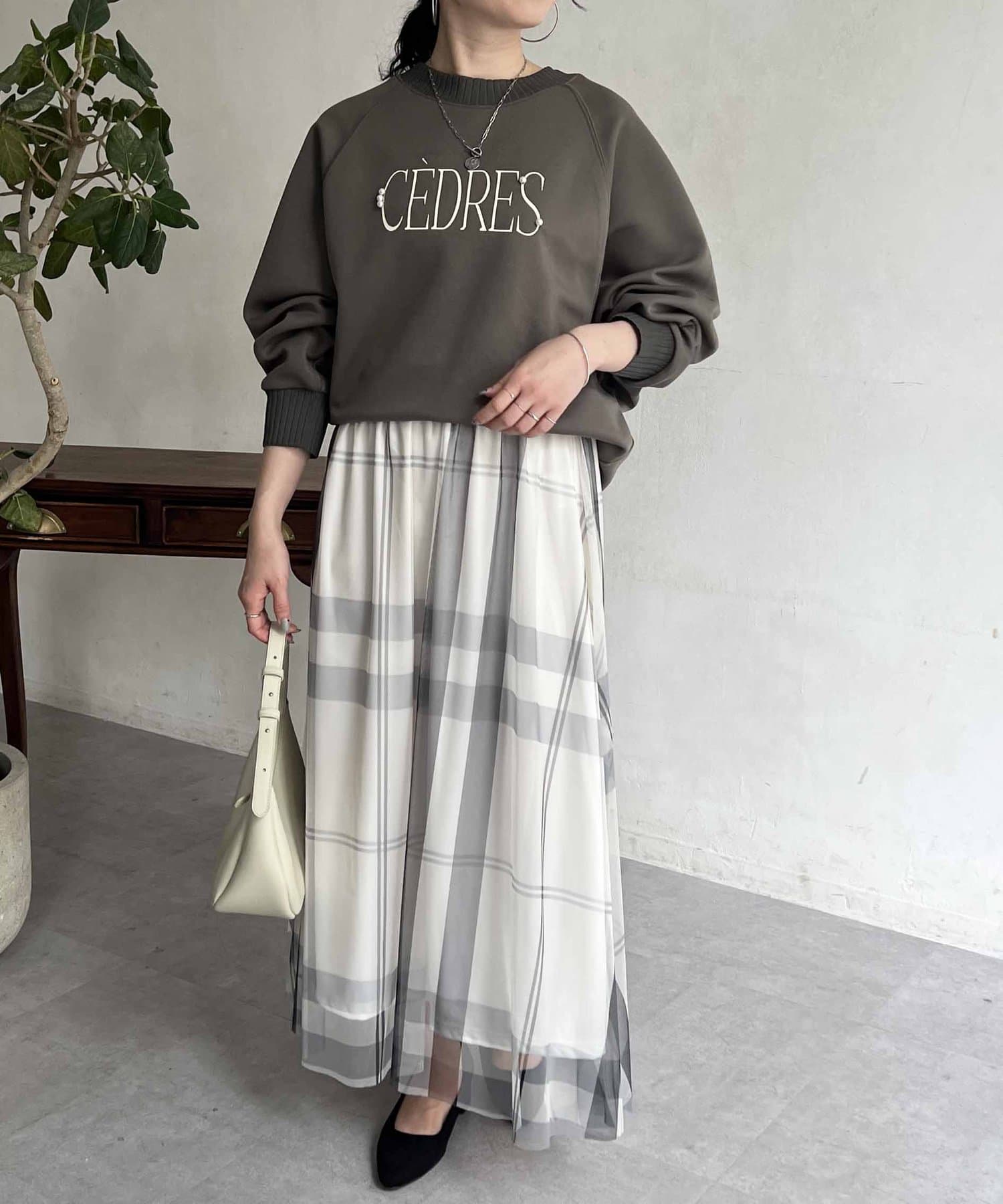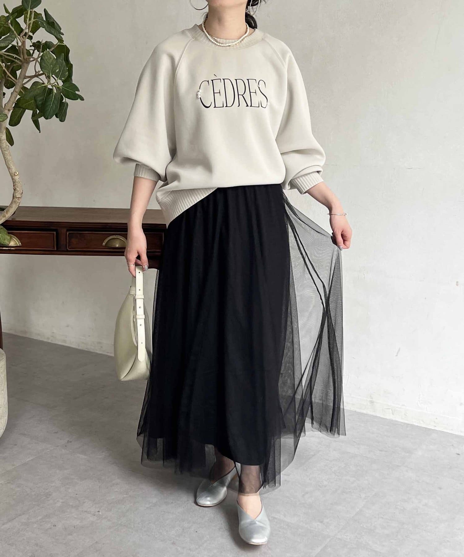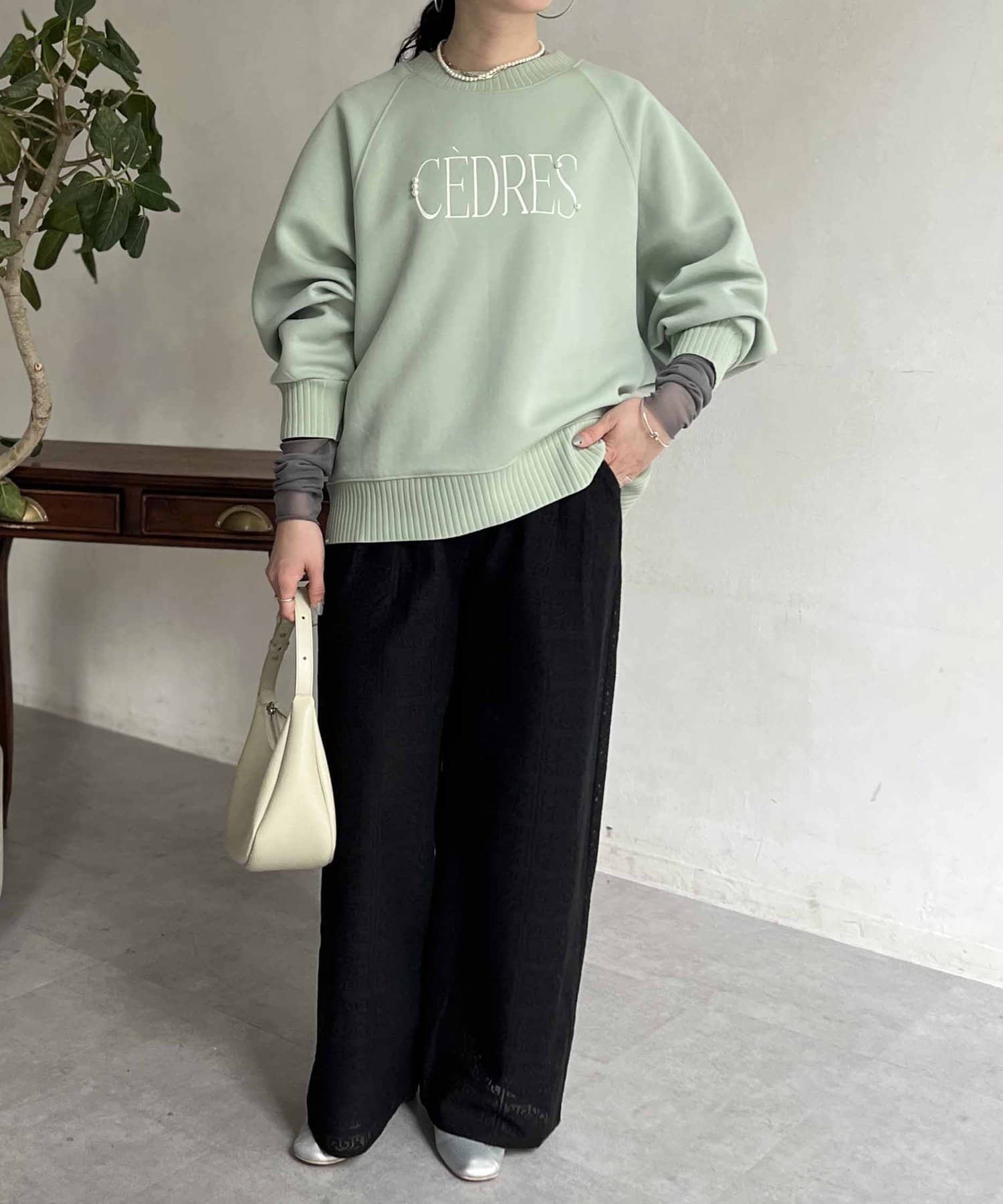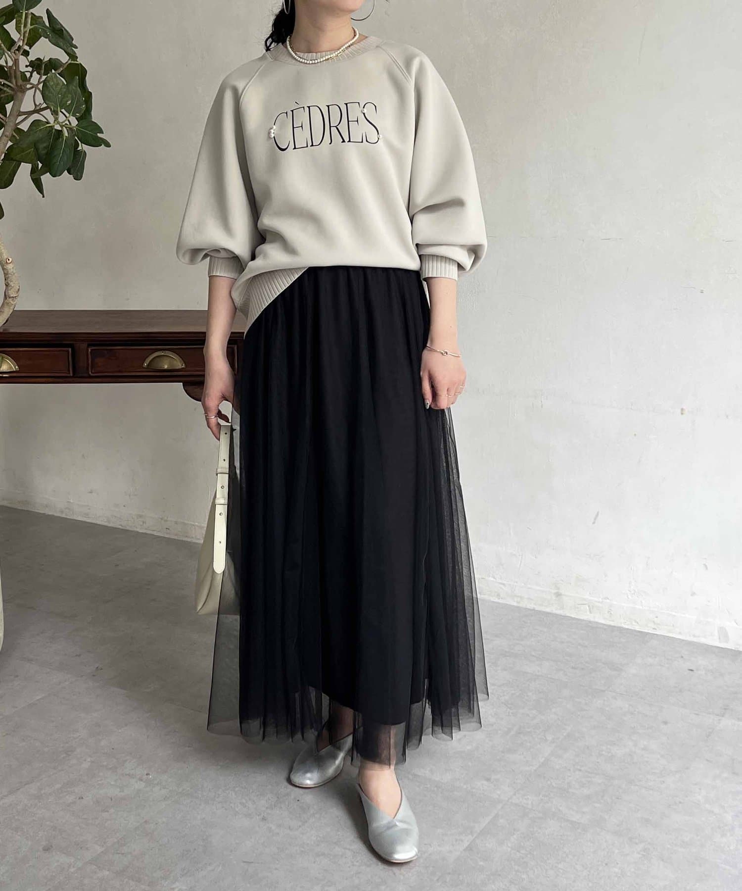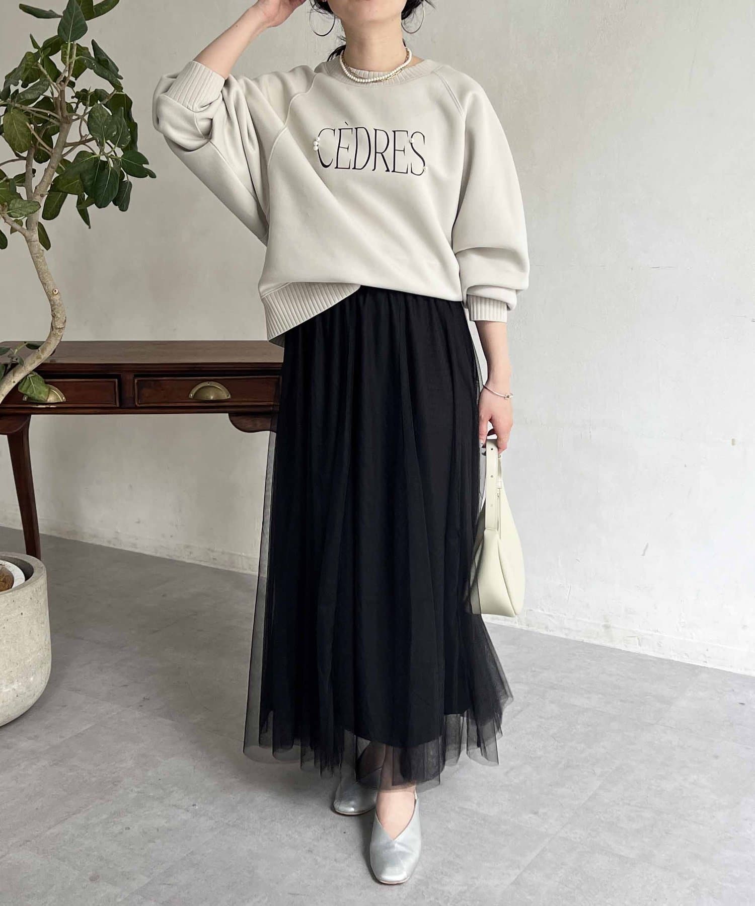 きれいめ見えする細ロゴとアクセントになるパール付きがポイントのスウェット。