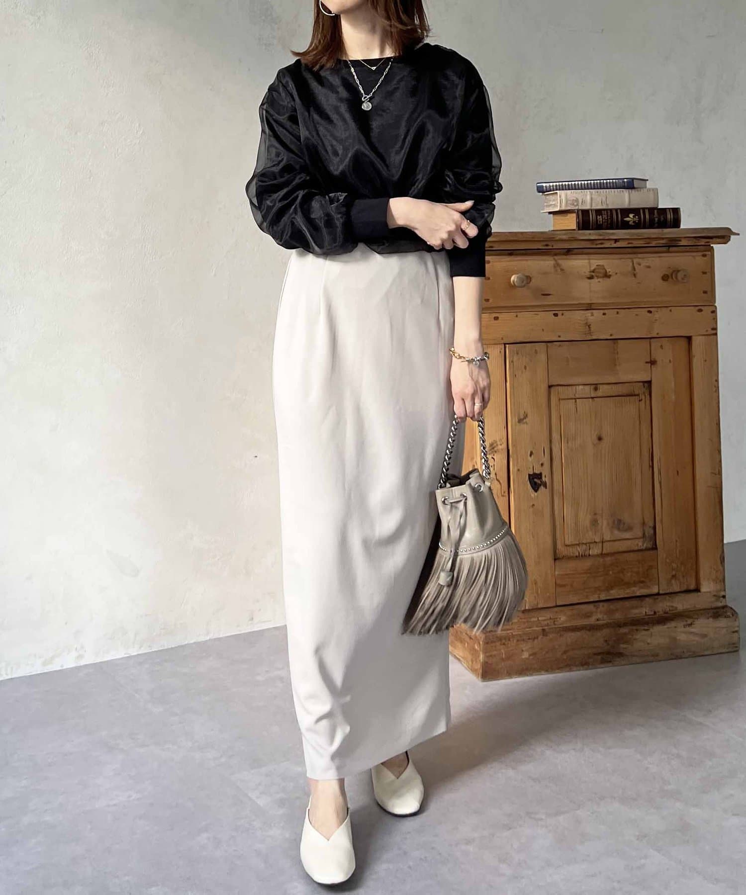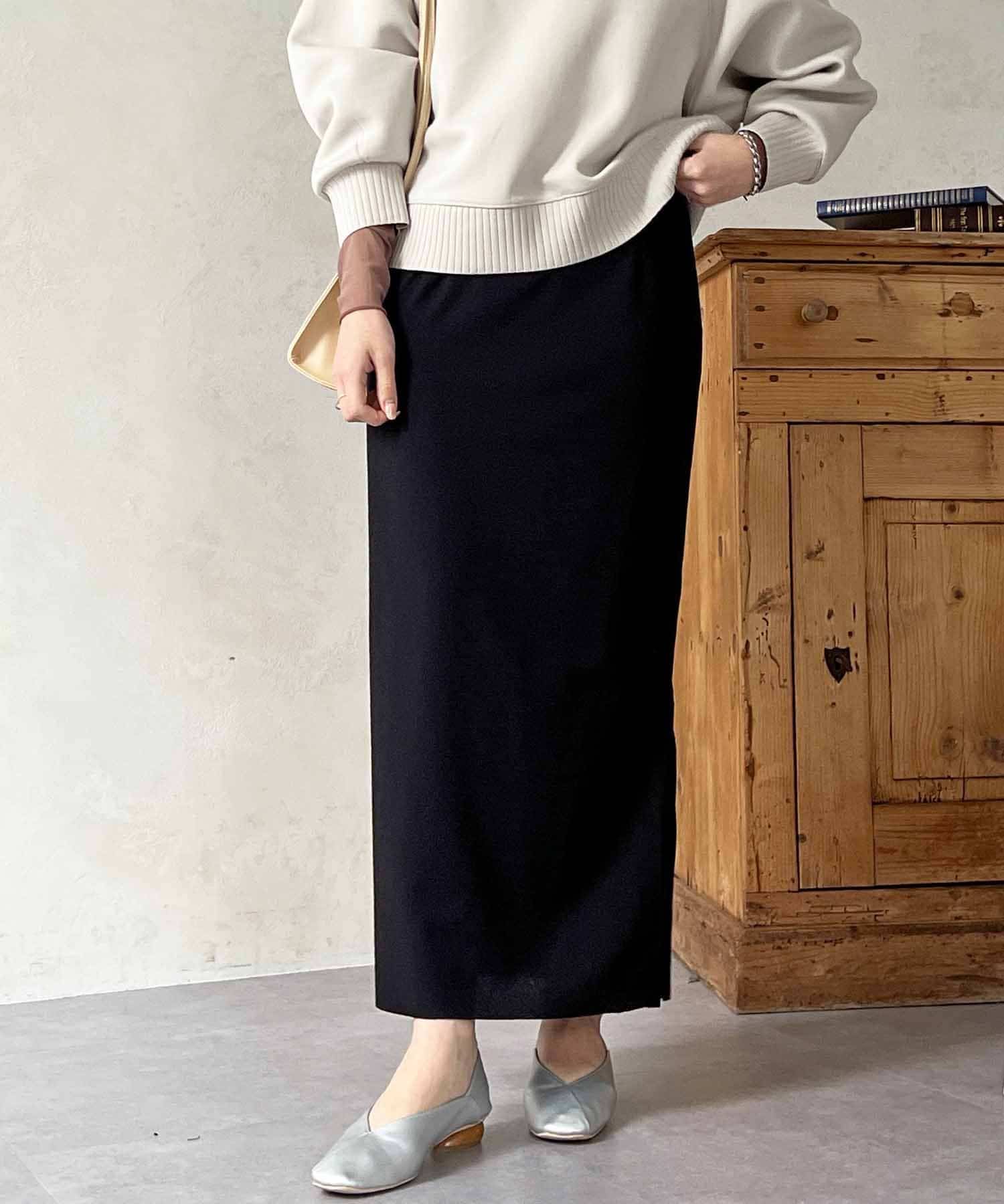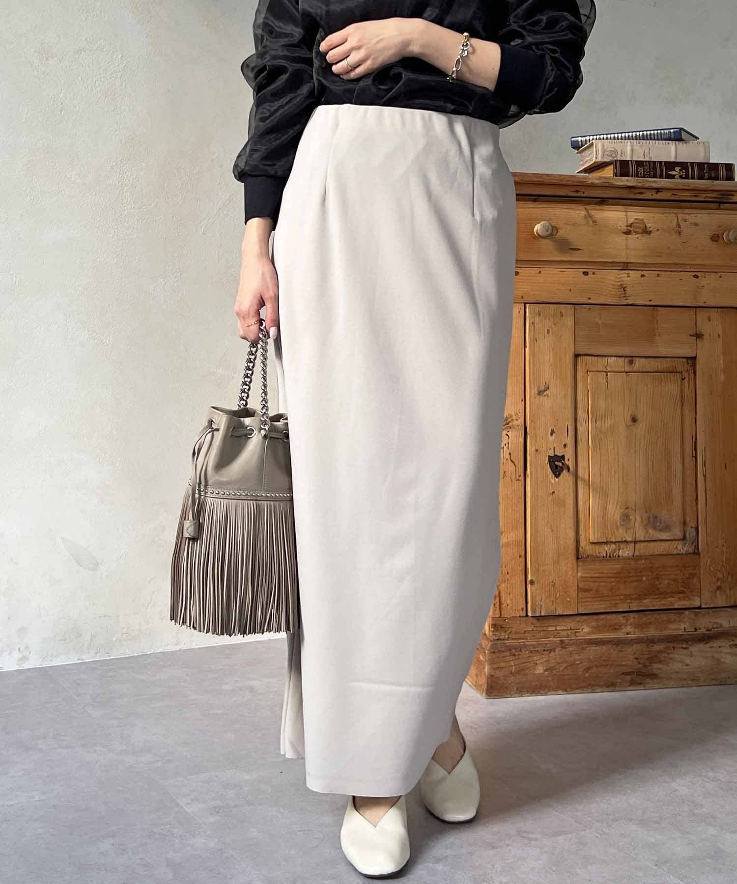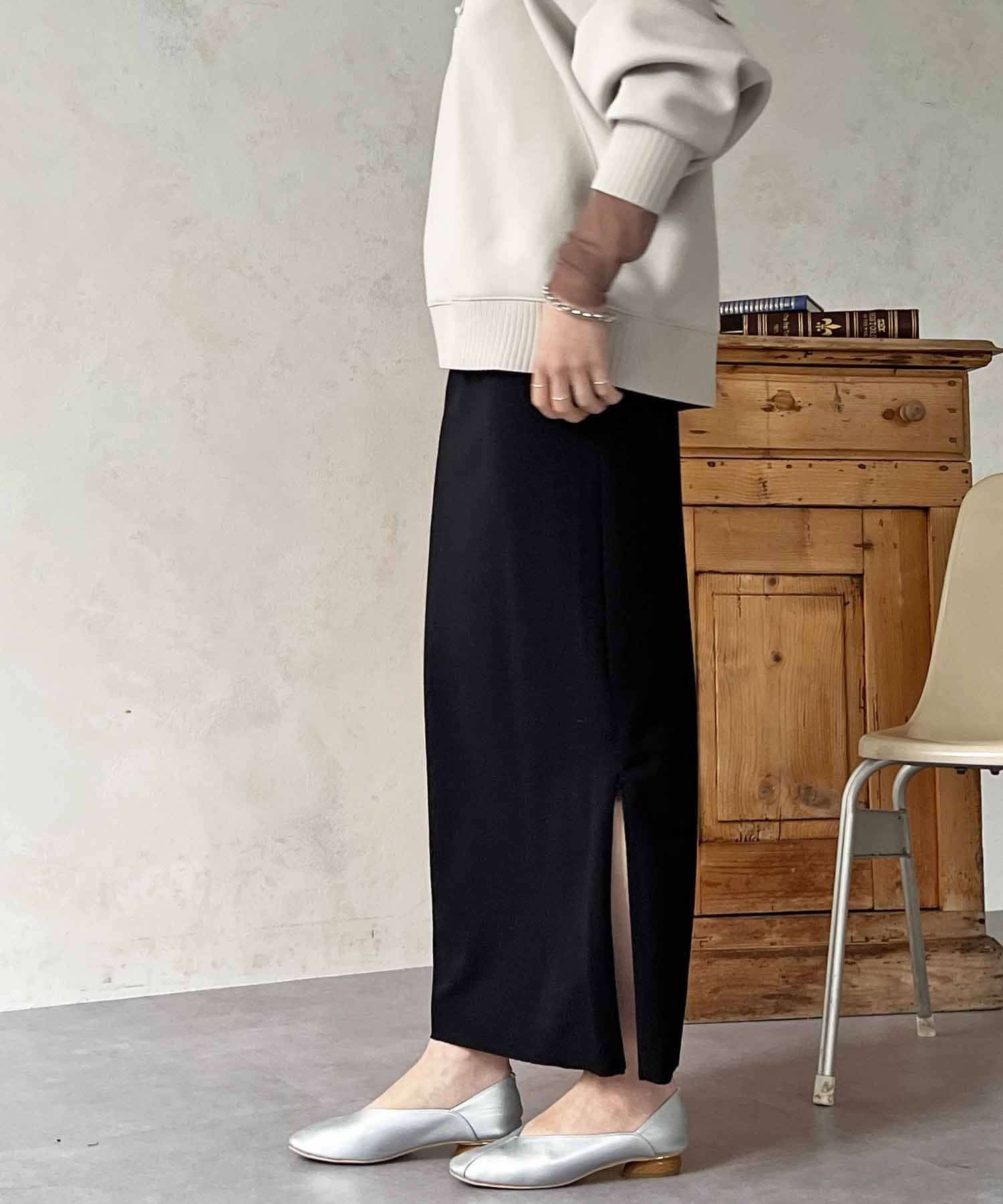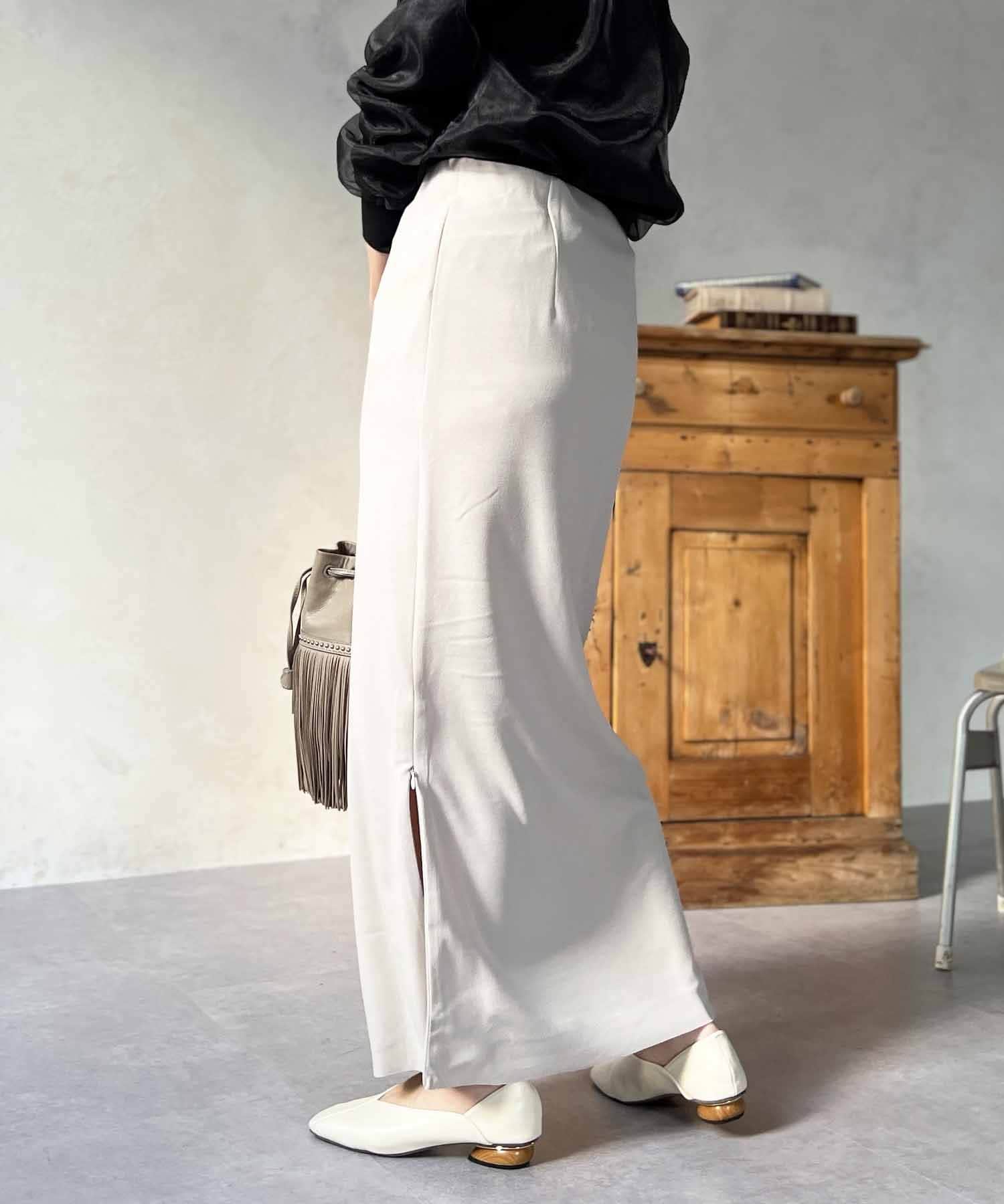 シンプルなデザインですが、右裾部分にジップがついており開けるとスリットにもなります。