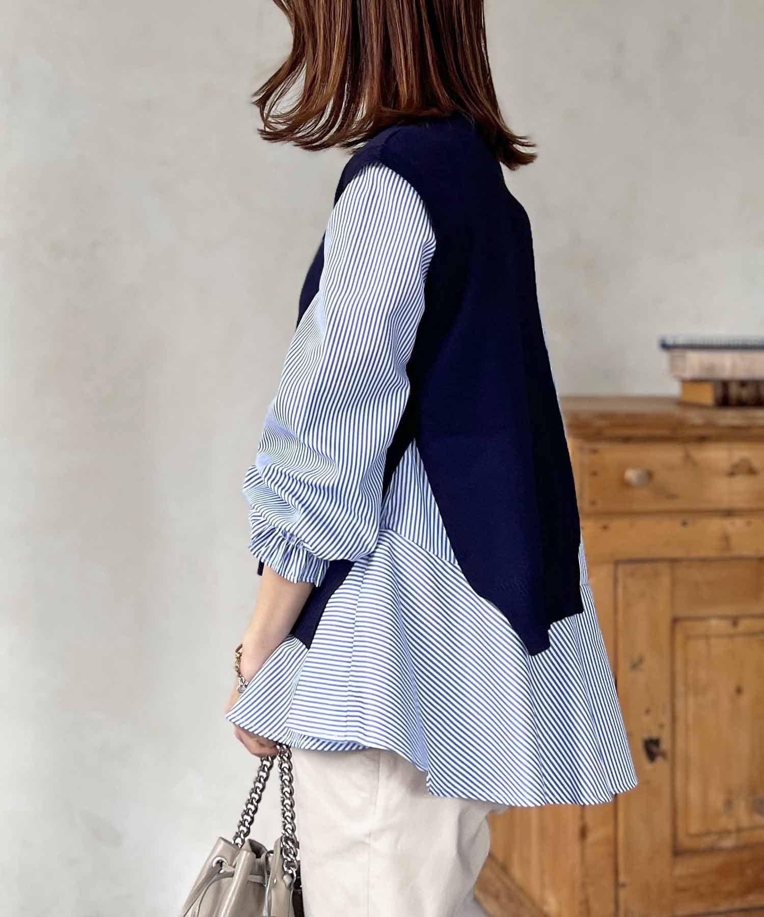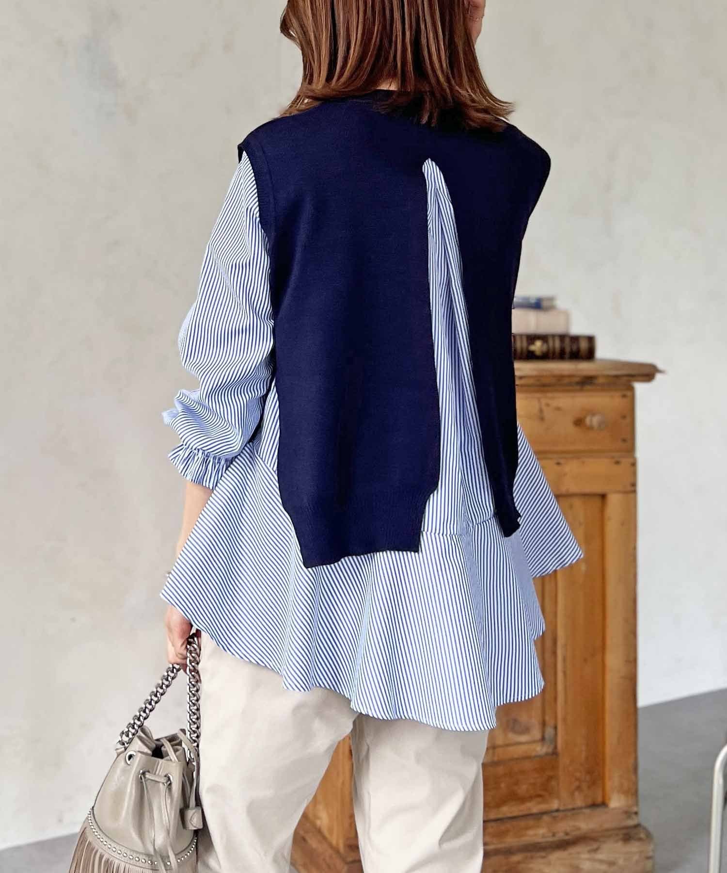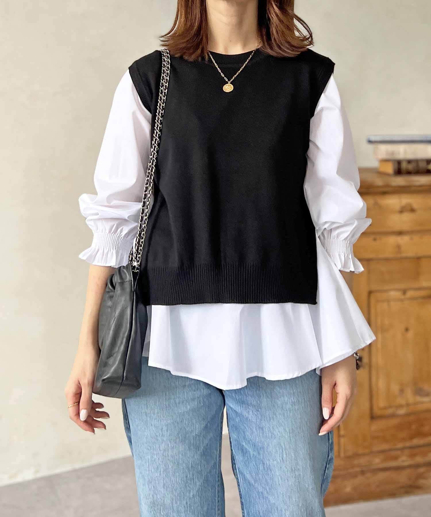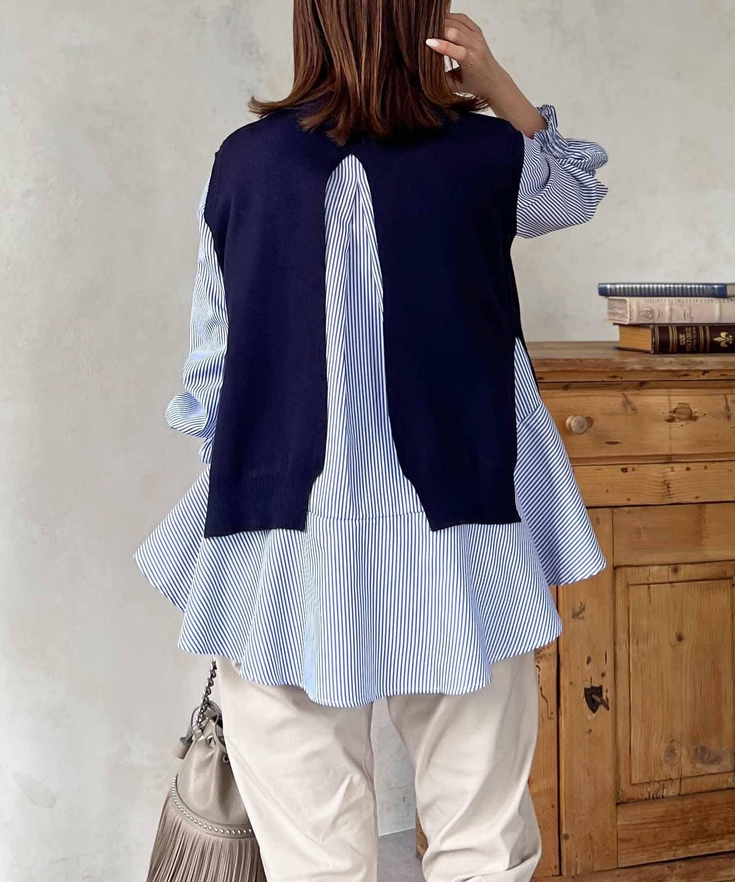 ペプラム風デザインのブラウスに、短丈のニットベストがセットになりました!