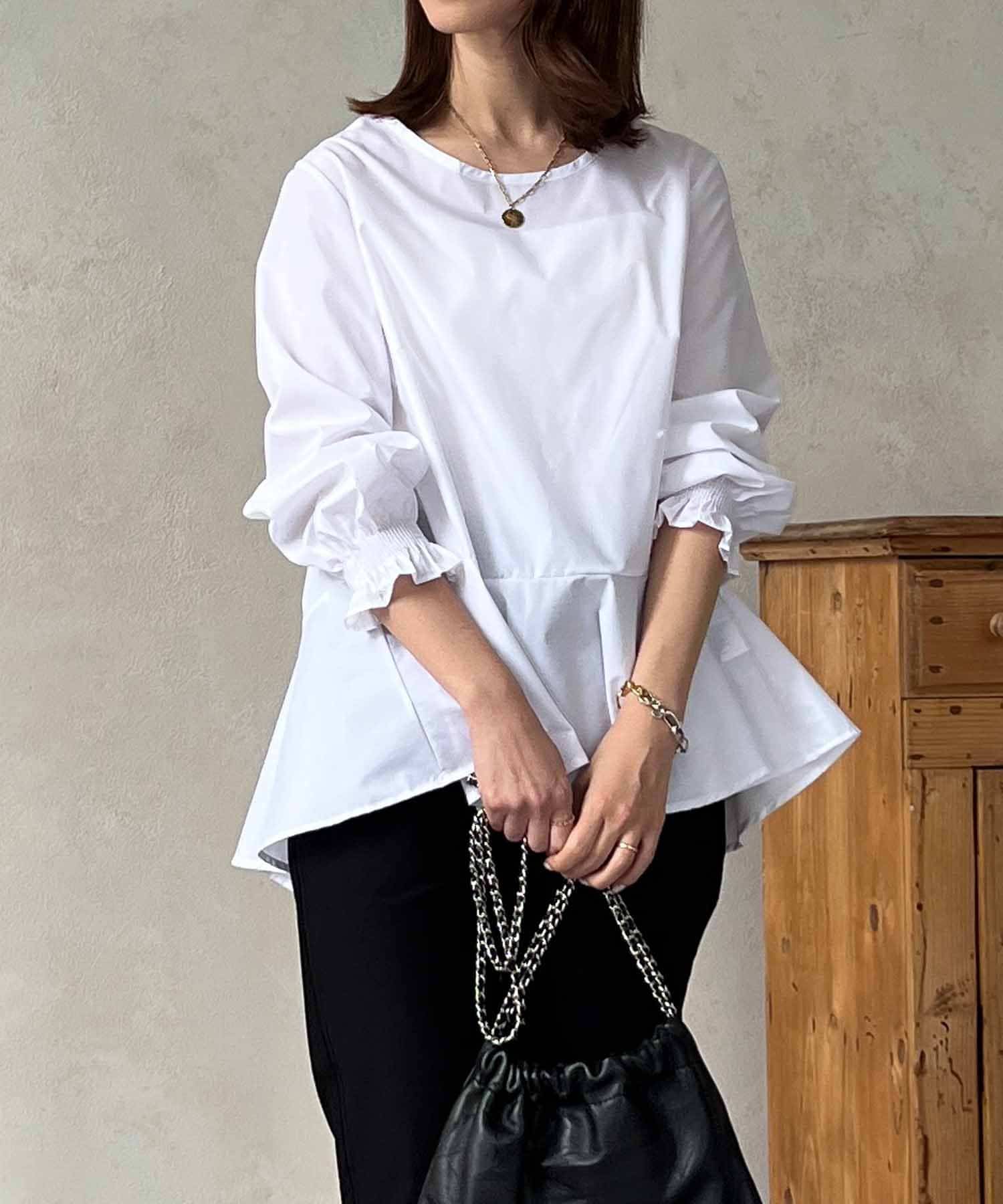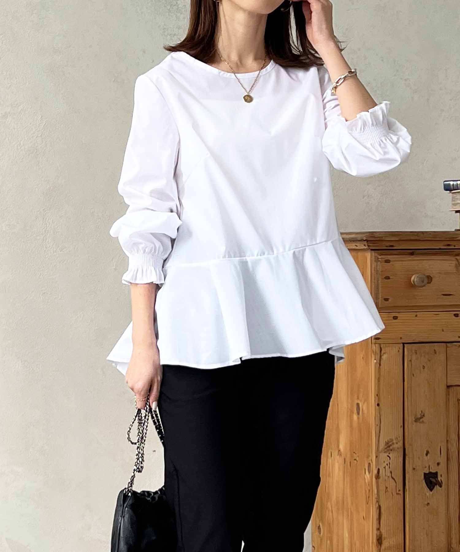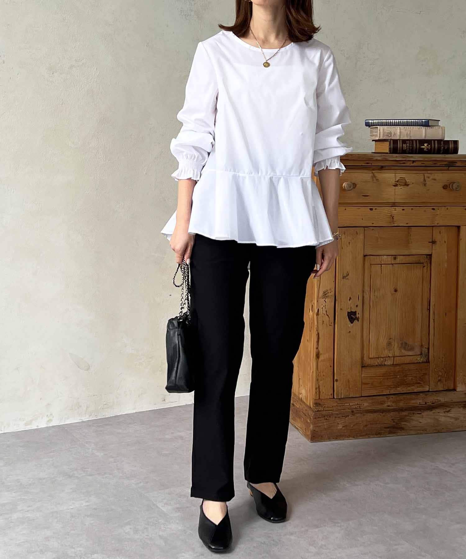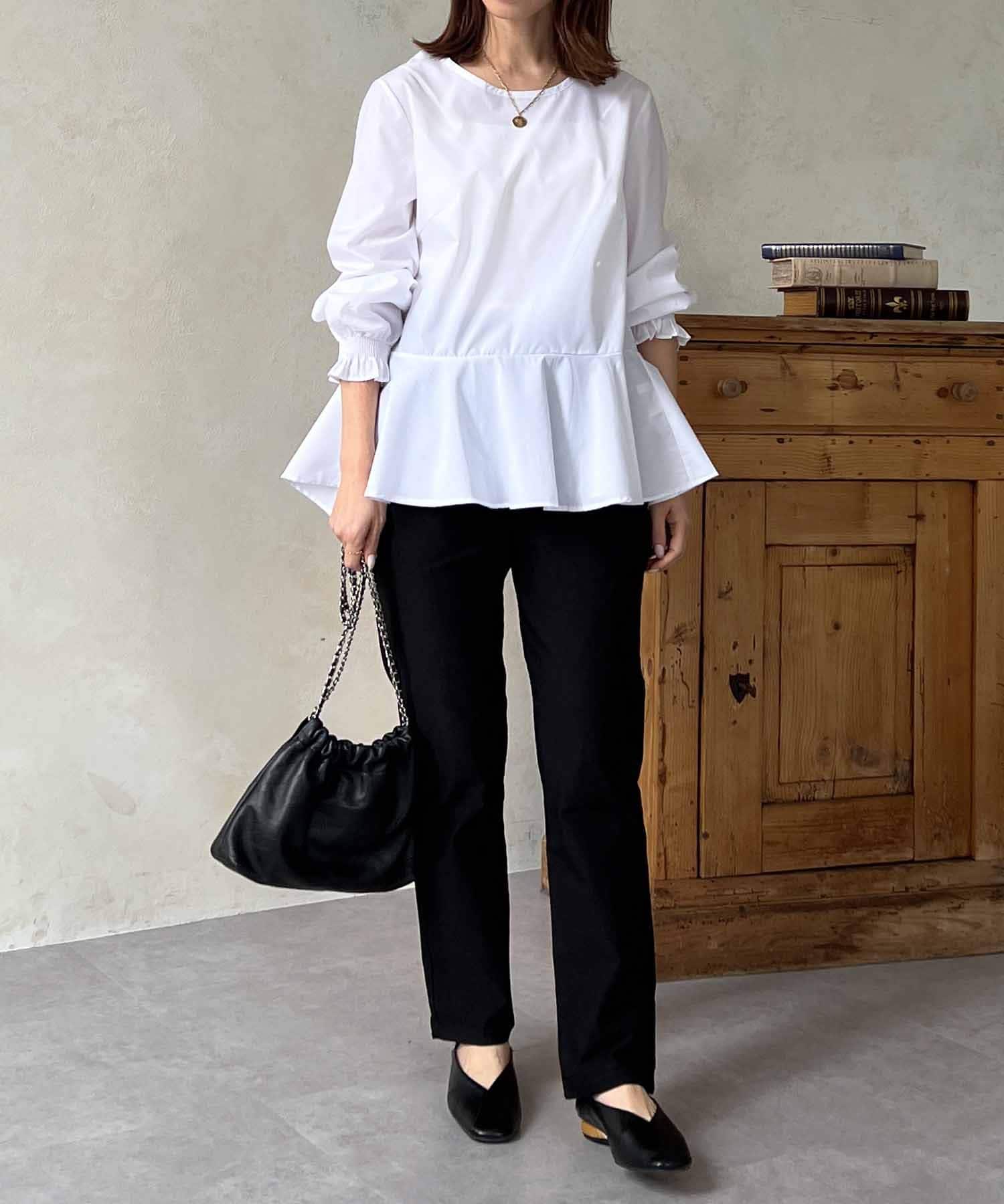 ブラウスは腰回りに被る長さのペプラムデザイン。さり気なく下半身カバーも叶う優秀デザインです。