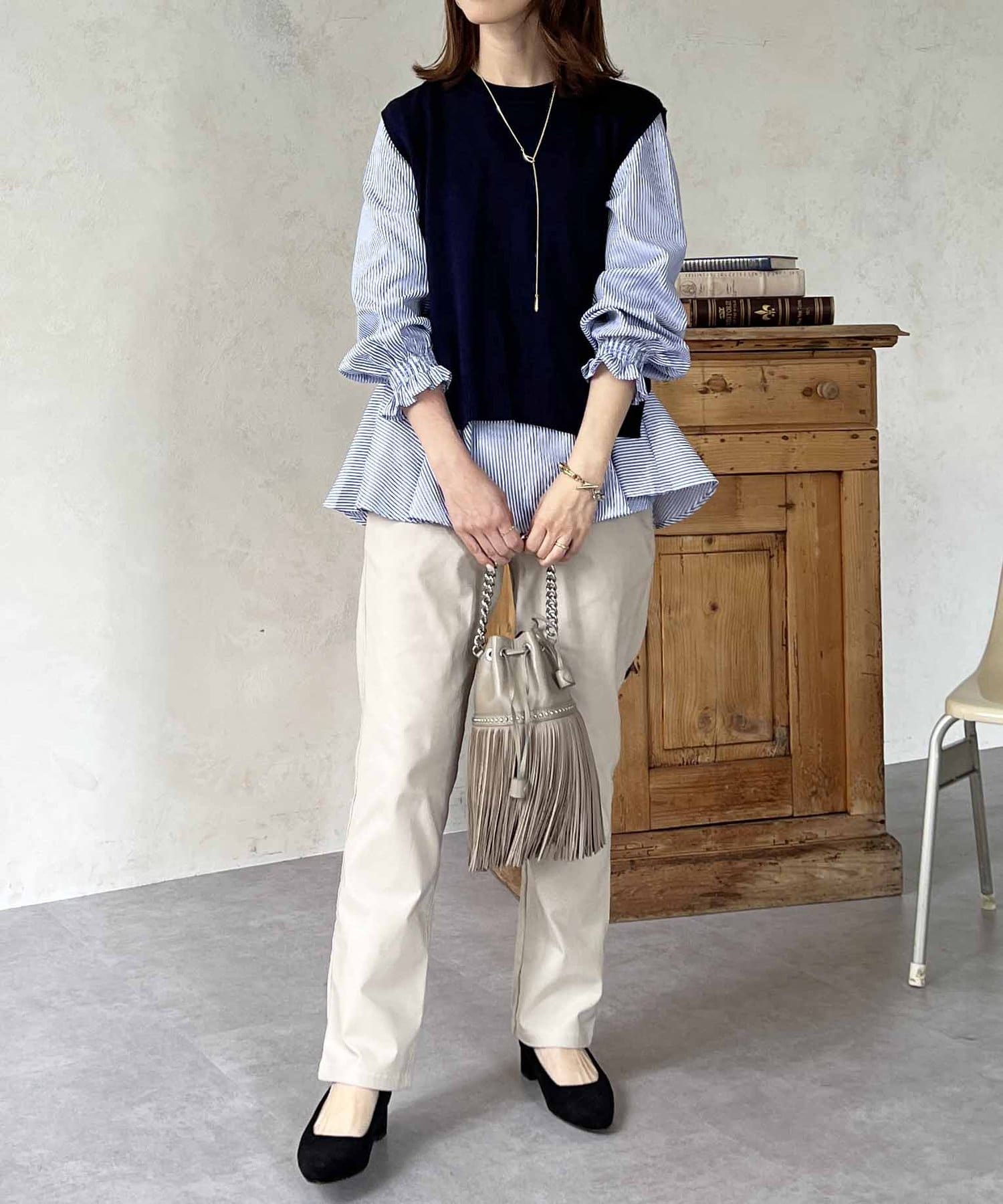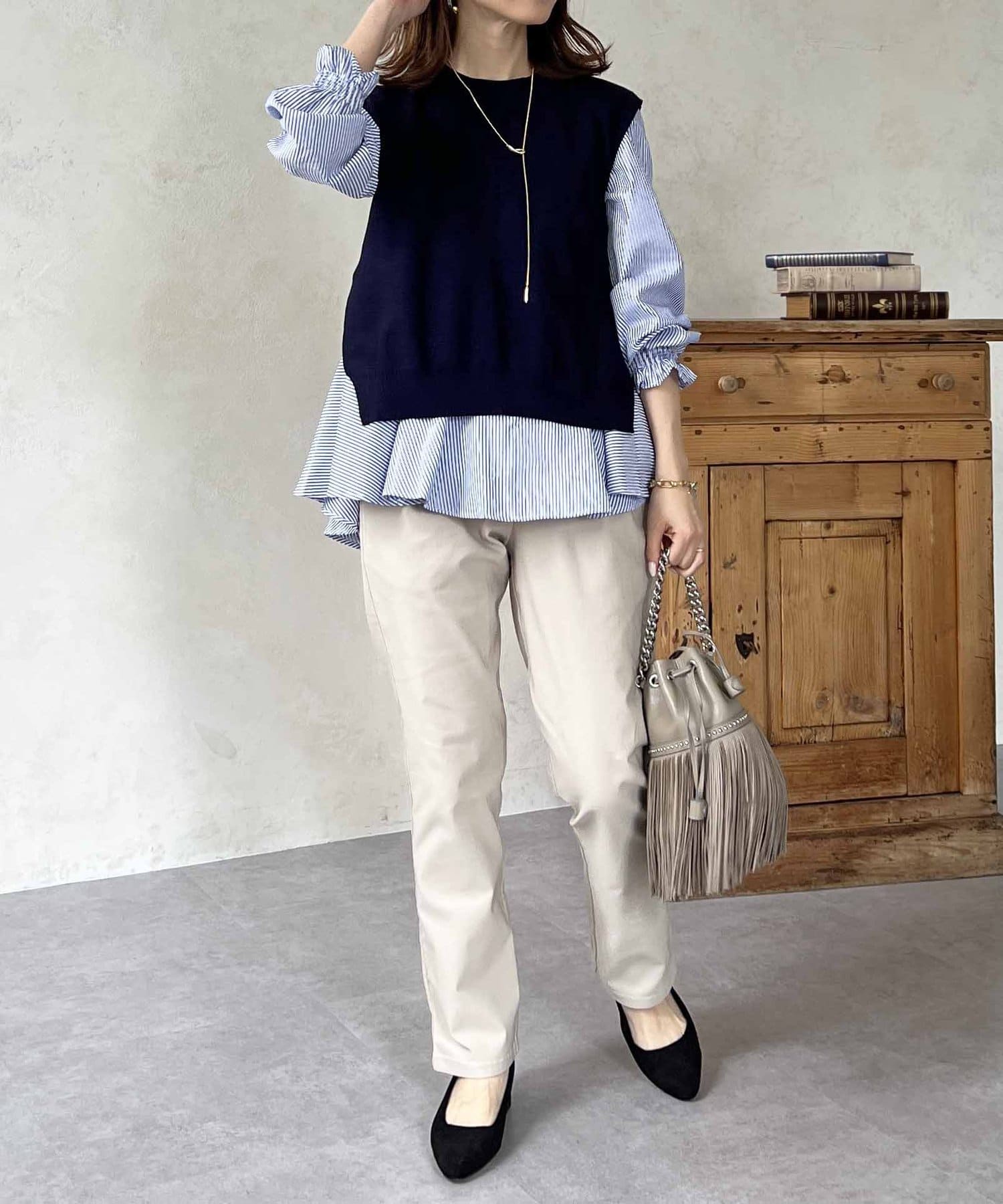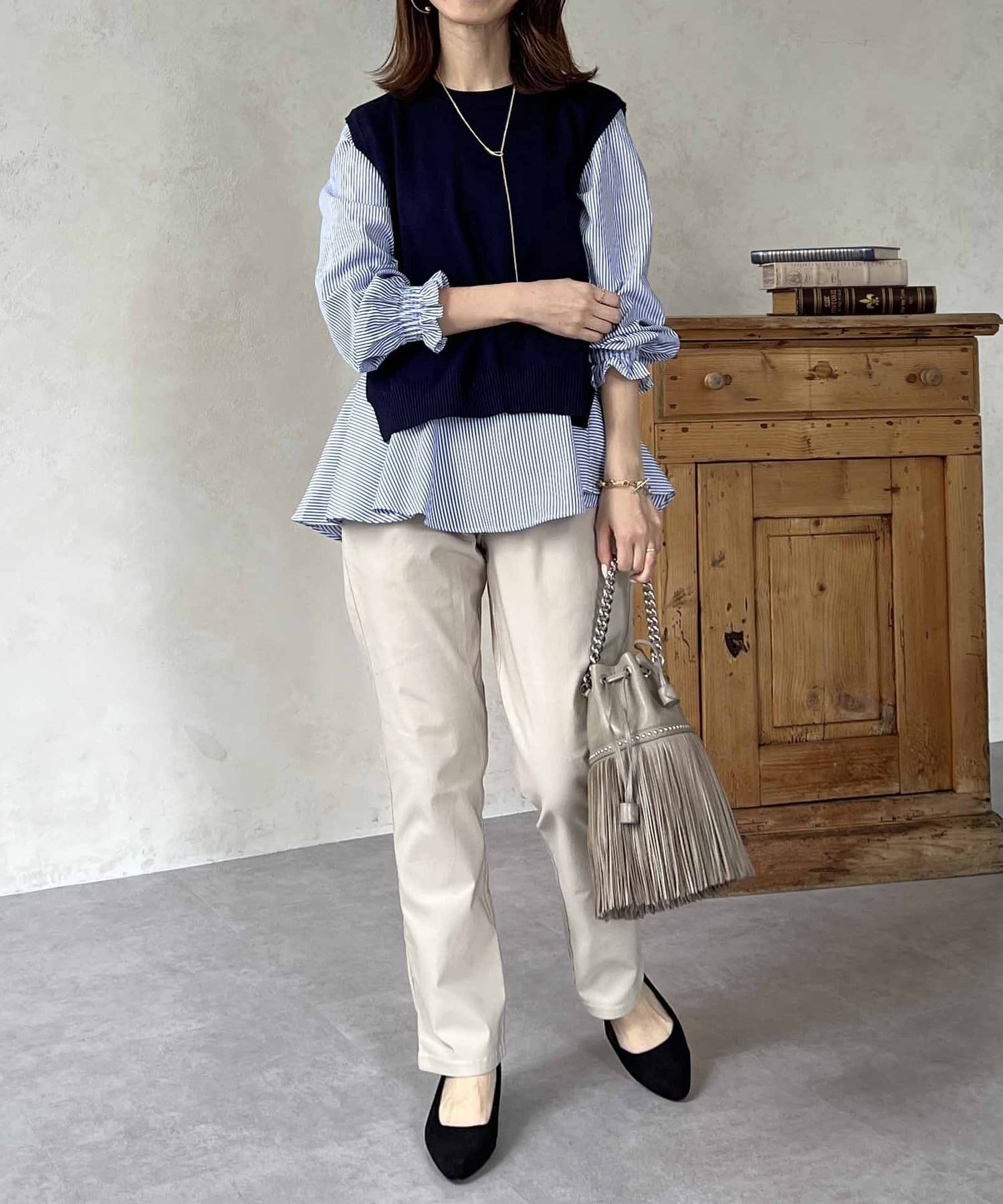 きれいめパンツで合わせてお仕事コーデにもおすすめです!