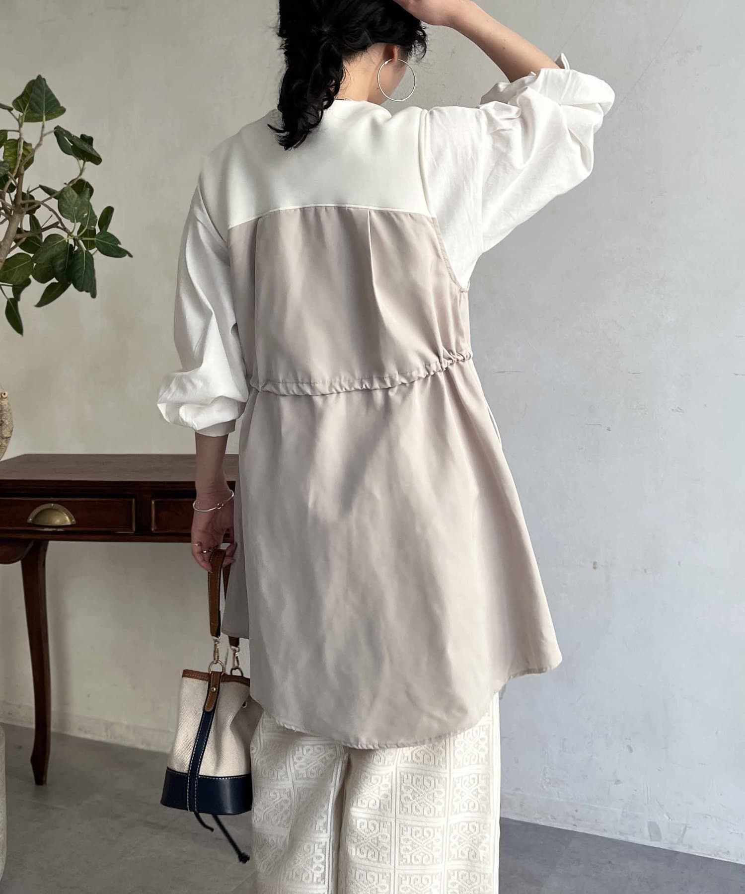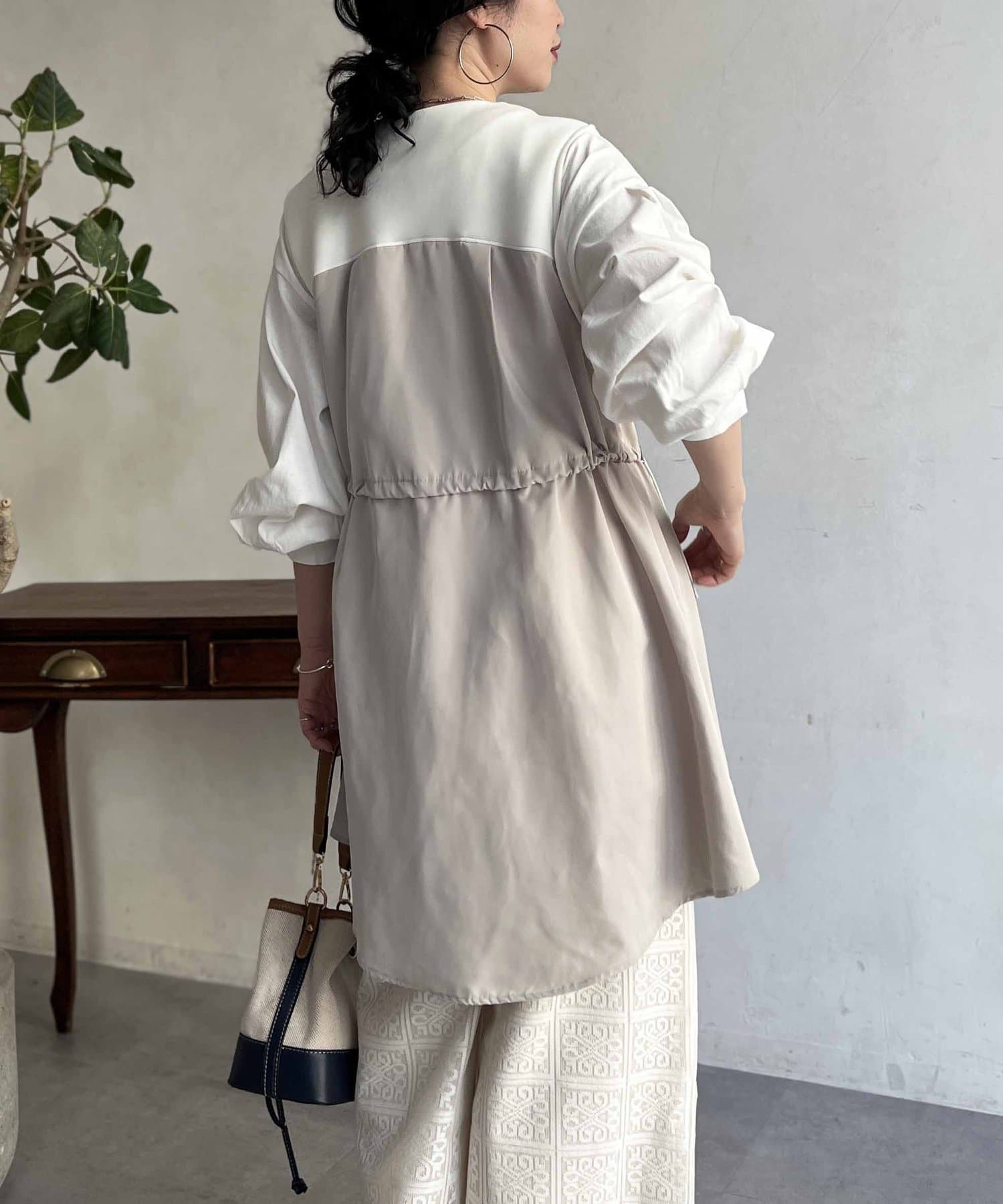 後ろと前が異素材で切り替えになっていたり、ドロストで絞れたりと、これ1枚着るだけで、凄くおしゃれに見えるアイテムだと思います。