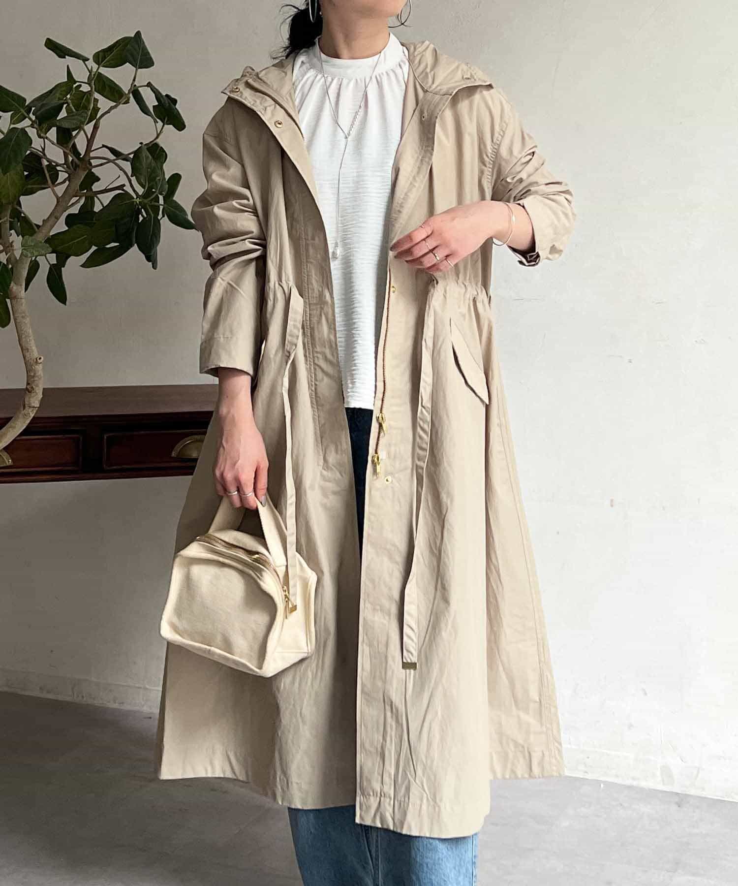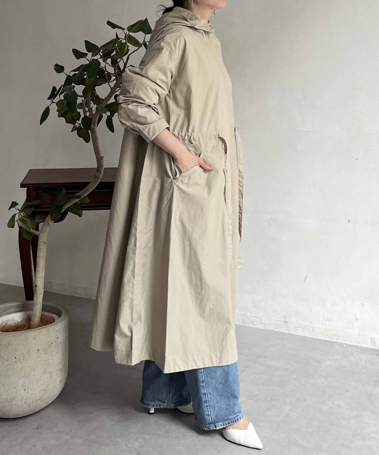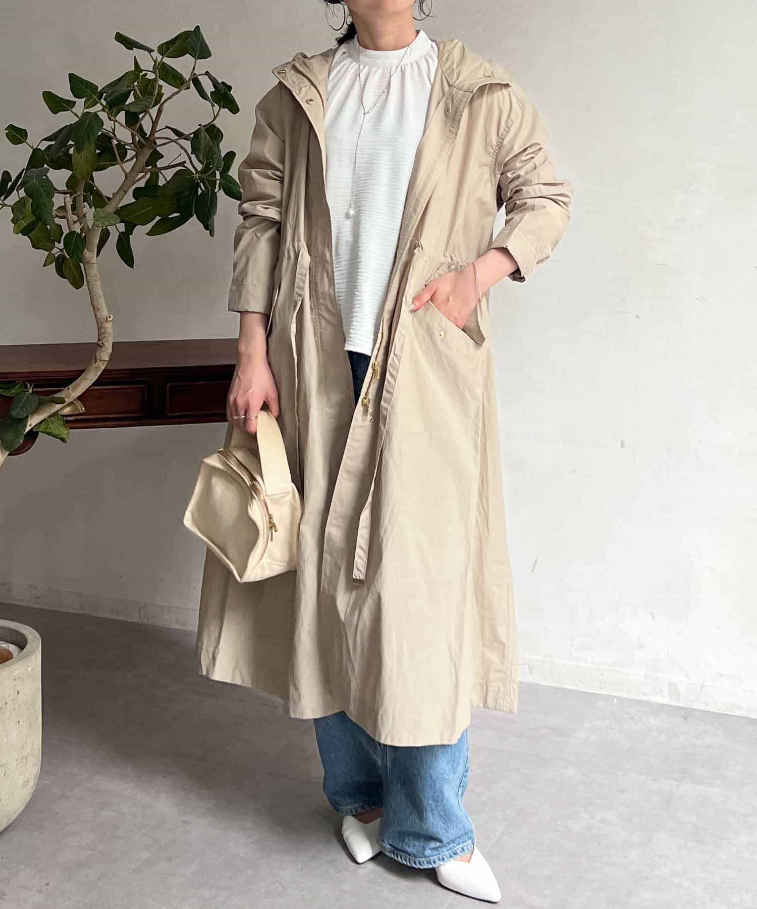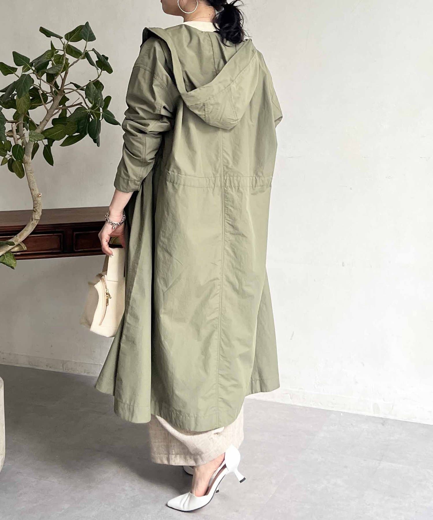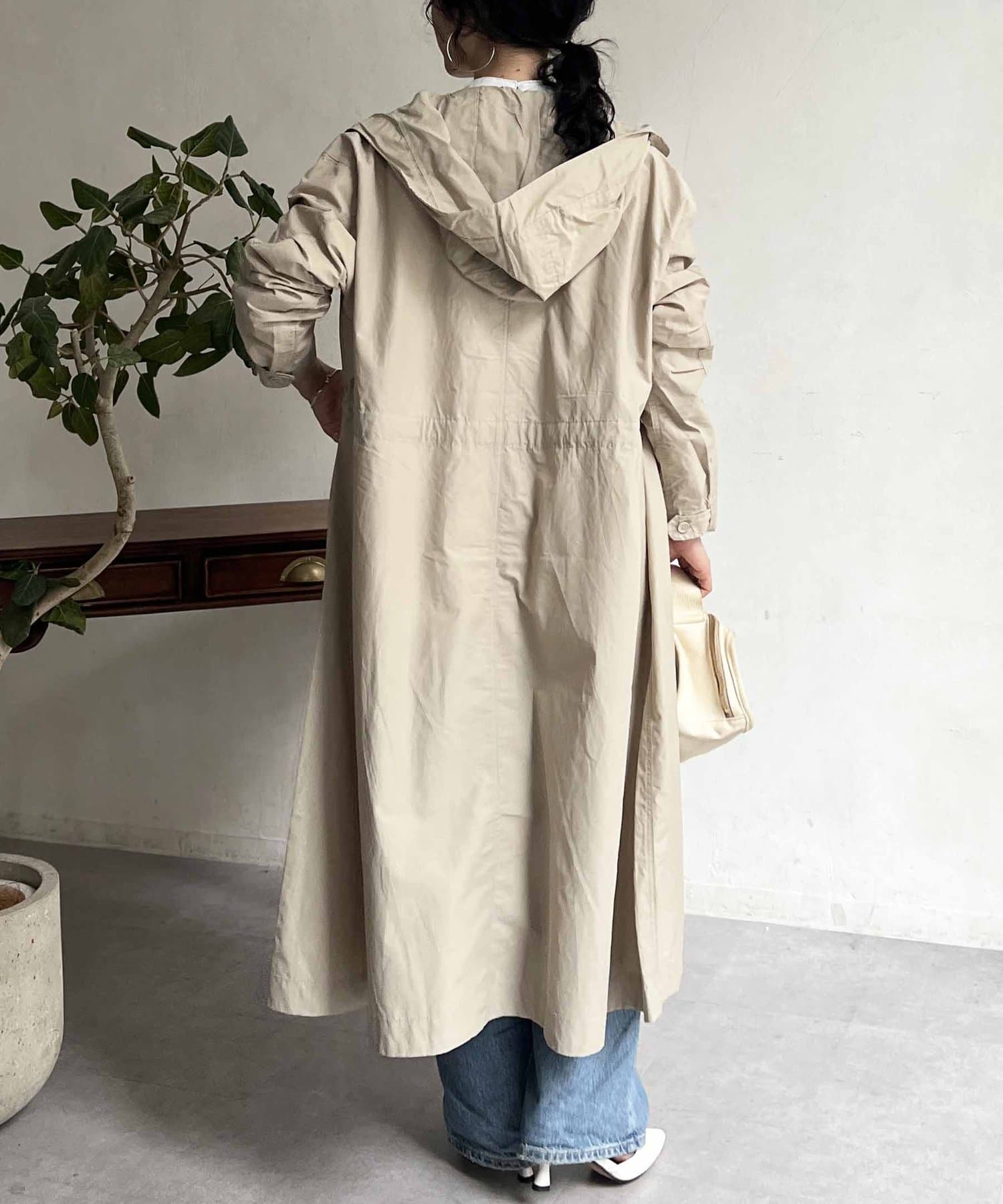 フード付きでカジュアル見えしますが、Aラインシルエットで上品見えも叶う1枚。