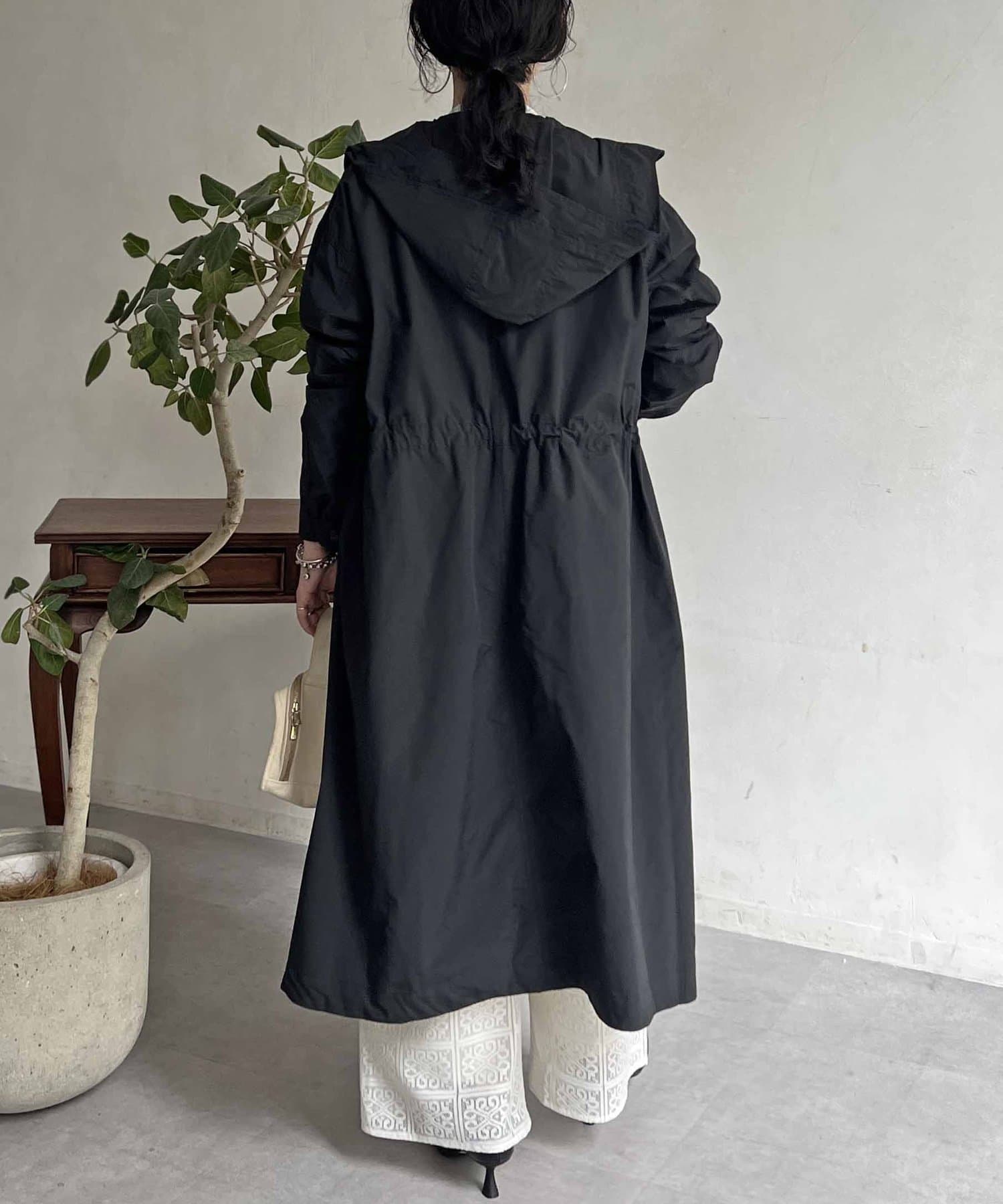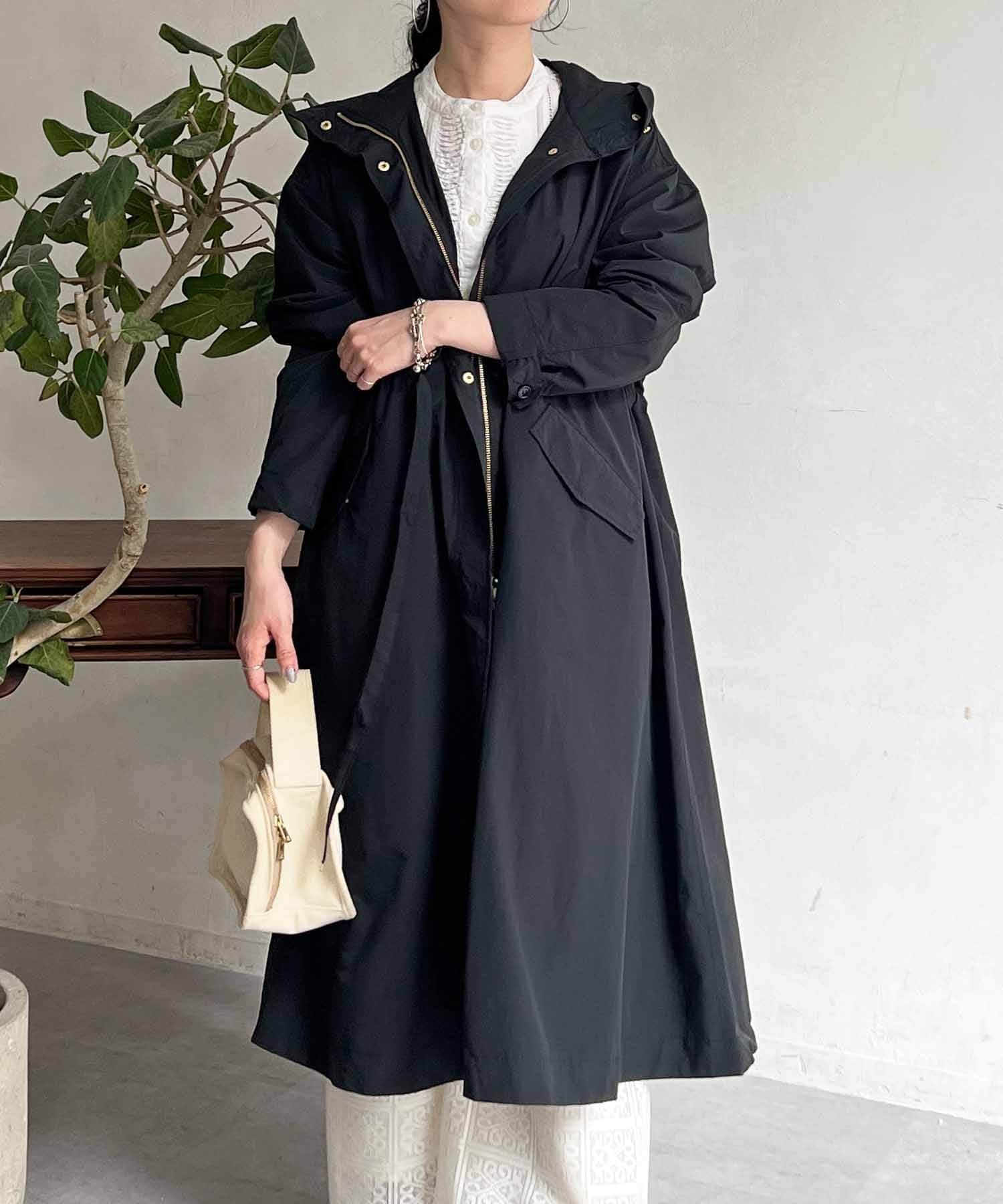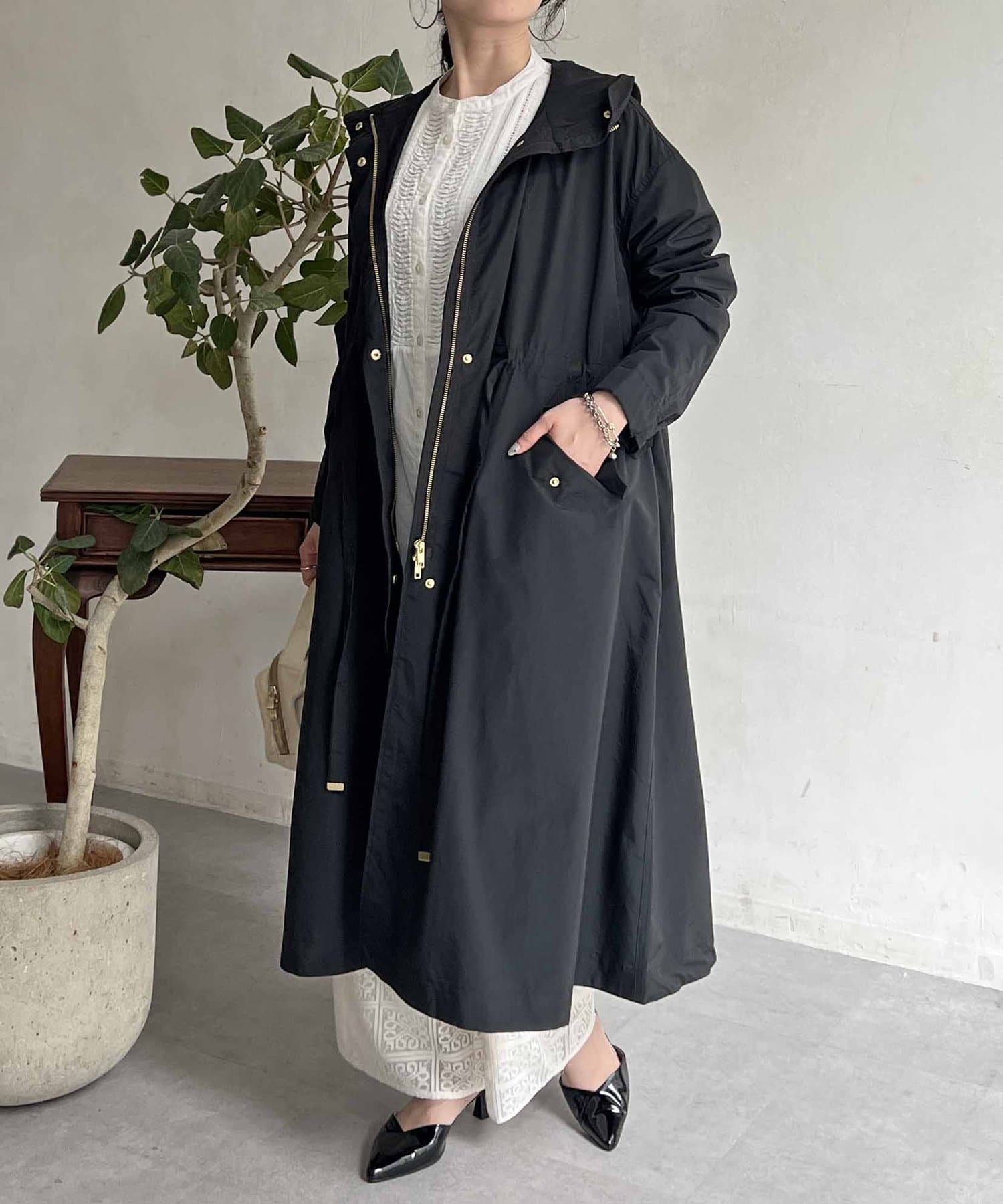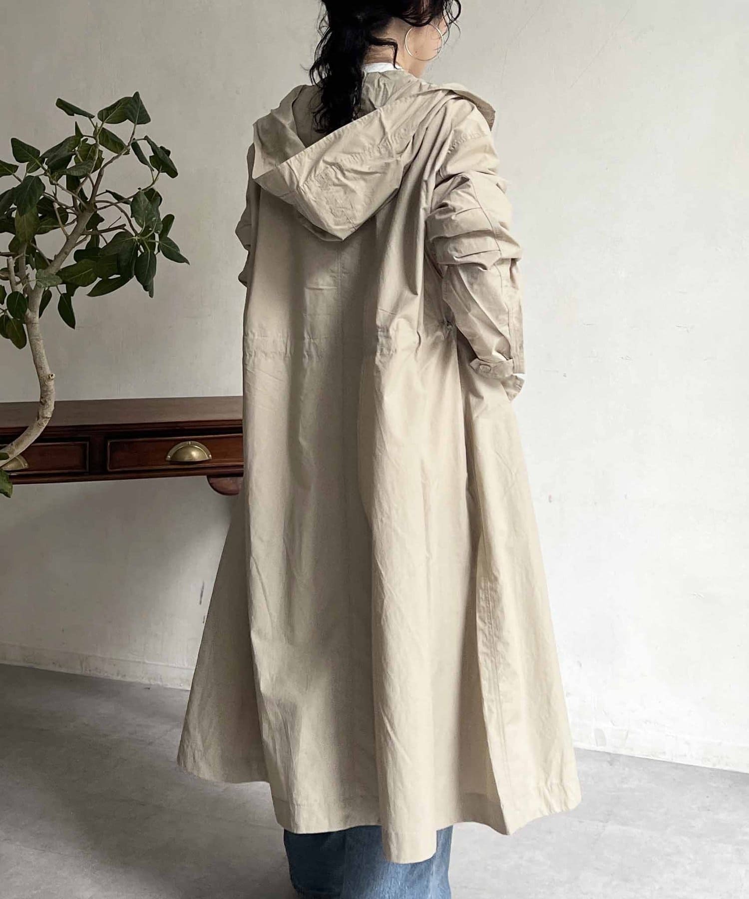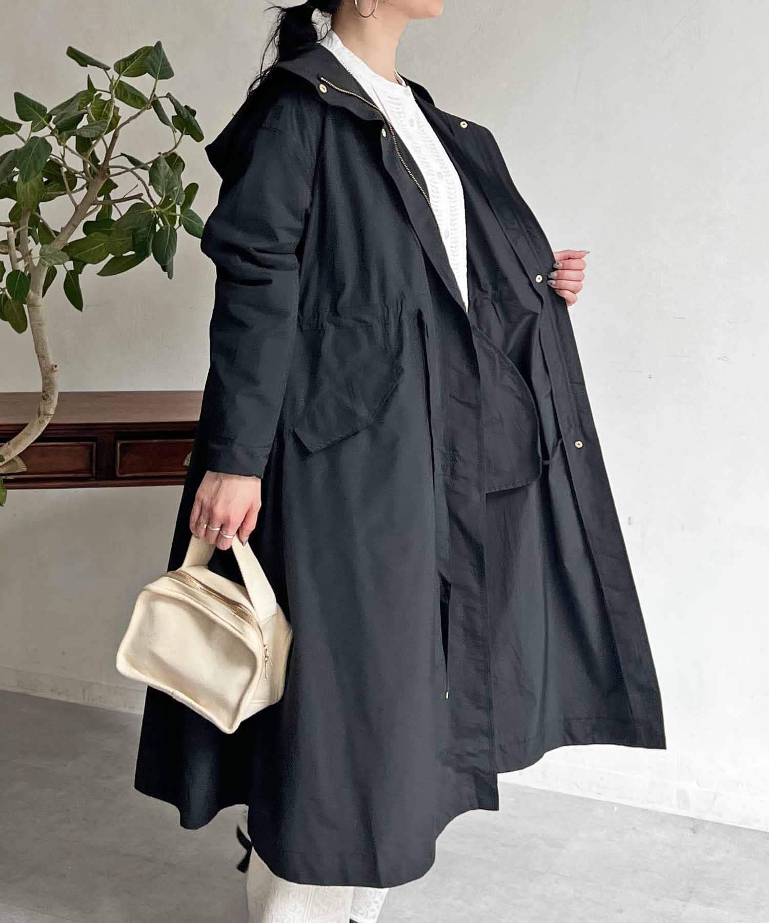 フード付きでカジュアル見えしますが、Aラインシルエットで上品見えも叶う1枚。