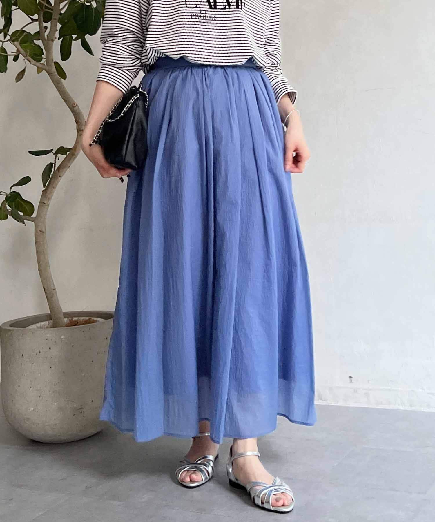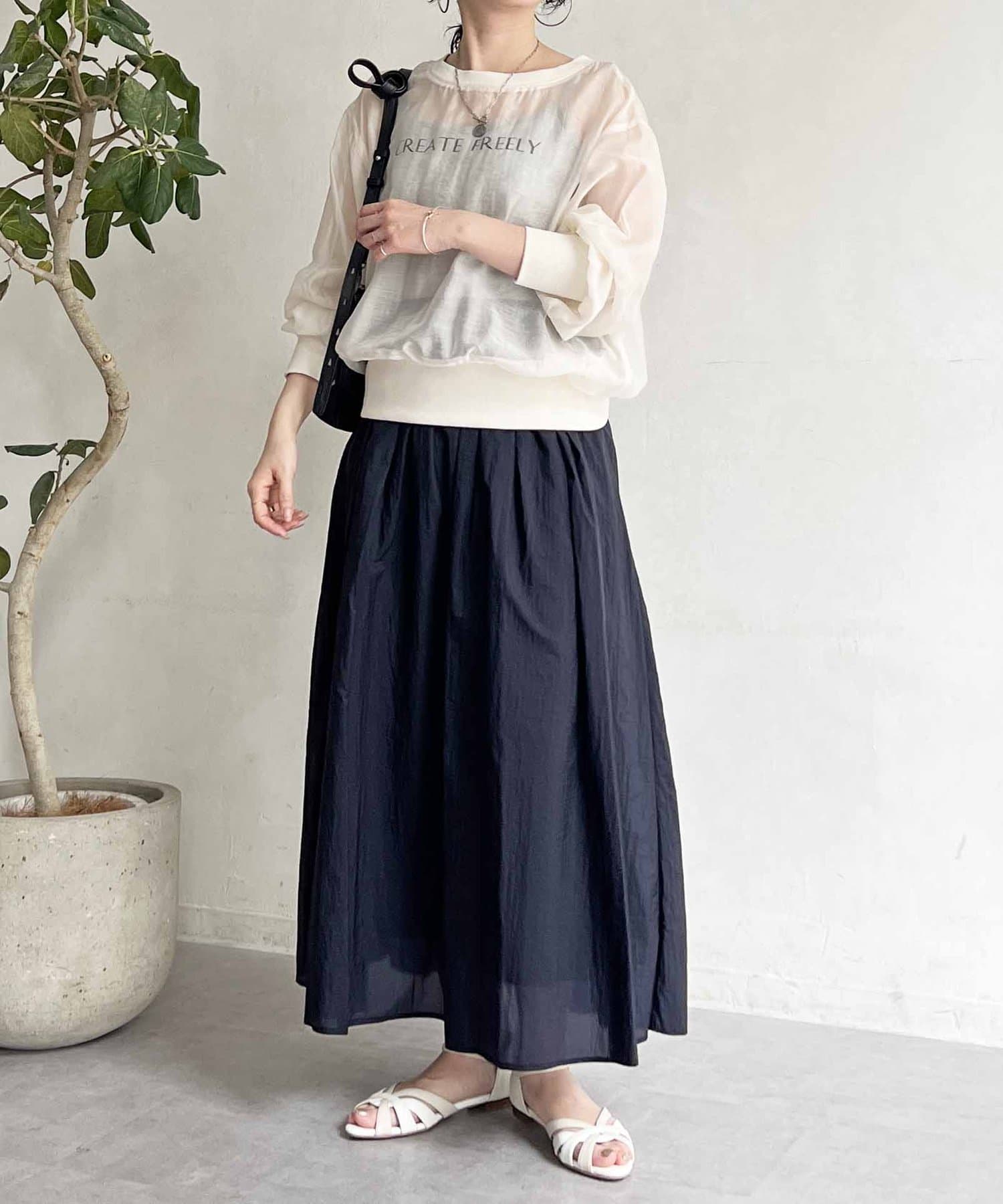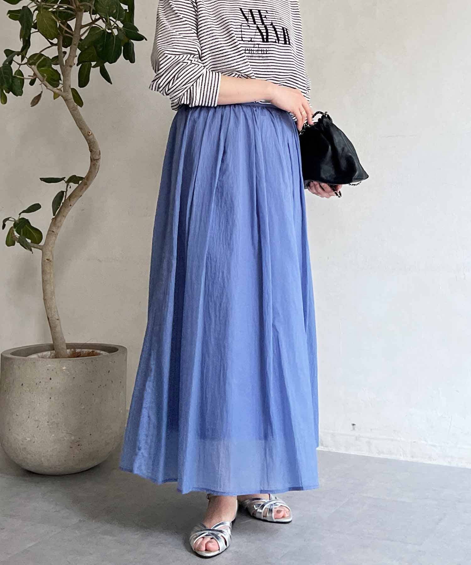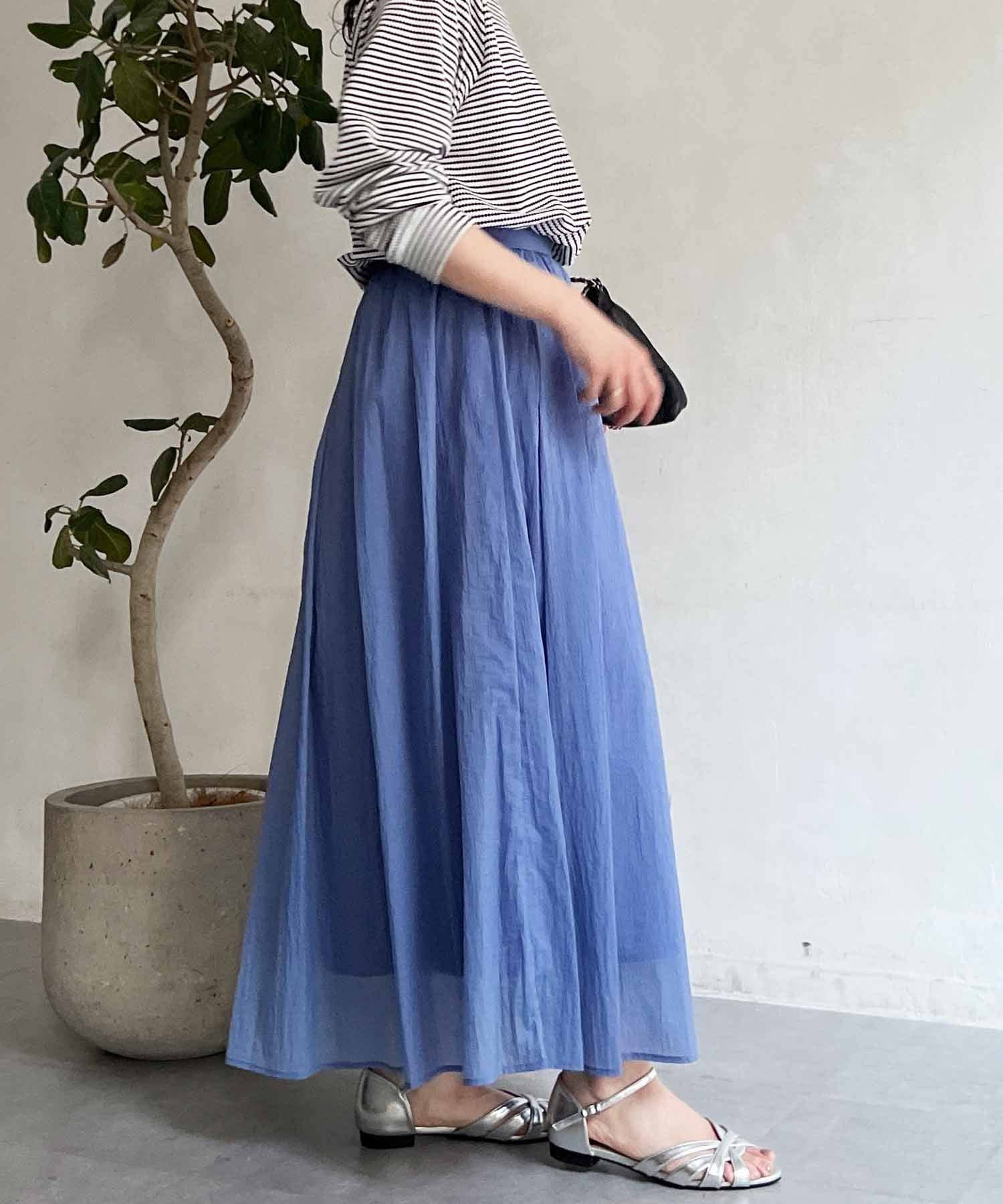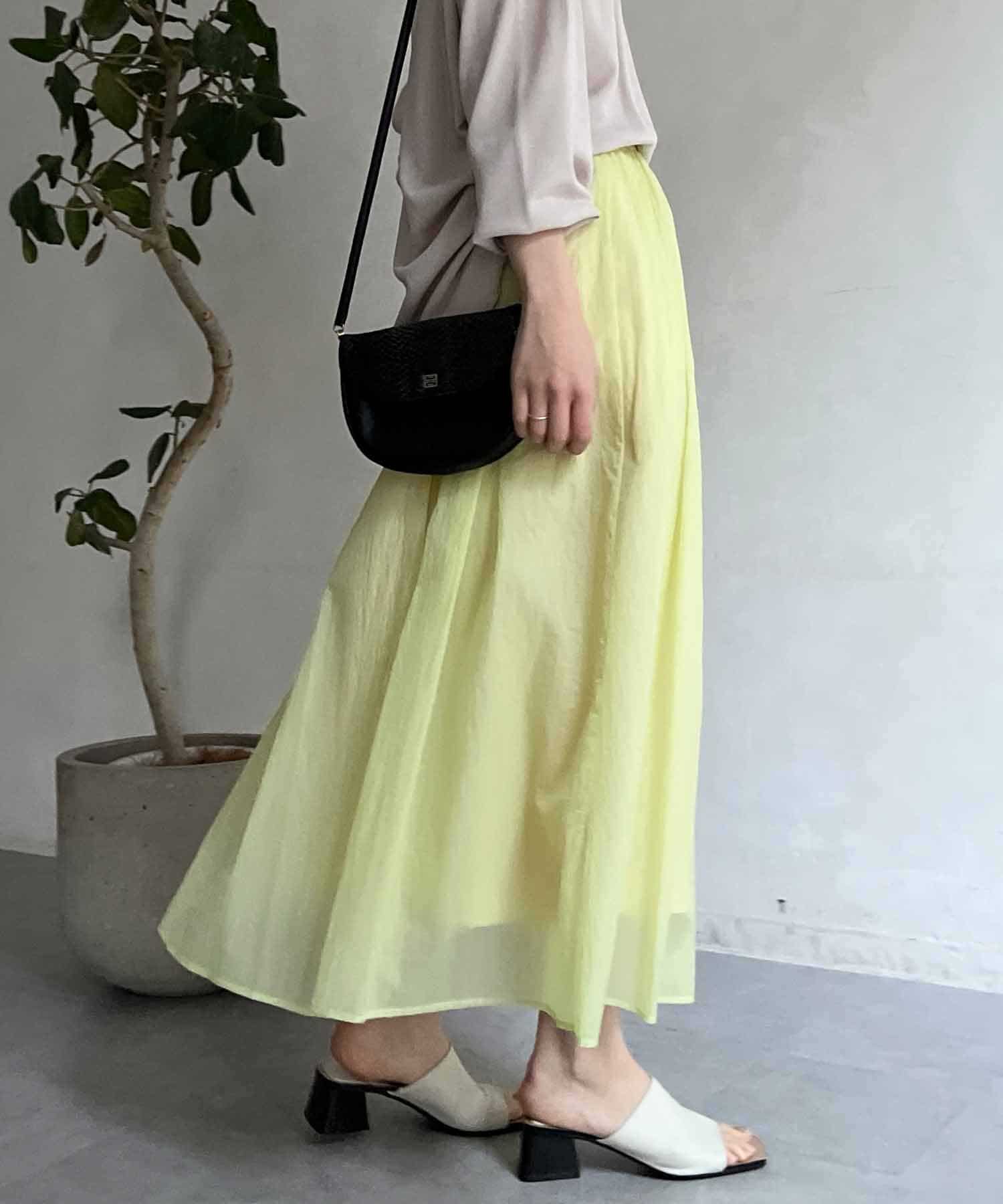 軽やかな品のある透け感とギャザー入りでたっぷりのボリューム感がポイントのフレアスカート。