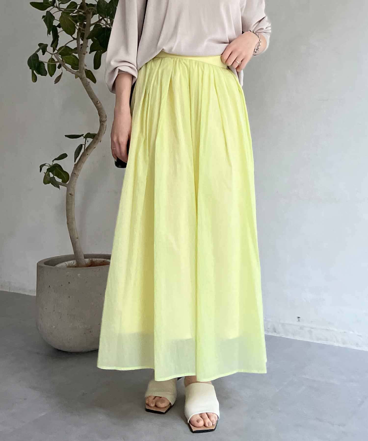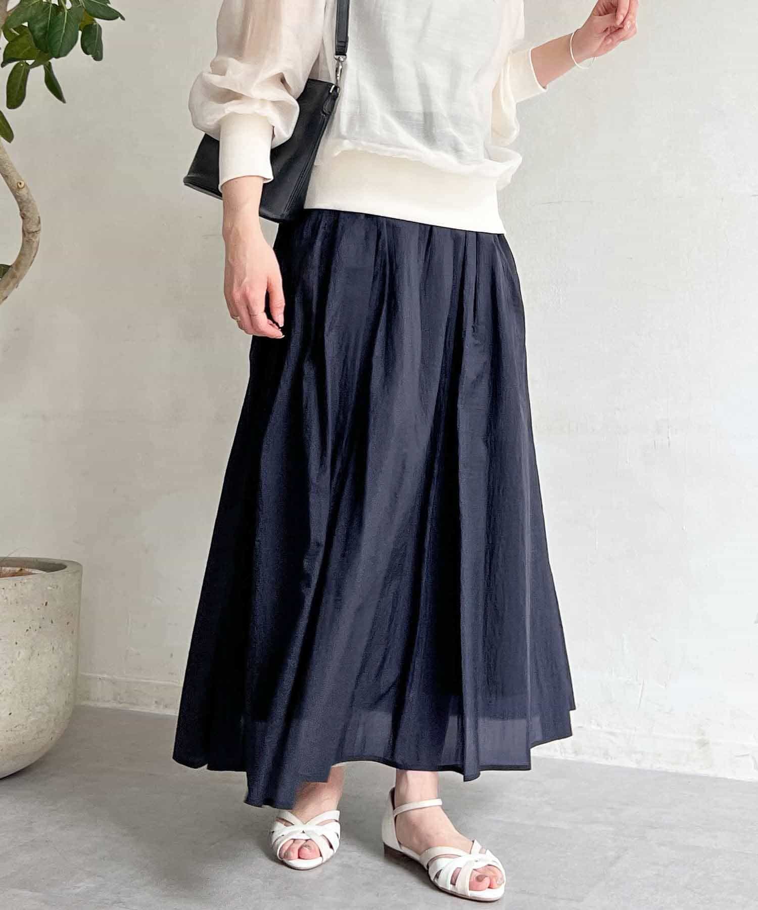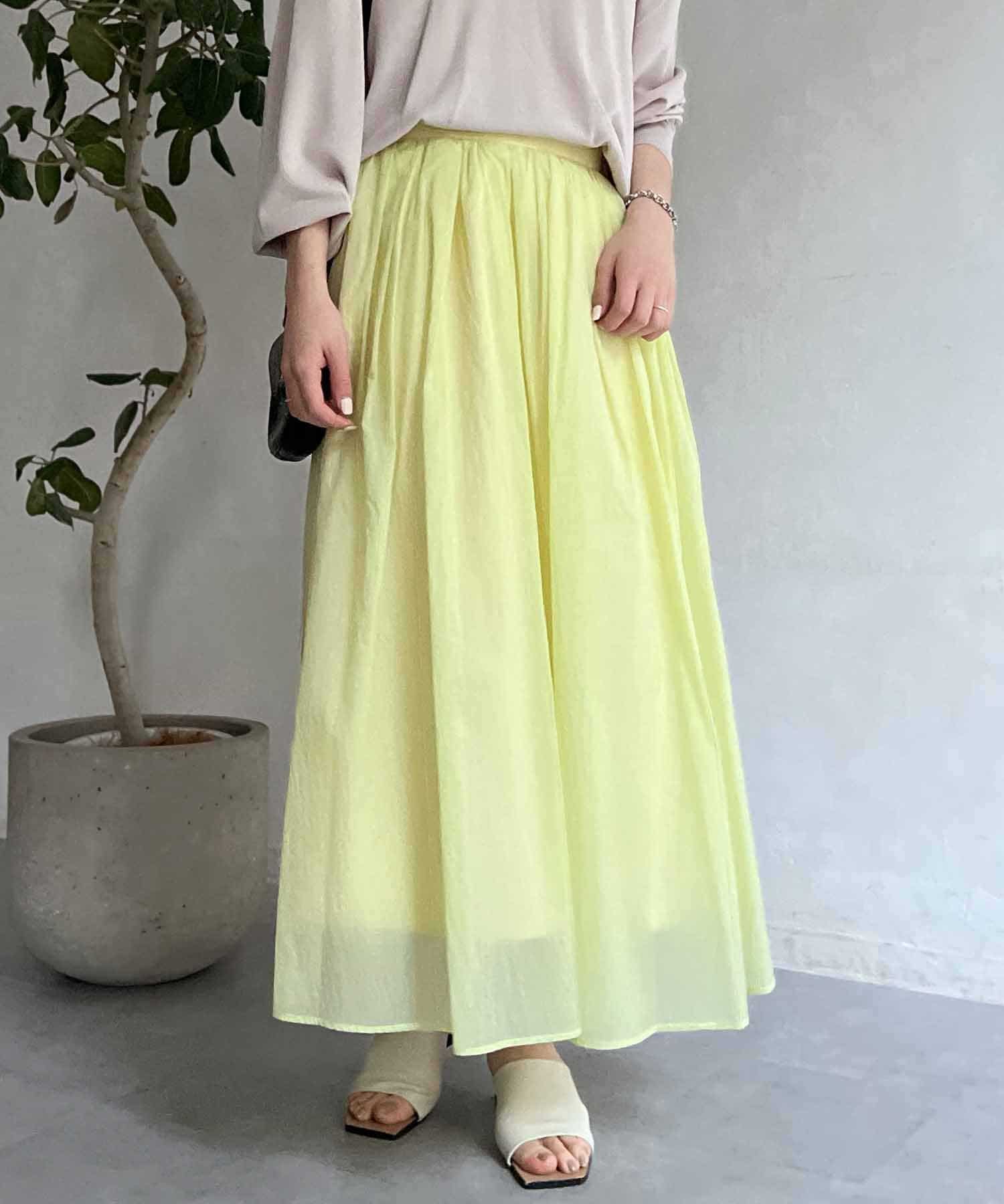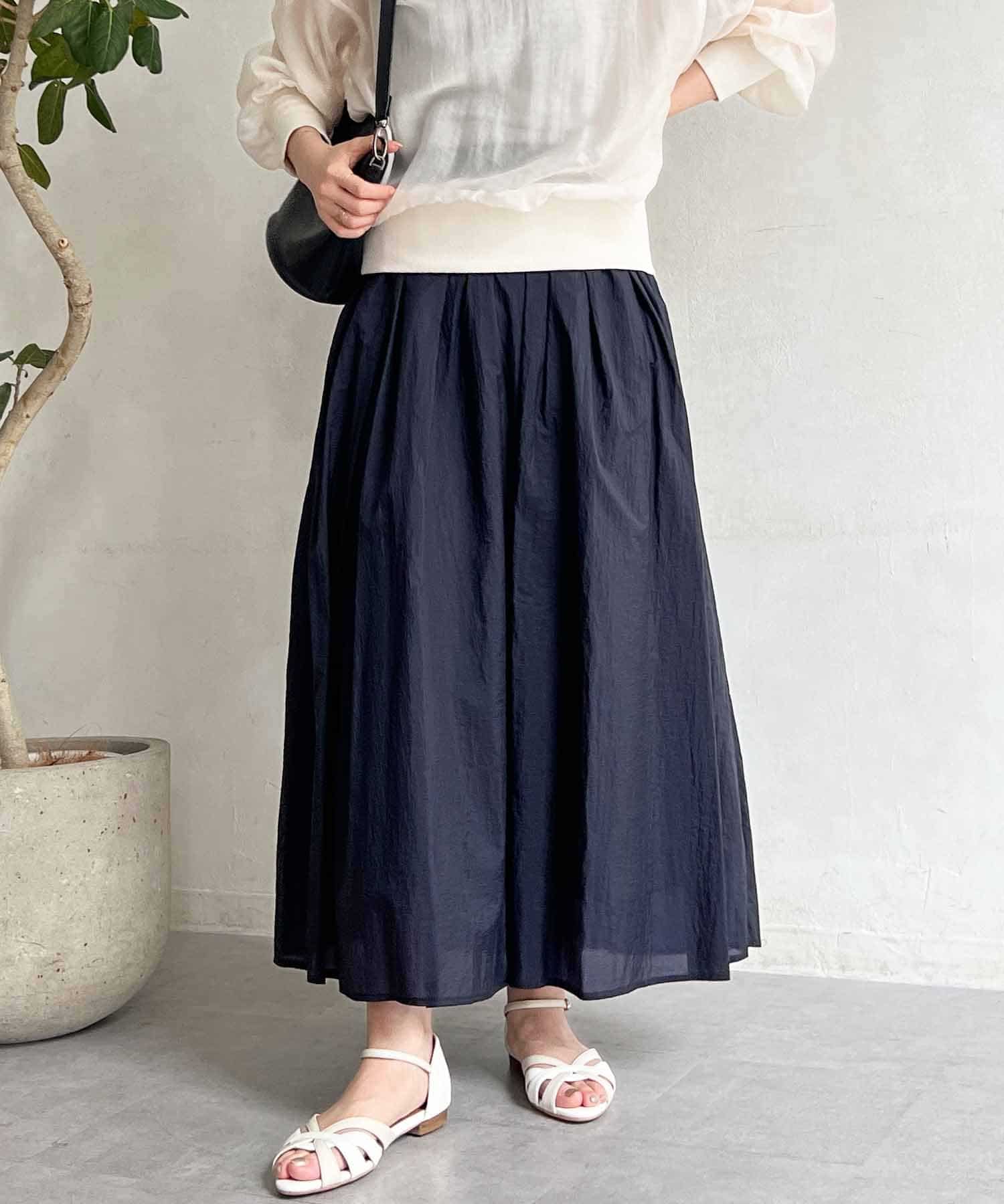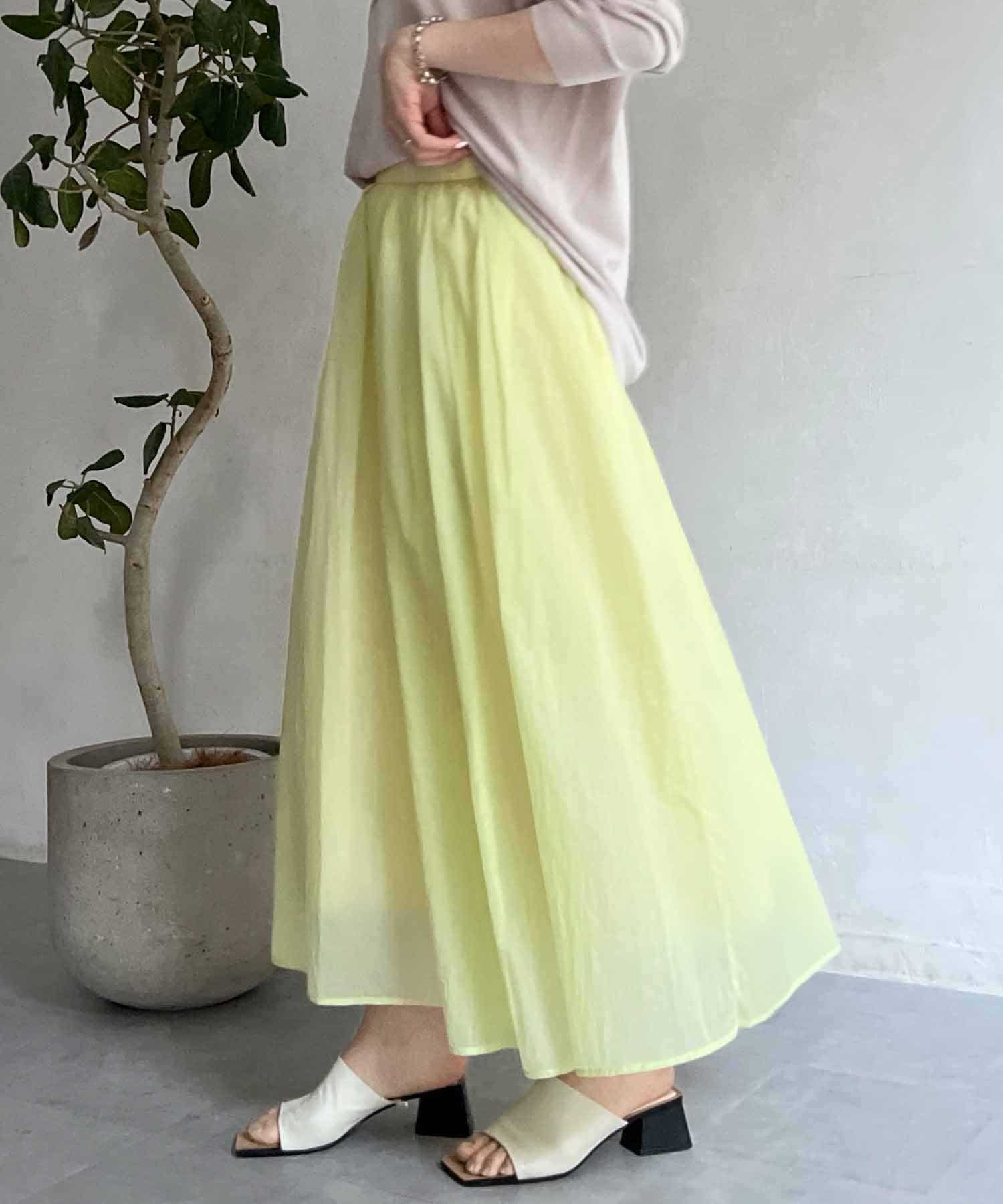 軽やかな品のある透け感とギャザー入りでたっぷりのボリューム感がポイントのフレアスカート。