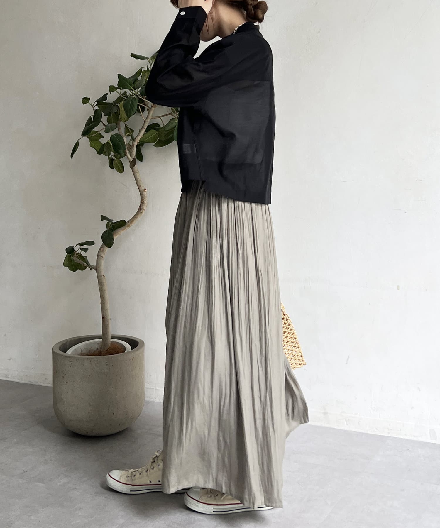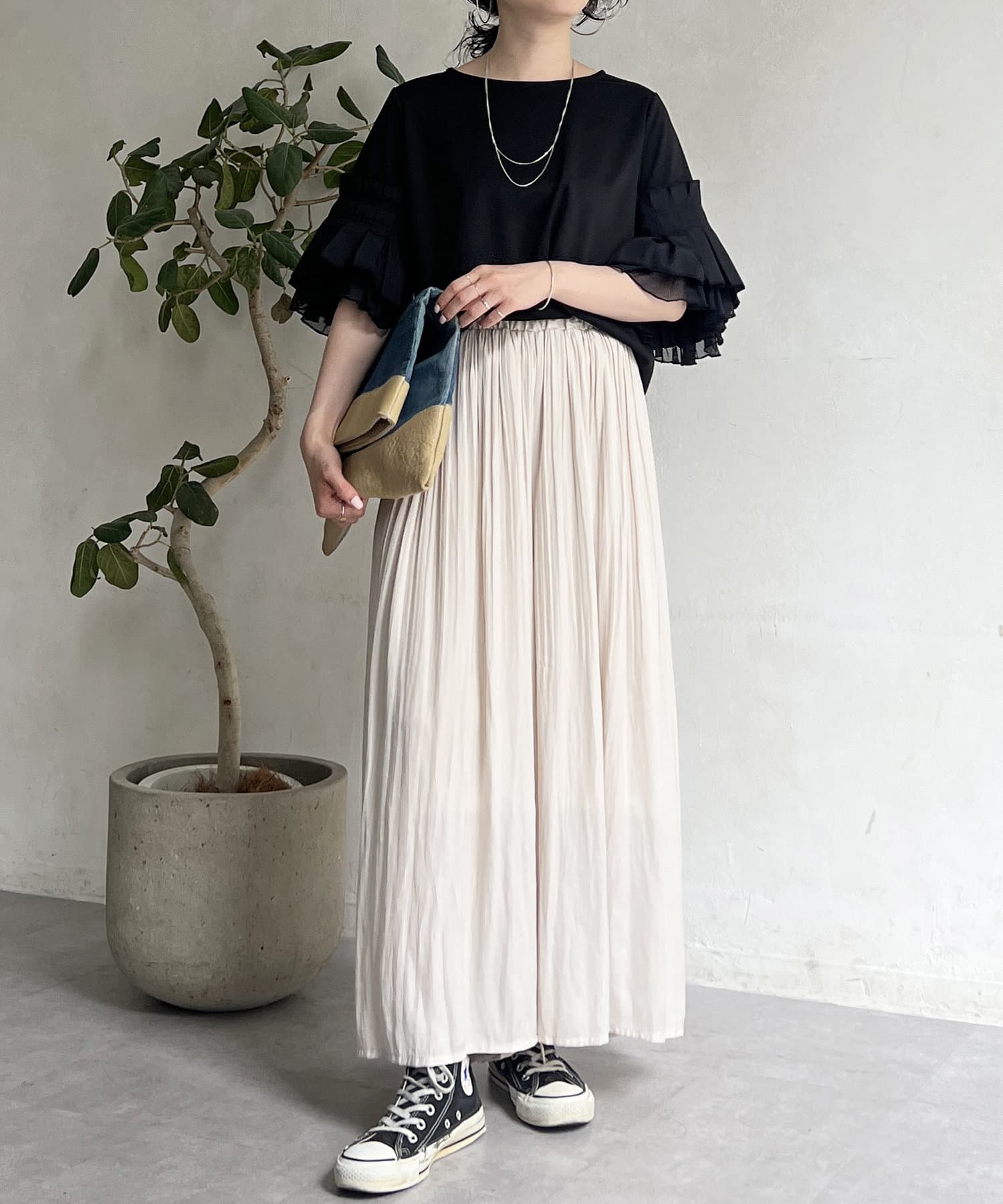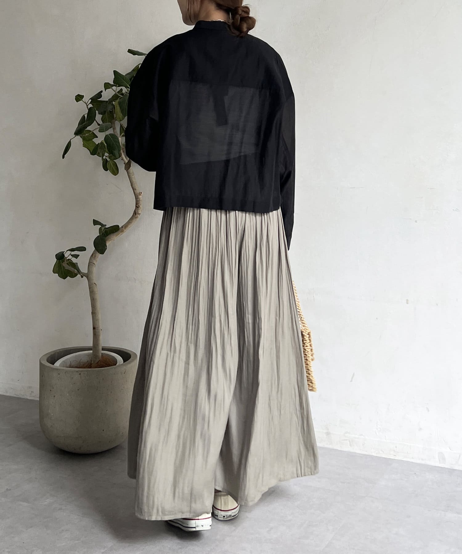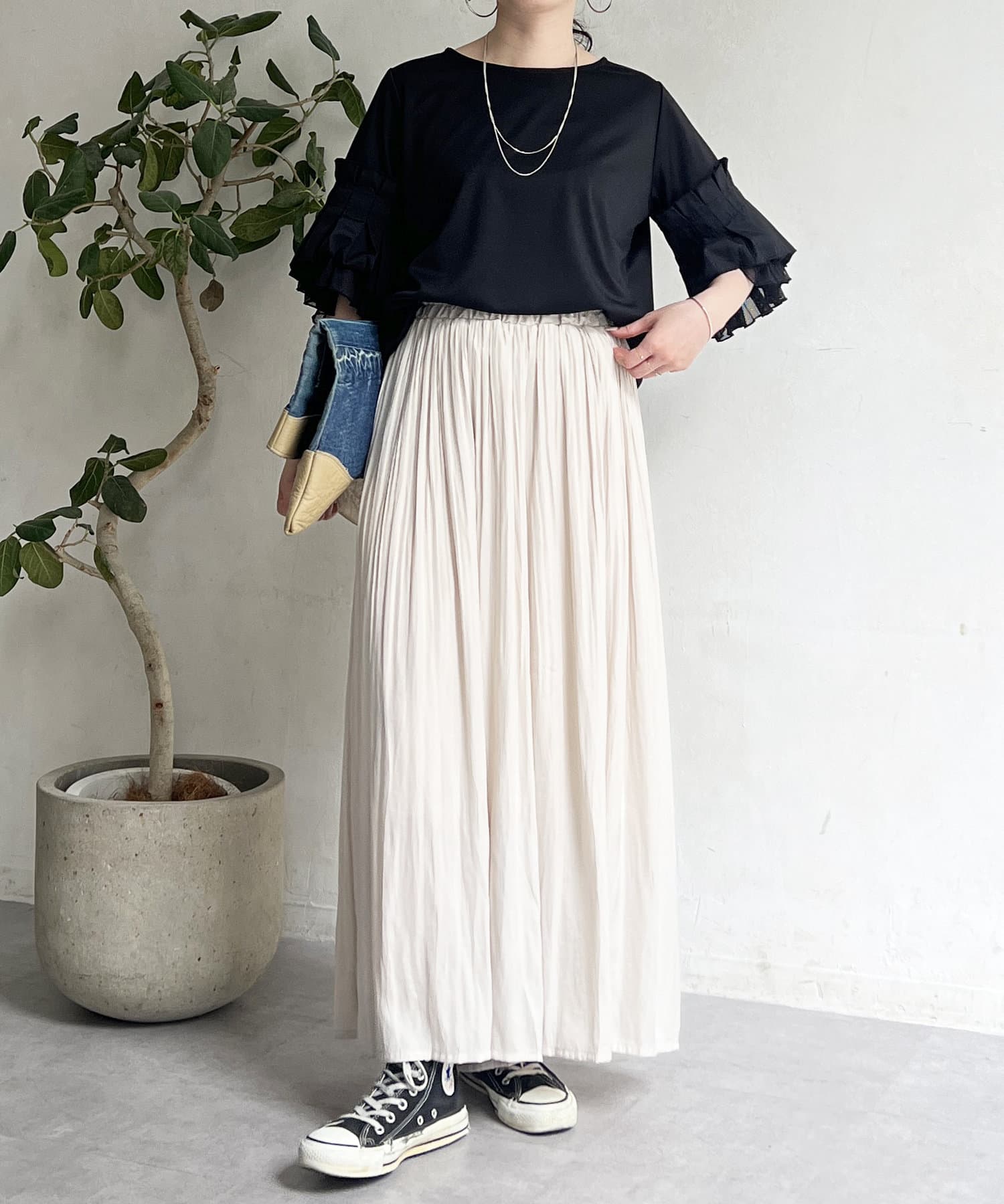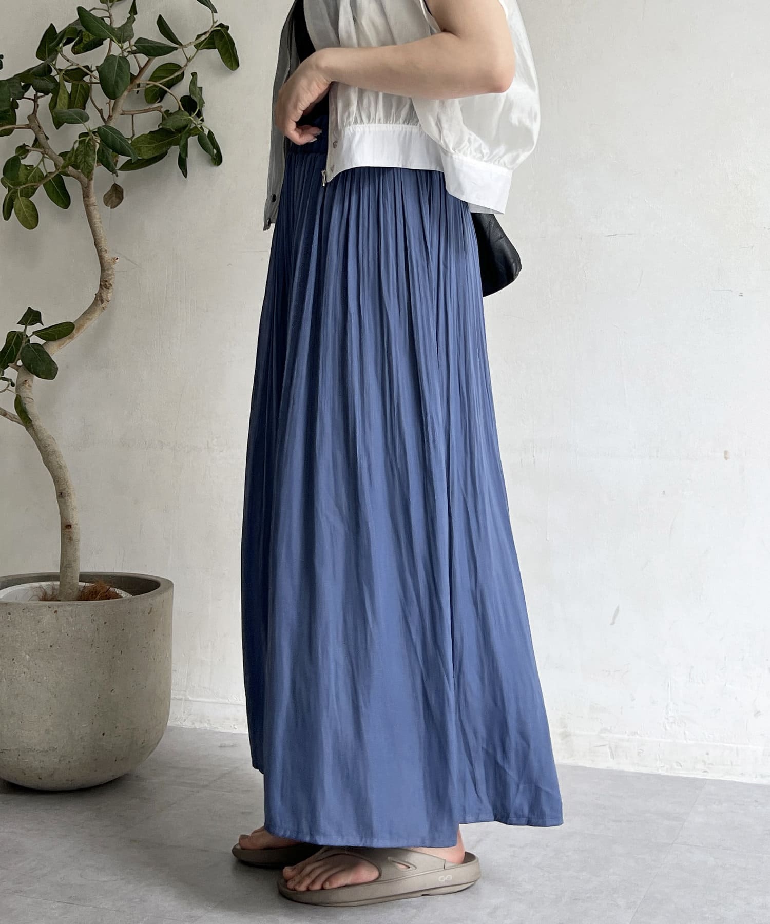 ゆったりとしたプリーツスカートに見えますが、実はワイドシルエットのロングパンツ!