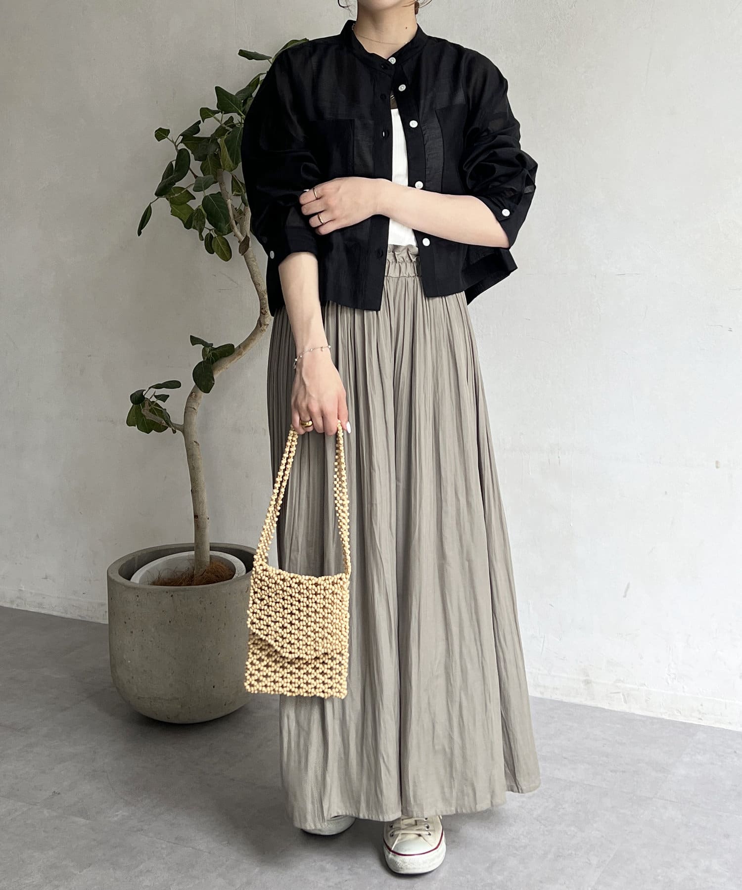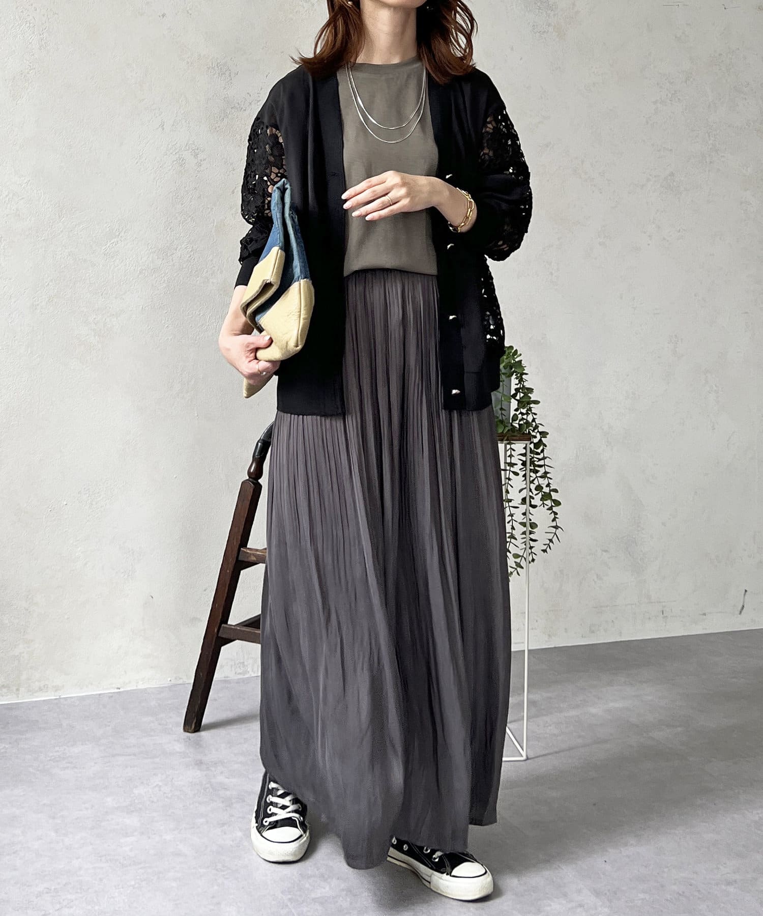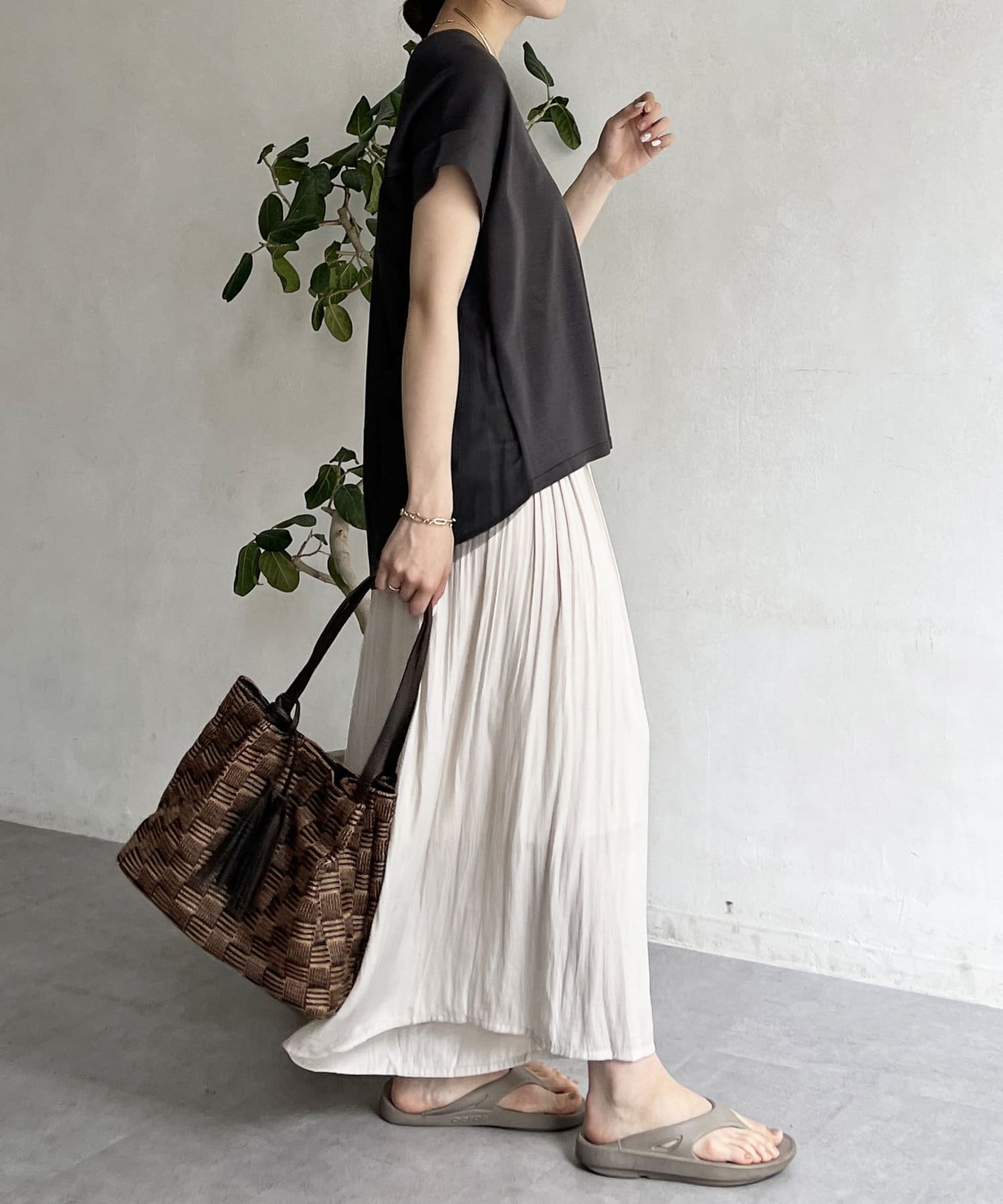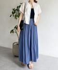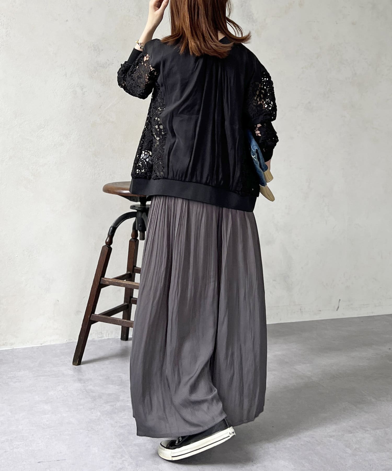 ゆったりとしたプリーツスカートに見えますが、実はワイドシルエットのロングパンツ!