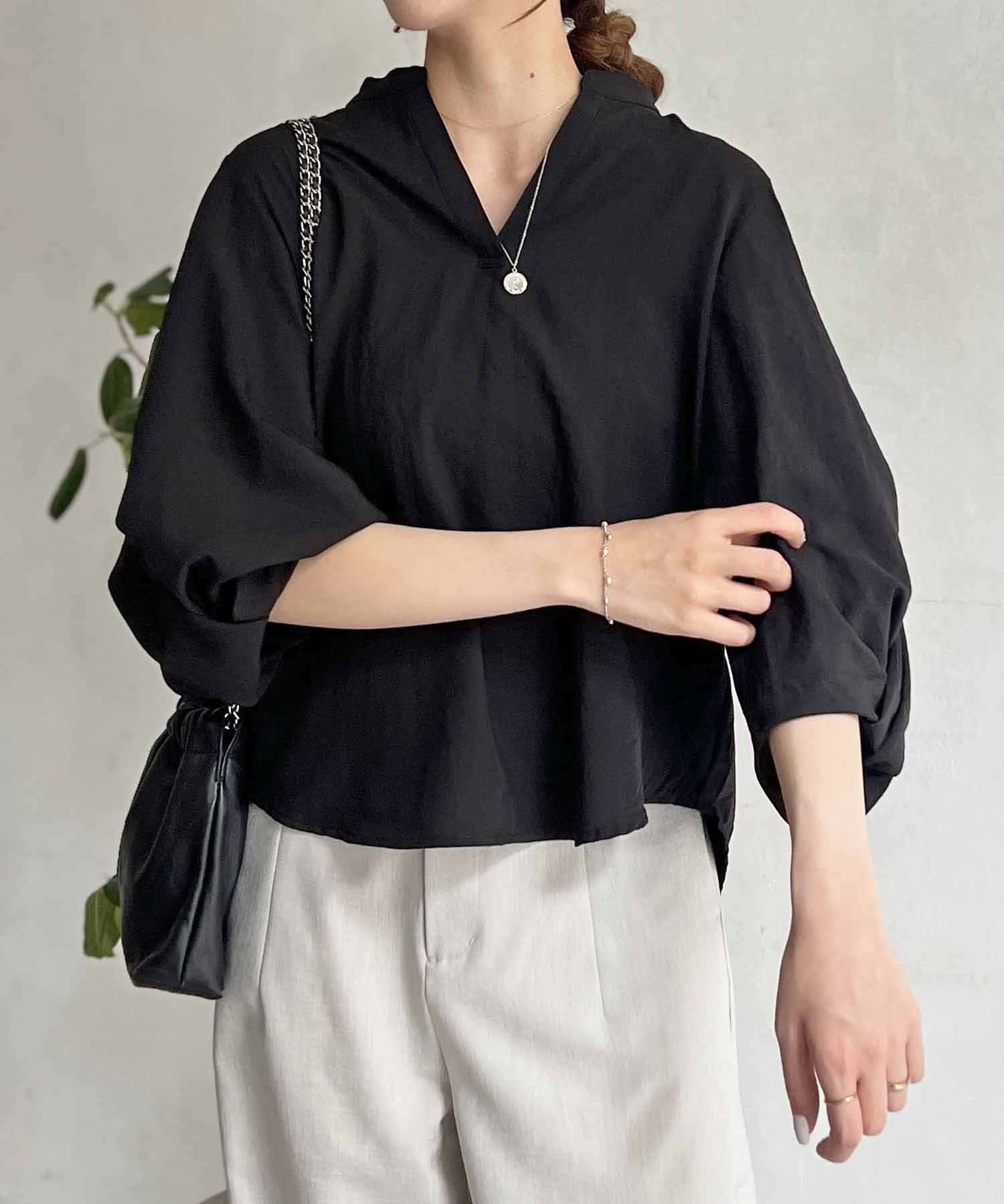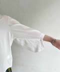 袖周りはギャザーではなくタックでボリューム感を出しているので、甘くなりすぎず大人っぽい雰囲気で着ていただけます。