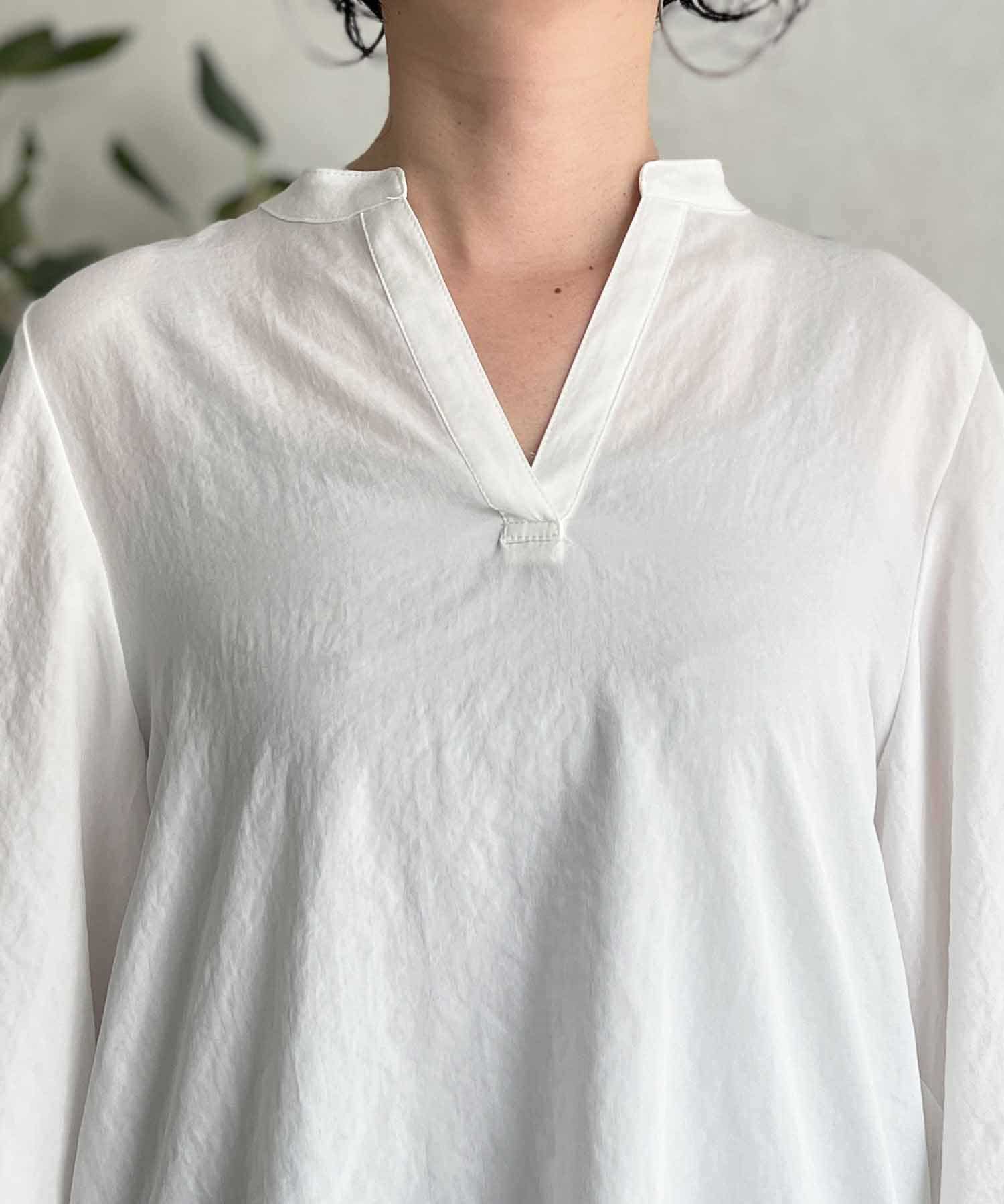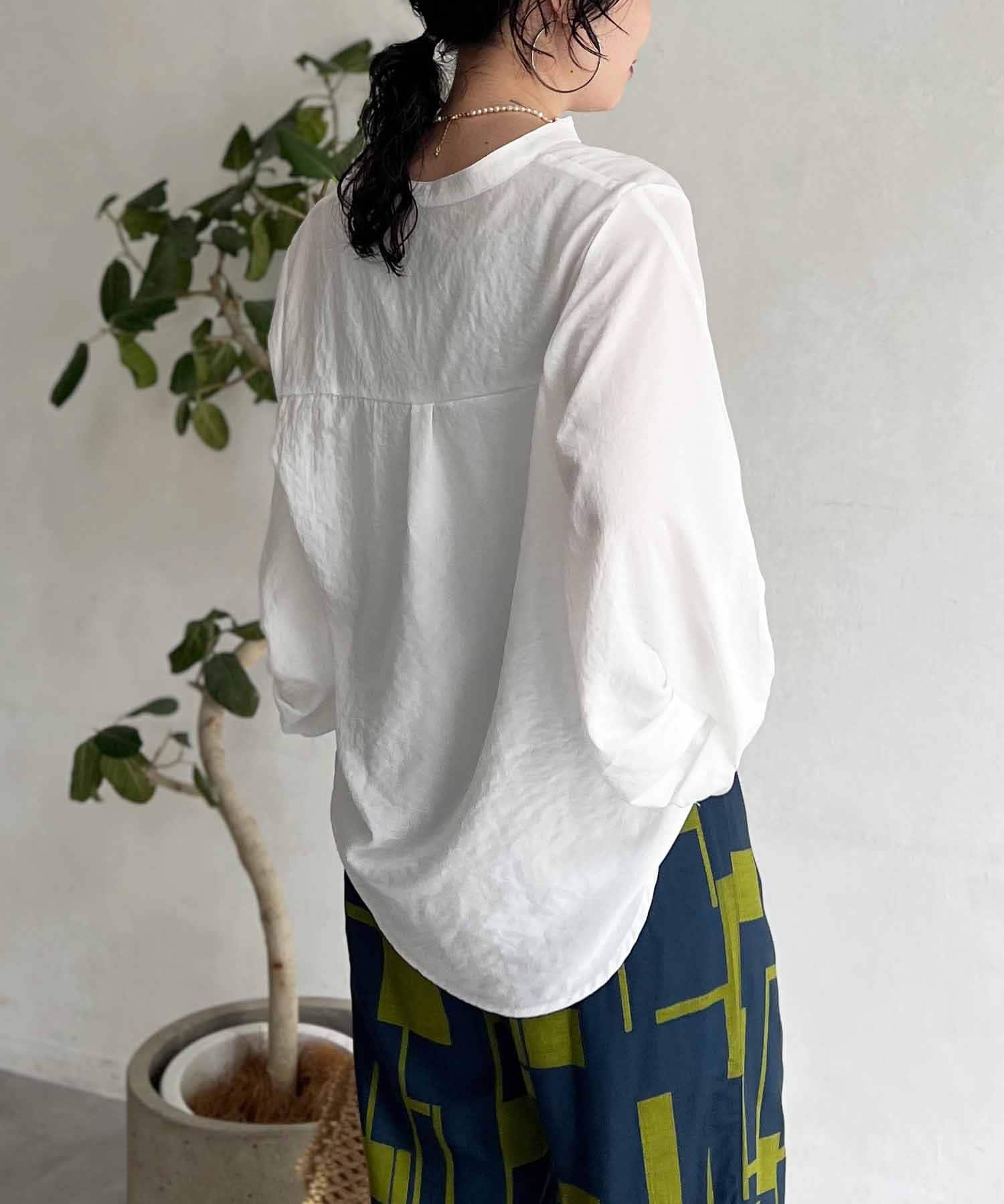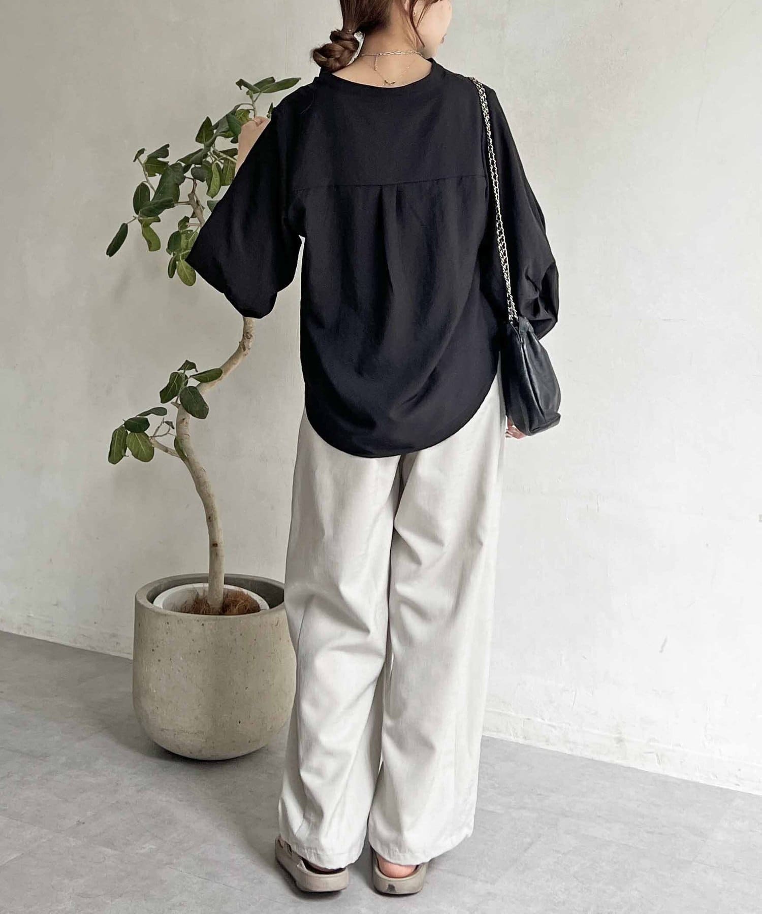 生地表面はビンテージライクな凹凸感をプラス。落ち感のある素材でシワになりにくく、デイリーに合わせていただけます。