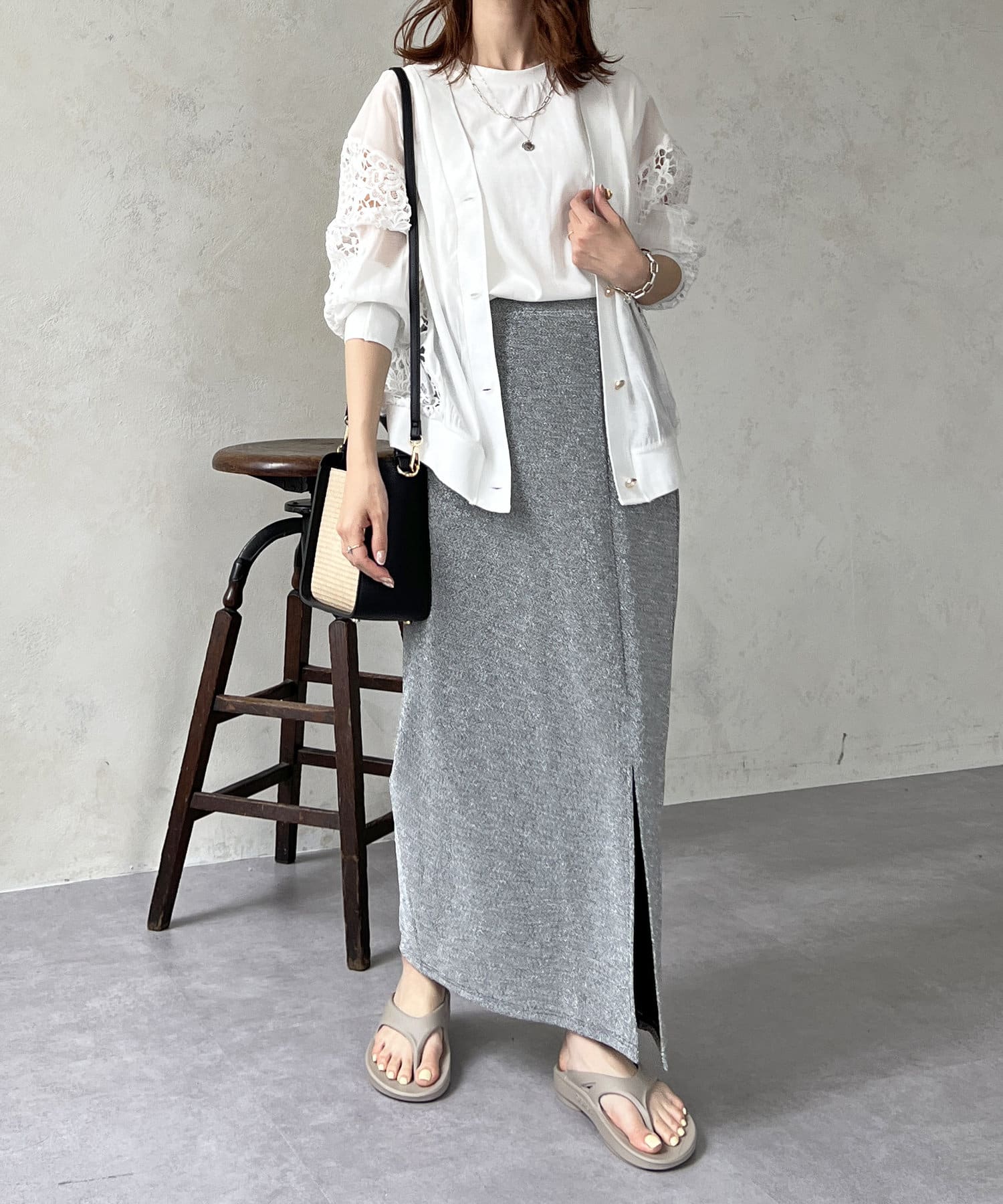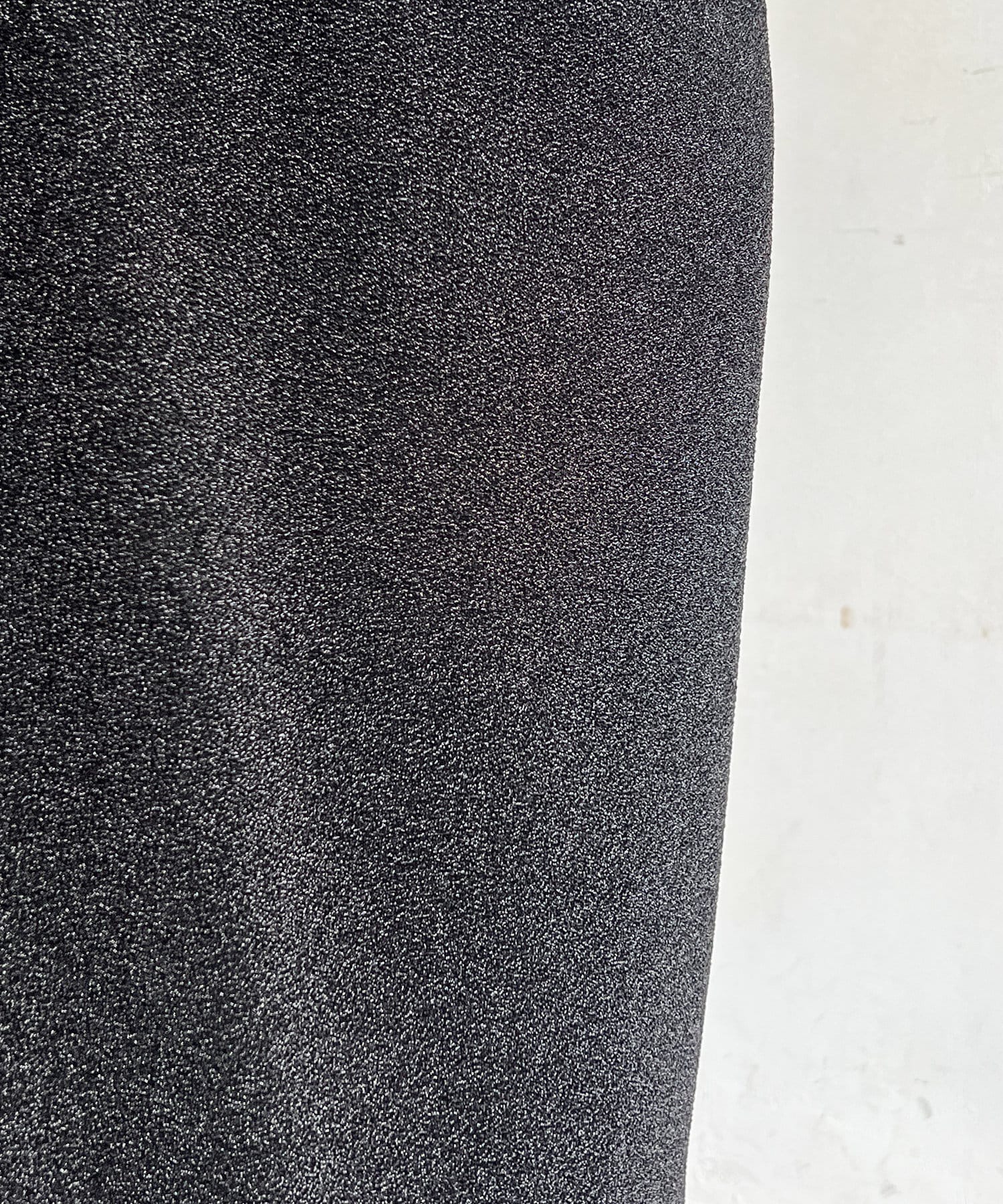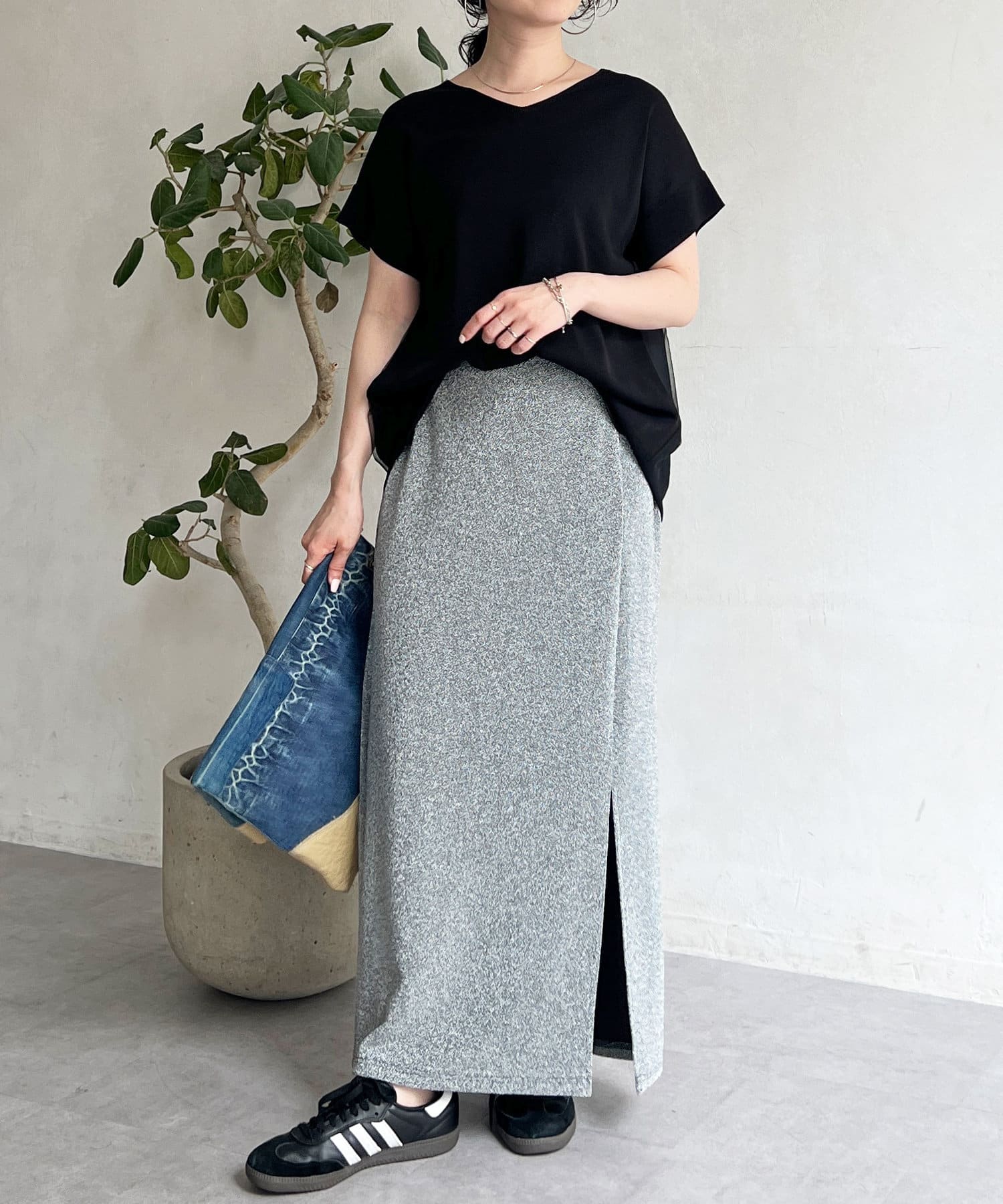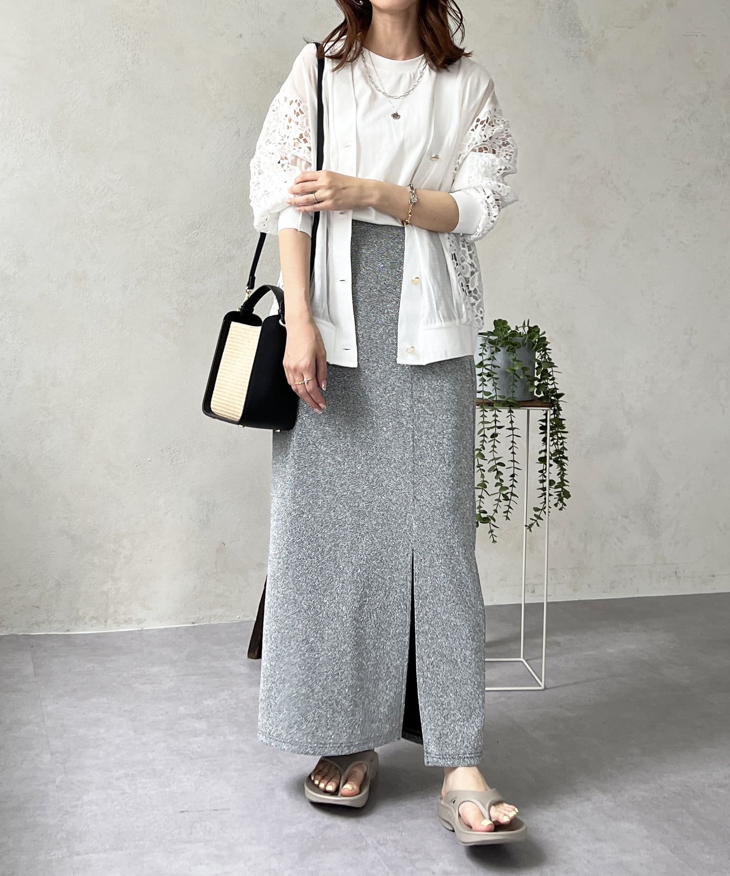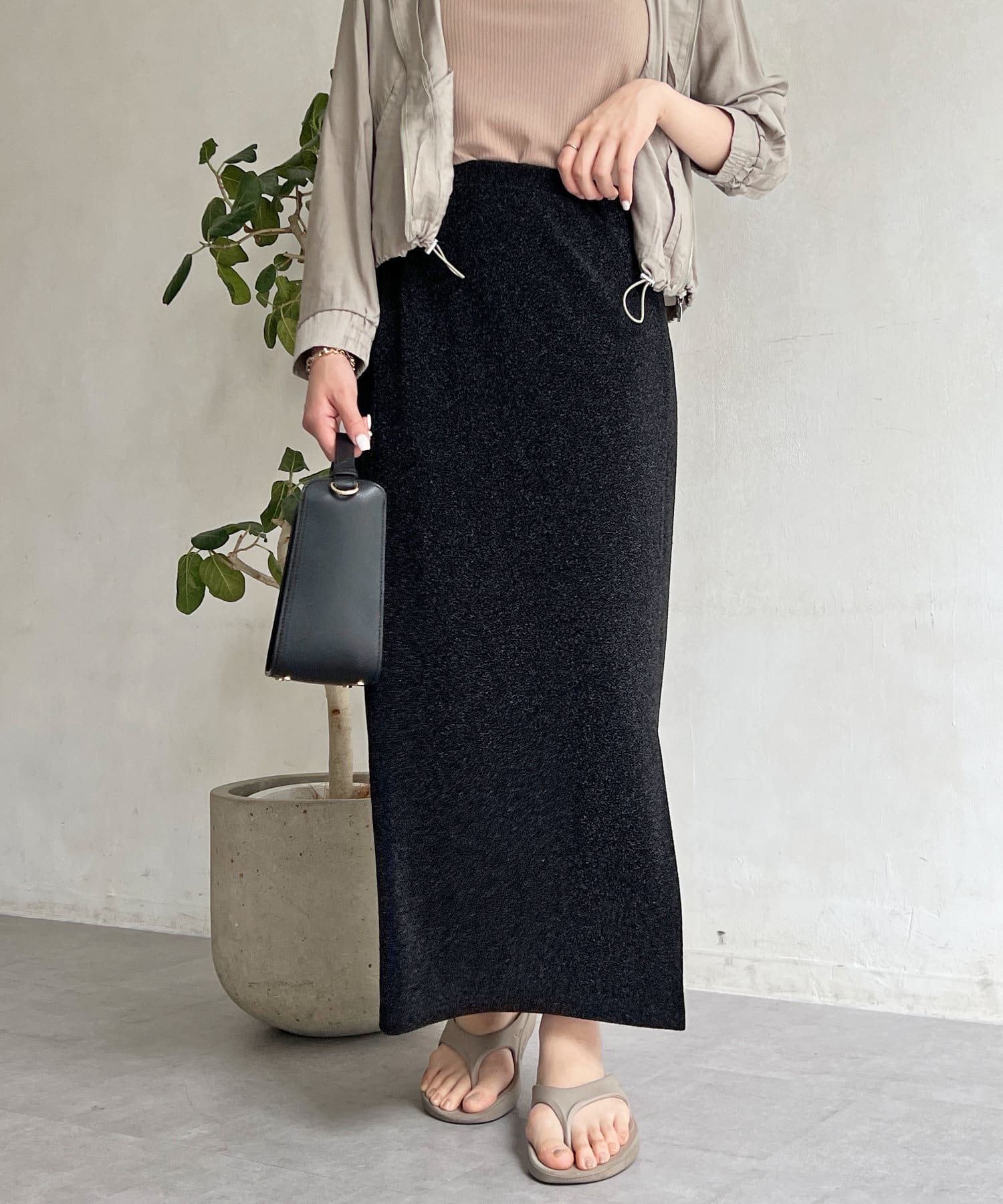 スタイリングのアクセントになるラメ素材を使用したナローシルエットのスカート。