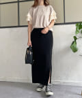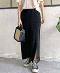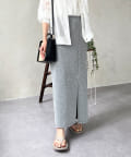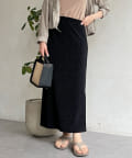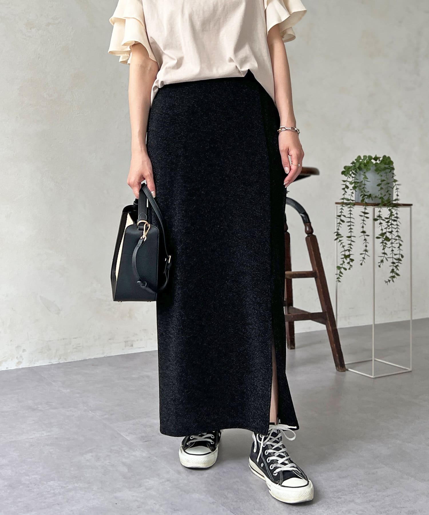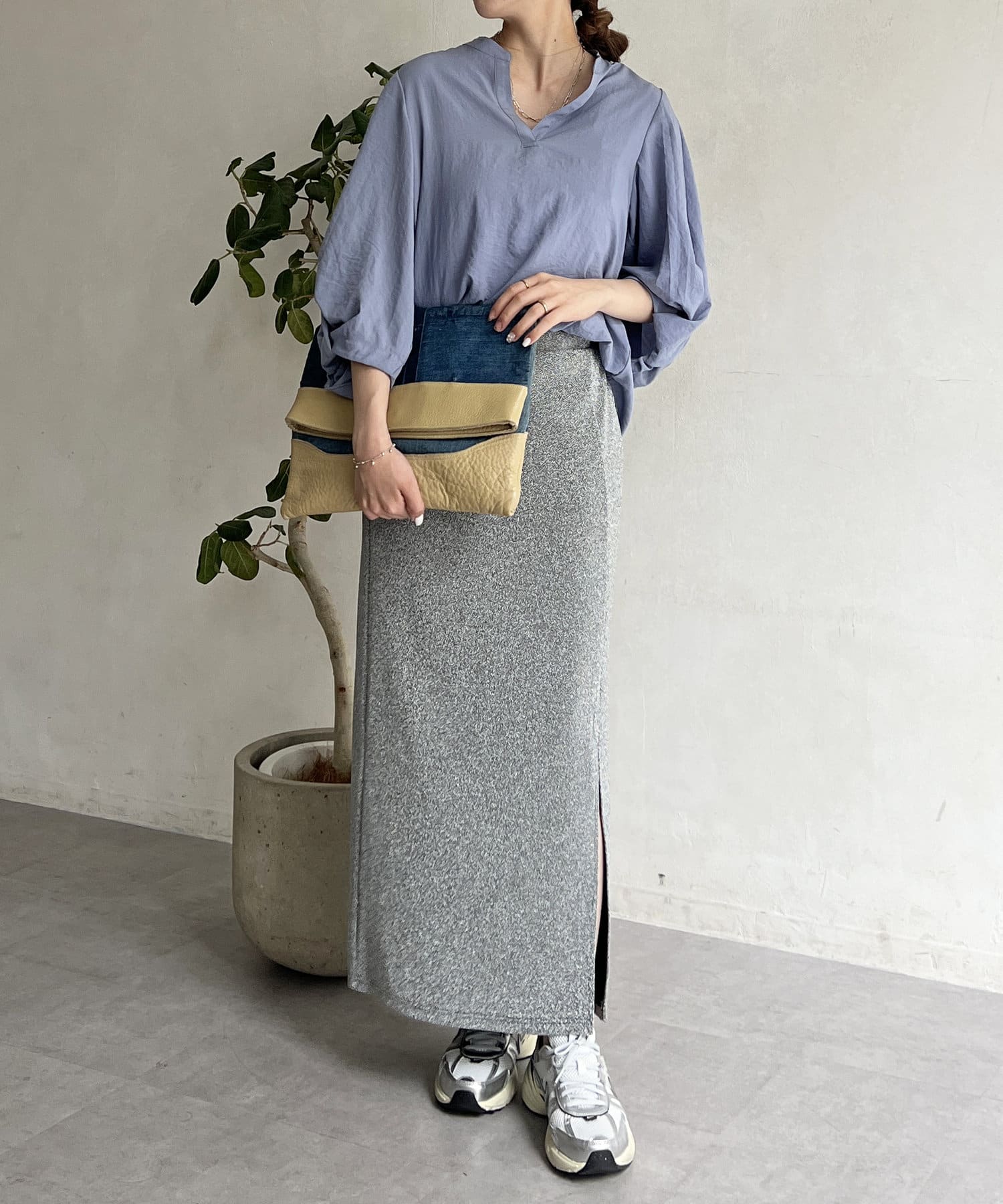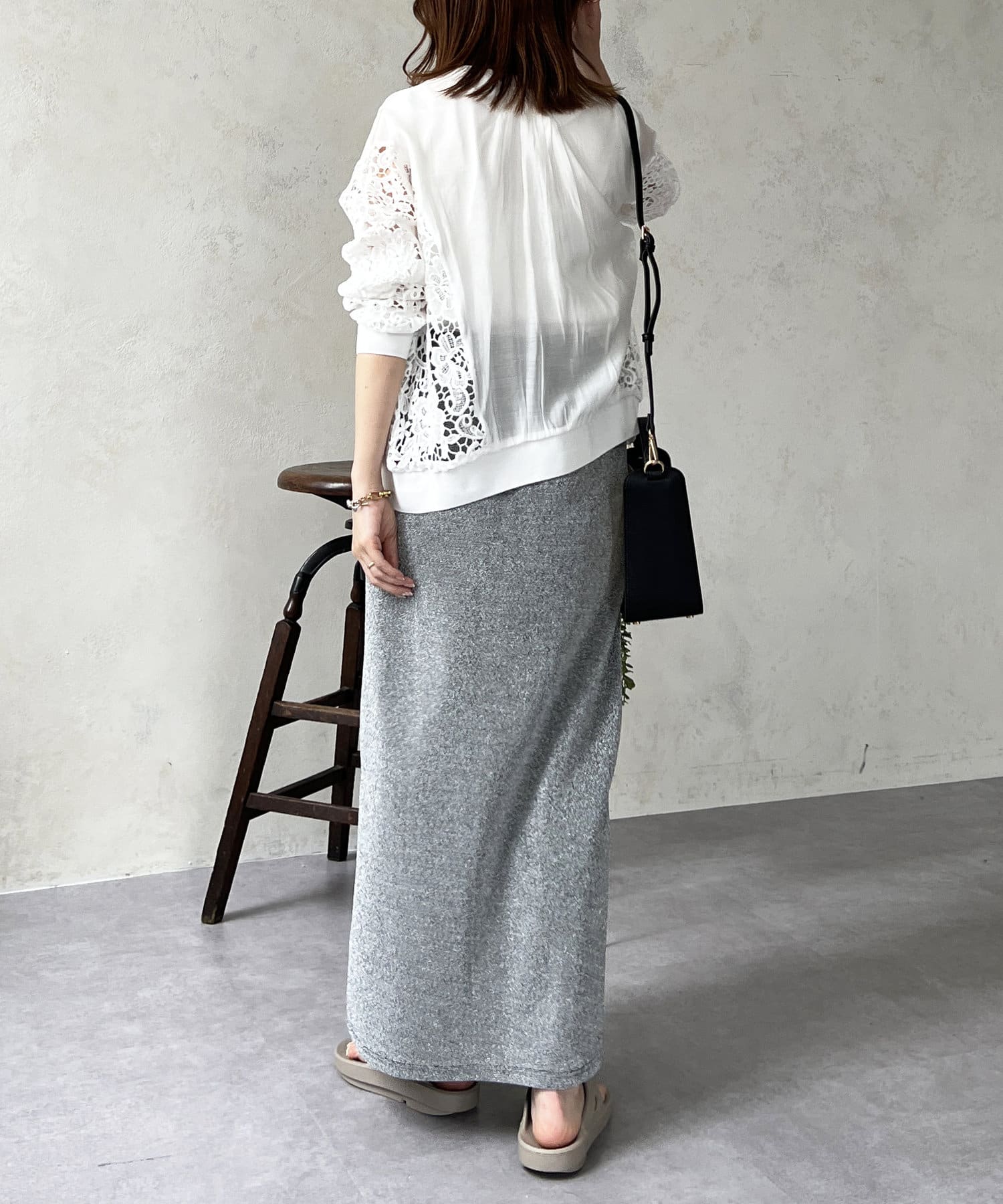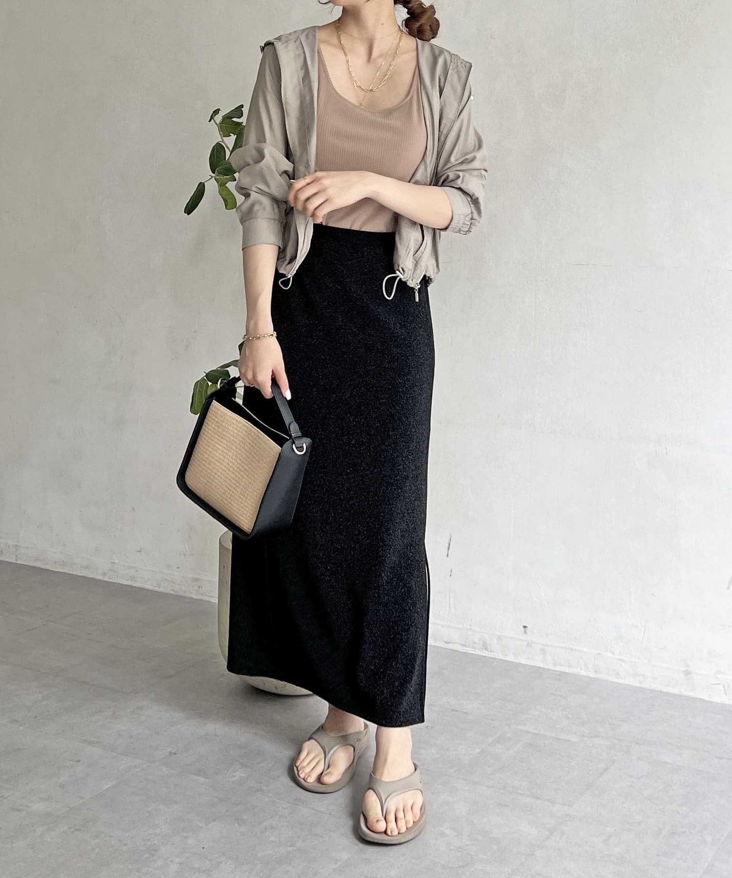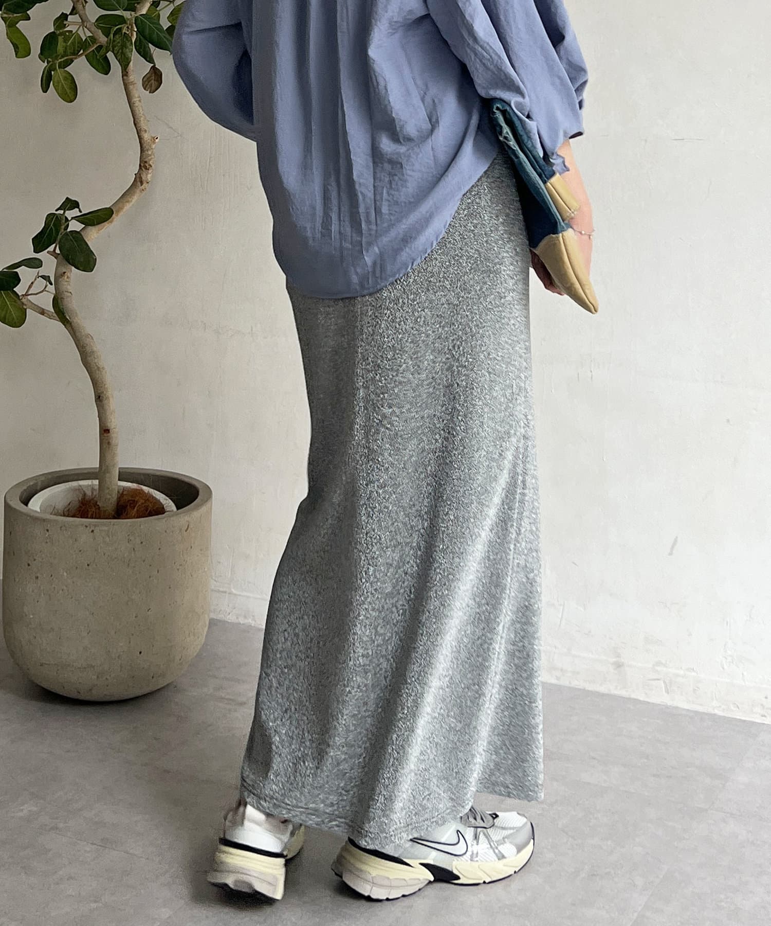 スタイリングのアクセントになるラメ素材を使用したナローシルエットのスカート。
