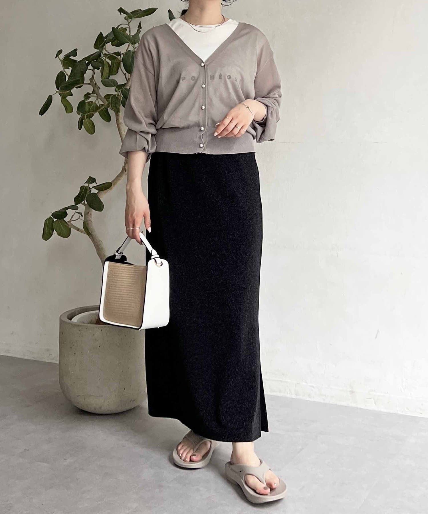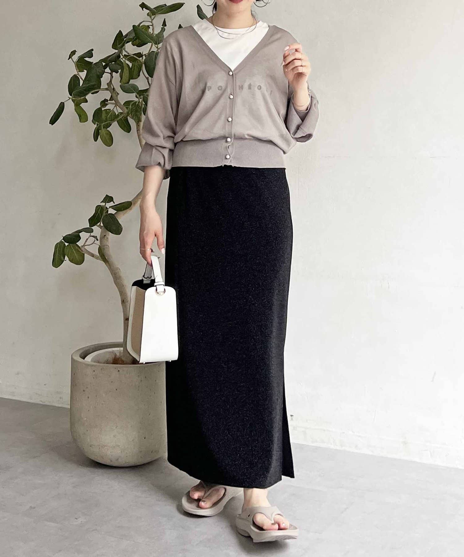 ベーシックなシルエットのカーディガンにちょこんと小粒のパールをポイント付けてアクセントに。